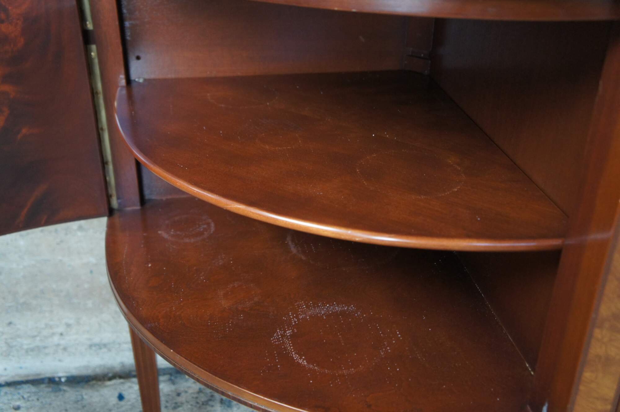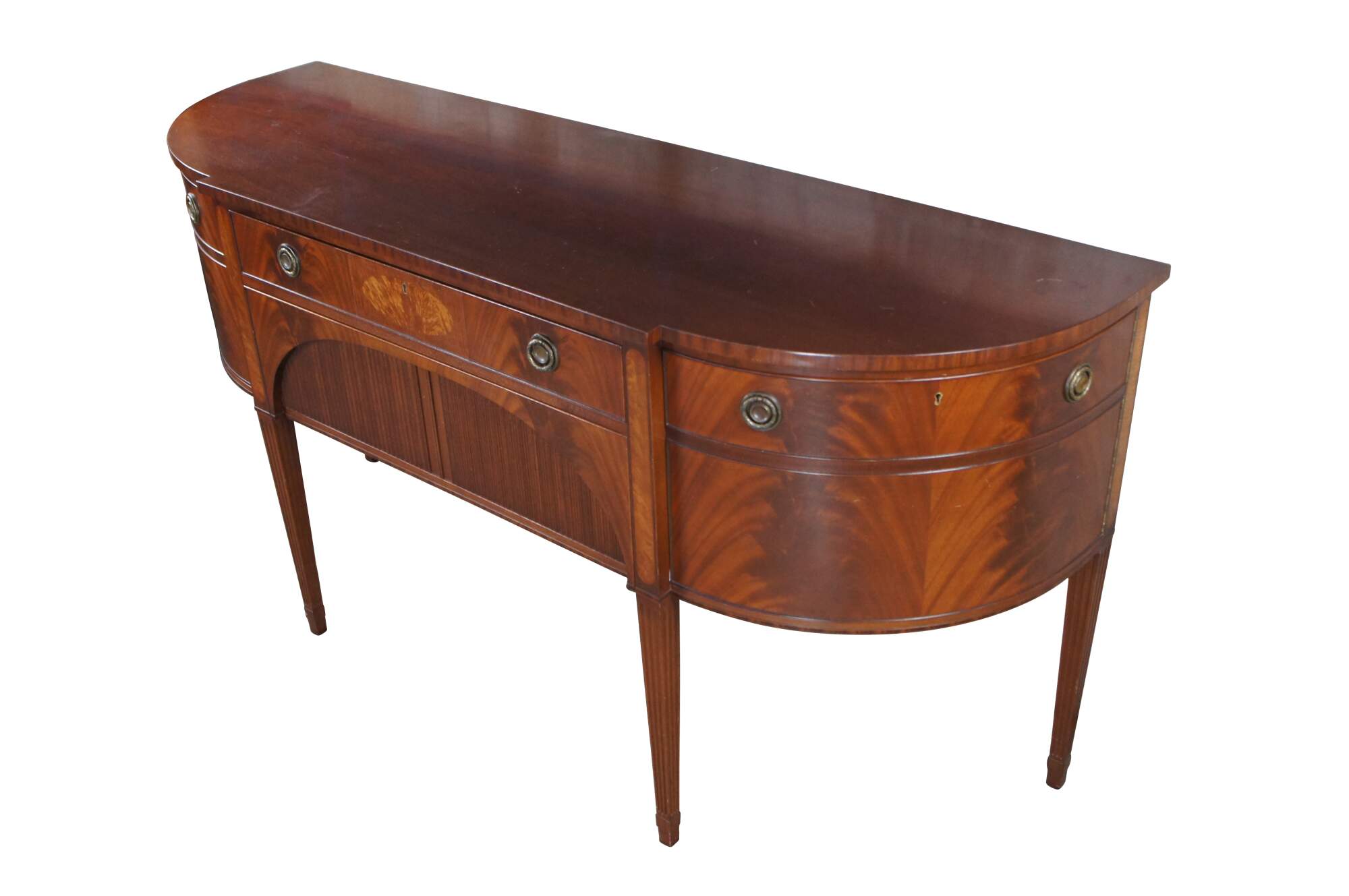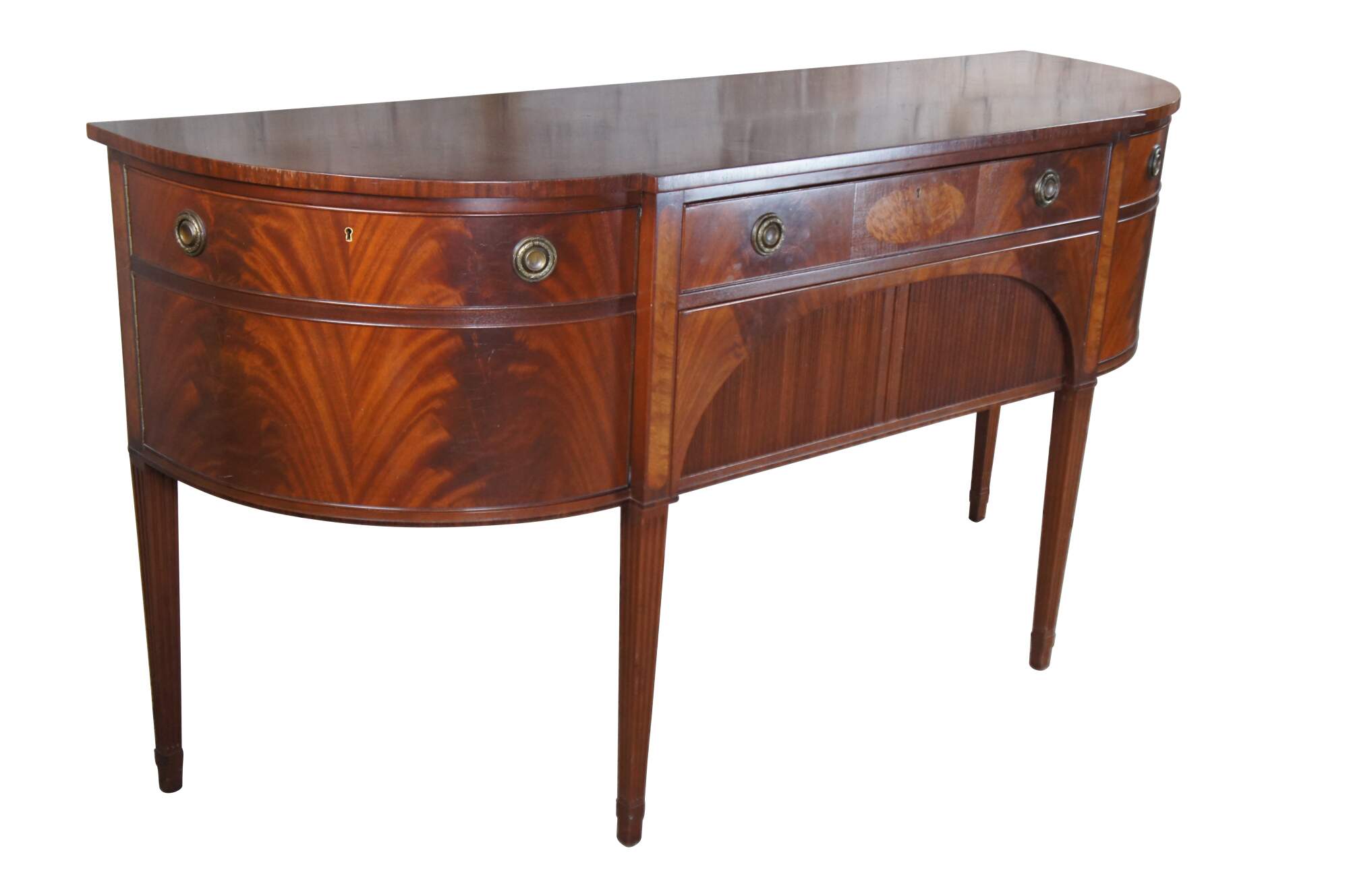 A beautiful Hepplewhite style sideboard or server by Schmieg & Kotzian, circa 1930s. Features a demilune form made from mahogany with a breakfront center having two graduated hand dovetailed drawers. The large lower drawer has an arched and recessed front with faux tambour motif that opens front the bottom. Central drawers are flanked by outer cabinets with shelves. The front of the case showcases flame mahogany and satinwood veneer. The case is supported by four fluted and tapered legs.