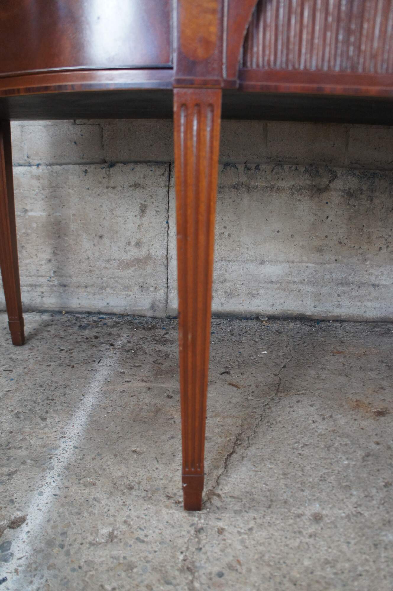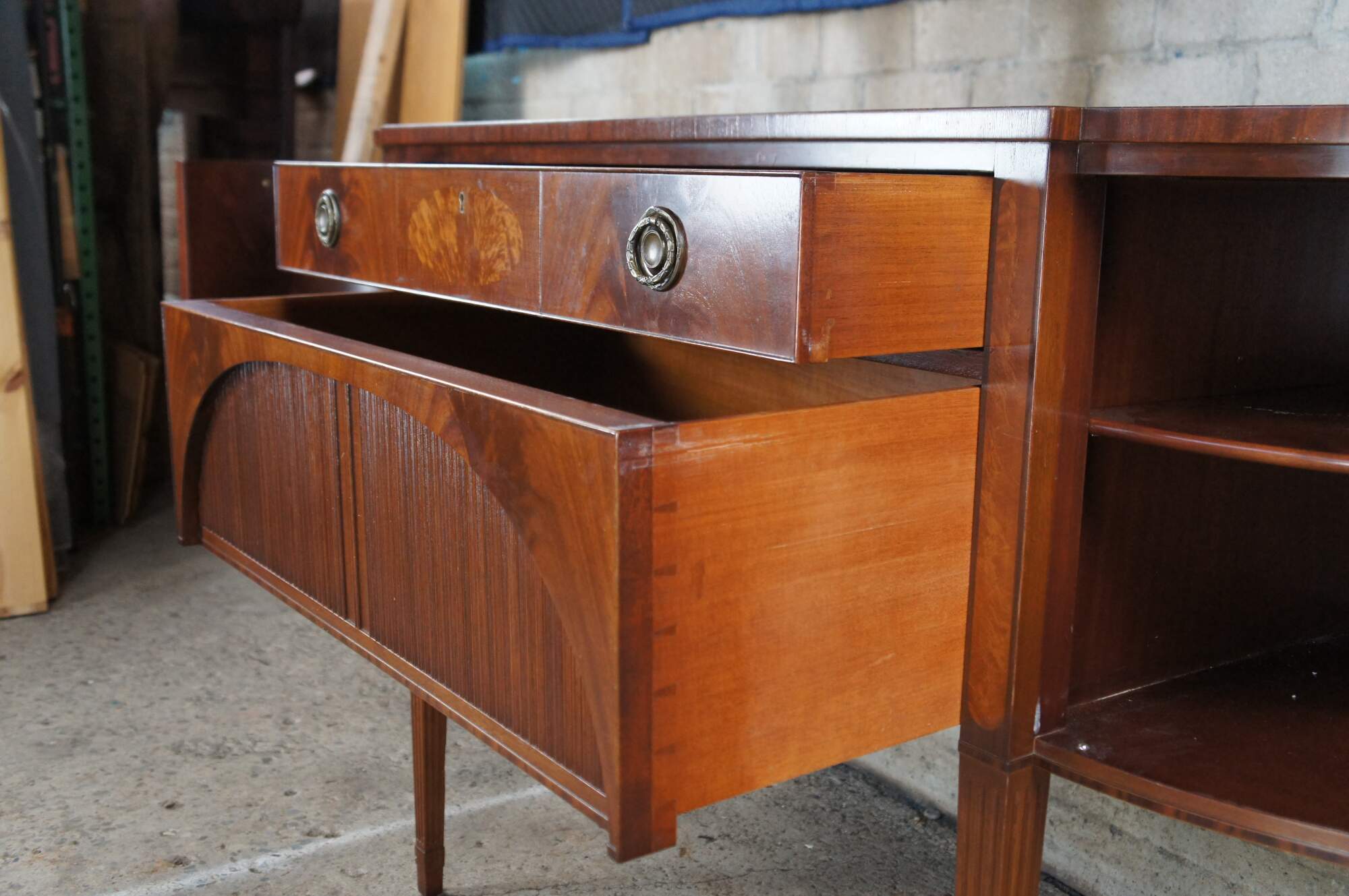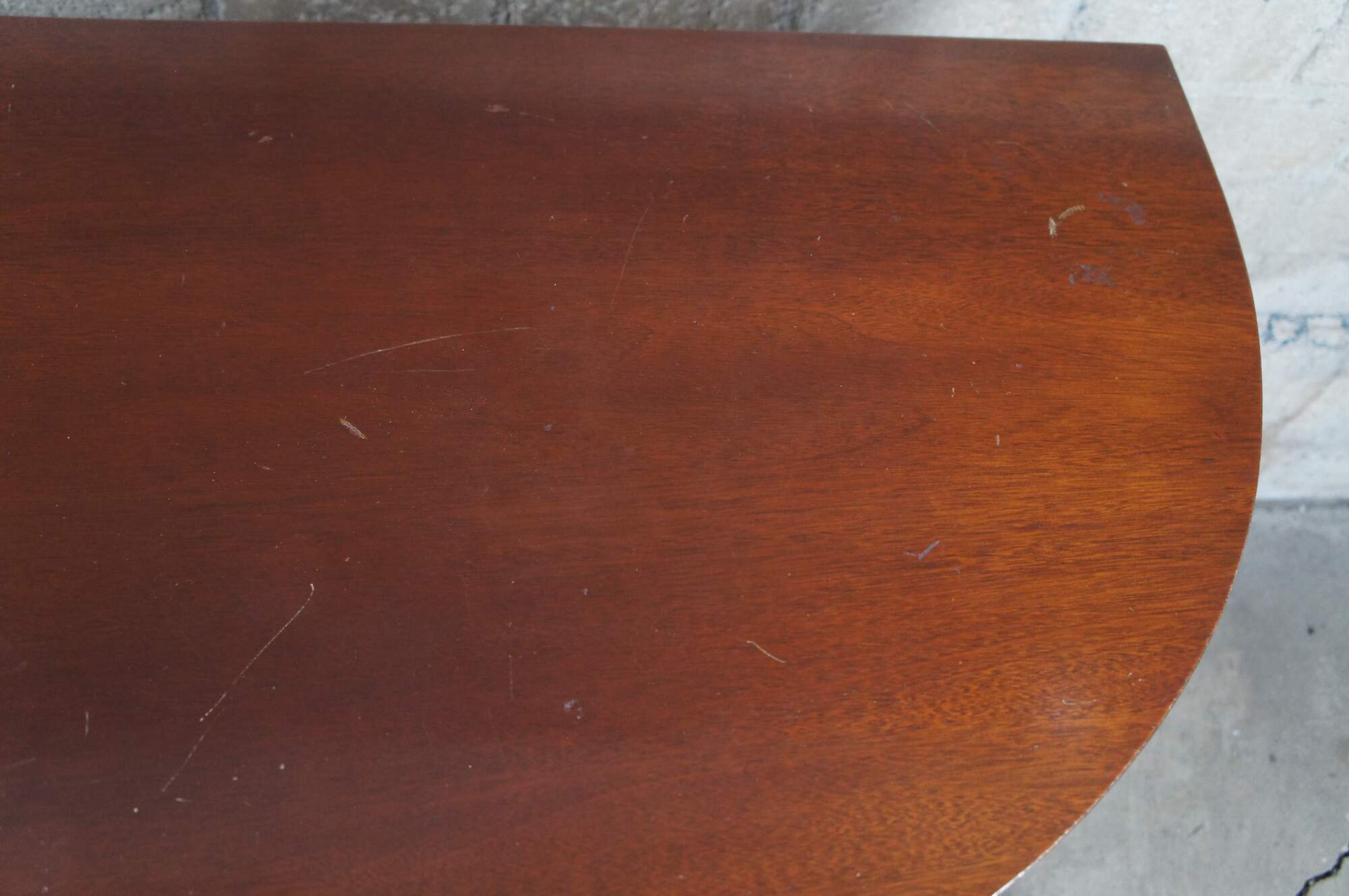 A beautiful Hepplewhite style sideboard or server by Schmieg & Kotzian, circa 1930s. Features a demilune form made from mahogany with a breakfront center having two graduated hand dovetailed drawers. The large lower drawer has an arched and recessed front with faux tambour motif that opens front the bottom. Central drawers are flanked by outer cabinets with shelves. The front of the case showcases flame mahogany and satinwood veneer. The case is supported by four fluted and tapered legs.