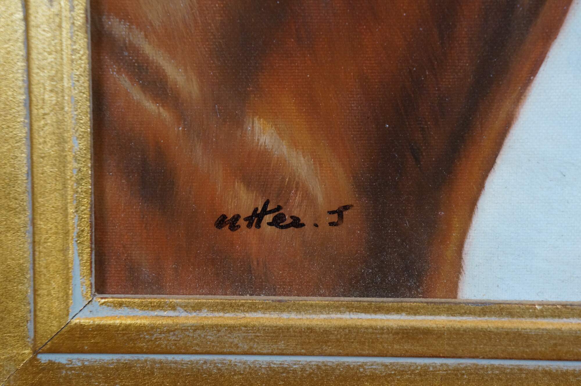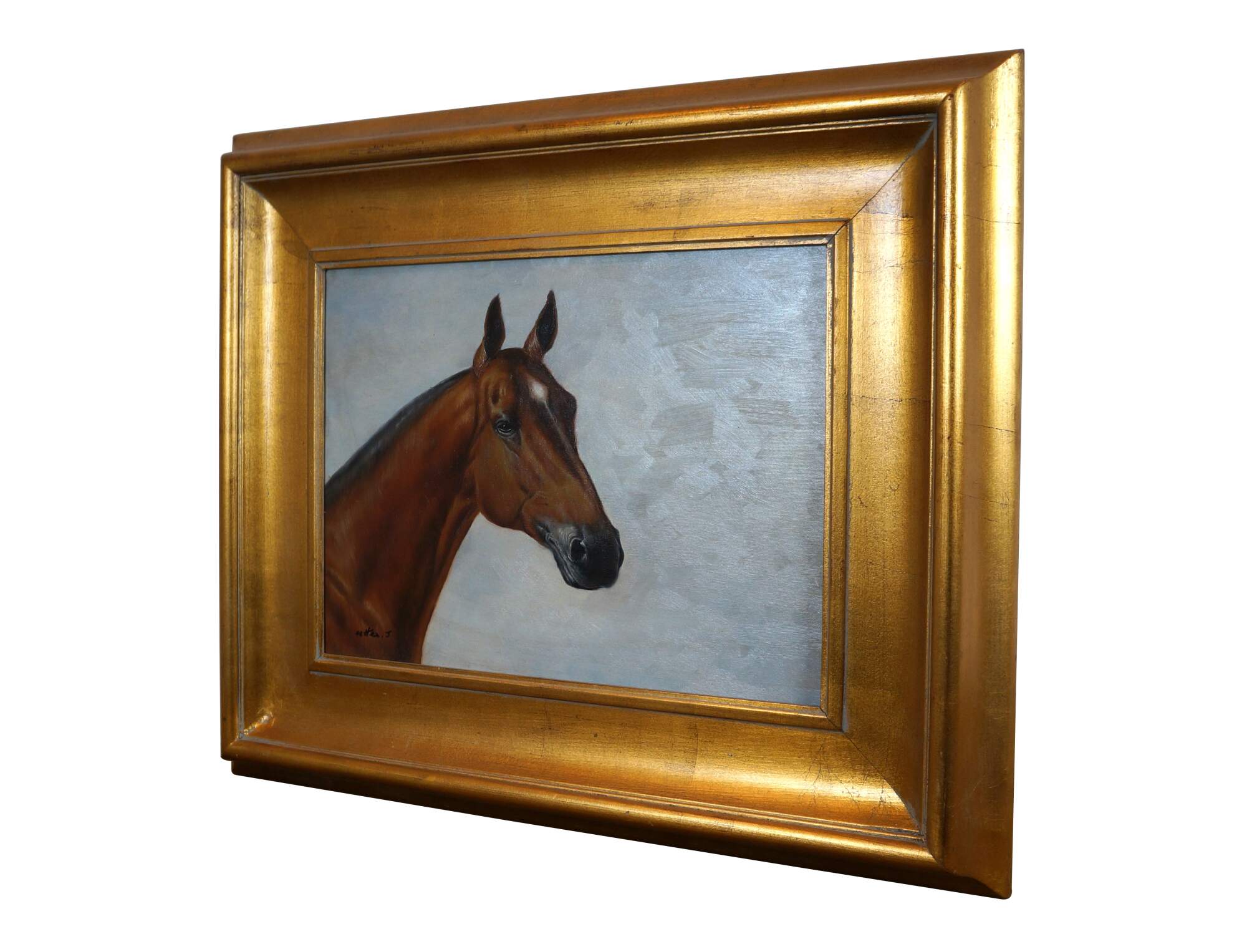 Late 20th century oil painting on canvas of the head / bust of a brown horse with black mane and muzzle, and a white blaze on the forehead. Signed in lower left corner (Utter J). Beveled gilt wood frame.