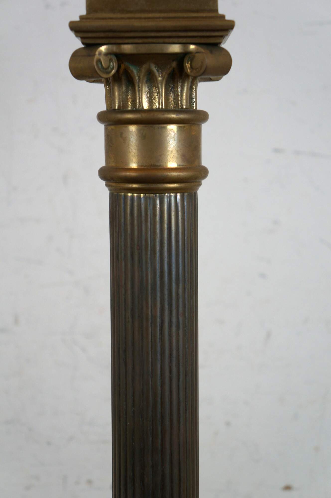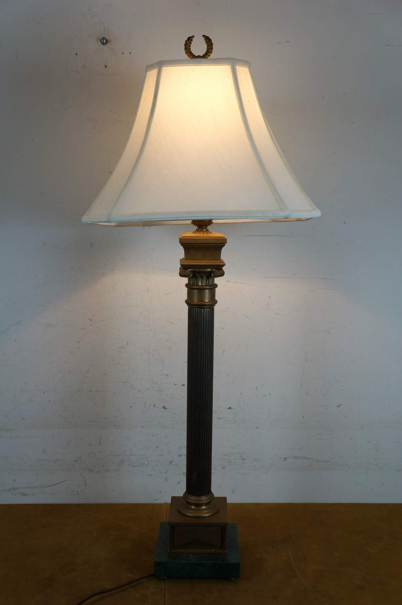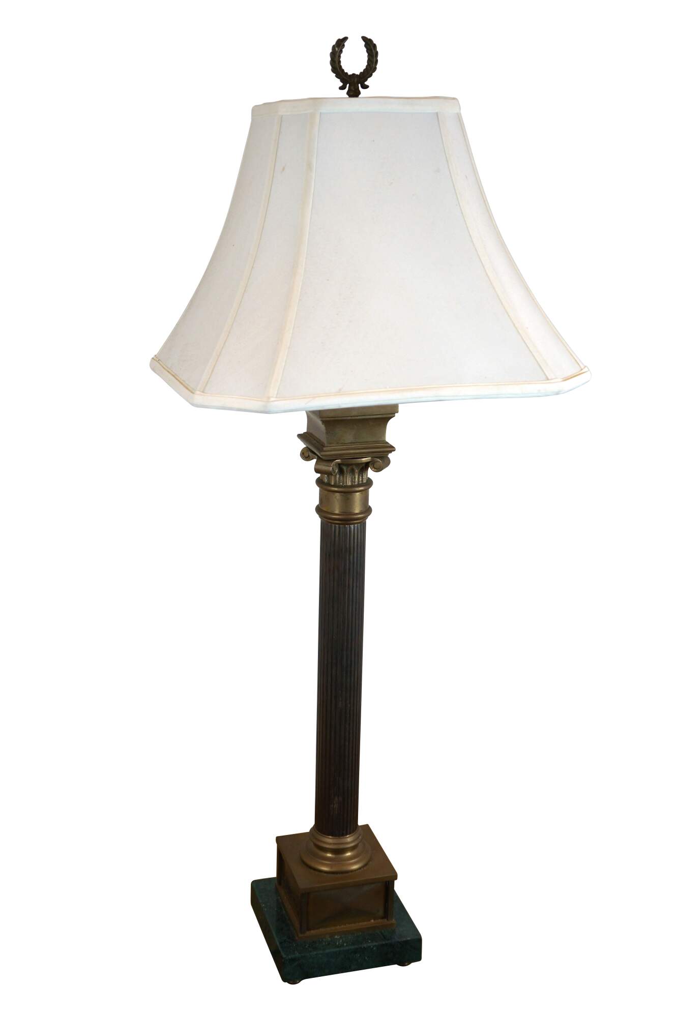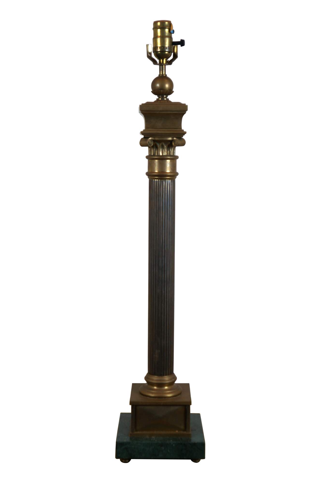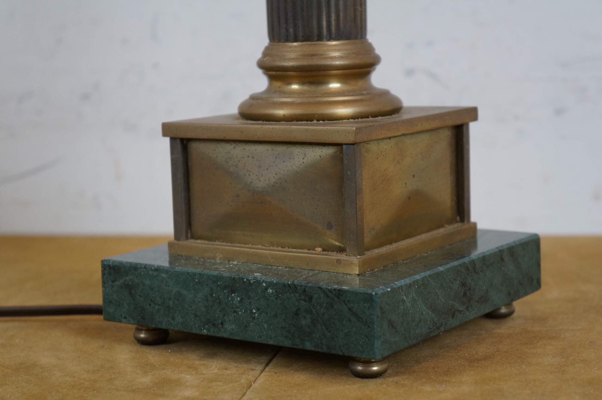 Late 20th century heavy Greek Corinithian column shaped table lamp with green marble base and brass body styled after an ionic reeded column between square plinths. Includes harp, white cloth shade, and brass laurel wreath finial.
