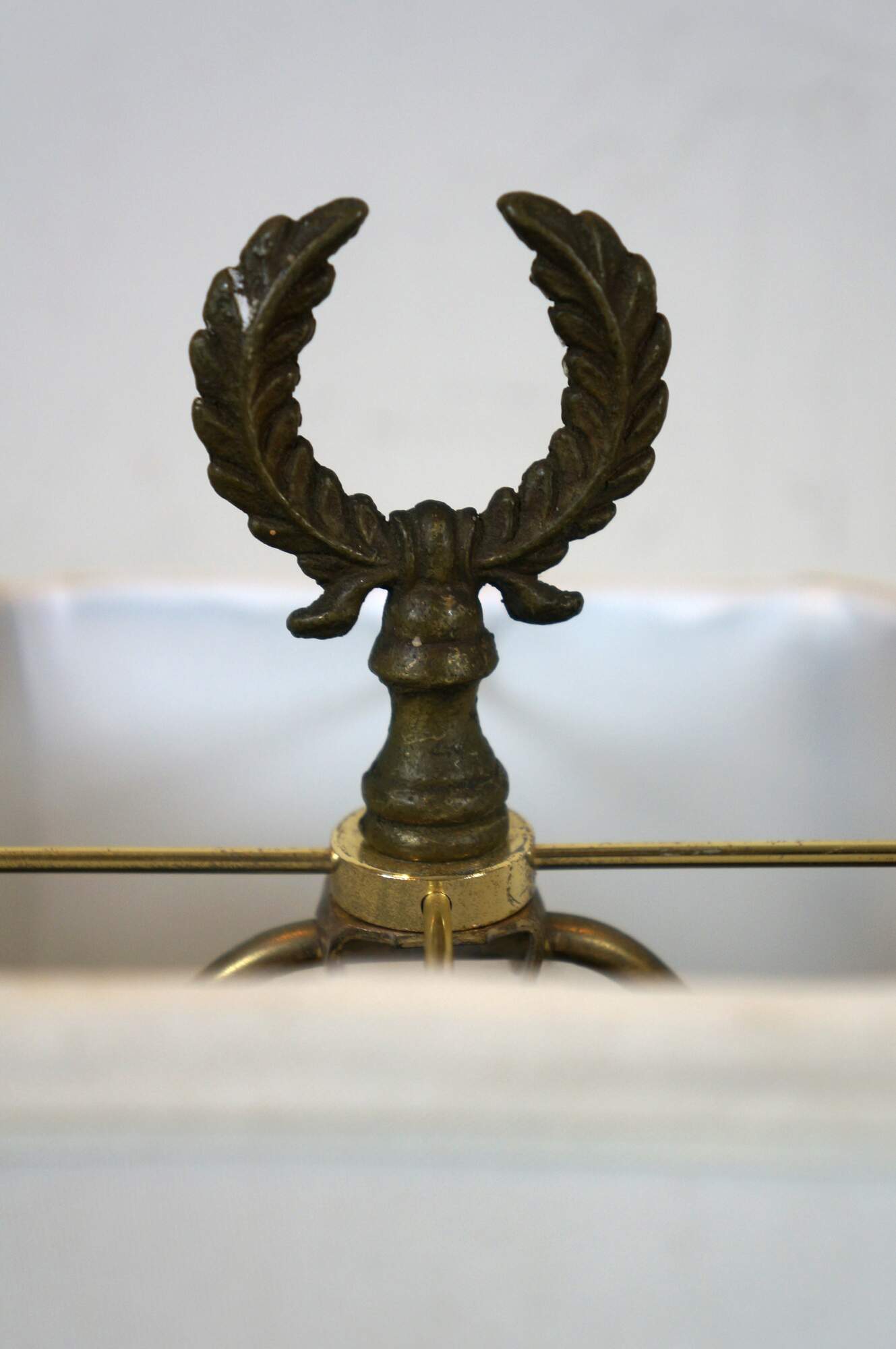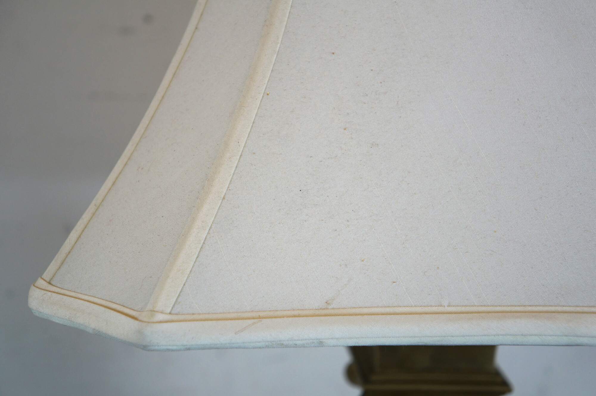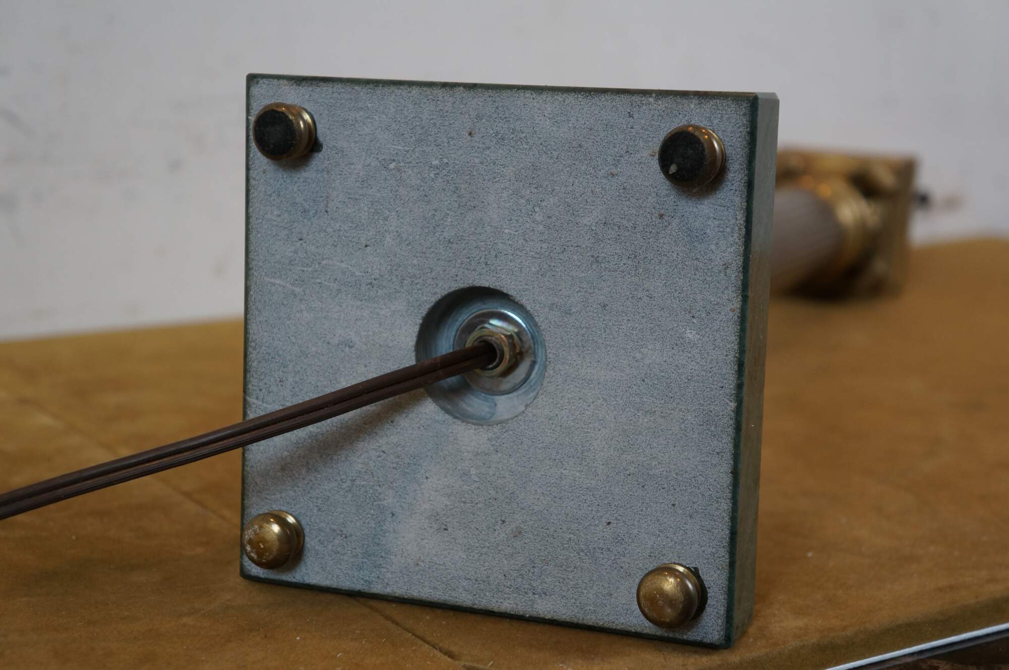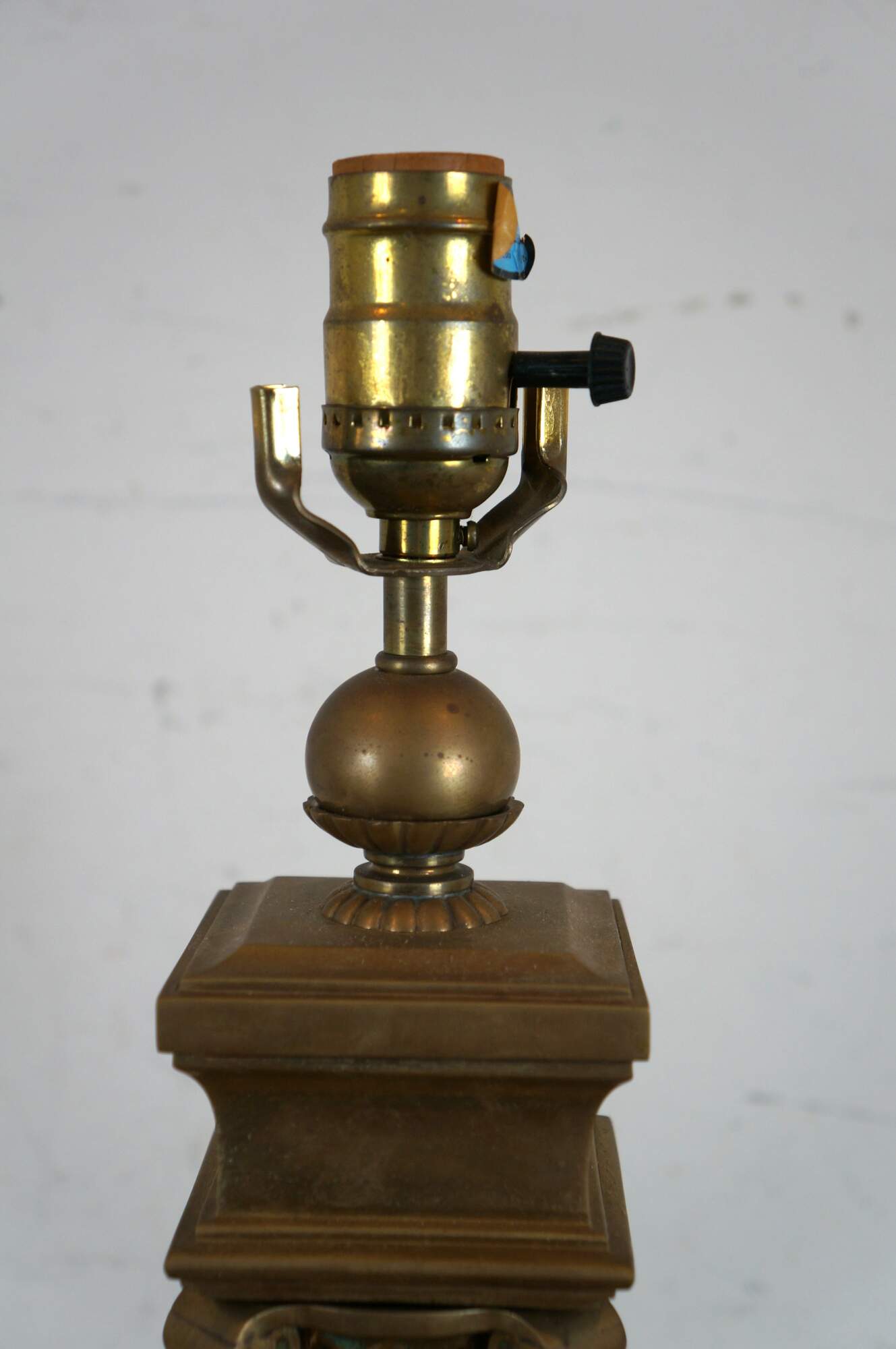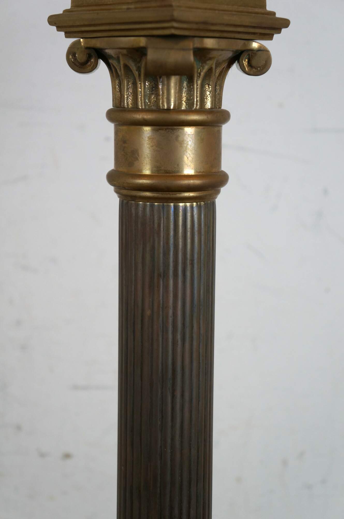 Late 20th century heavy Greek Corinithian column shaped table lamp with green marble base and brass body styled after an ionic reeded column between square plinths. Includes harp, white cloth shade, and brass laurel wreath finial.