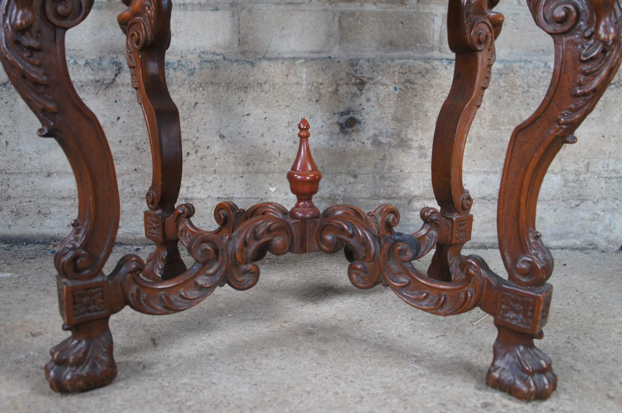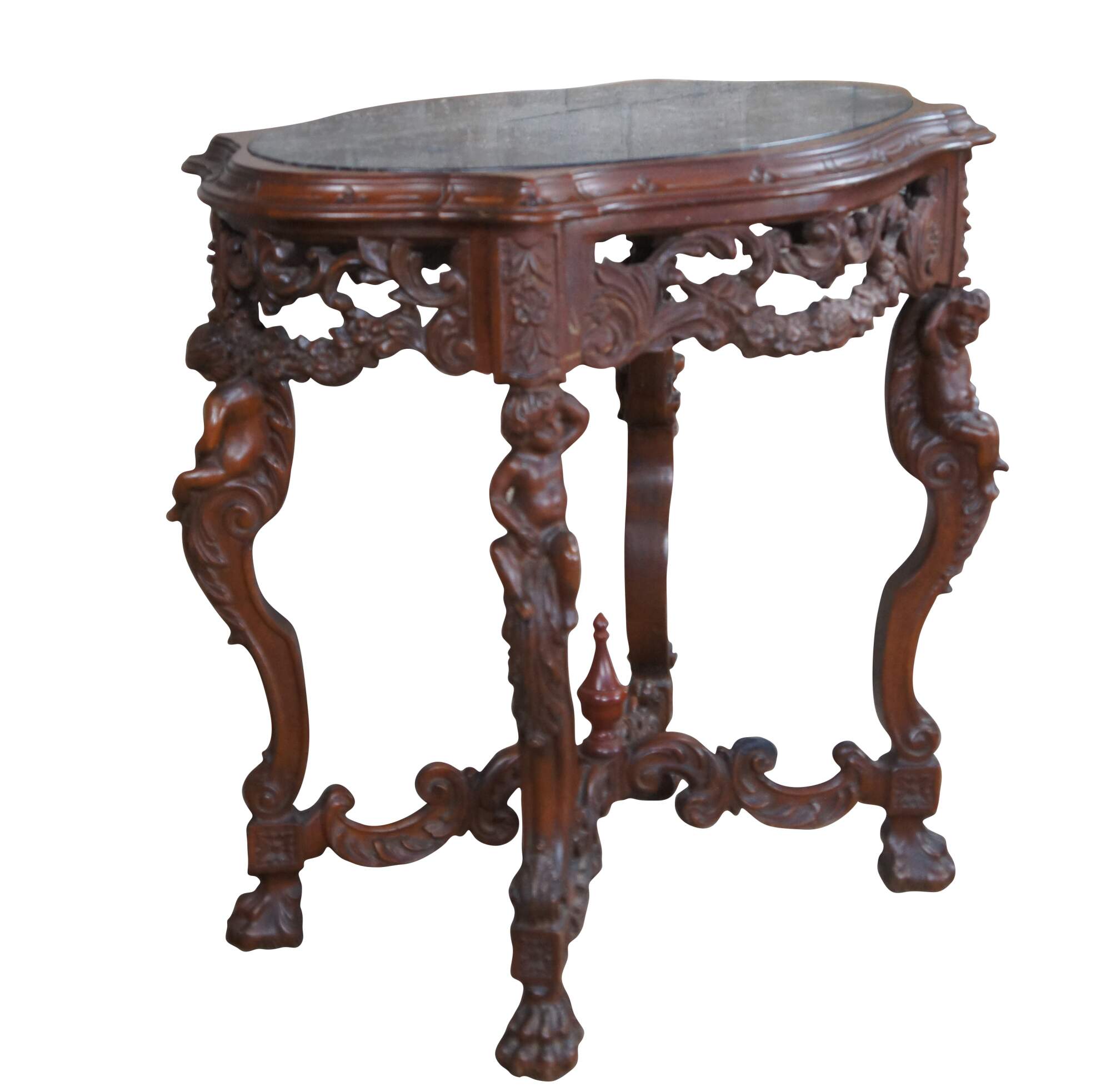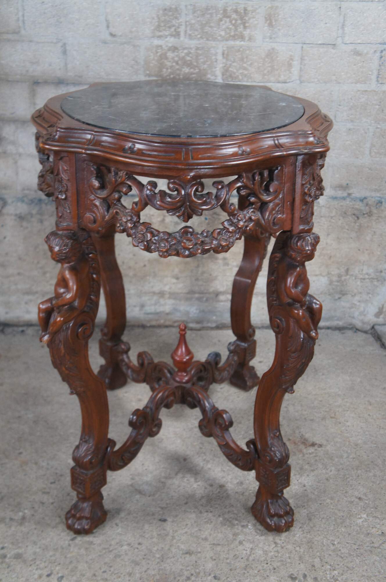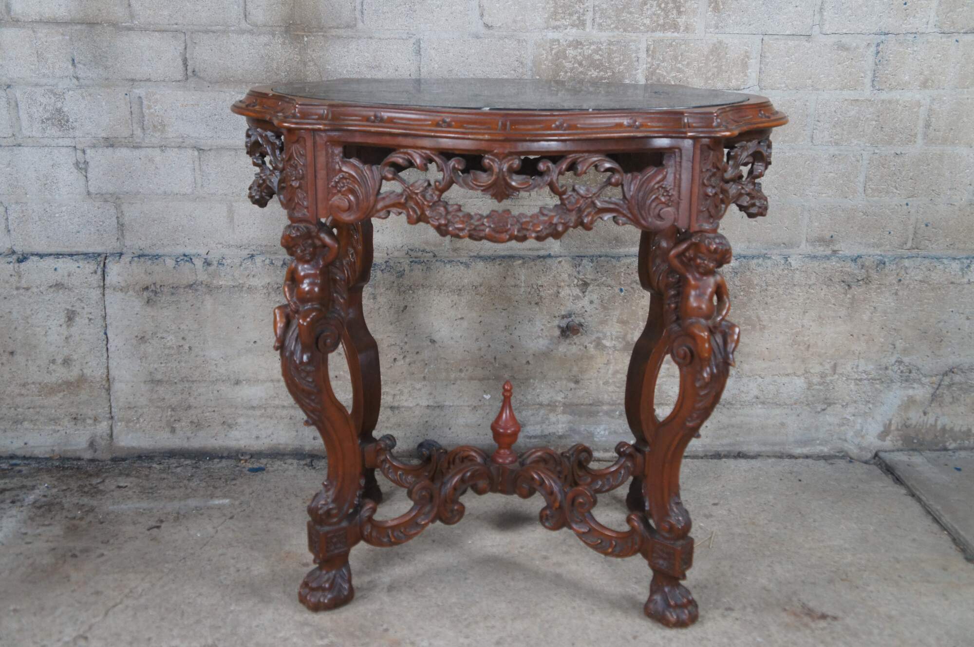 An exquisite Late Victorain parlor era parlor table. Drawing inspiration from Renaissance Revival and Louis XVI styling. Made from walnut with an oval marble inset turtle top over a pierced scrolling foliate and swag frieze. The table is supported by Long S scroll acanthus leaf legs with intricately carved figural Putto mounts resting on the knees. Base is connected by C scroll acanthus carved trestle with trophy finial at the center over carved paw feet.