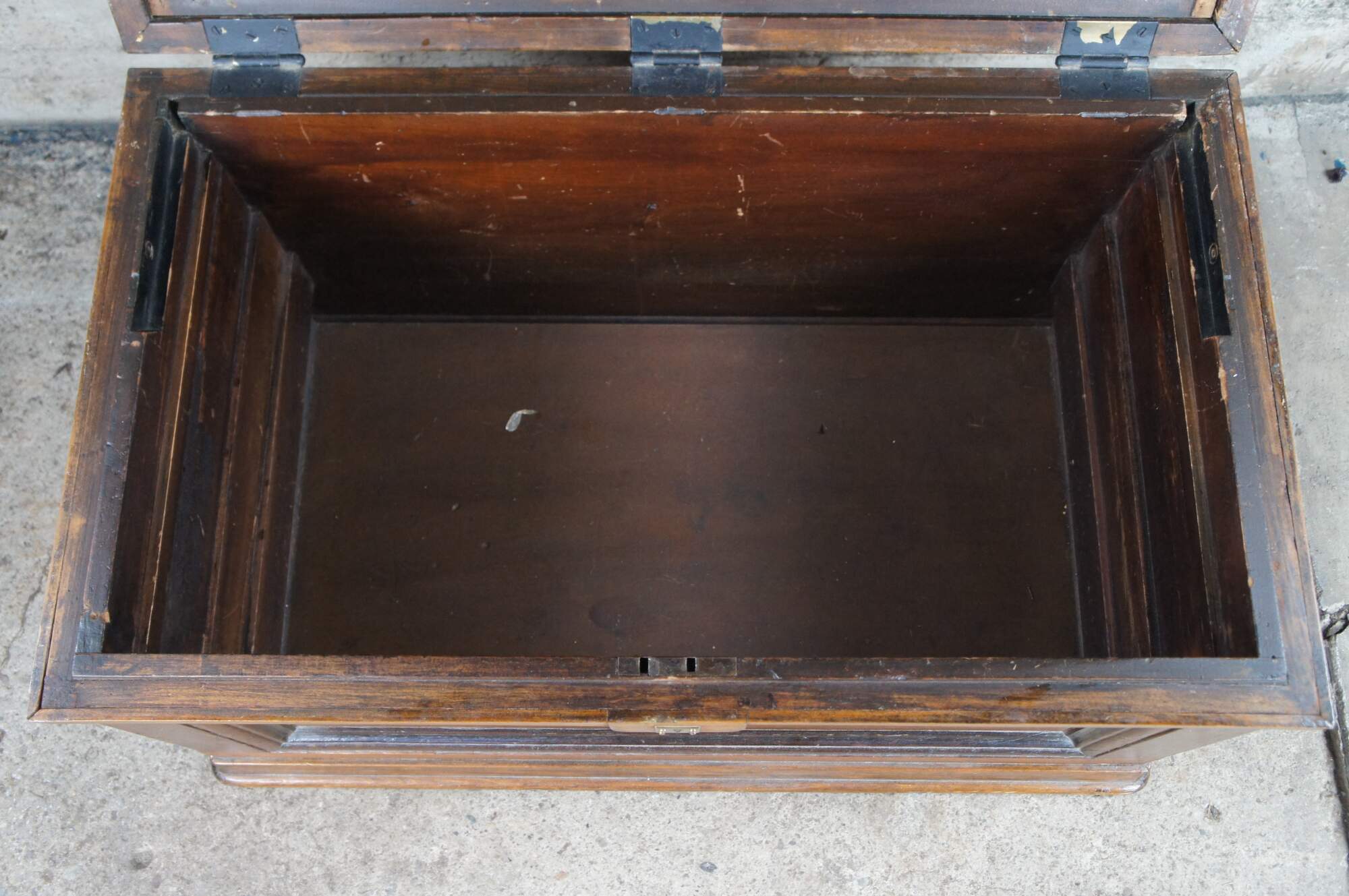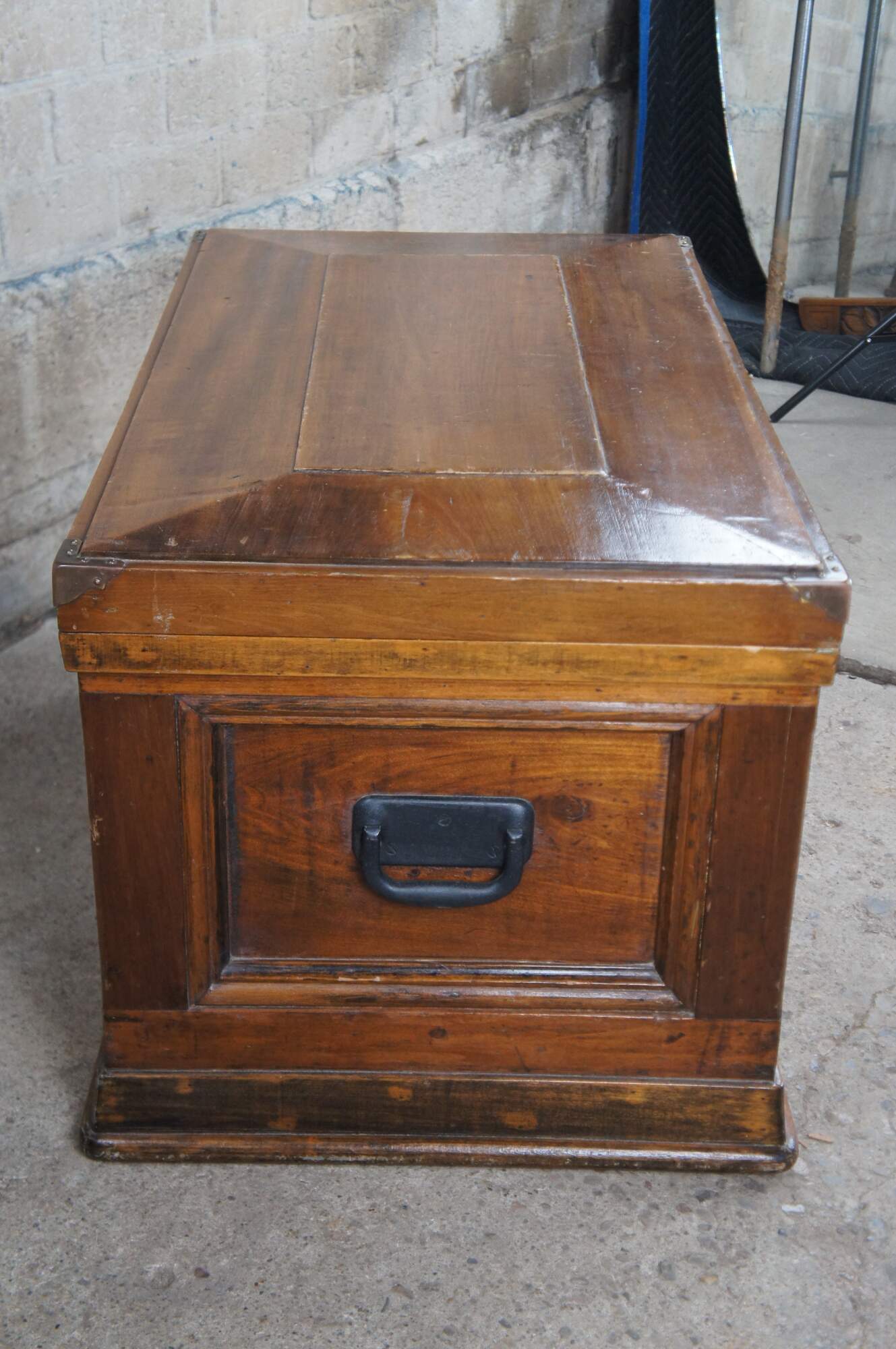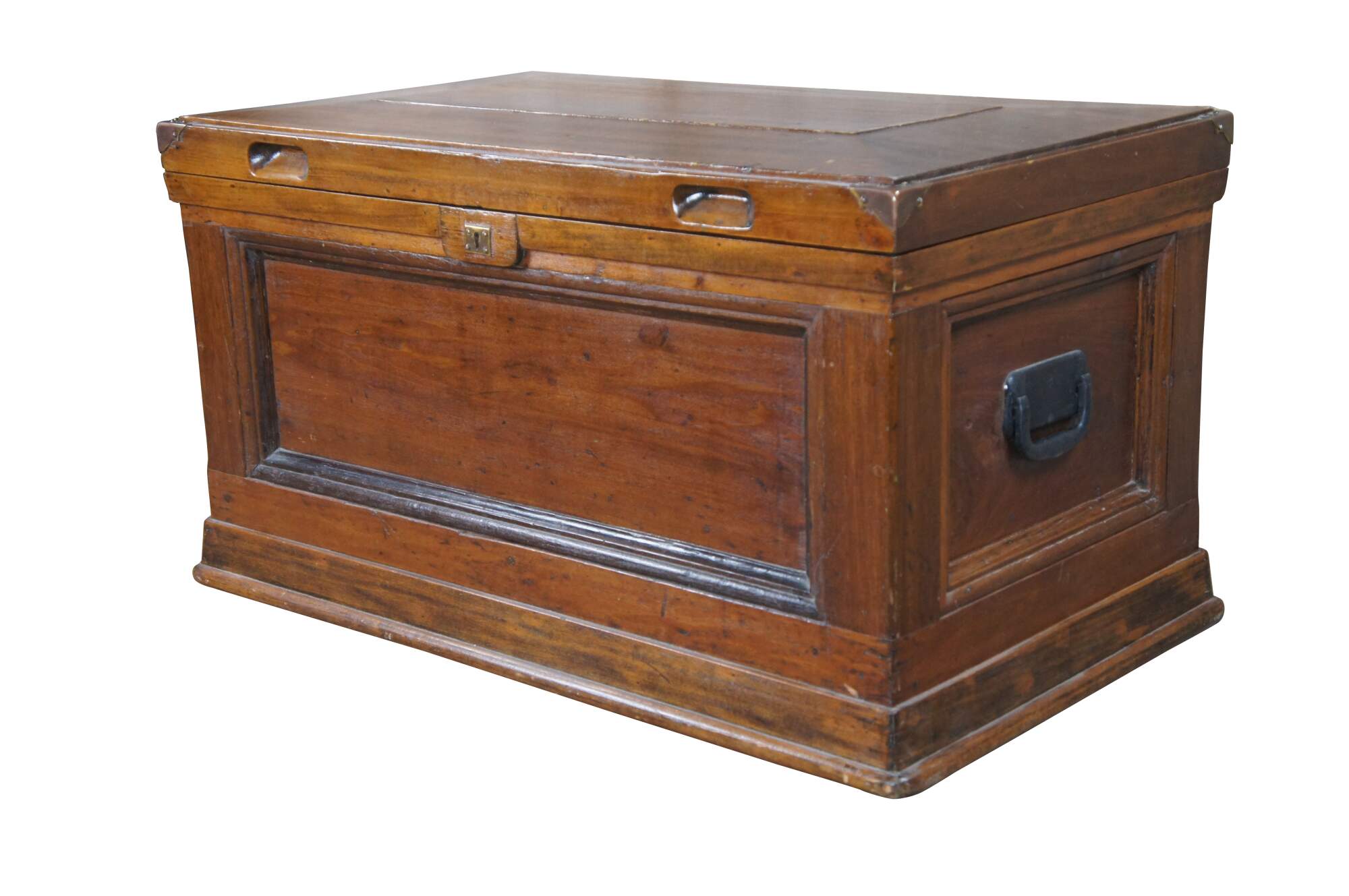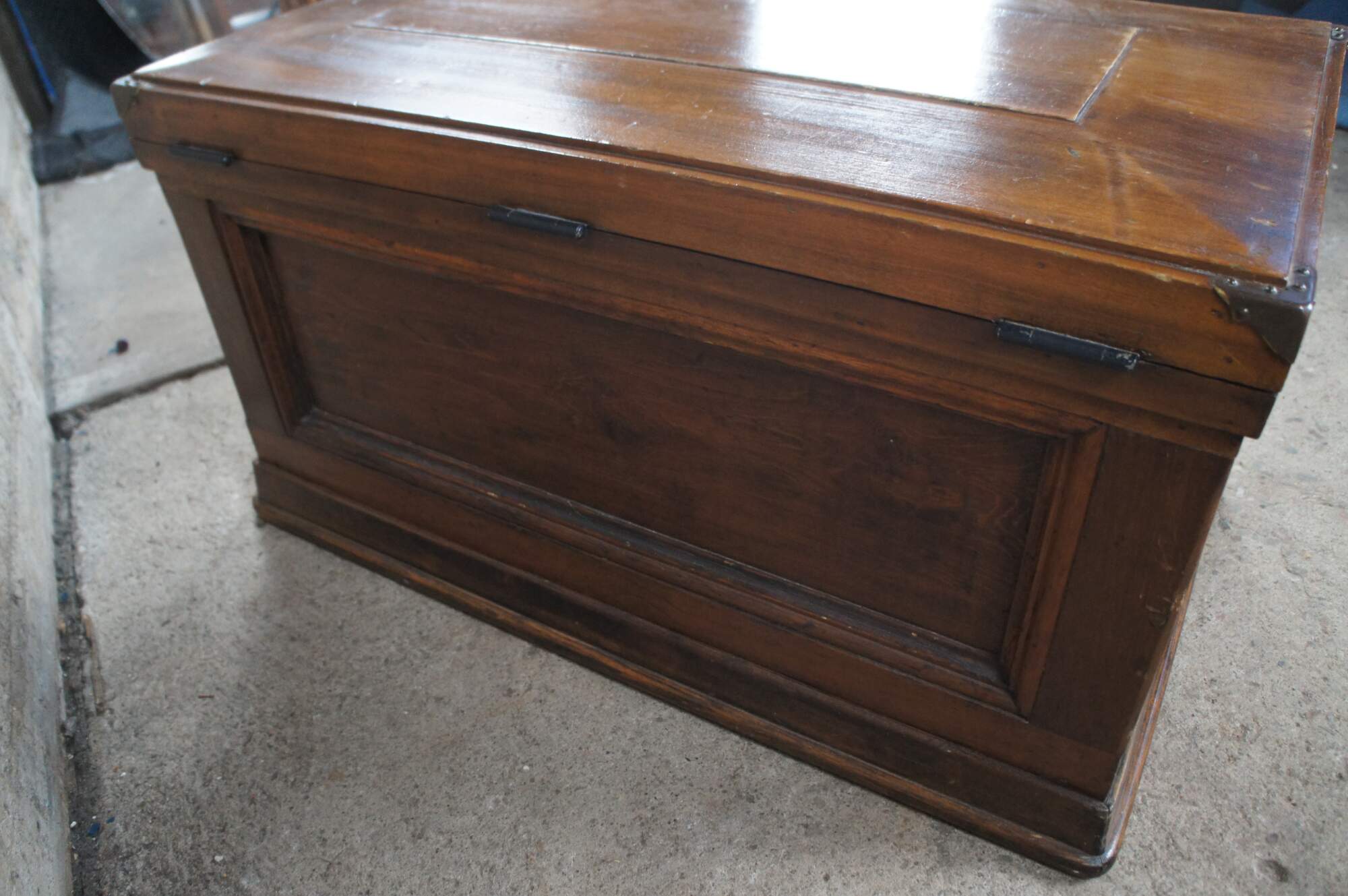 Late 19th to early 20th century pine carpenters tool chest or trunk. Features a rectangular form with beveled top, brass banded corners and inset handles along the front. The body of the trunk is paneled with a double molding and iron handles along the sides for moving. The base is raised over a plinth. Opens to a roomy interior with a cloth, brass framed plate along the underside of the lid.
