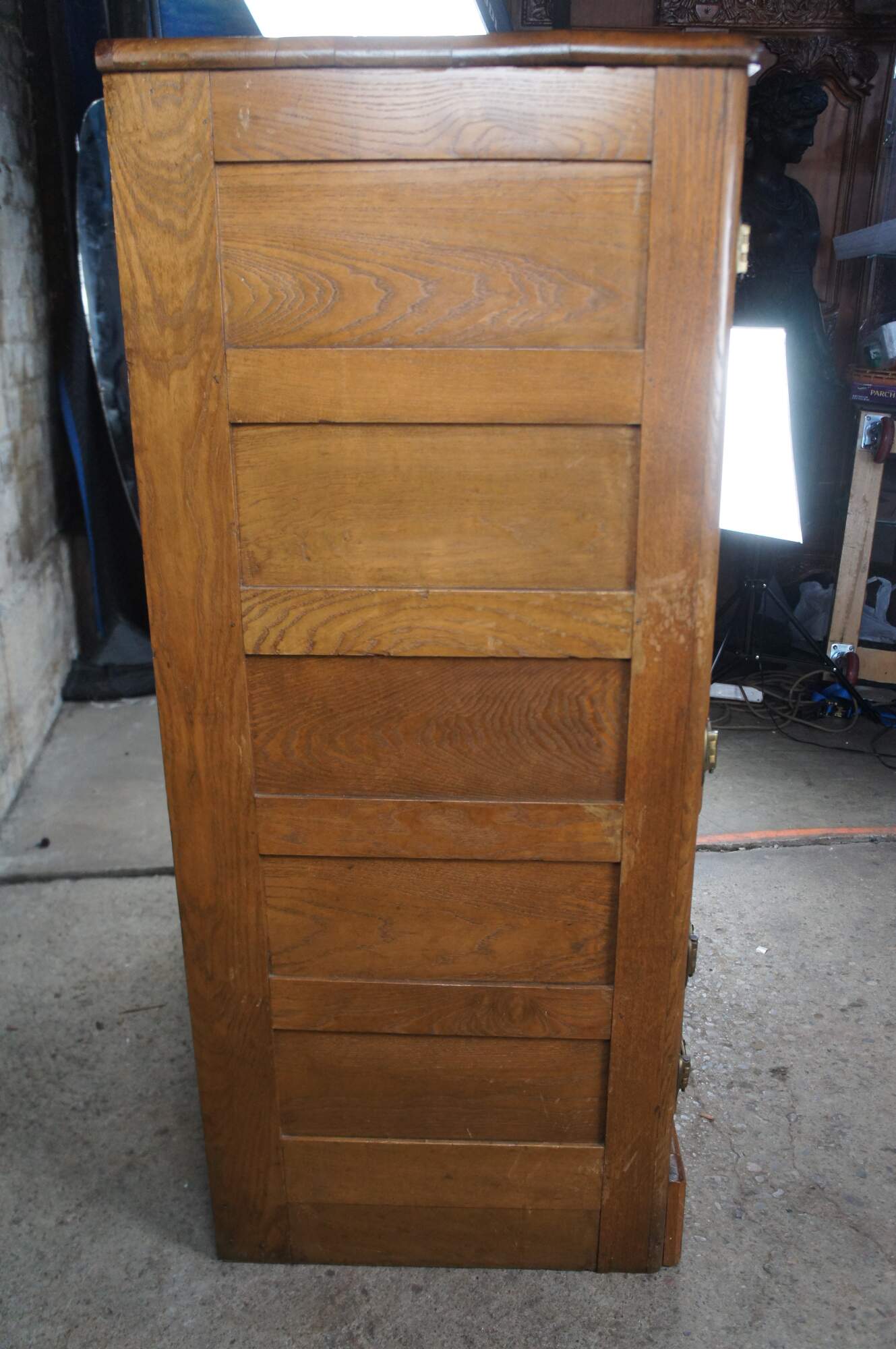 Charming early 20th century Ice chest. Made from oak and brass with an enamelled tin interior and metal shelves. The cabinet had two larger doors along the top over two smaller drawers at the base. Trim along the base flips open for drain. Maker unknown