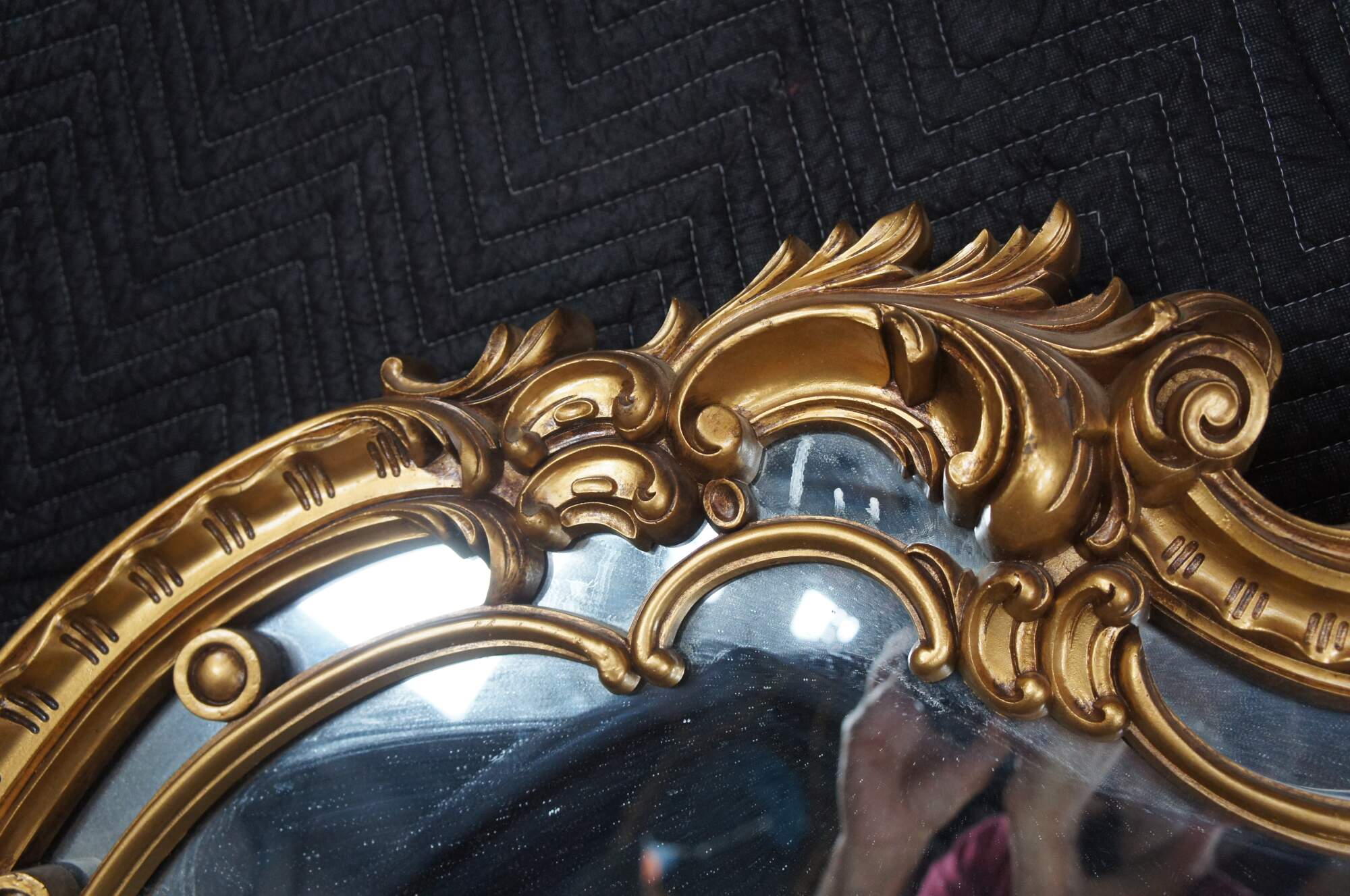 Turner Mfg Italian Baroque / Hollywood Regency style wall mirror, circa 1970s. Features a beautifully molded and scalloped frame with a rose crown and 'S' and 'C' scroll foliate and scalloped detail. A warm addition to any space.