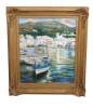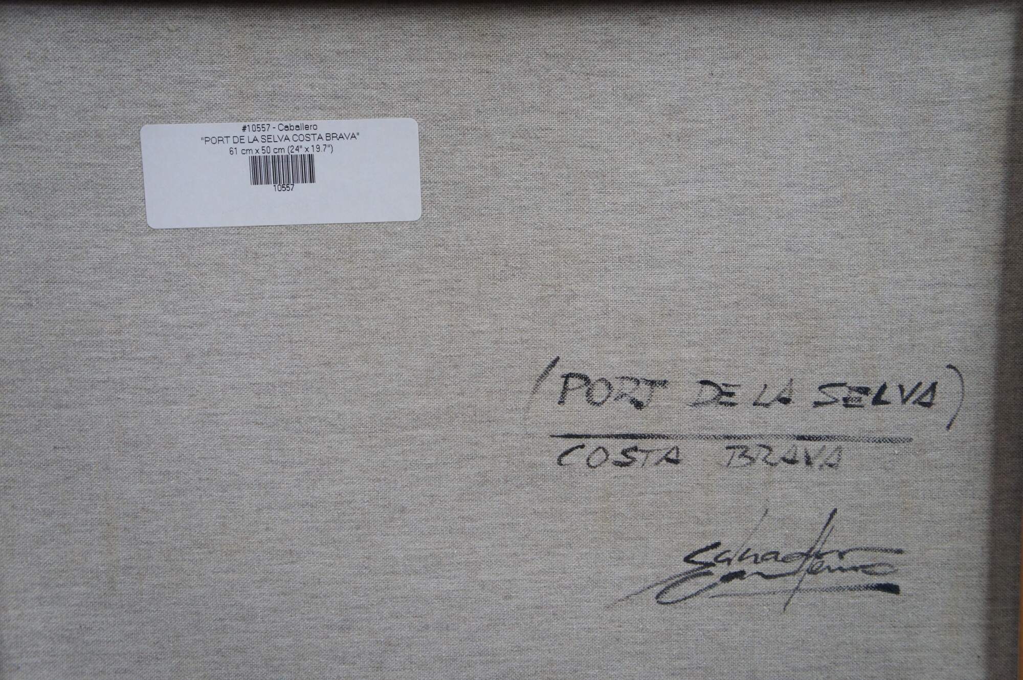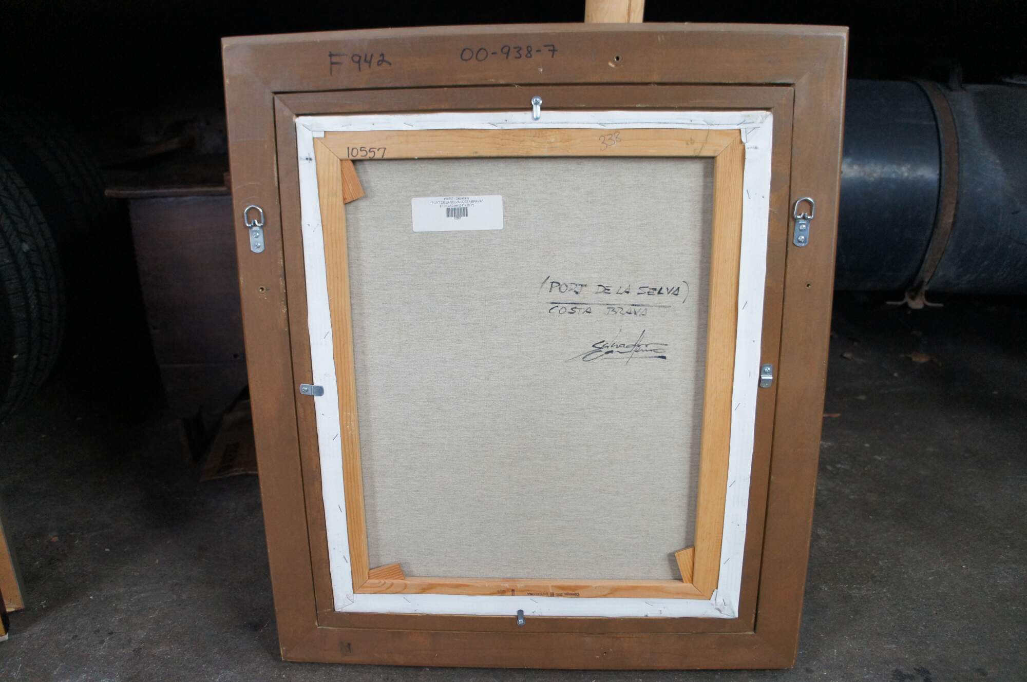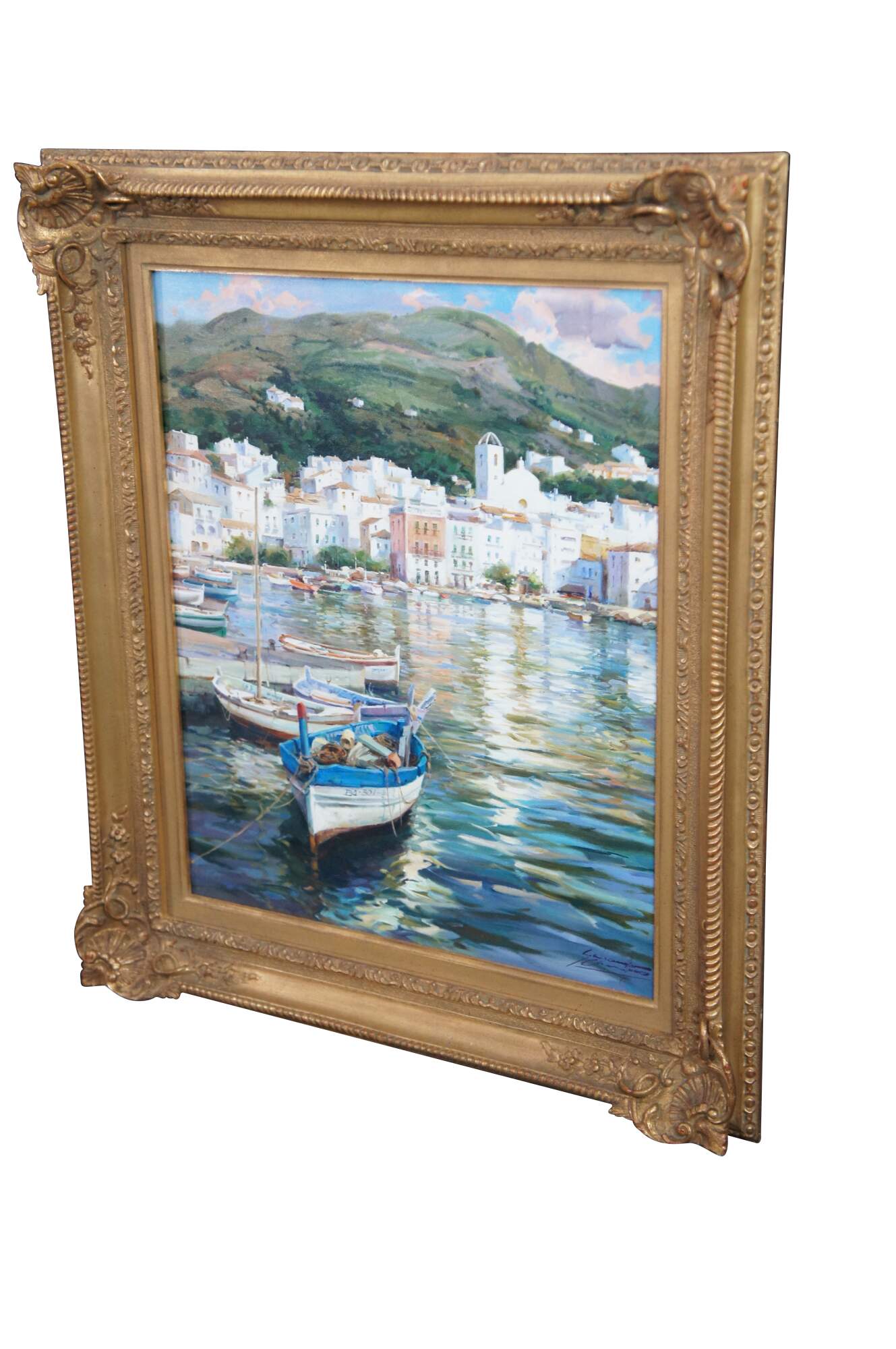 This exquisite oil painting by Salvador Caballero (1944-2006), a Spanish artist, captures the essence of Port De La Selva, a coastal gem in the Costa Brava region of northeastern Spain. The painting presents a panoramic coastal view from a dock or boat, with a vibrant architectural landscape adorning a prominent hillside. Fishing vessels and sailboats are elegantly docked within the harbour.