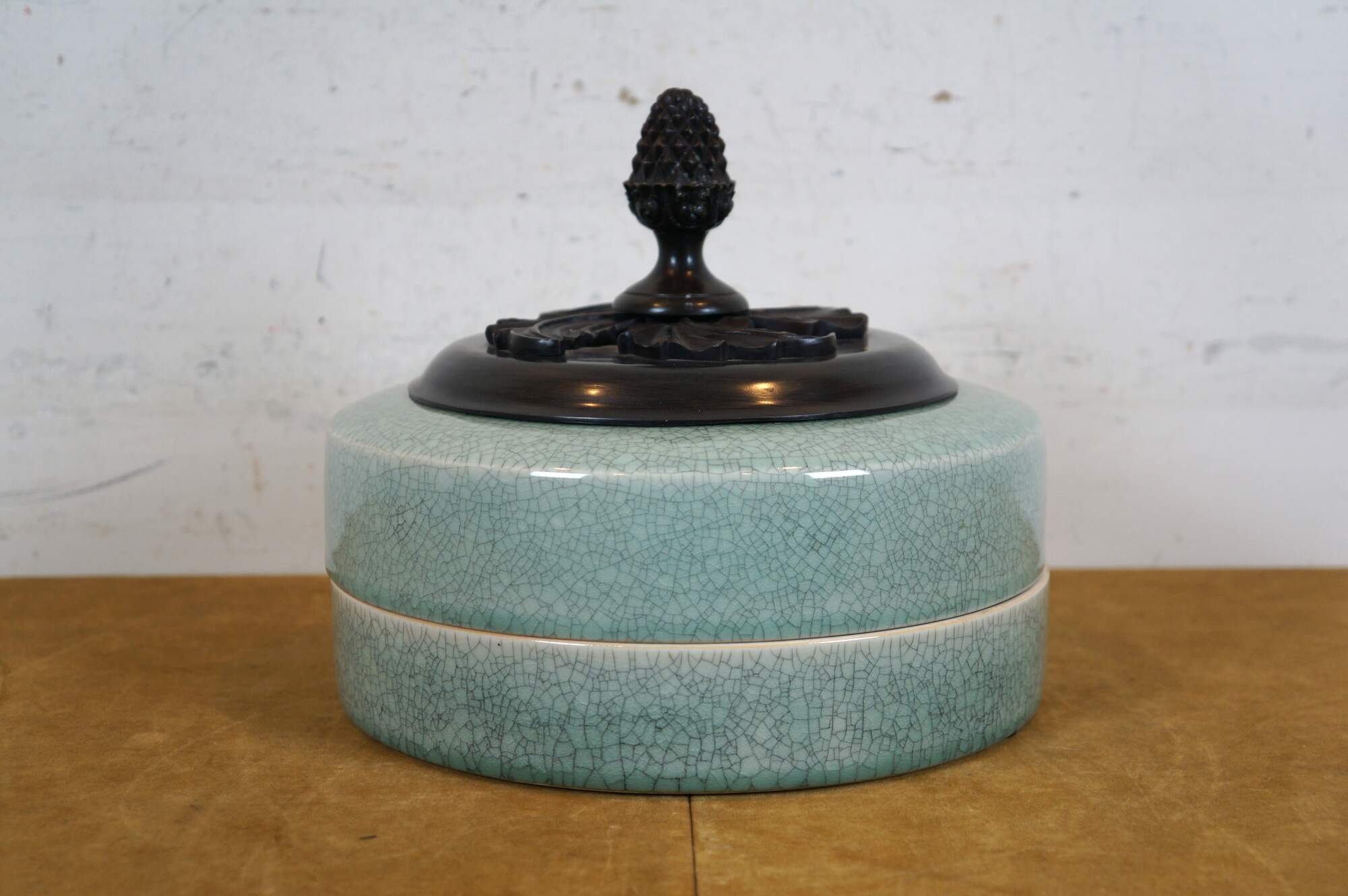 Maitland Smith round lidded trinket dish/box with a factory distressed pale celadon green glaze, topped with a bronze pineapple shaped finial.