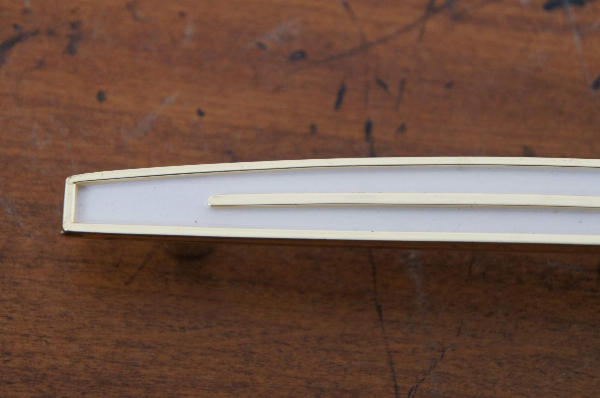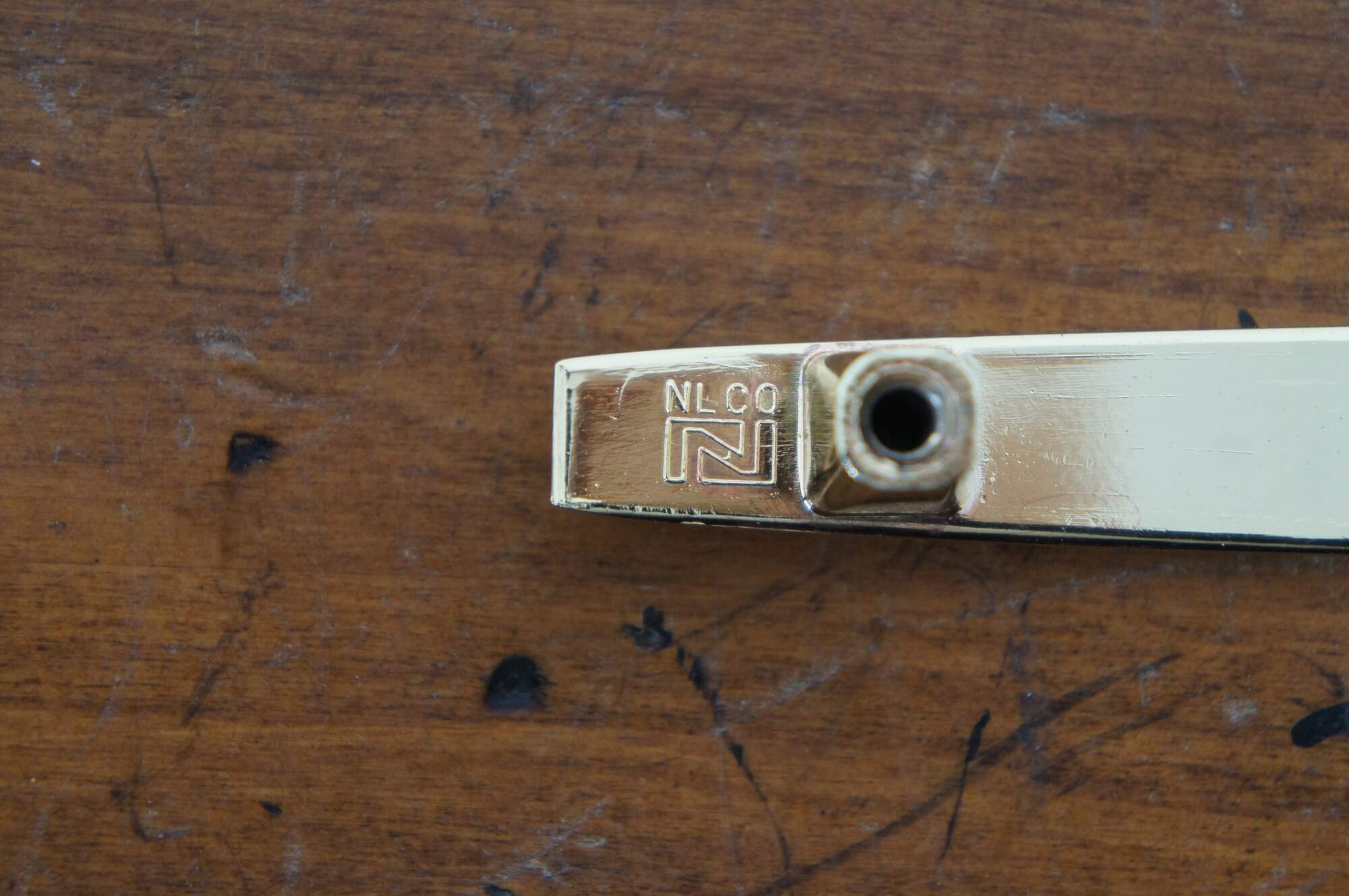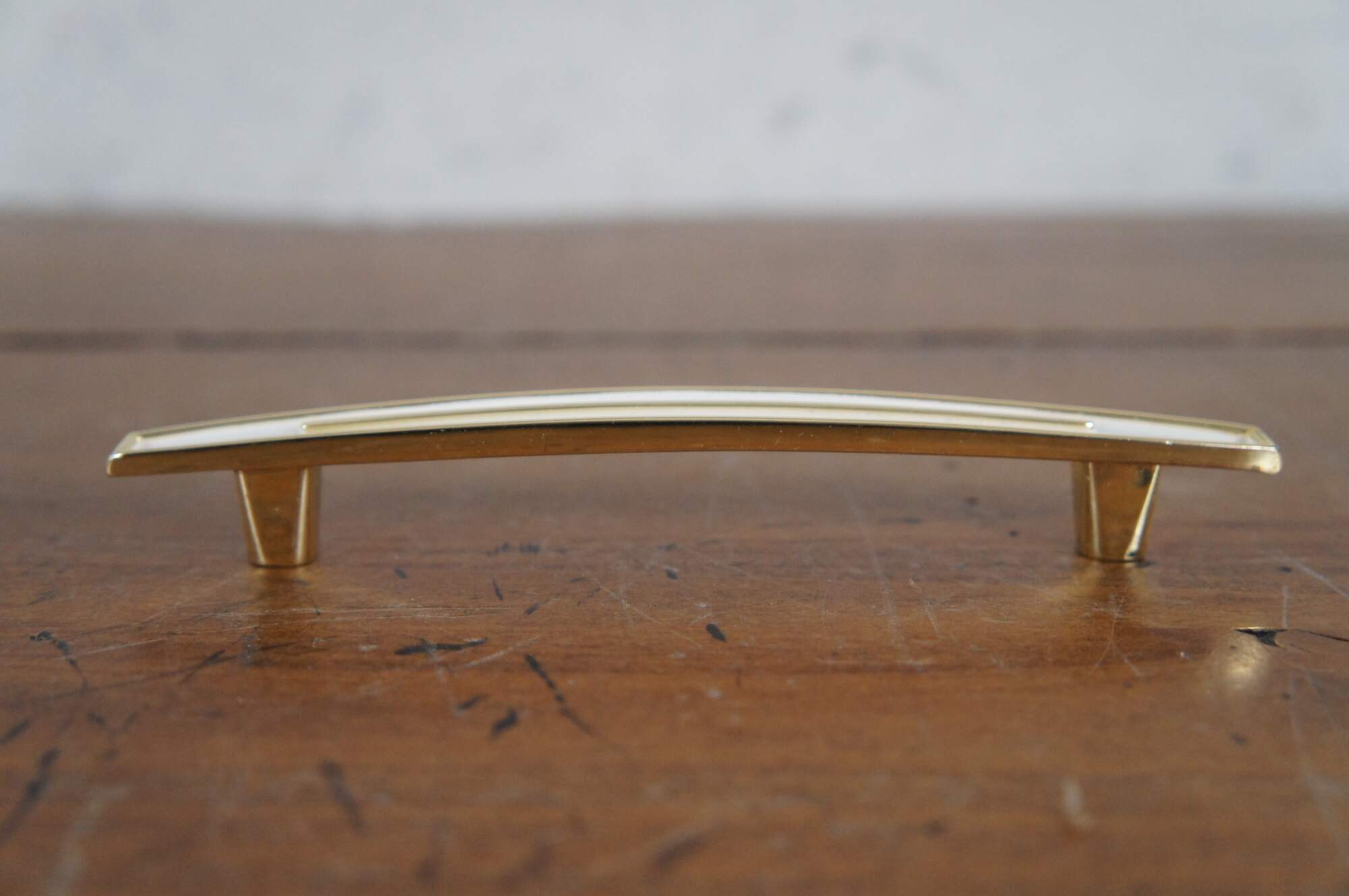 7 Available - Mid to late 20th century old-stock drawer / cabinet pulls. National Lock Company - Medalist, item number C635-3-1W Pulls, Dramatic, Bright Brass White Accent. Mid Century modern styling. Bowed out, rounded rectangular shape with recessed, lightly textured recessed surface and ridge along center. Hole Centers - 4