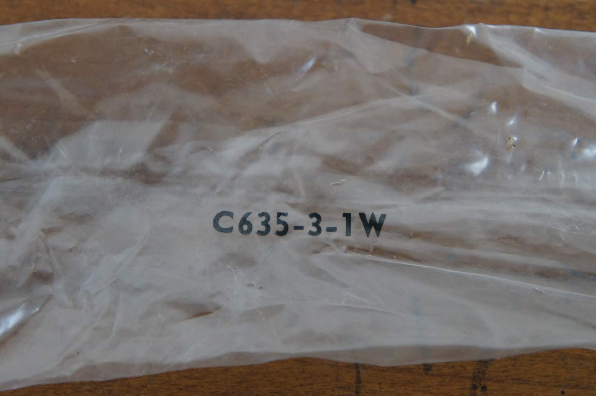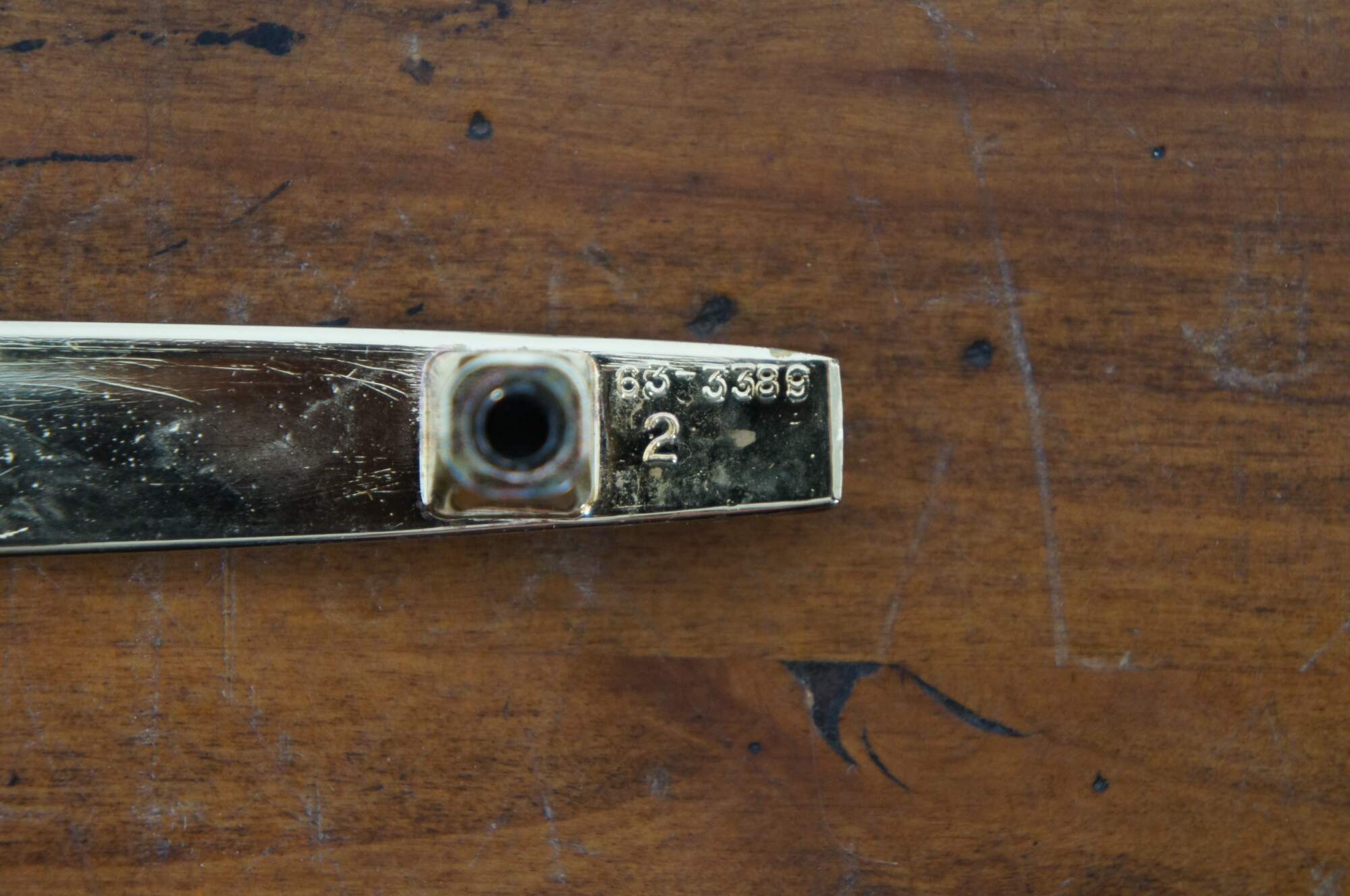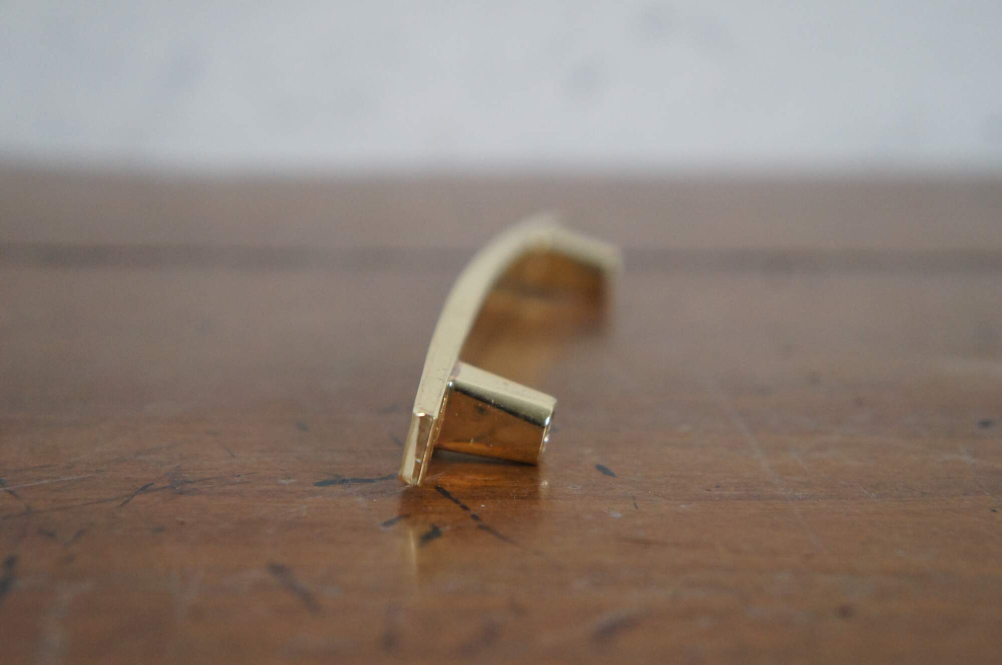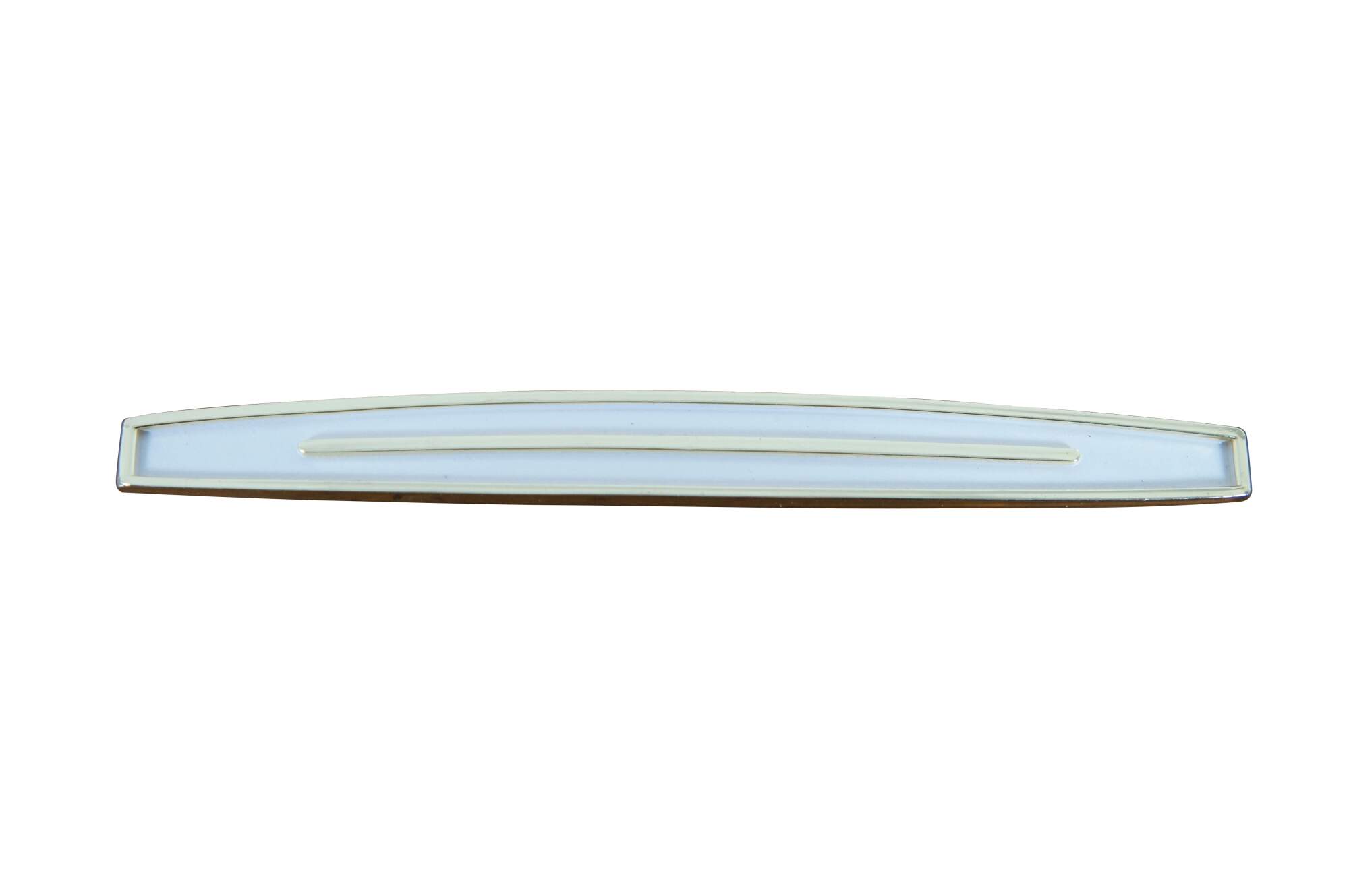 7 Available - Mid to late 20th century old-stock drawer / cabinet pulls. National Lock Company - Medalist, item number C635-3-1W Pulls, Dramatic, Bright Brass White Accent. Mid Century modern styling. Bowed out, rounded rectangular shape with recessed, lightly textured recessed surface and ridge along center. Hole Centers - 4
