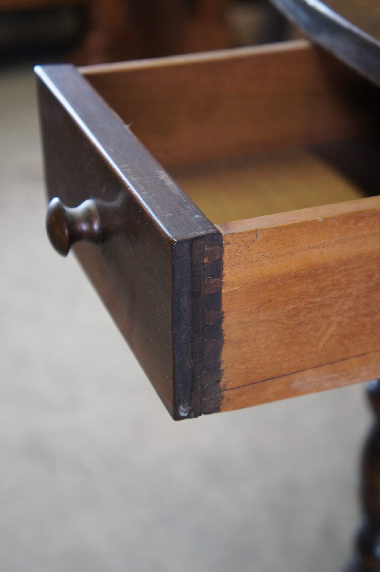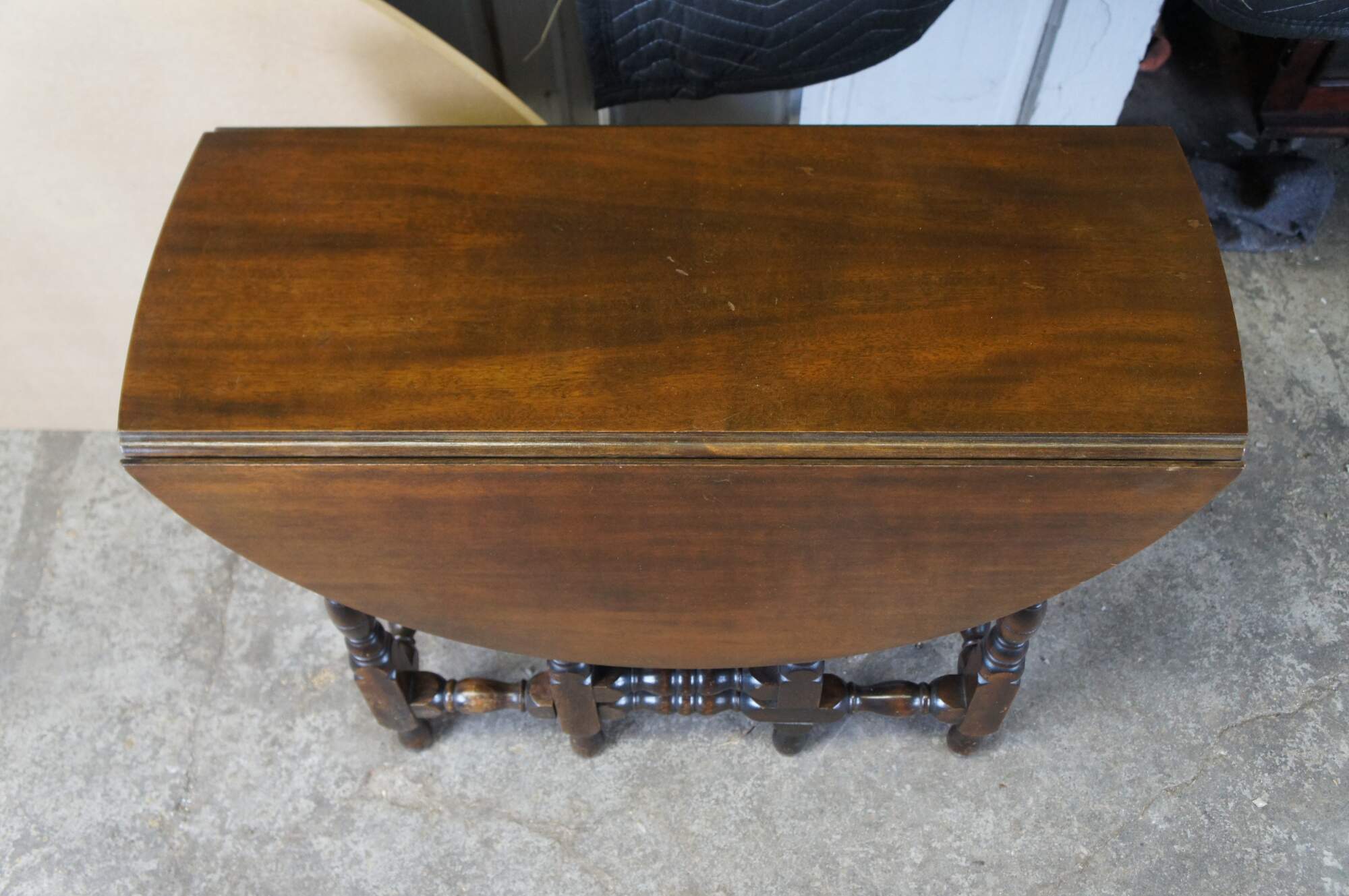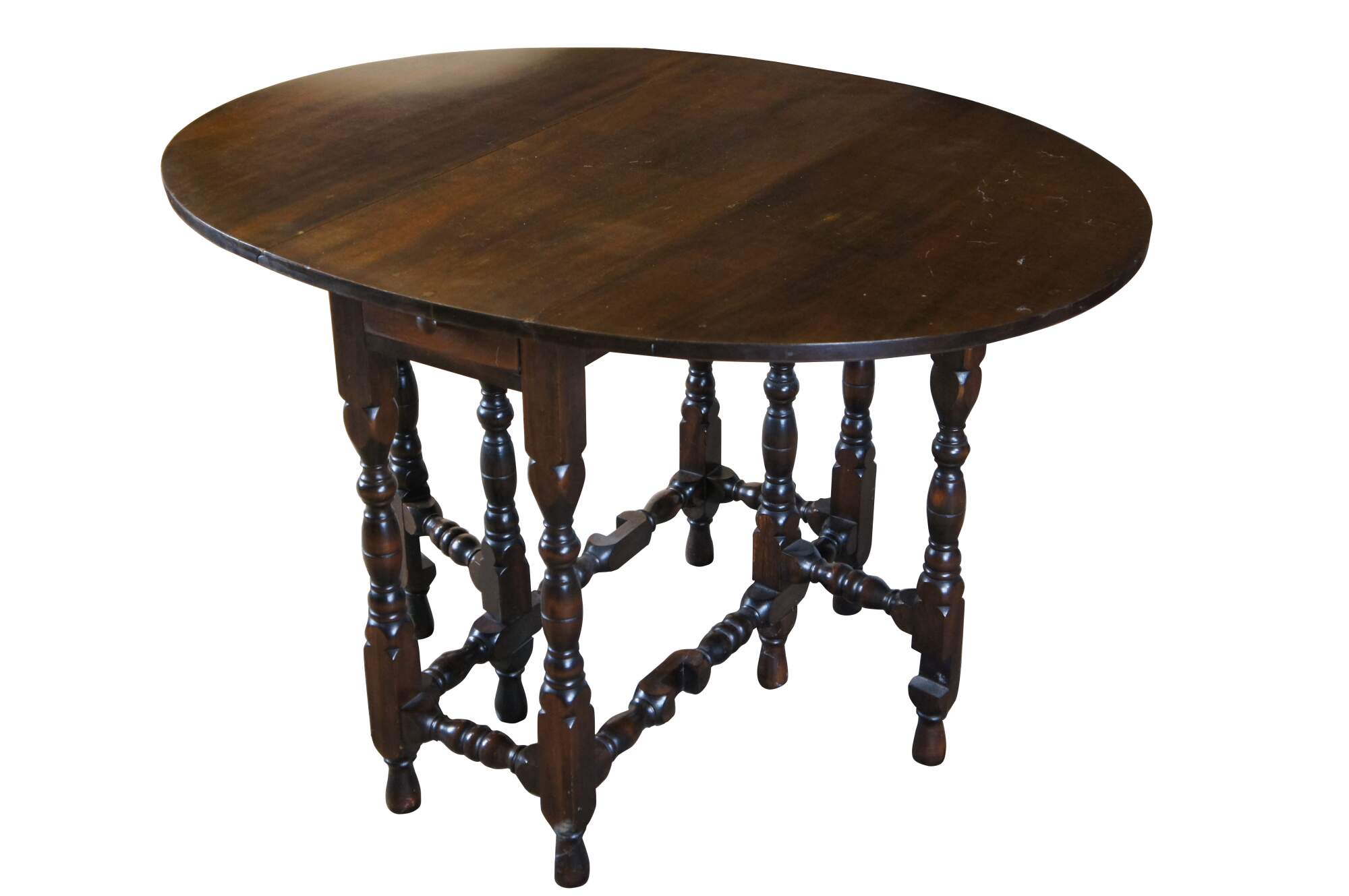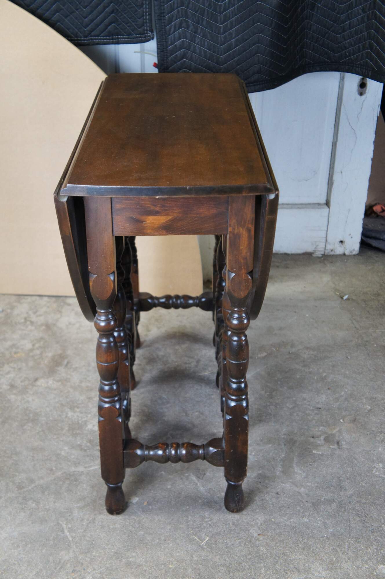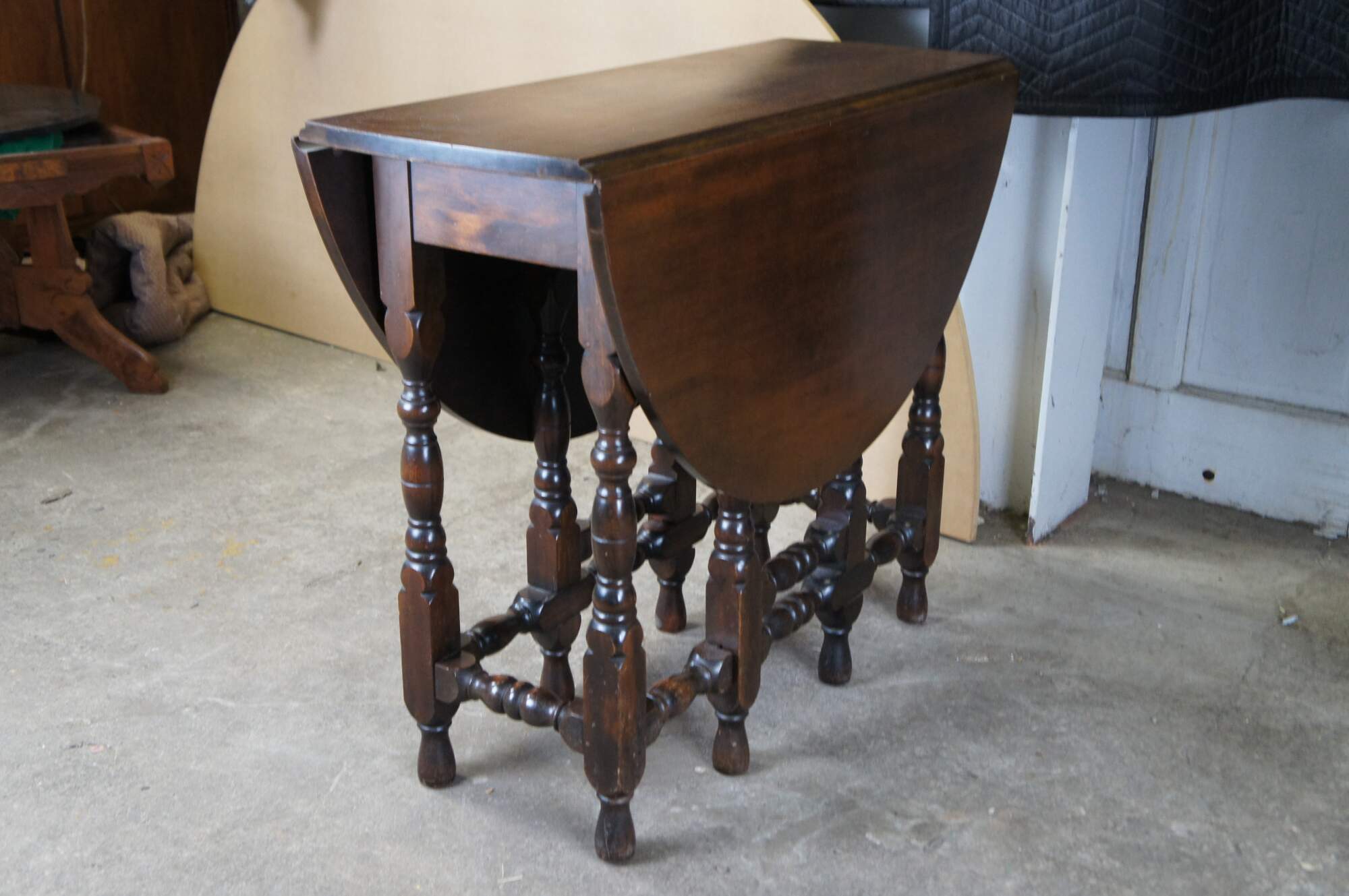 An early 20th Century oak gateleg table. A retangular form finished in a dark oak with two crescent shaped drop leaves and a central dovetailed frieze drawer. Features turned and joined legs with peg feet. Great for use in a hall, entry or breakfast nook.