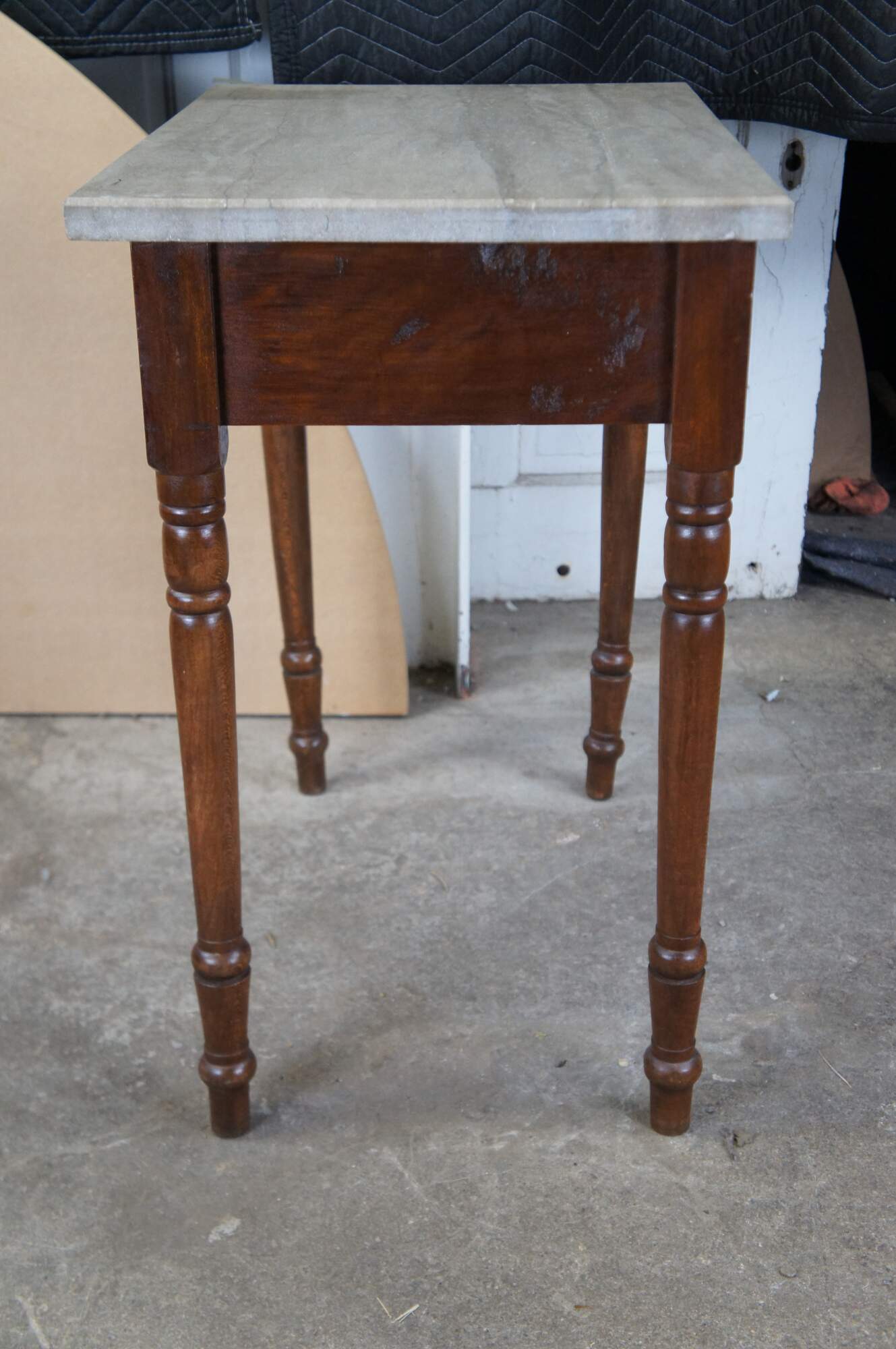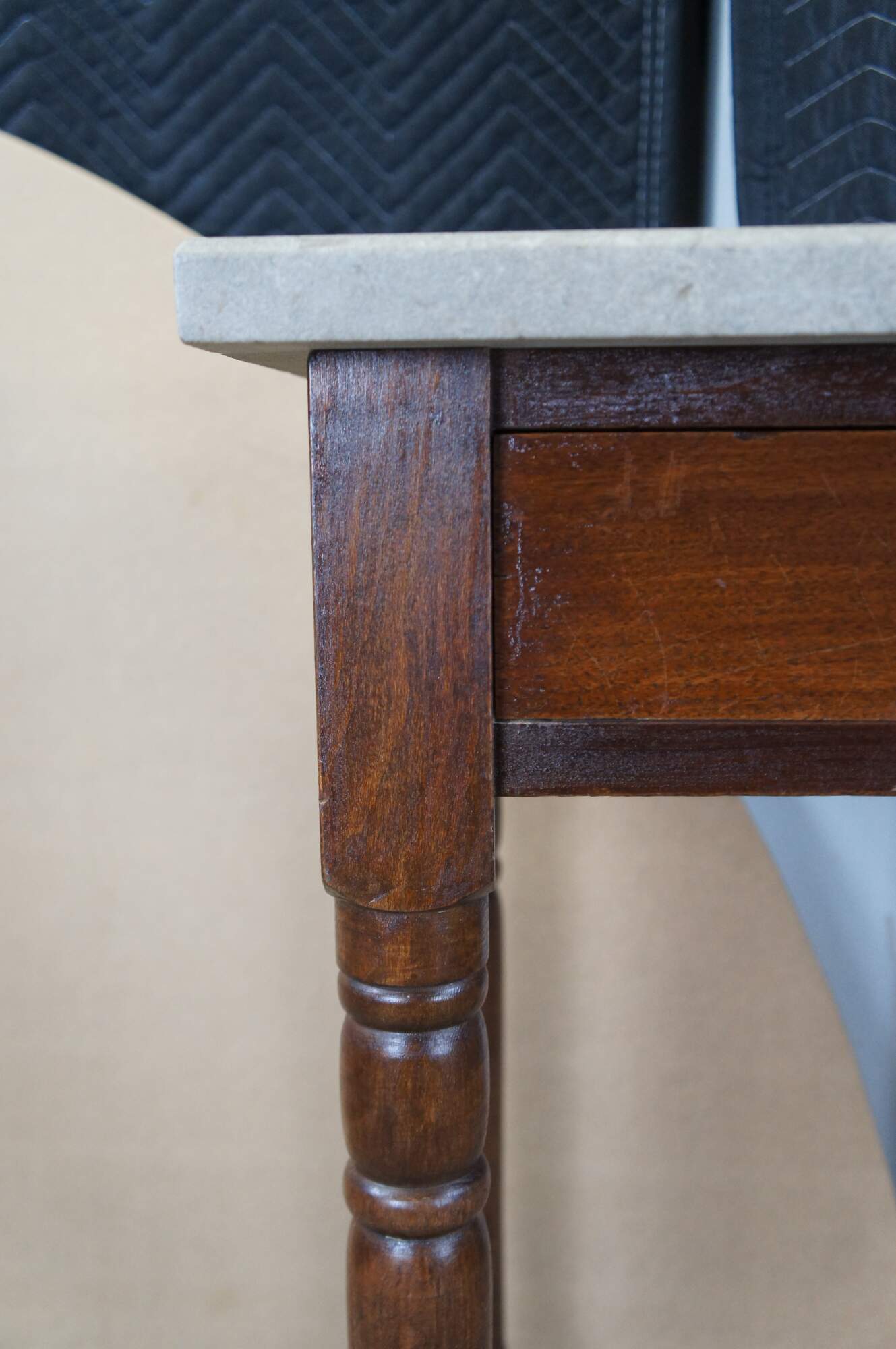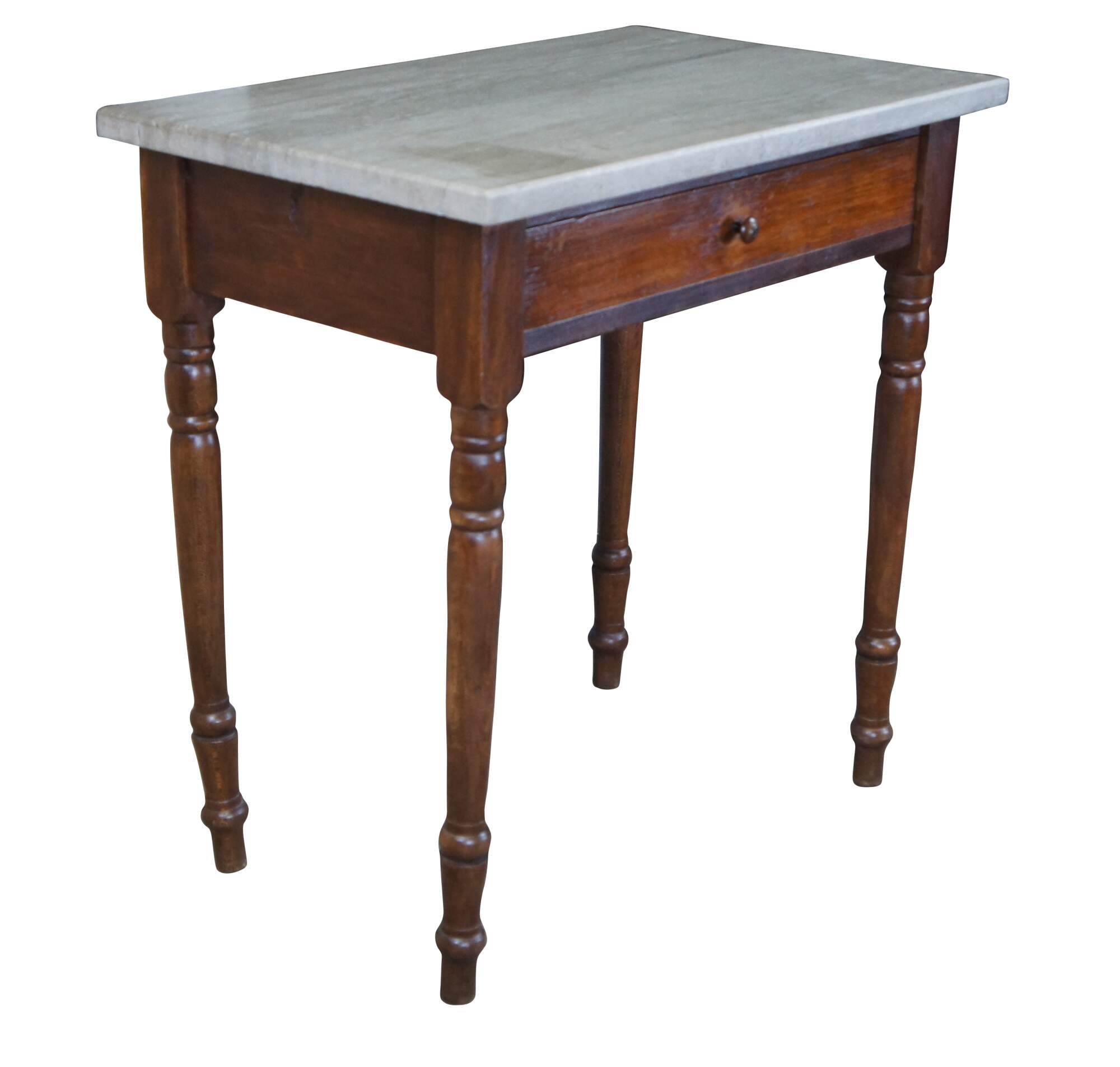 Late 19th Century Victorian occasional table. Features a rectangular form made from walnut with a granite top and hand-dovetailed frieze drawer. The desk is supported by turned legs leading to arrow feet.