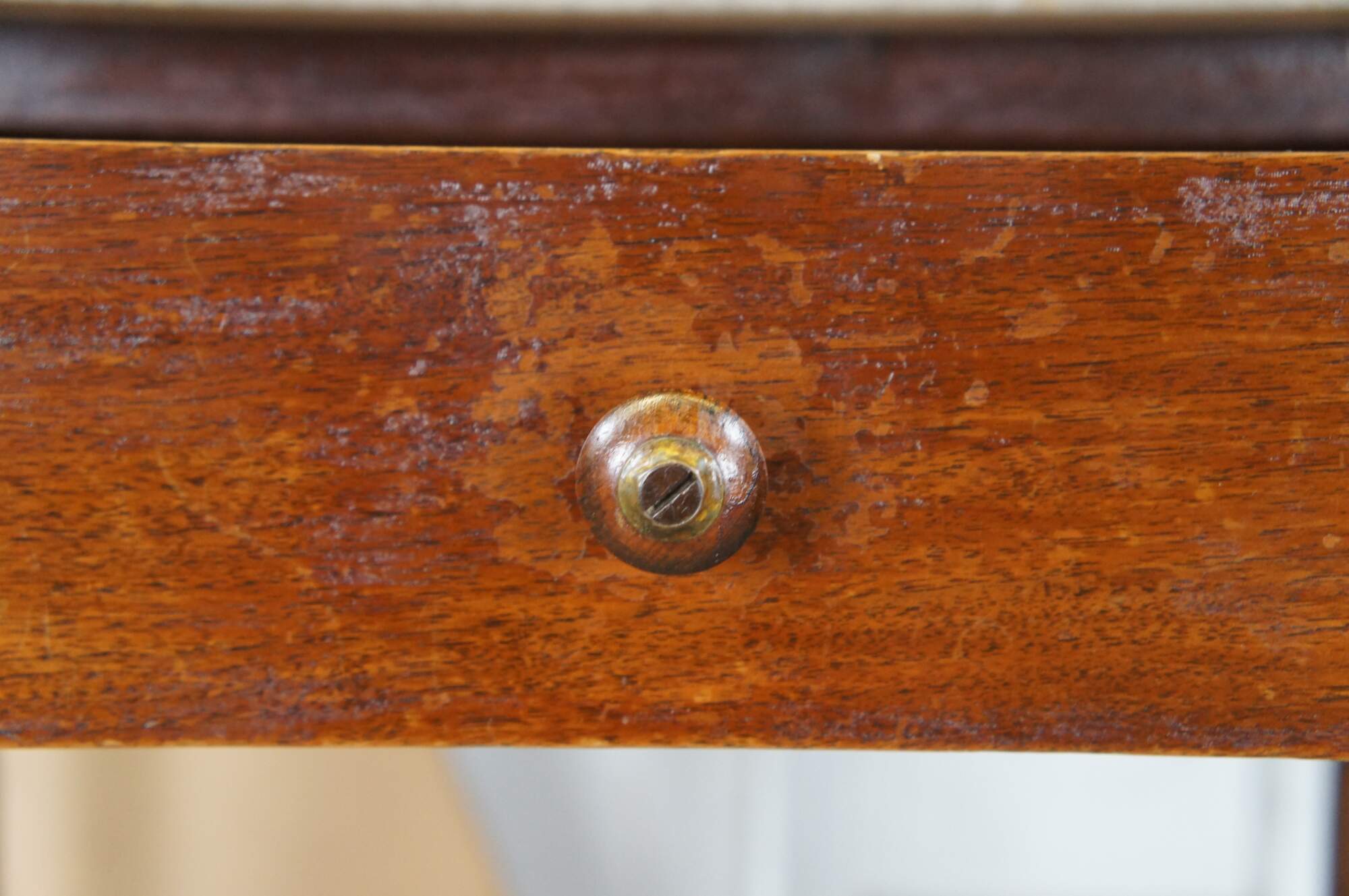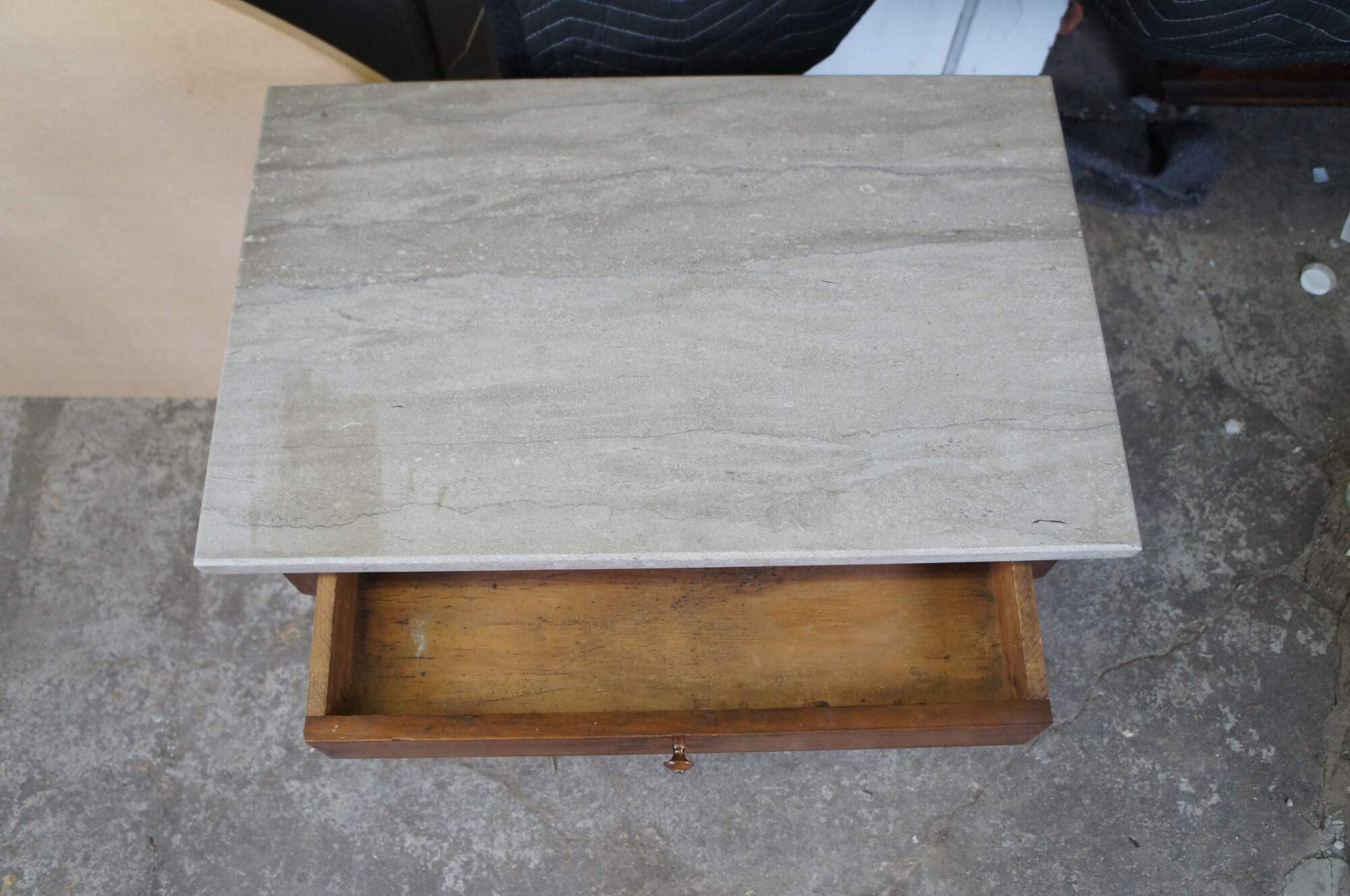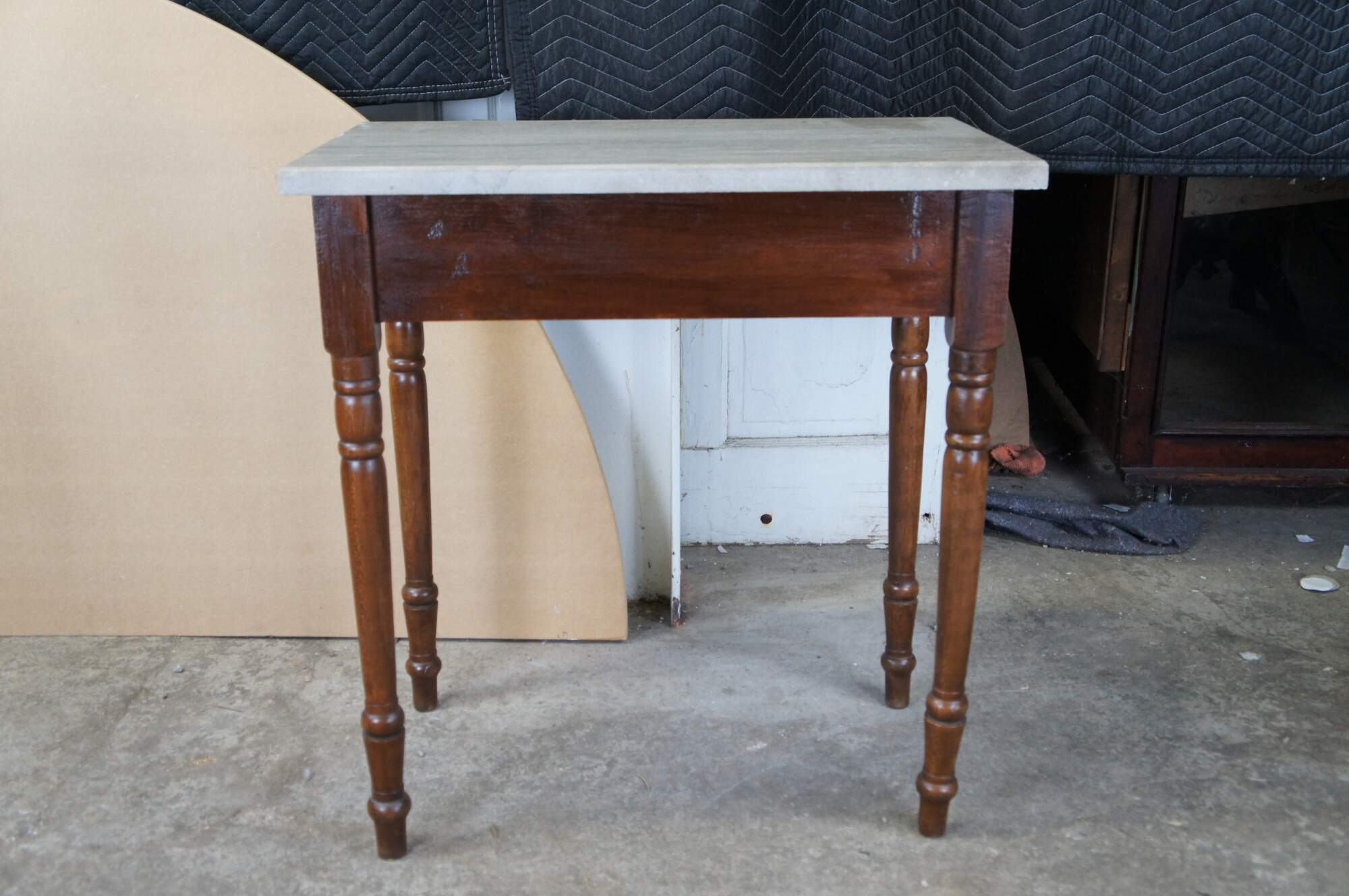 Late 19th Century Victorian occasional table. Features a rectangular form made from walnut with a granite top and hand-dovetailed frieze drawer. The desk is supported by turned legs leading to arrow feet.