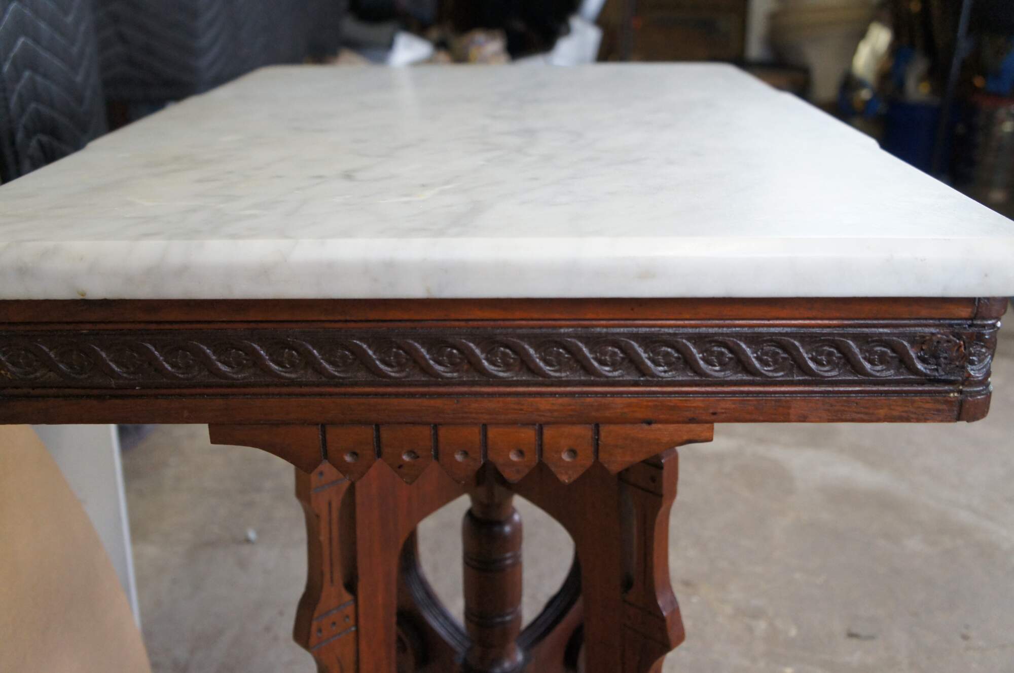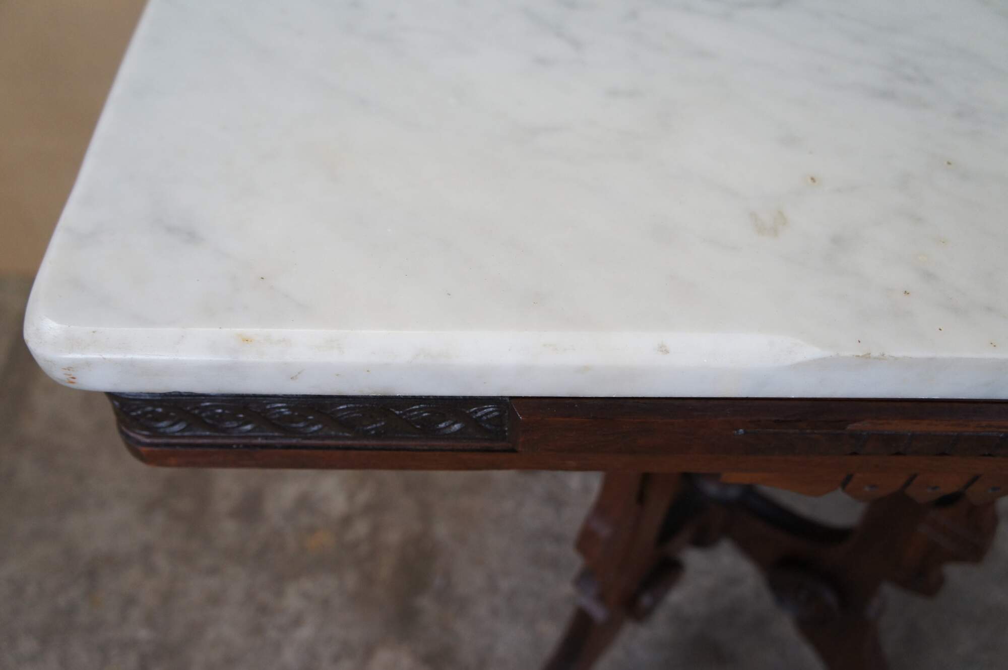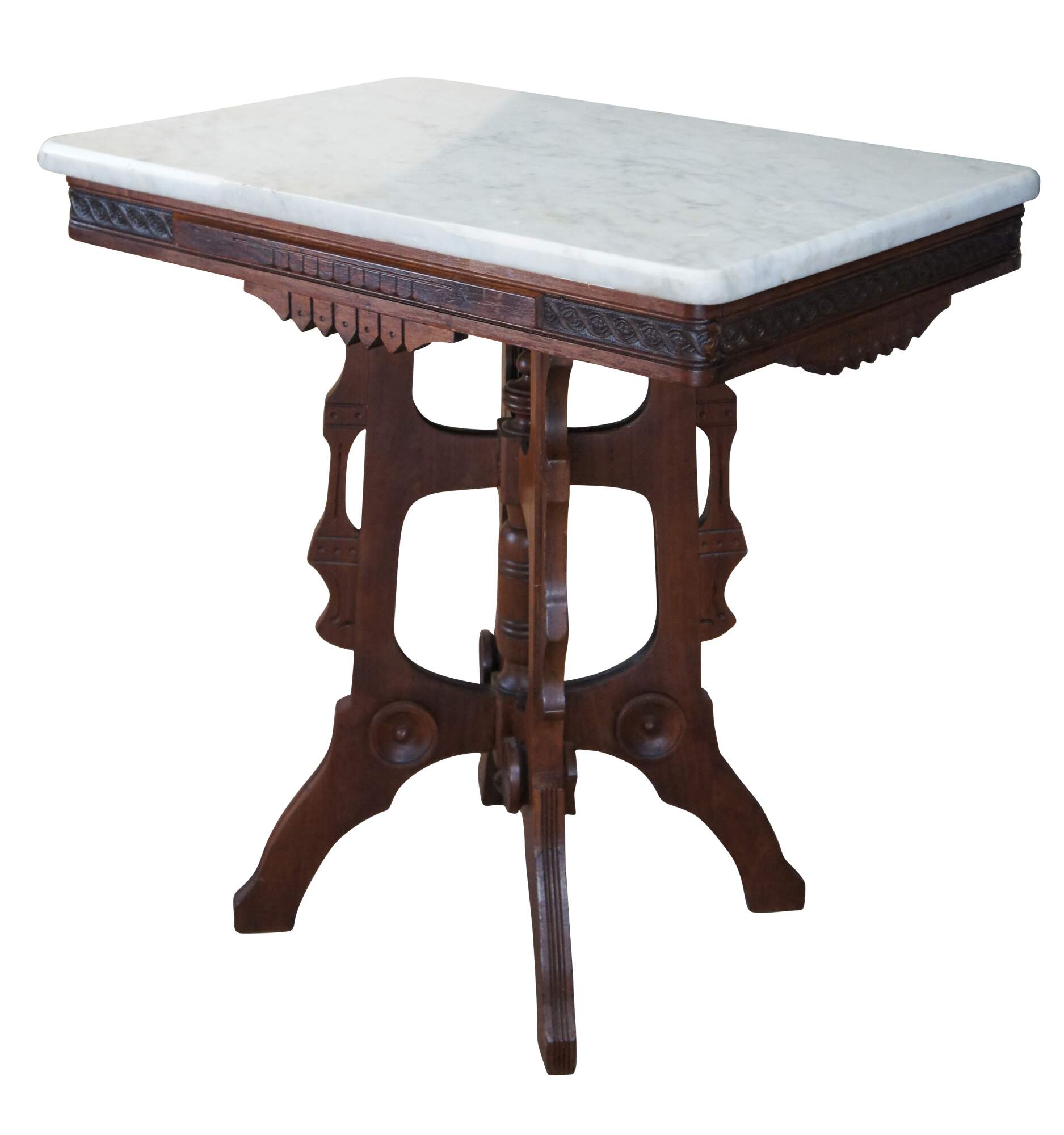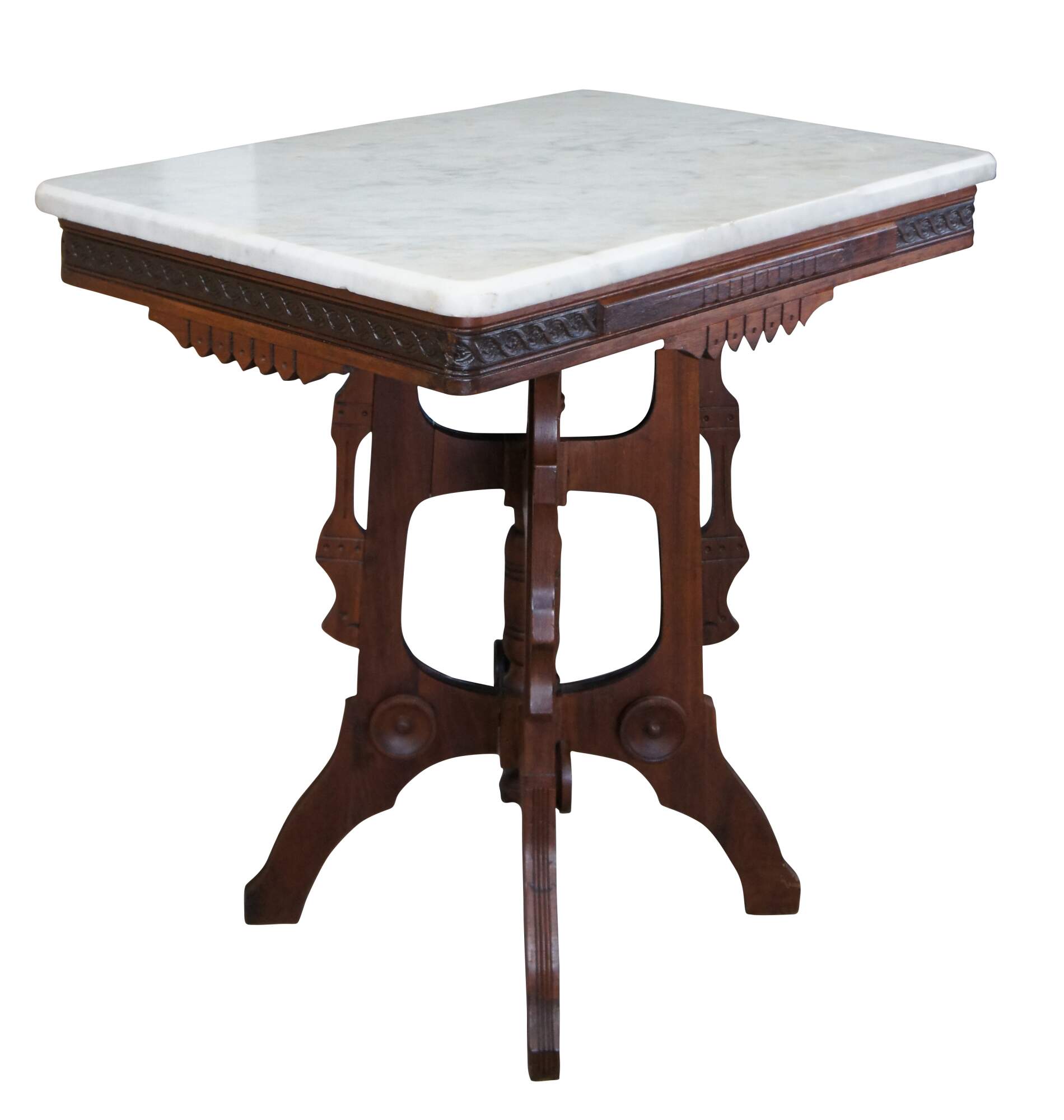 Victorian late 19th century walnut parlor table. Features a rectangular form with white marble top over carved frieze. The table is supported by an open base with four legs and round embelishments.