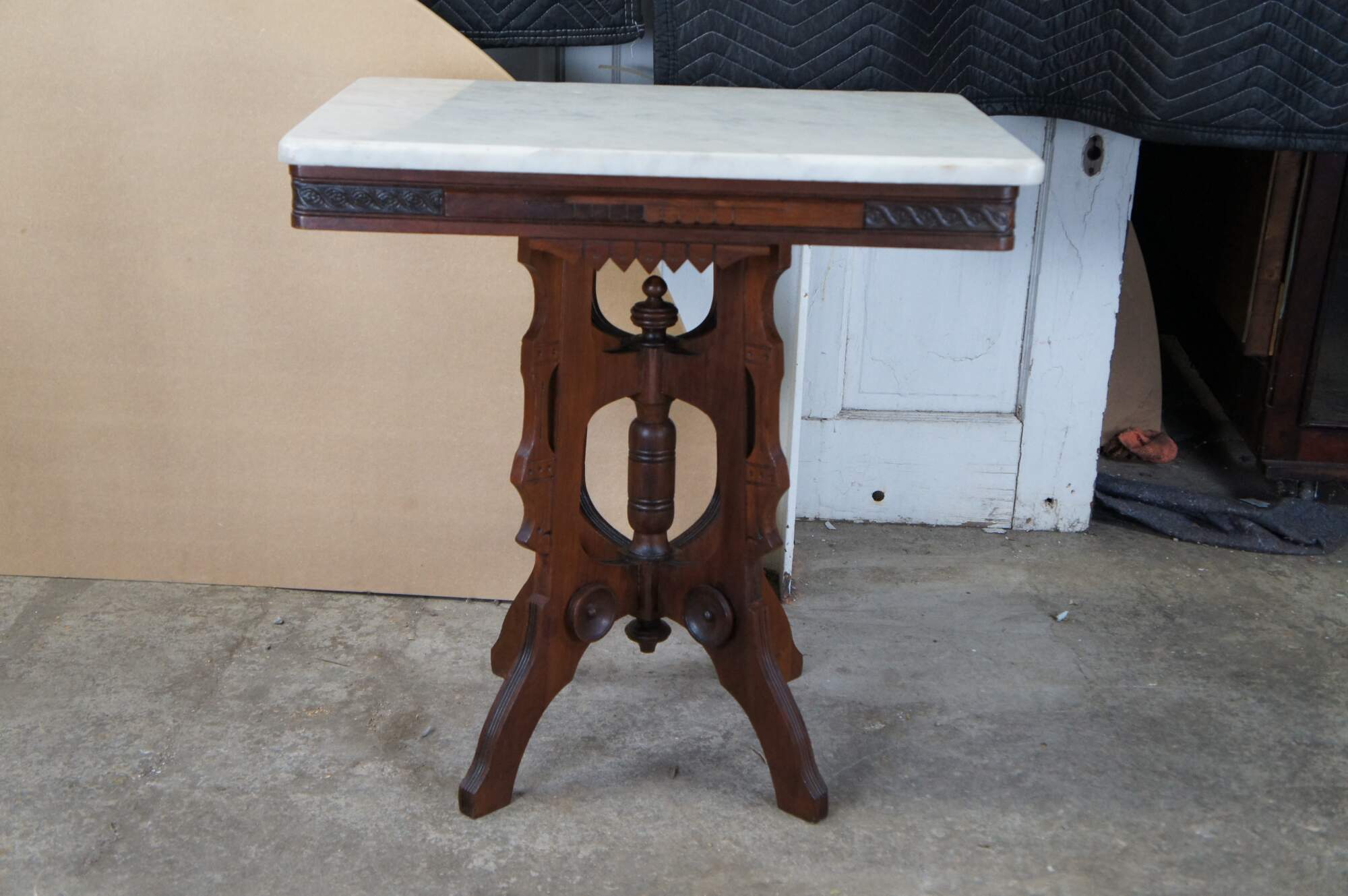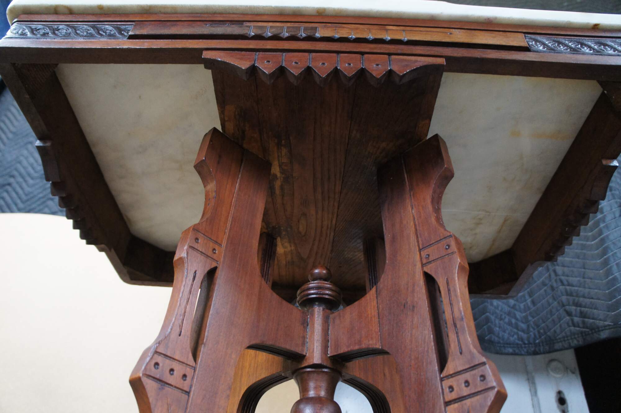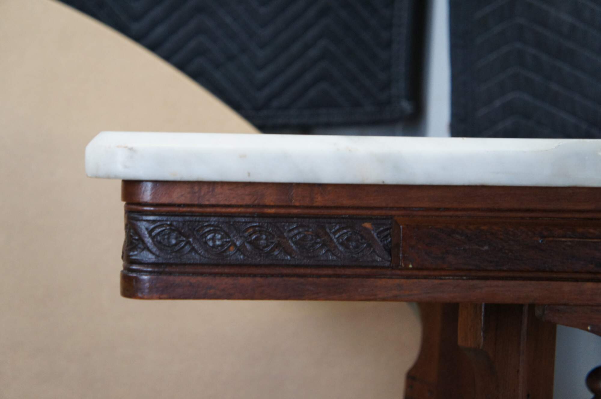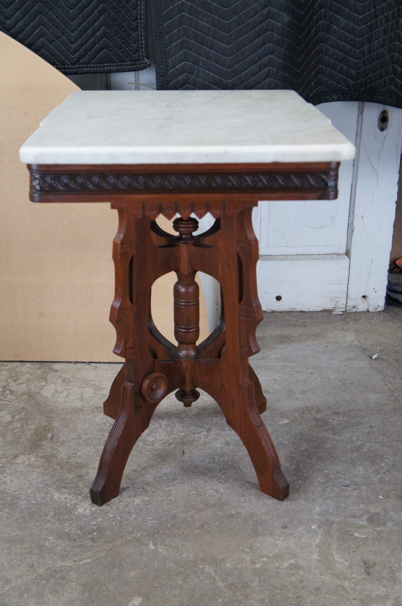 Victorian late 19th century walnut parlor table. Features a rectangular form with white marble top over carved frieze. The table is supported by an open base with four legs and round embelishments.
