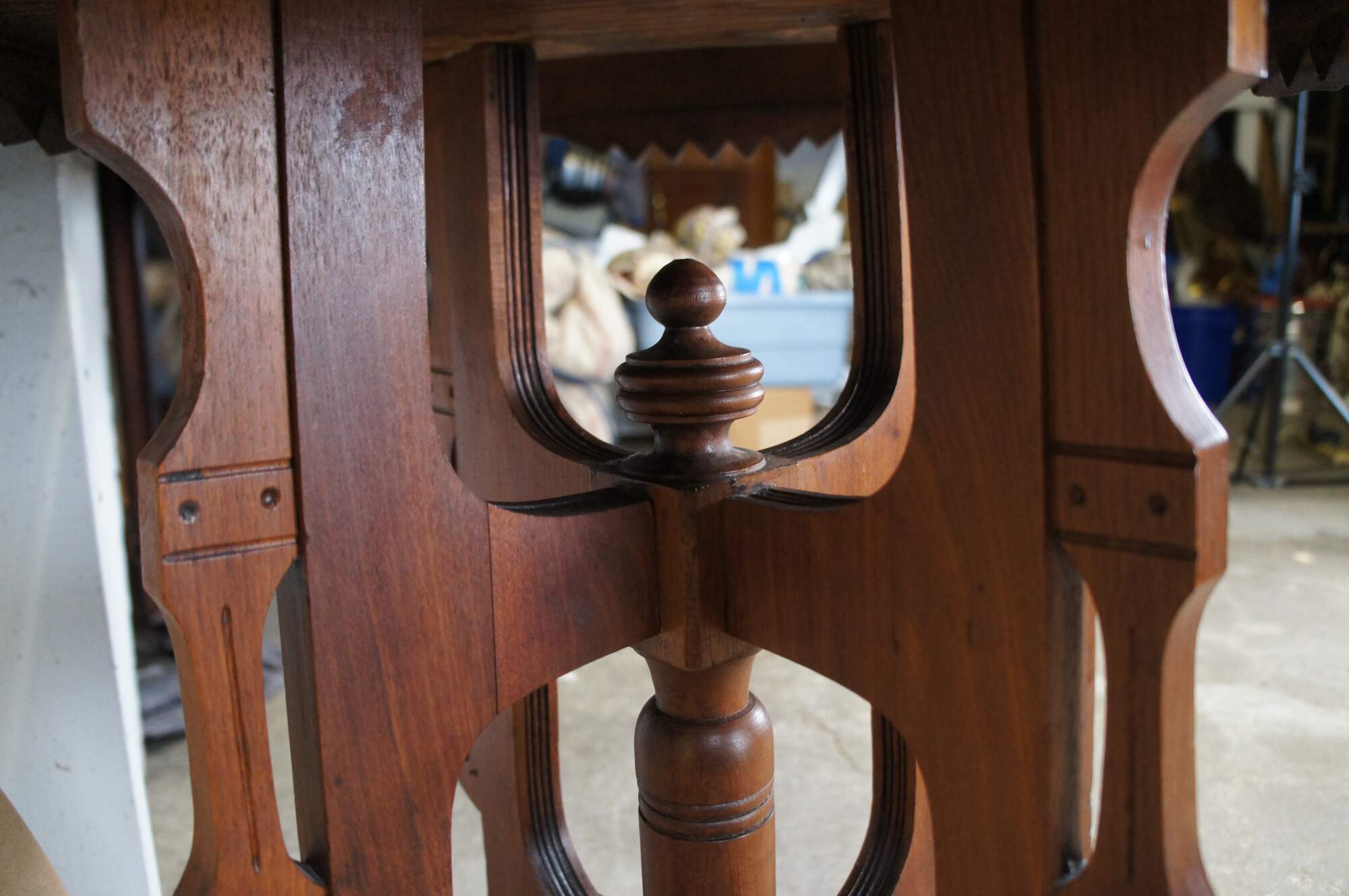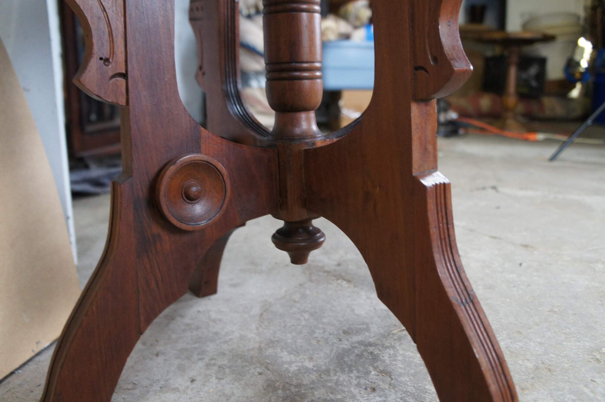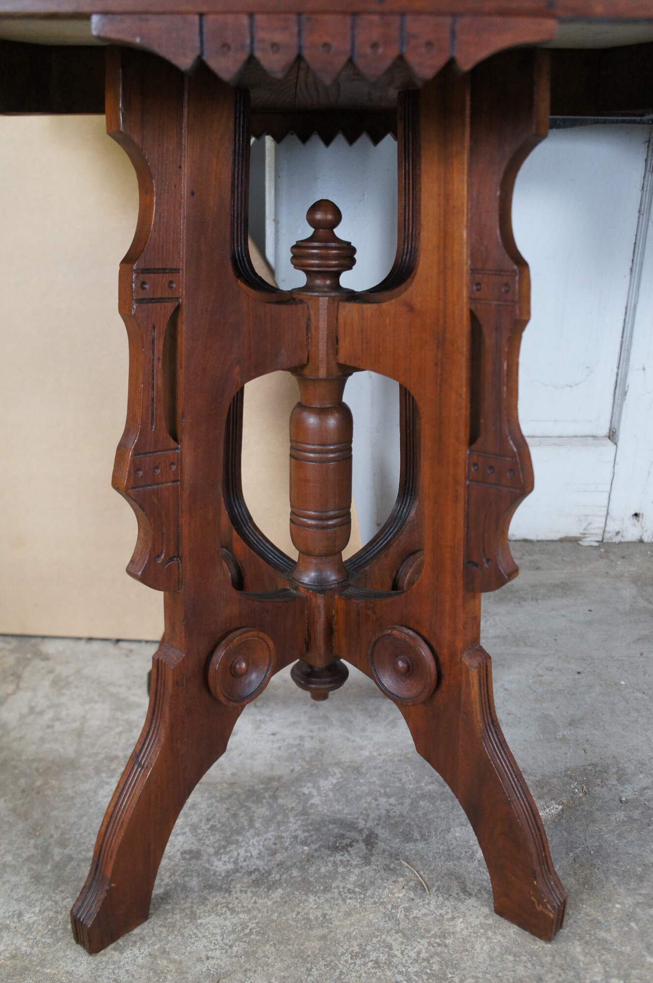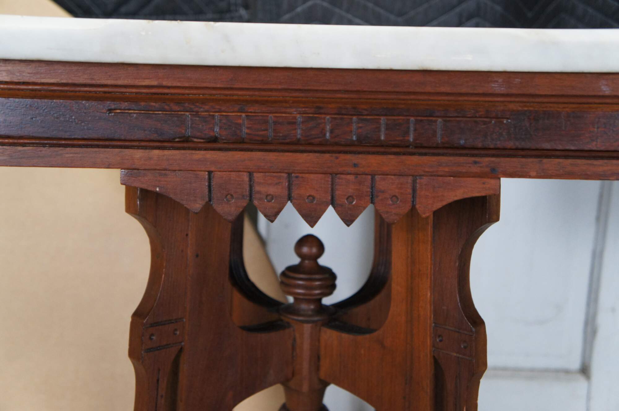 Victorian late 19th century walnut parlor table. Features a rectangular form with white marble top over carved frieze. The table is supported by an open base with four legs and round embelishments.