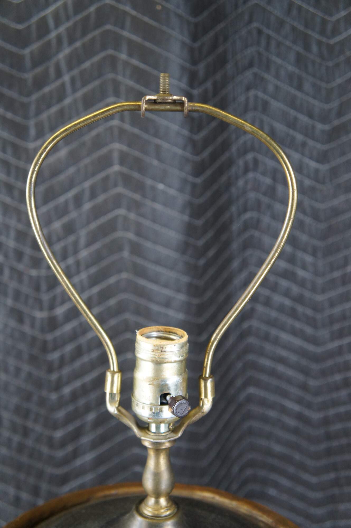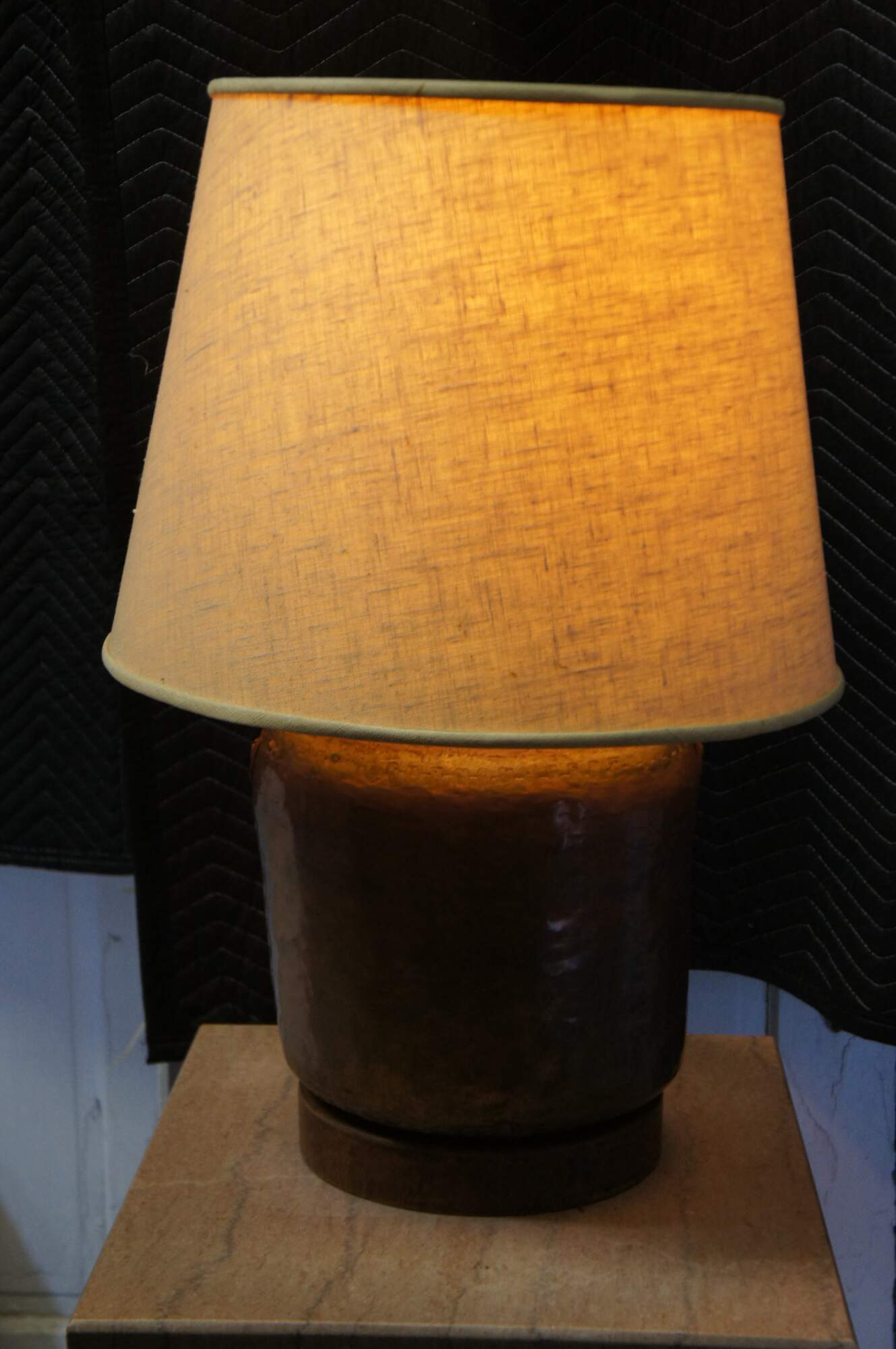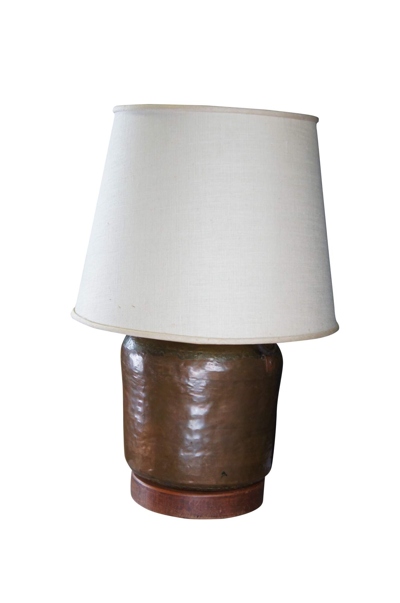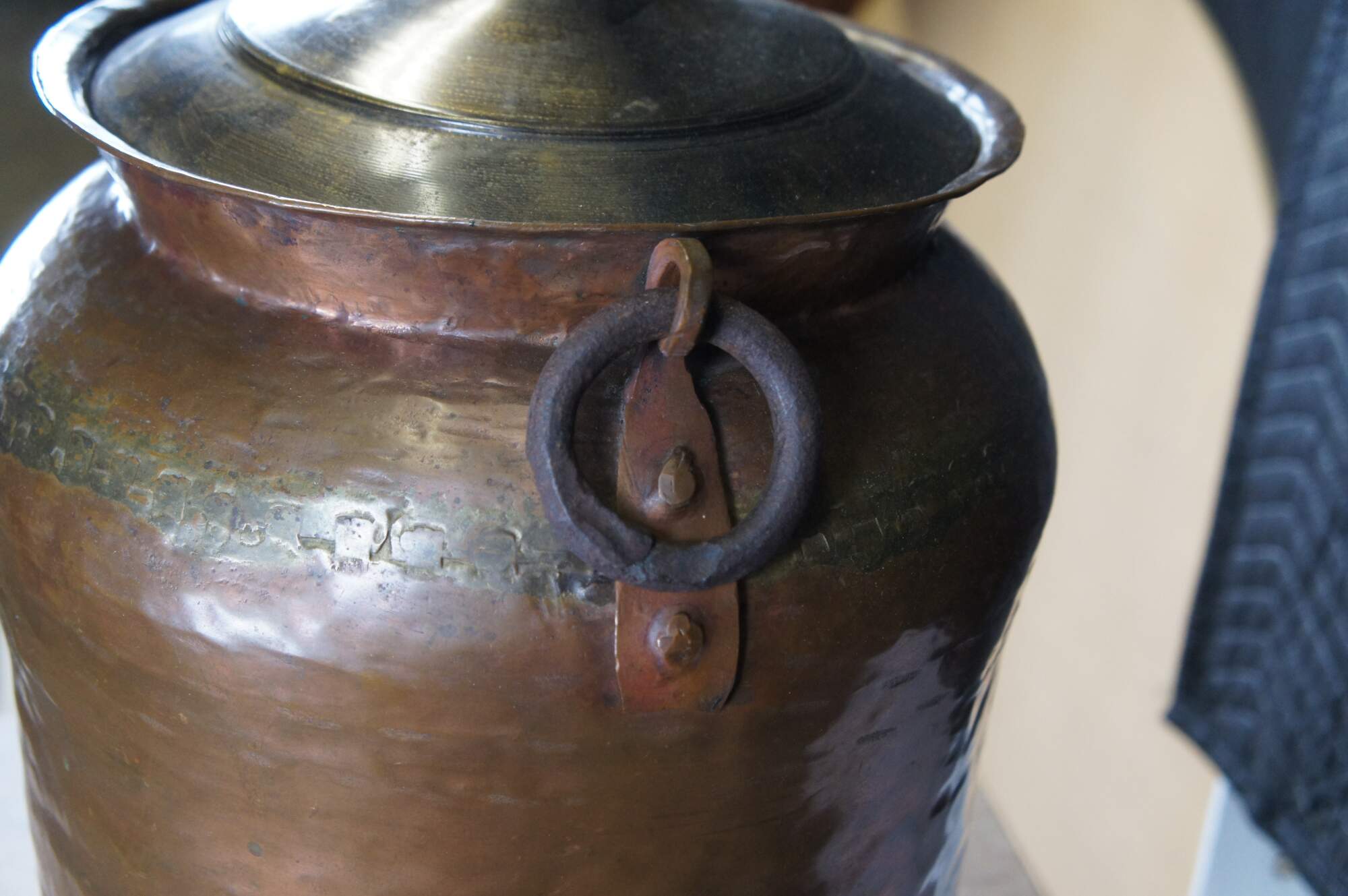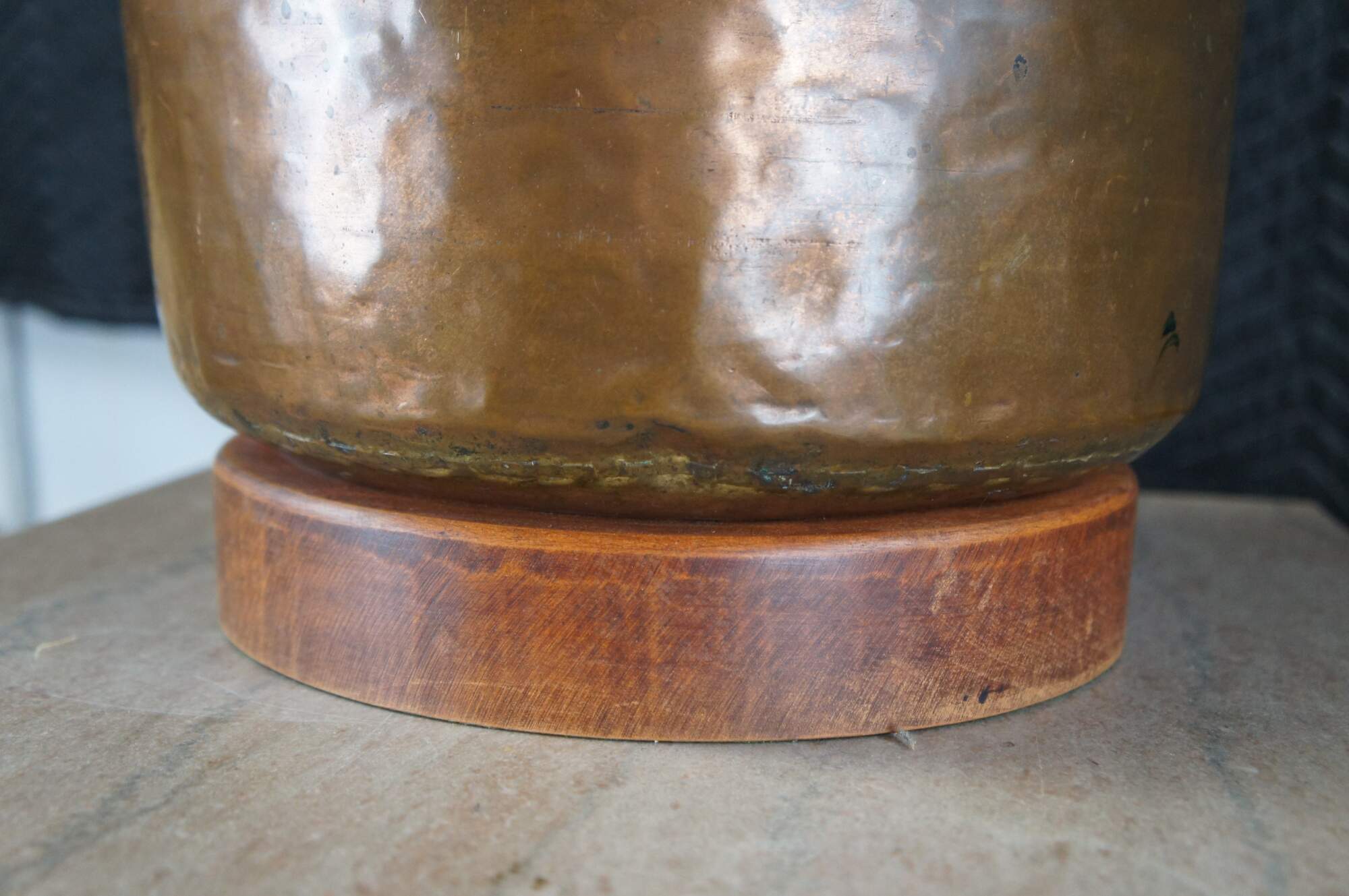 A beautiful antique hammered and dovetailed copper pot or canister table lamp. The rustic 19th century pot has a unique form and charming patina. Includes two iron handles and sits on a wooden plinth base. The pot was converted to a lamp around 1980.