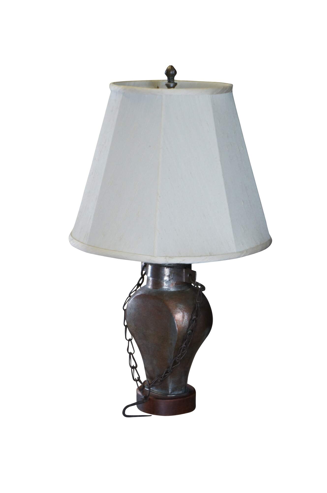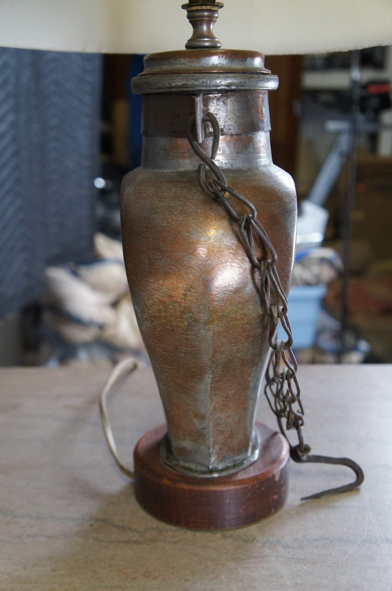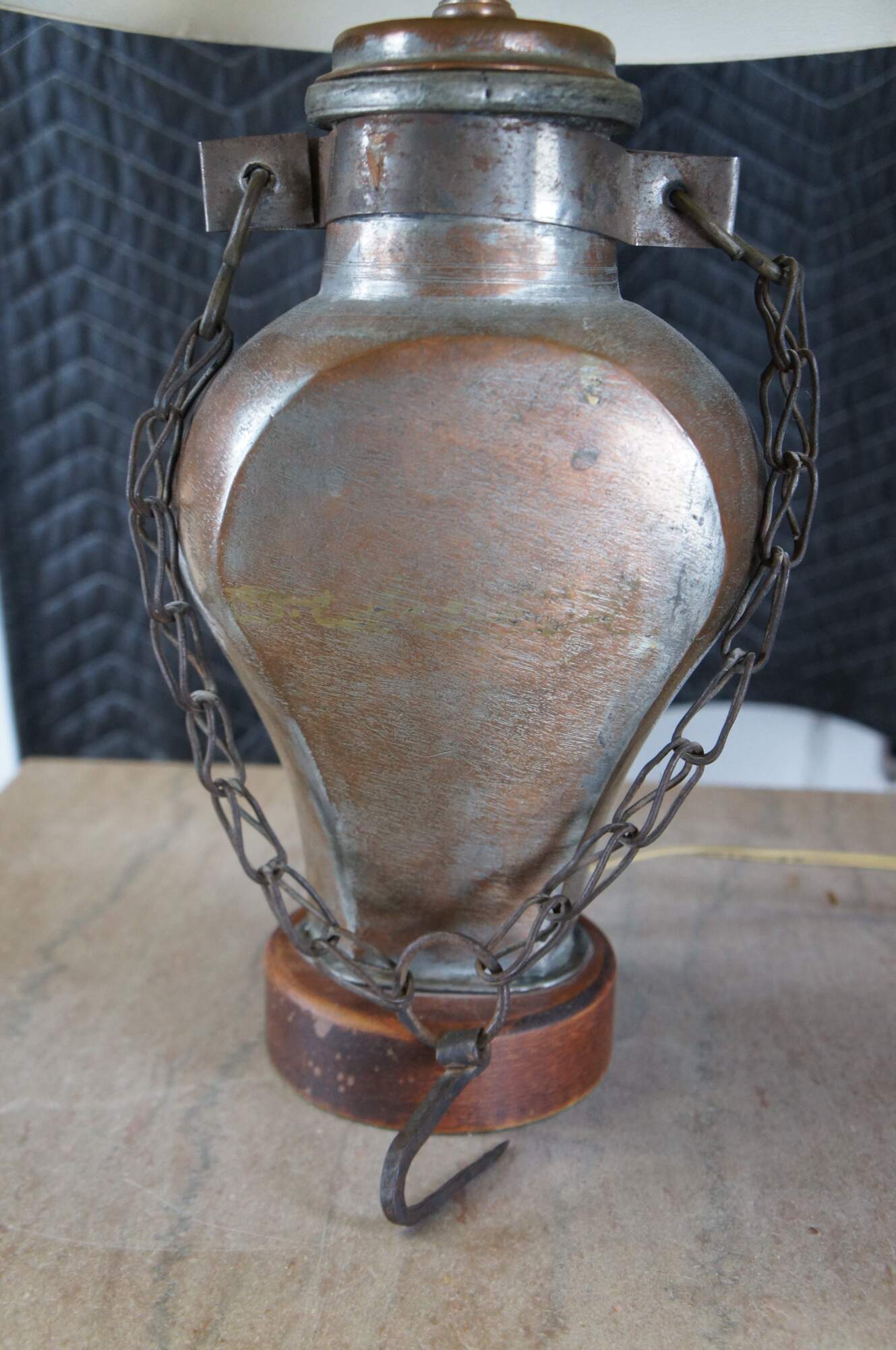 Charming late 19th Century dovetailed copper converted watern canteen or oil vessel. Features a beautiful bottle form with old world dovetailing and iron banding with chain and hook from when its past life when it would be hung up. The lamp was converted around 1980 with a wooden plinth base traditional switch and shade. A fun addition to any ecletic or rustic space.