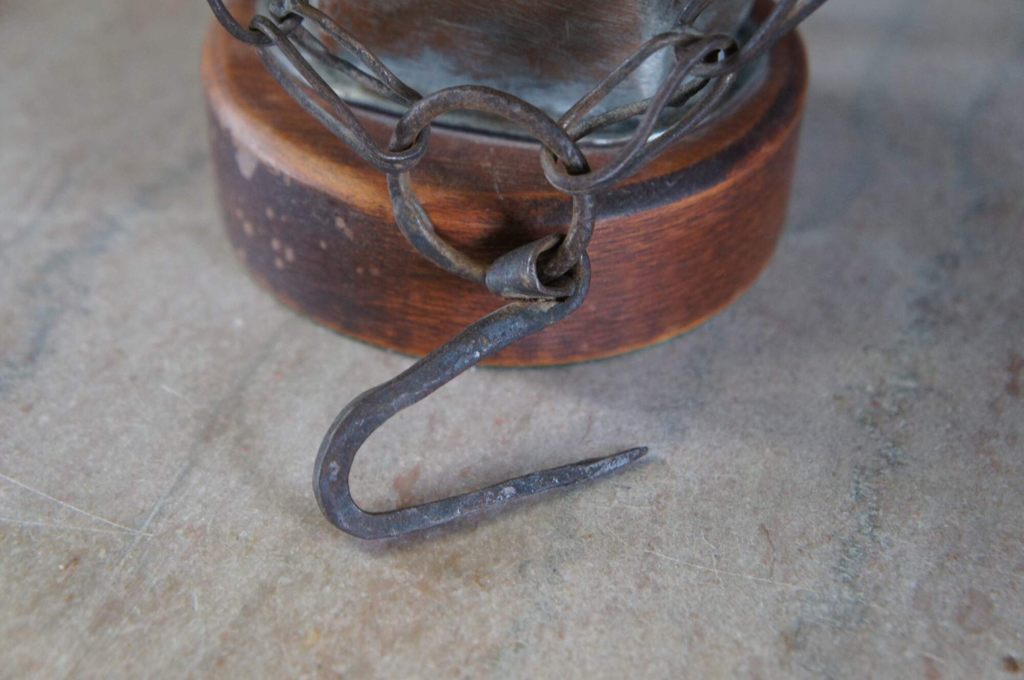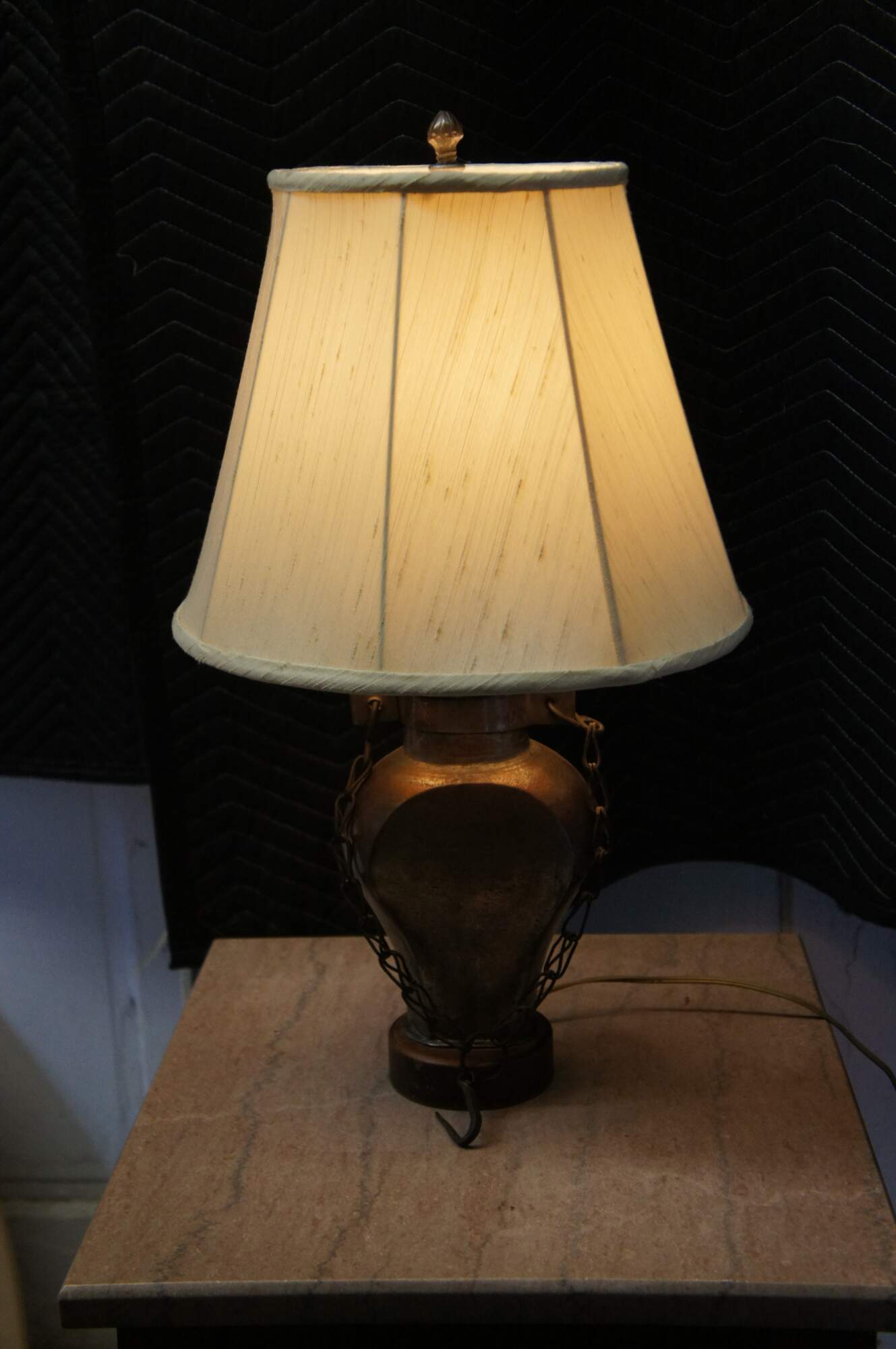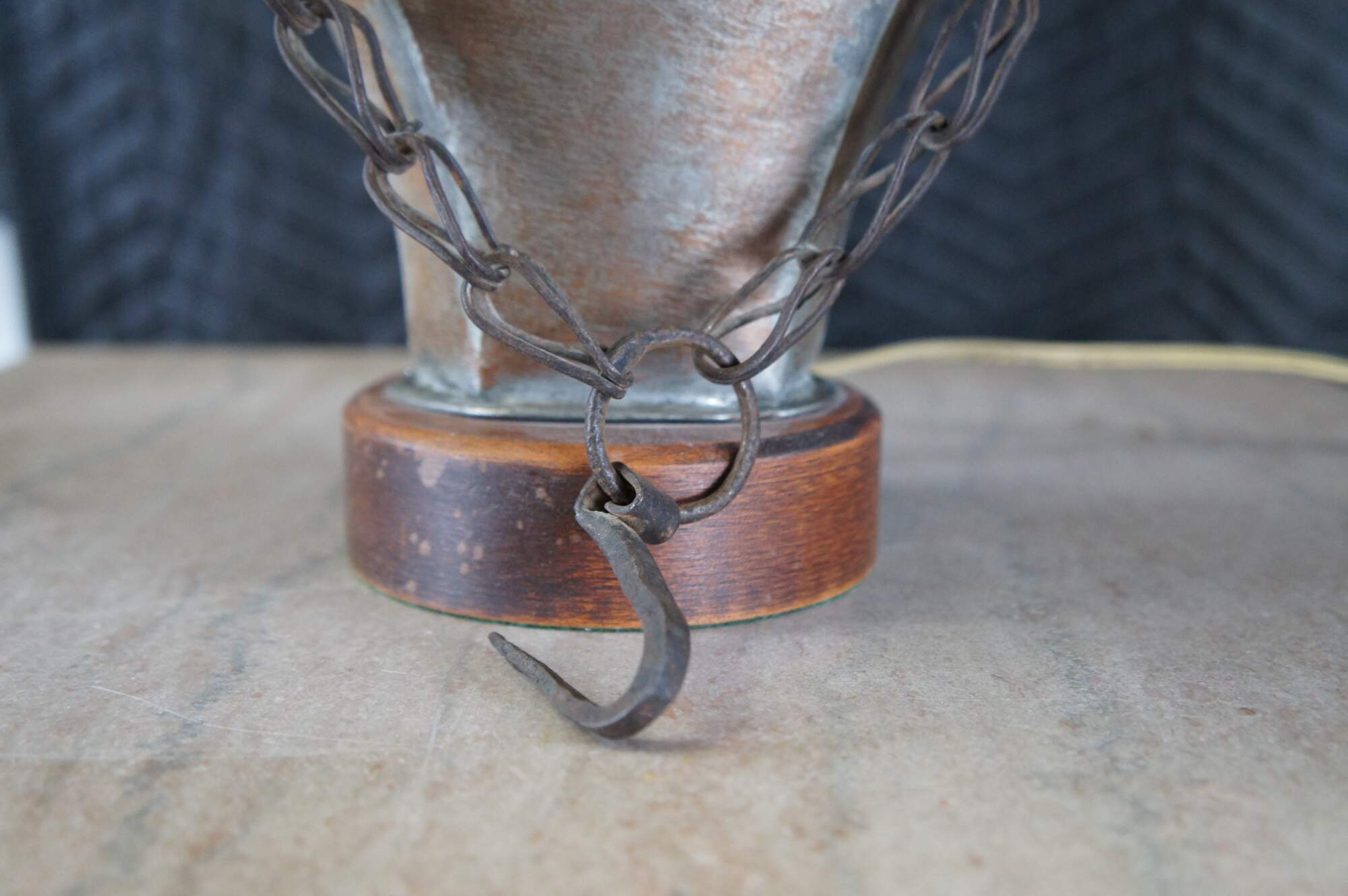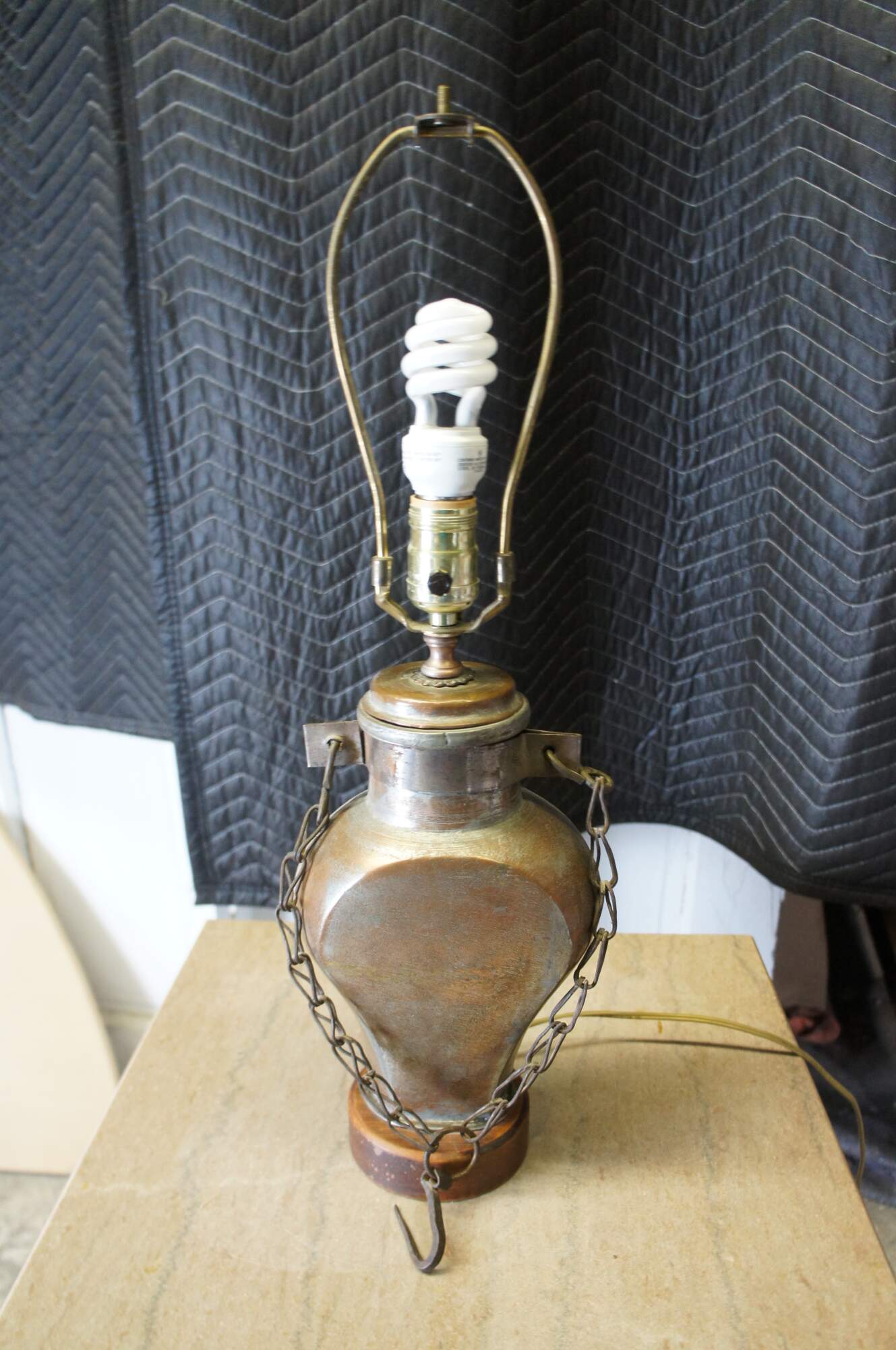 Charming late 19th Century dovetailed copper converted watern canteen or oil vessel. Features a beautiful bottle form with old world dovetailing and iron banding with chain and hook from when its past life when it would be hung up. The lamp was converted around 1980 with a wooden plinth base traditional switch and shade. A fun addition to any ecletic or rustic space.