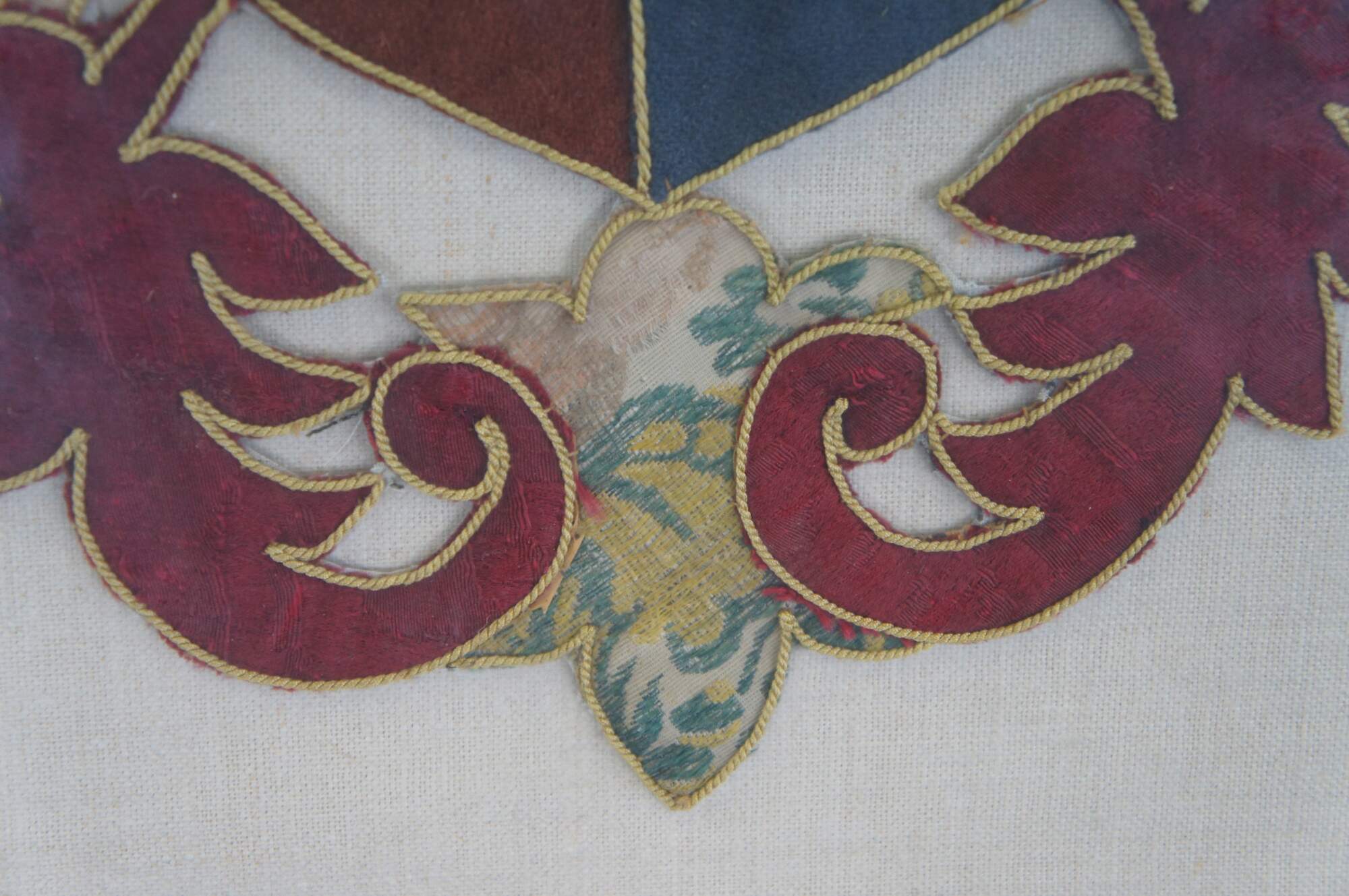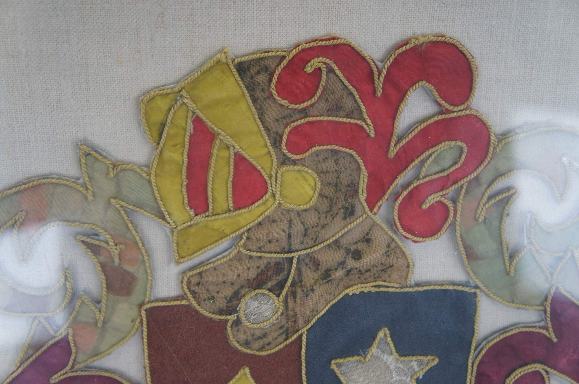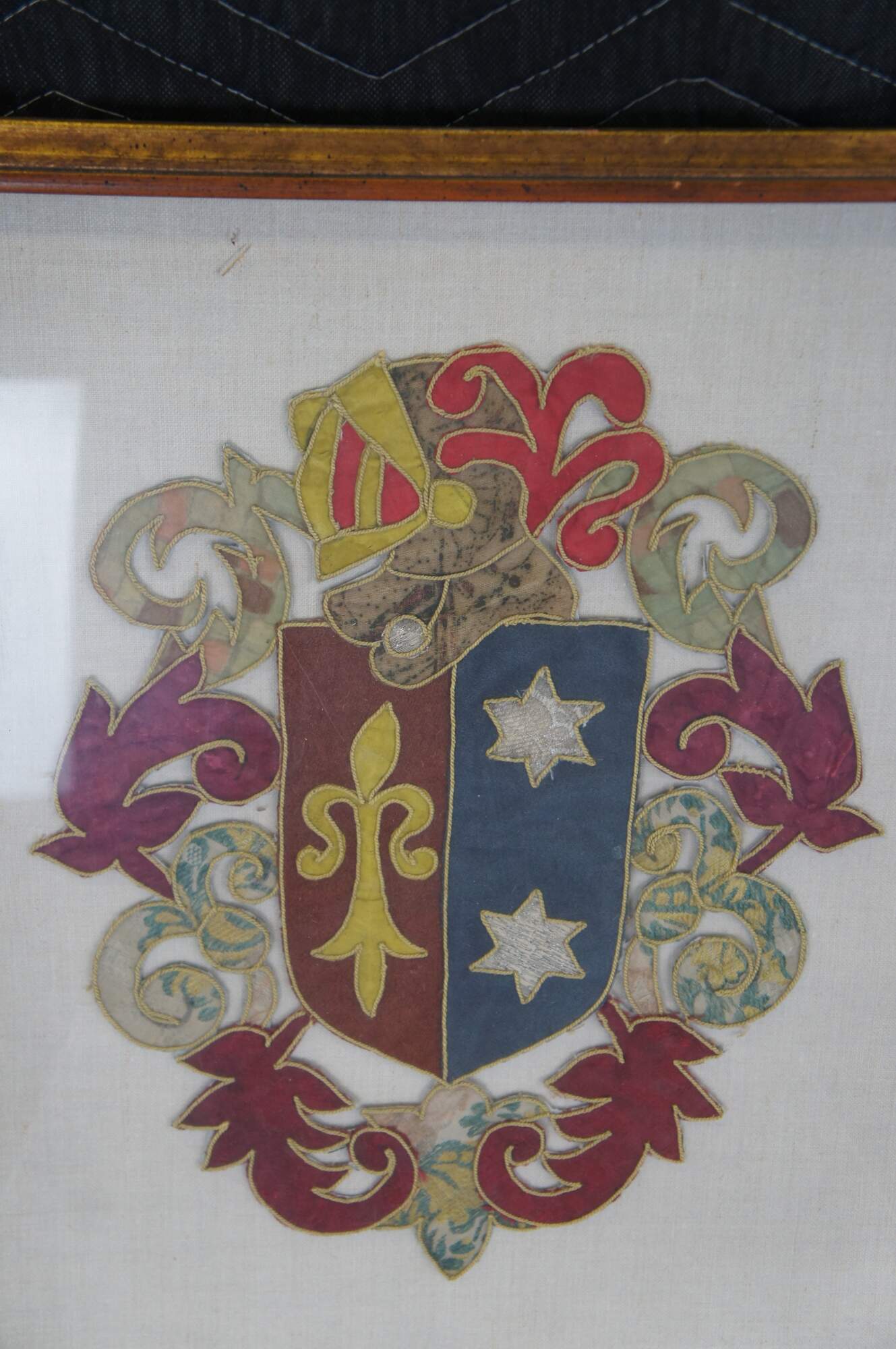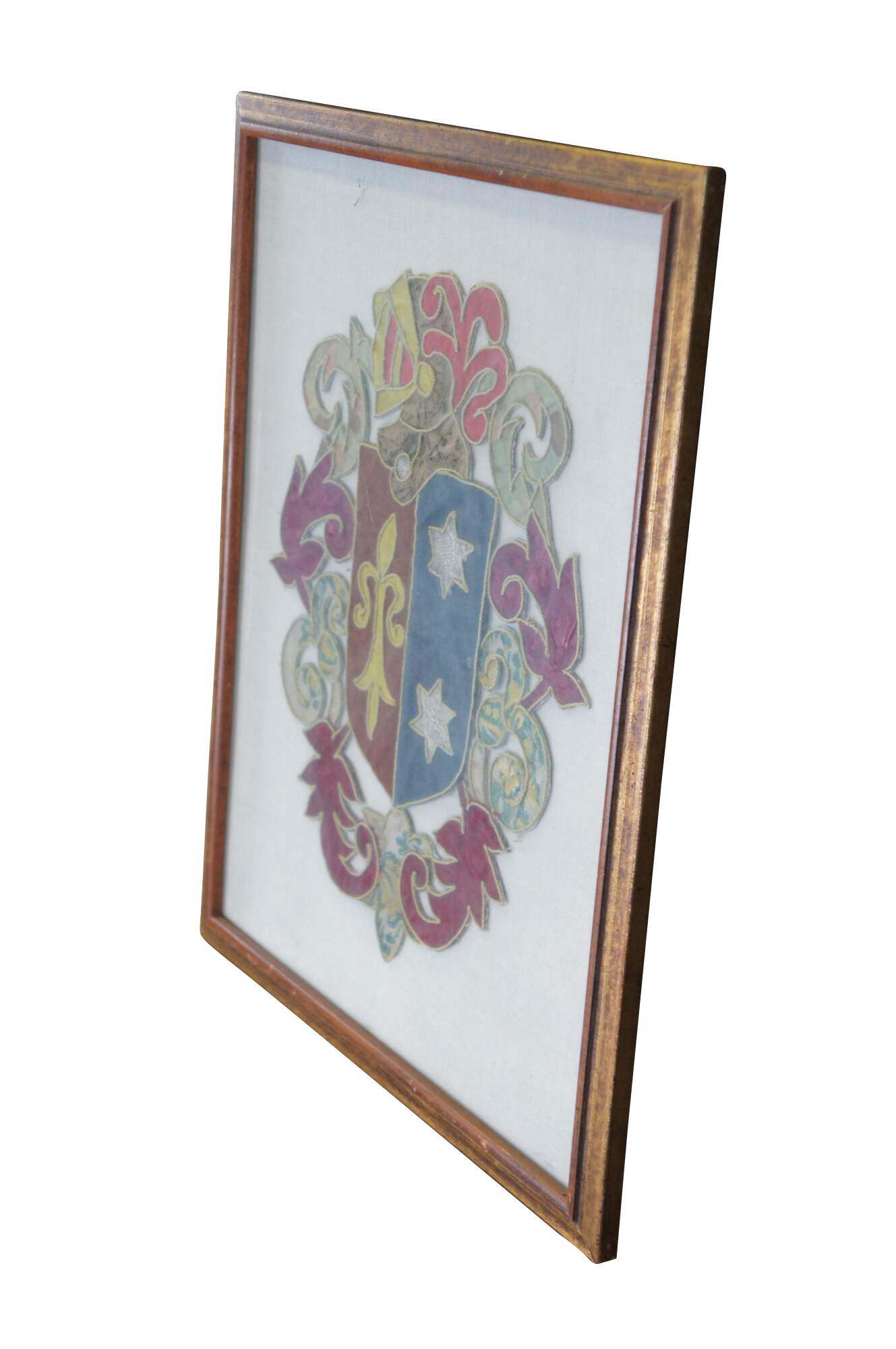 An antique hand stiched 18th Century Italian armorial heraldic embroidered coat of arms. Features a knights helmet over a shield with star of davids besides a sword like shape set between beautiful scrollwork. The embroiderery is mounted on a white background behind glass with a gold finished frame.
