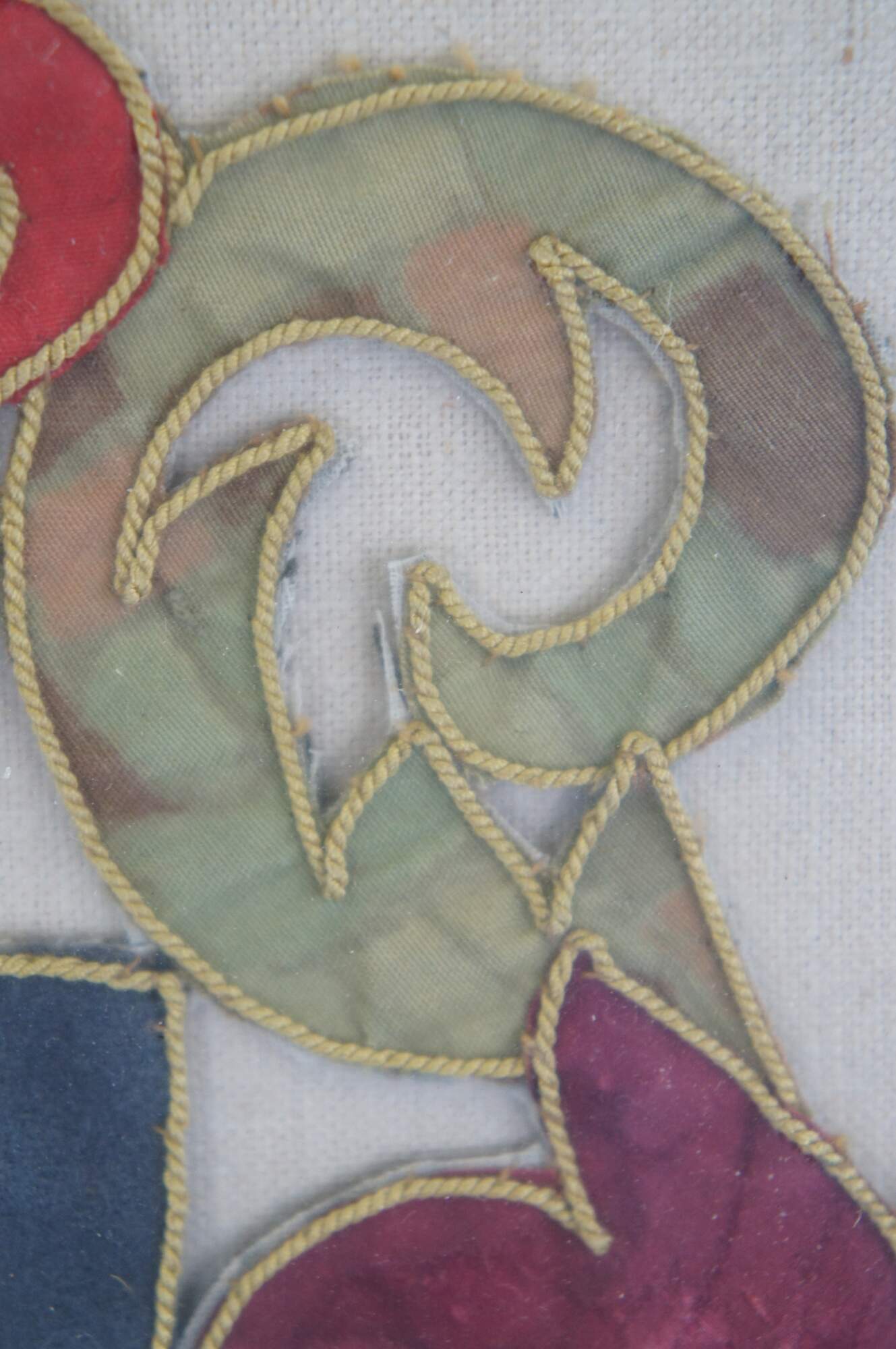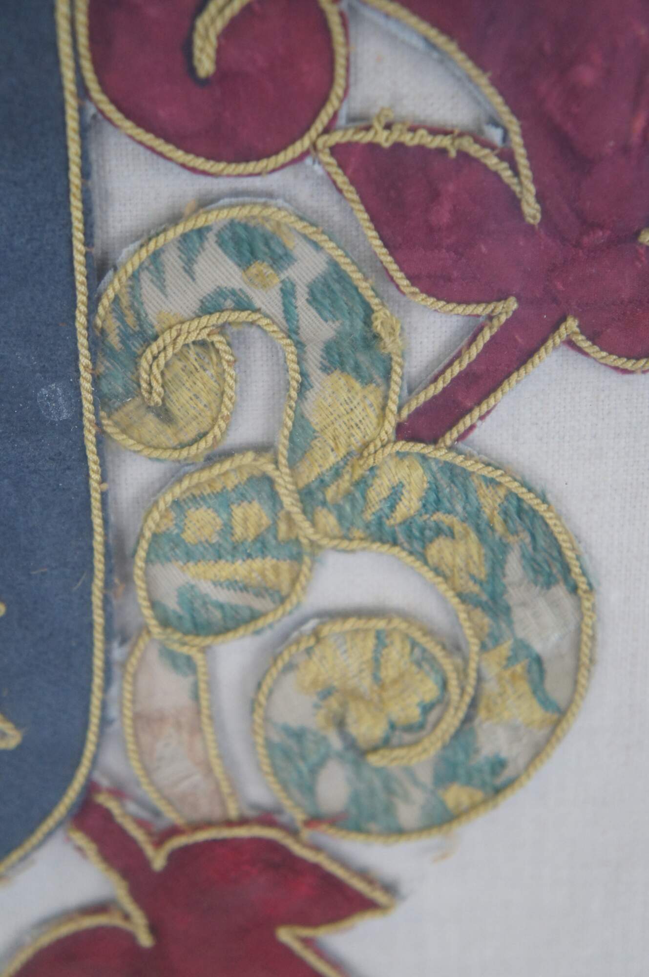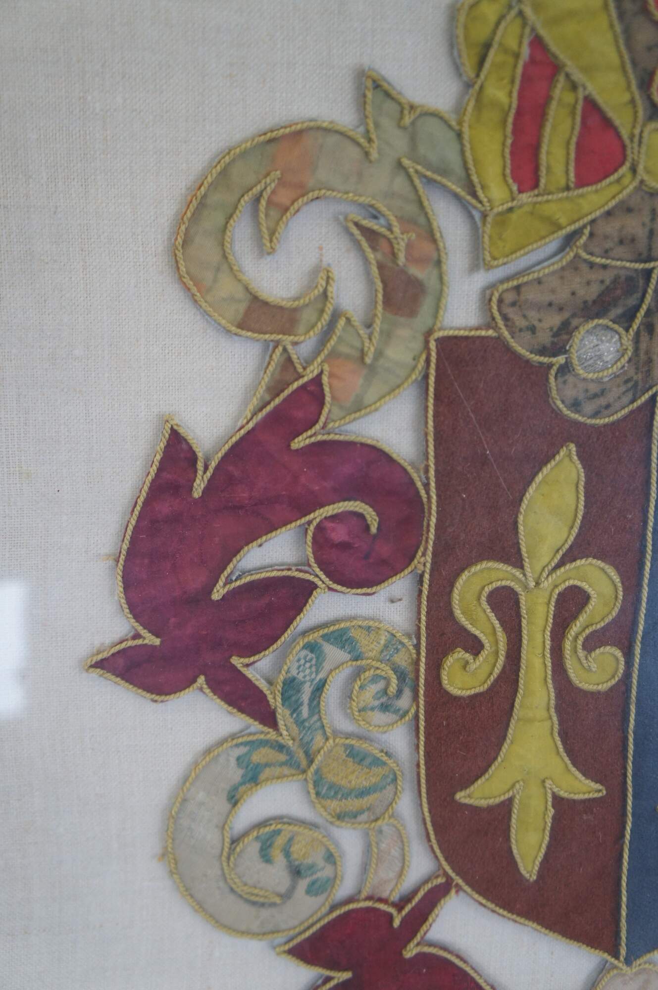 An antique hand stiched 18th Century Italian armorial heraldic embroidered coat of arms. Features a knights helmet over a shield with star of davids besides a sword like shape set between beautiful scrollwork. The embroiderery is mounted on a white background behind glass with a gold finished frame.