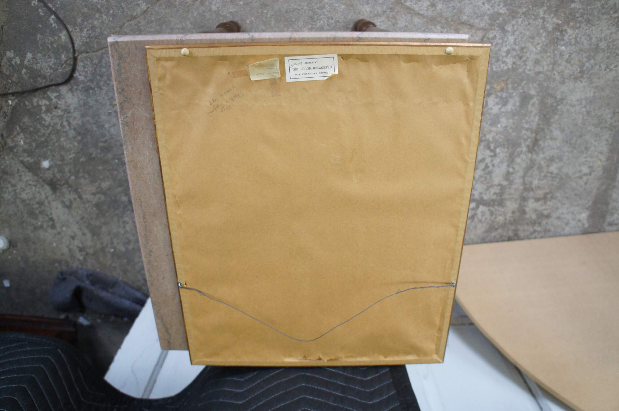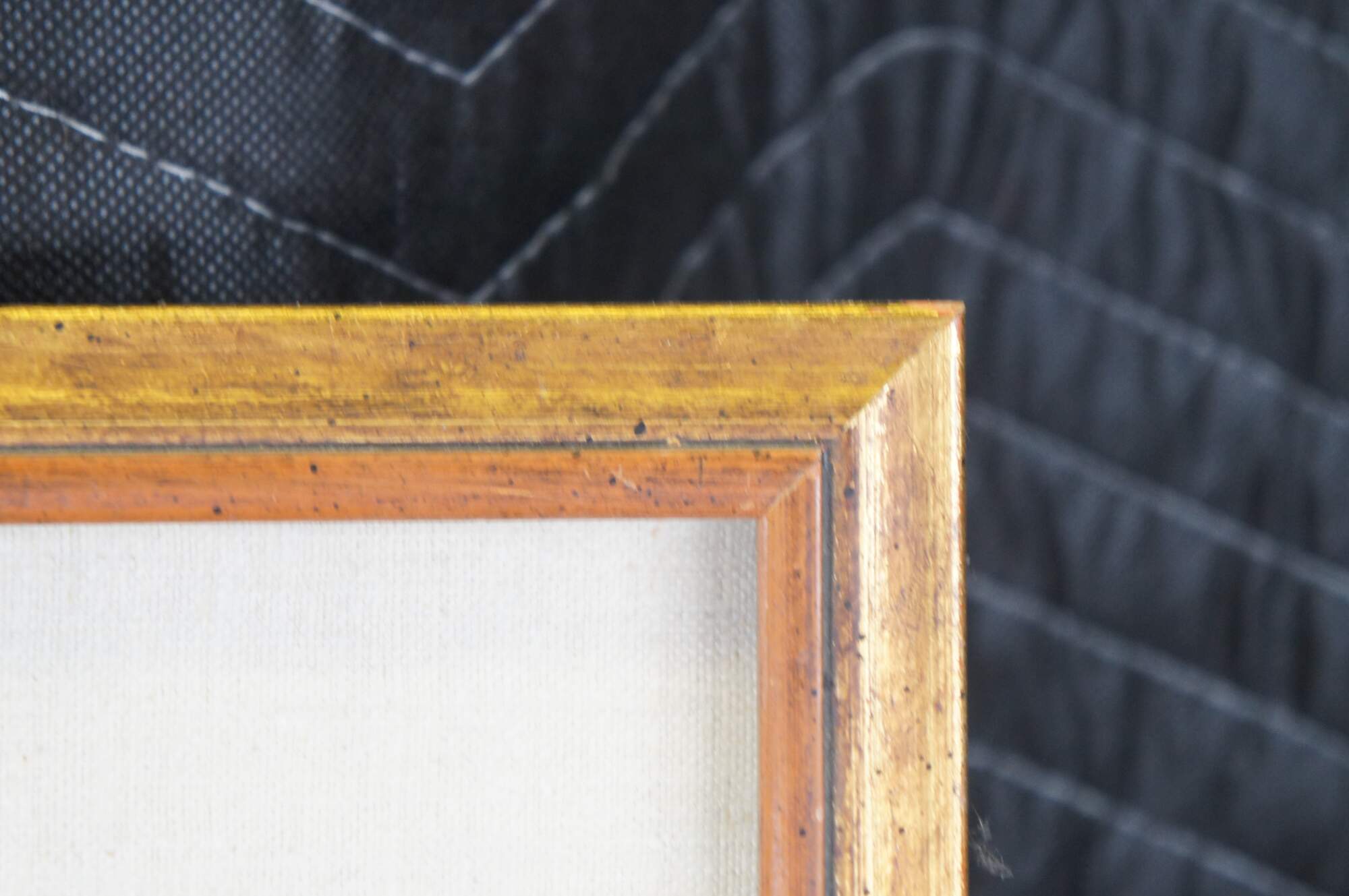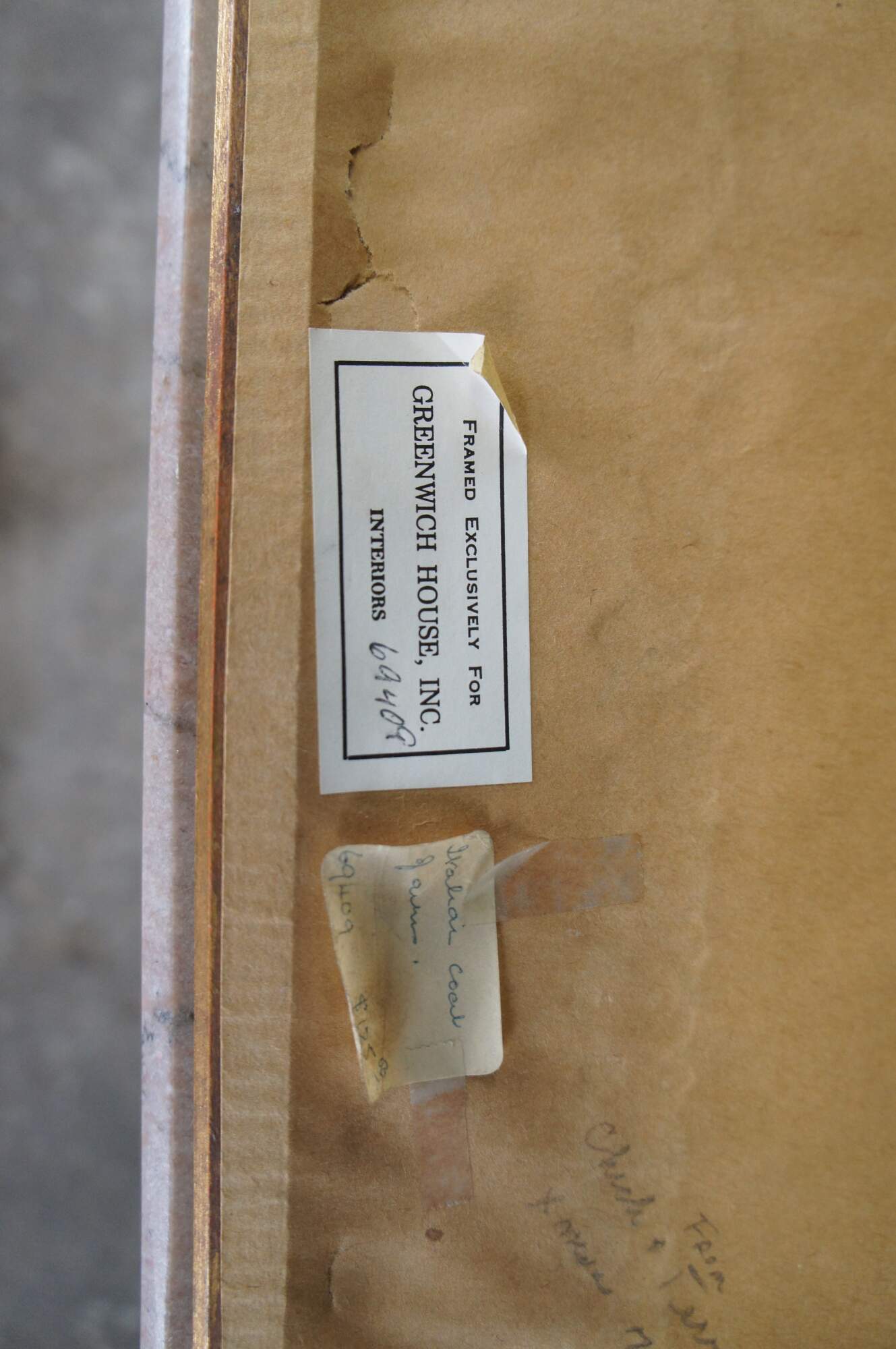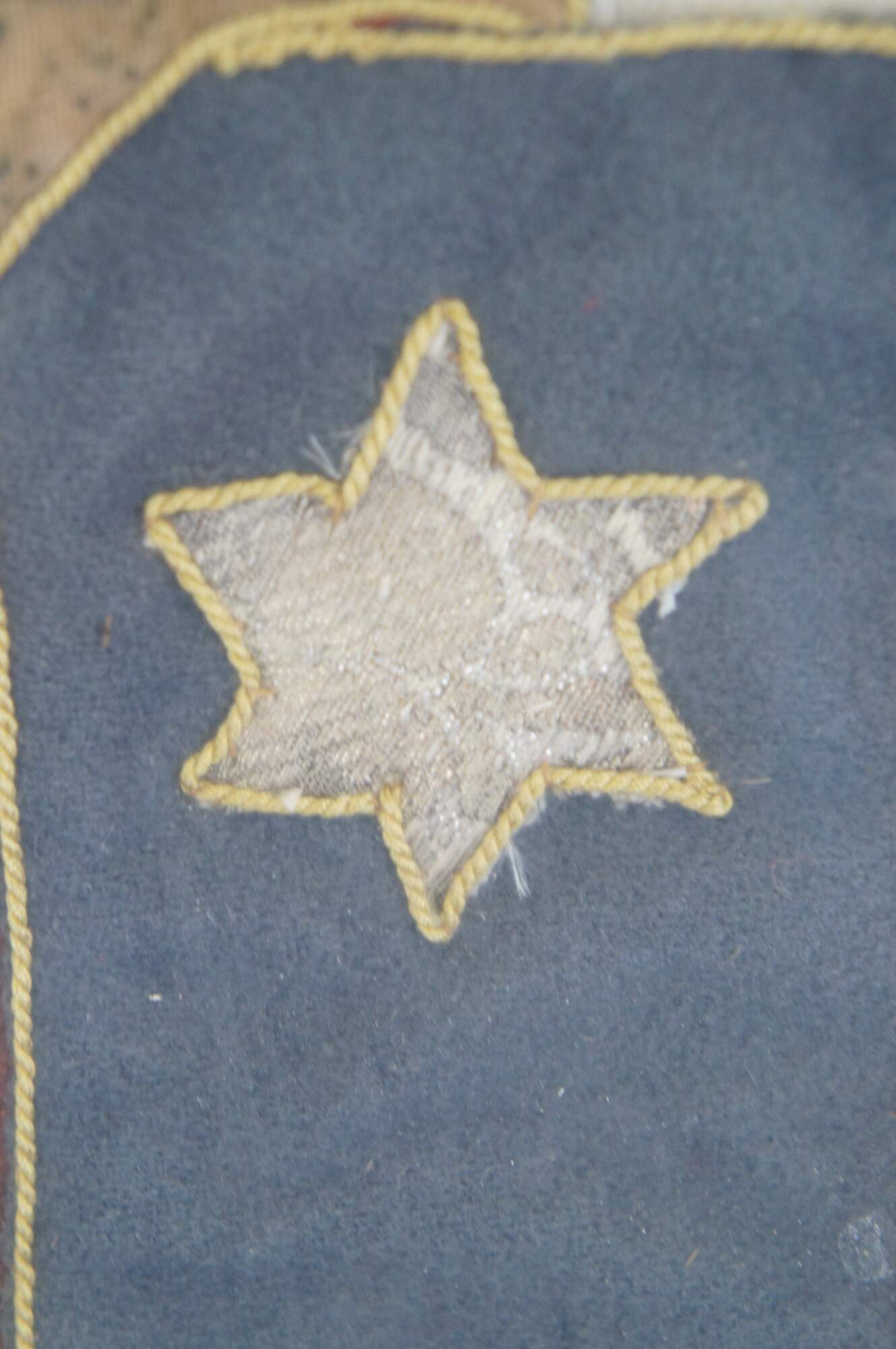An antique hand stiched 18th Century Italian armorial heraldic embroidered coat of arms. Features a knights helmet over a shield with star of davids besides a sword like shape set between beautiful scrollwork. The embroiderery is mounted on a white background behind glass with a gold finished frame.