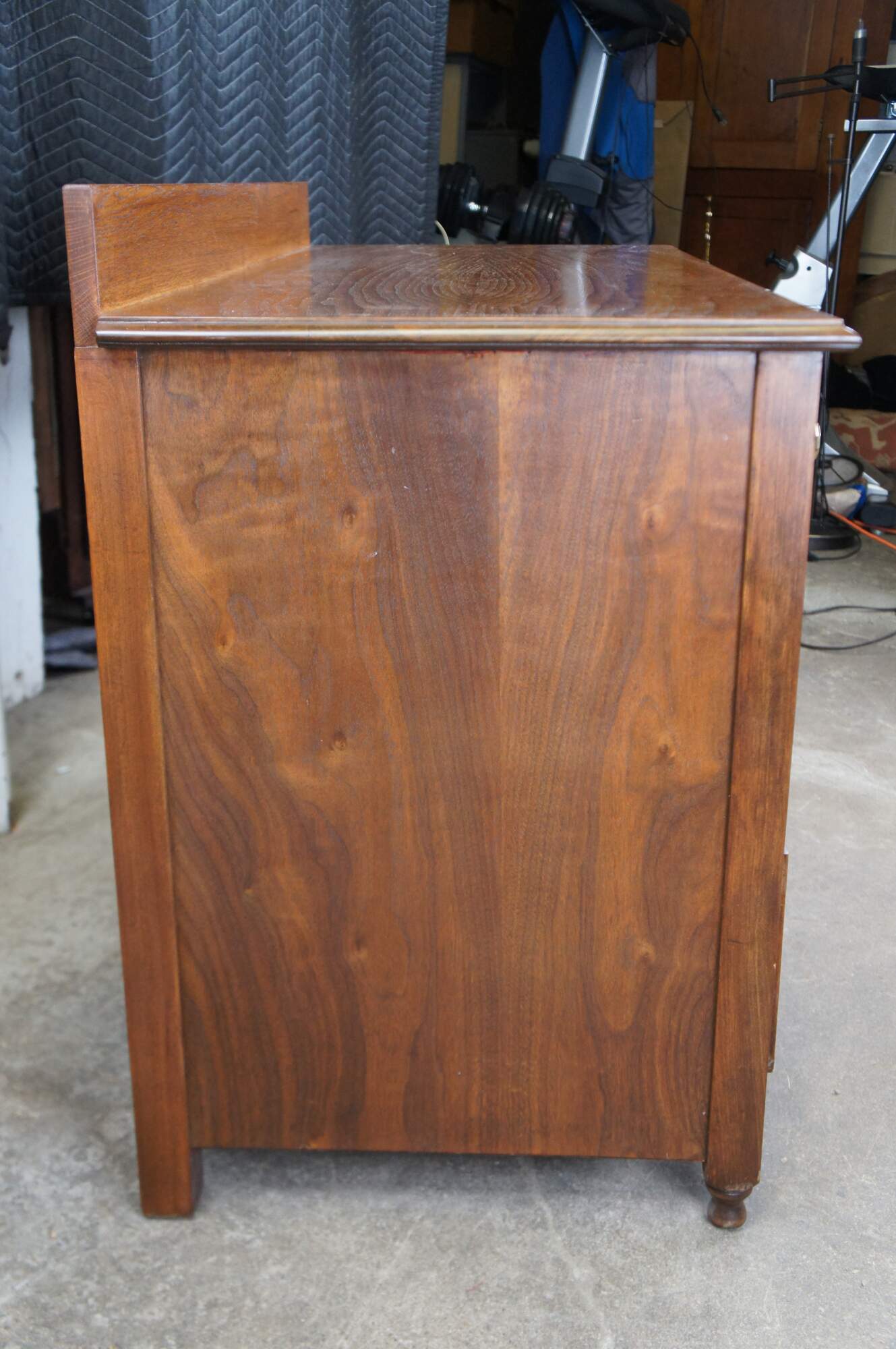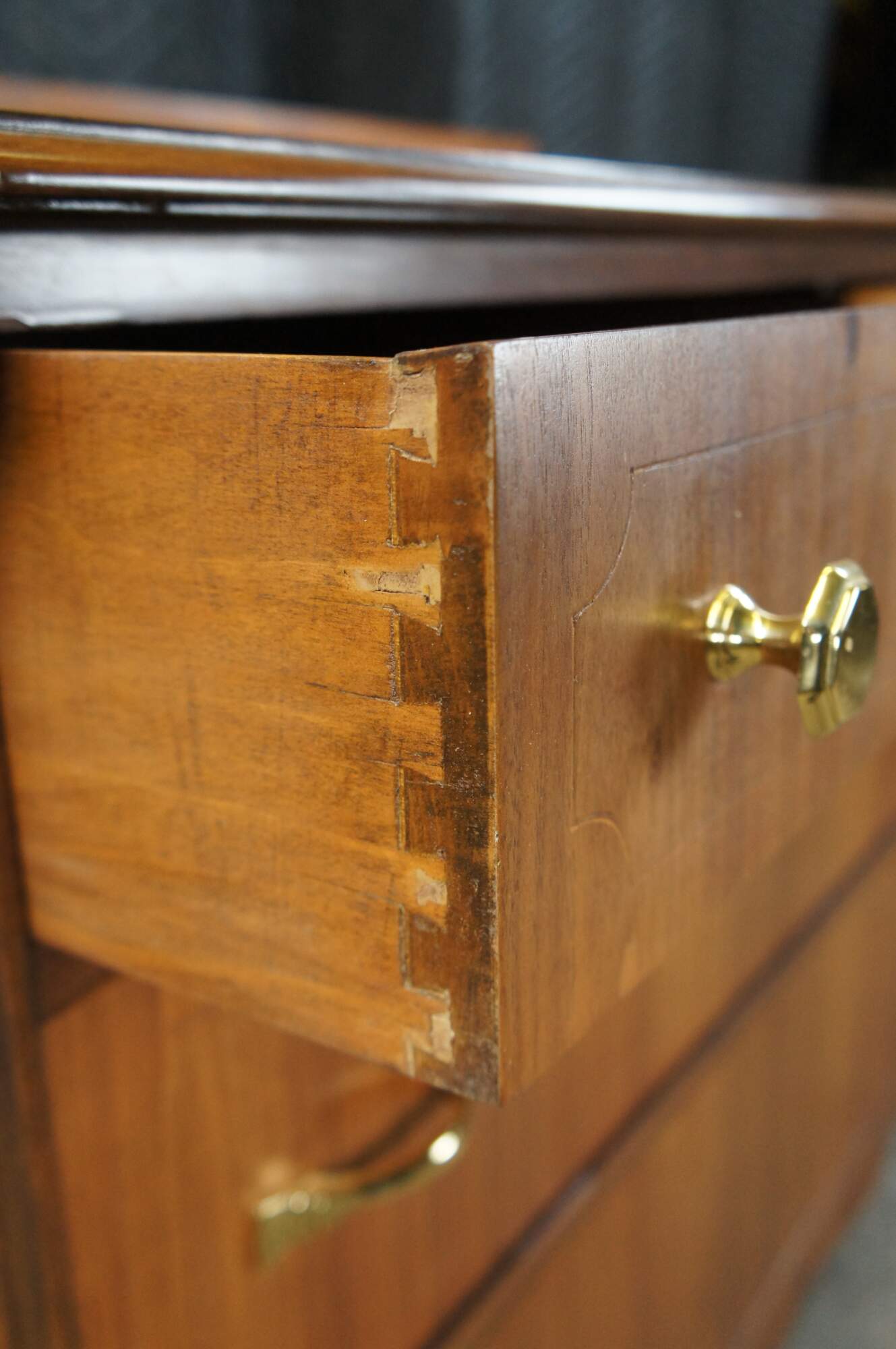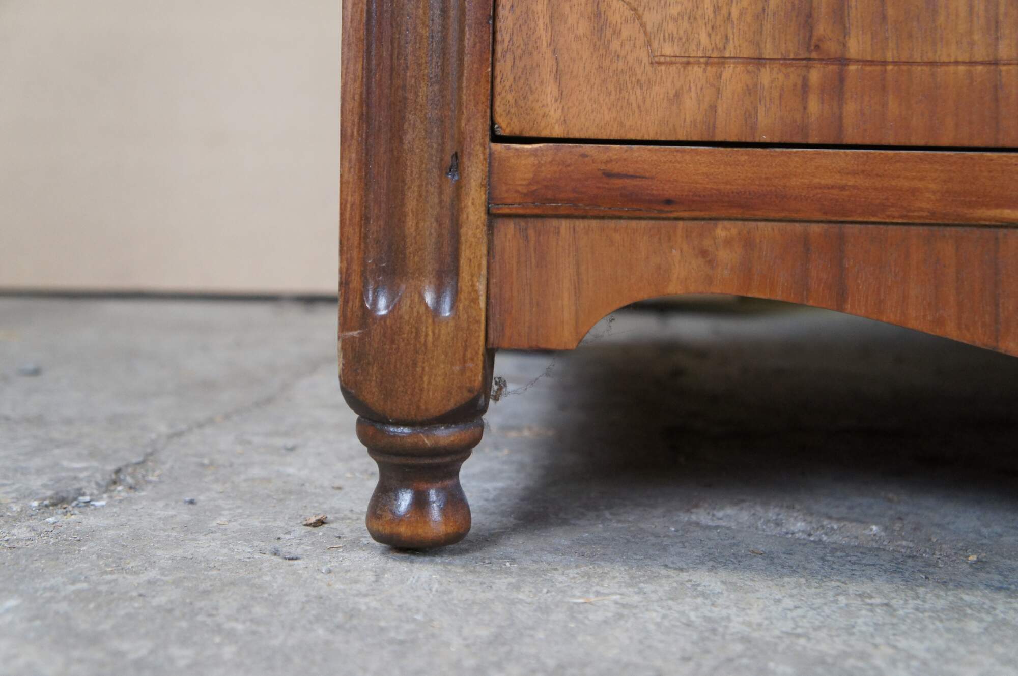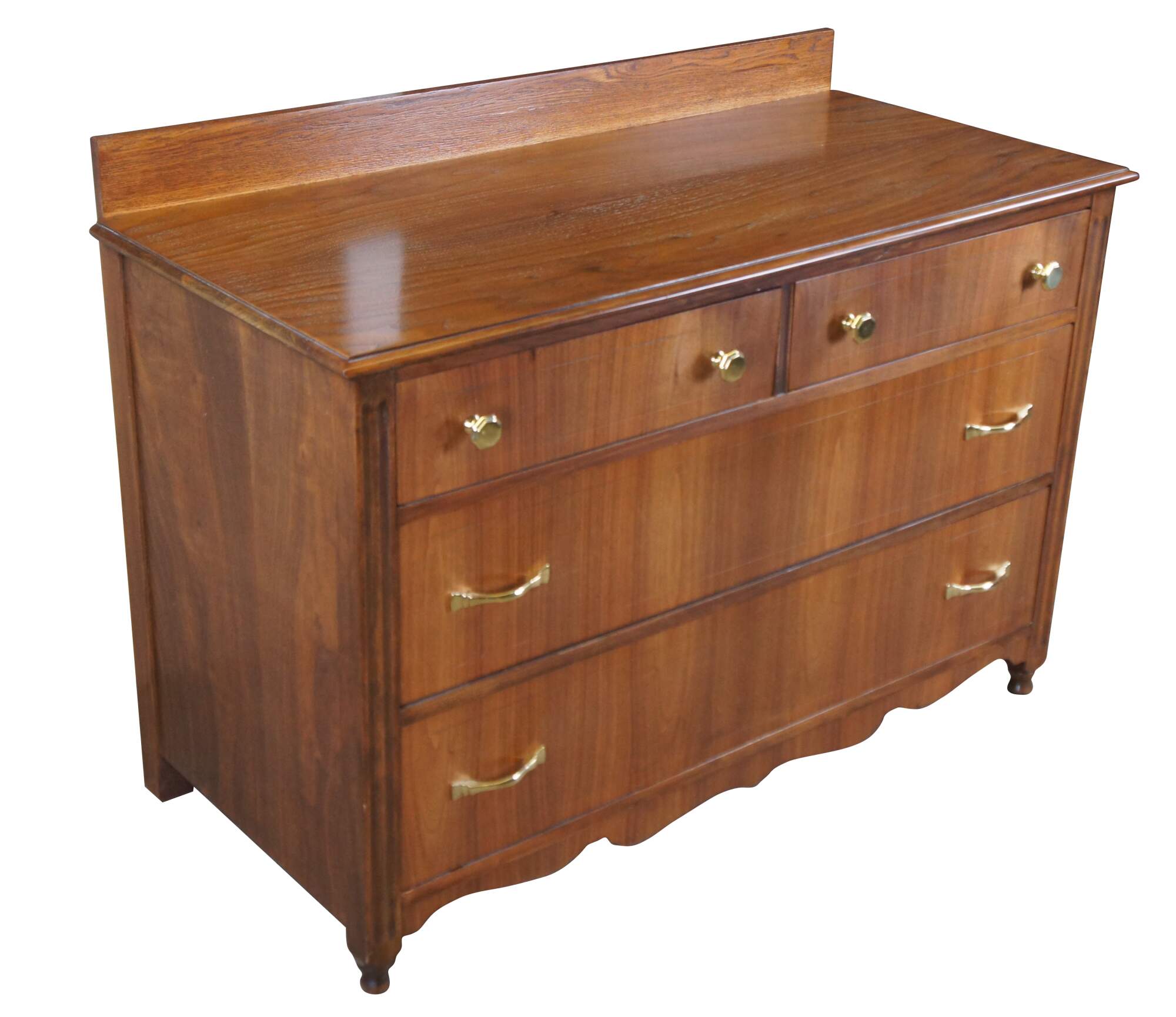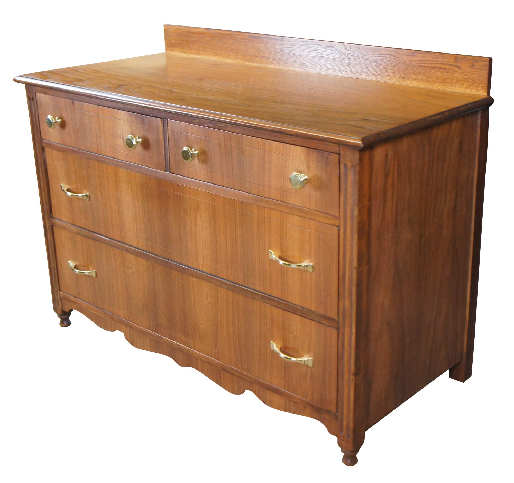 Late Victorian style chest of drawers, circa 1910. Features a rectangular frame made from American Walnut. Two over two dovetailed drawer setup with brass pulls. The dresser features fluted stiles, serpentine lower apron and peg feet.
