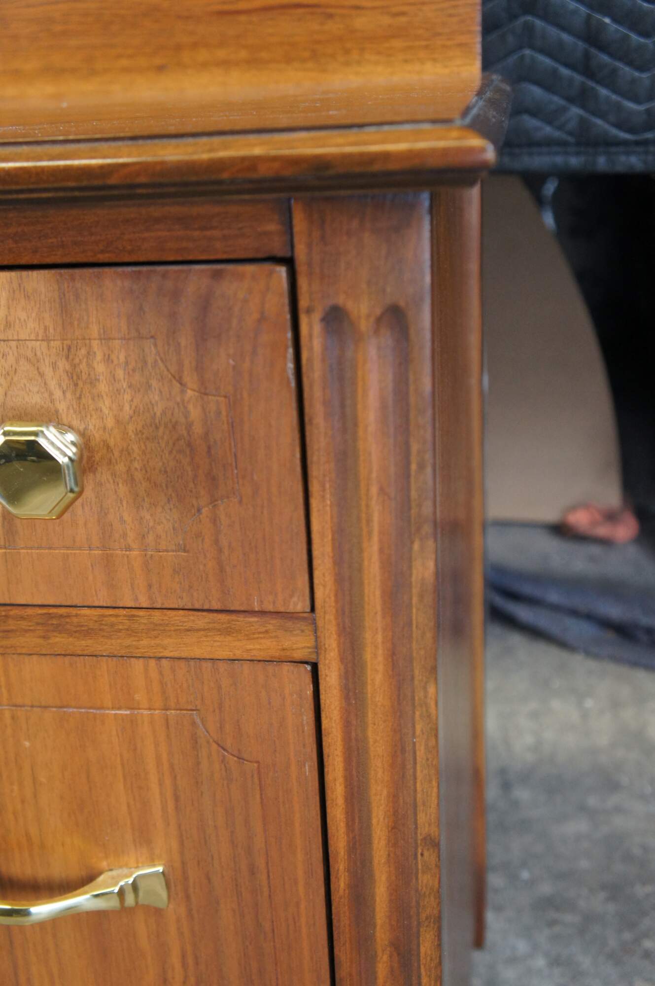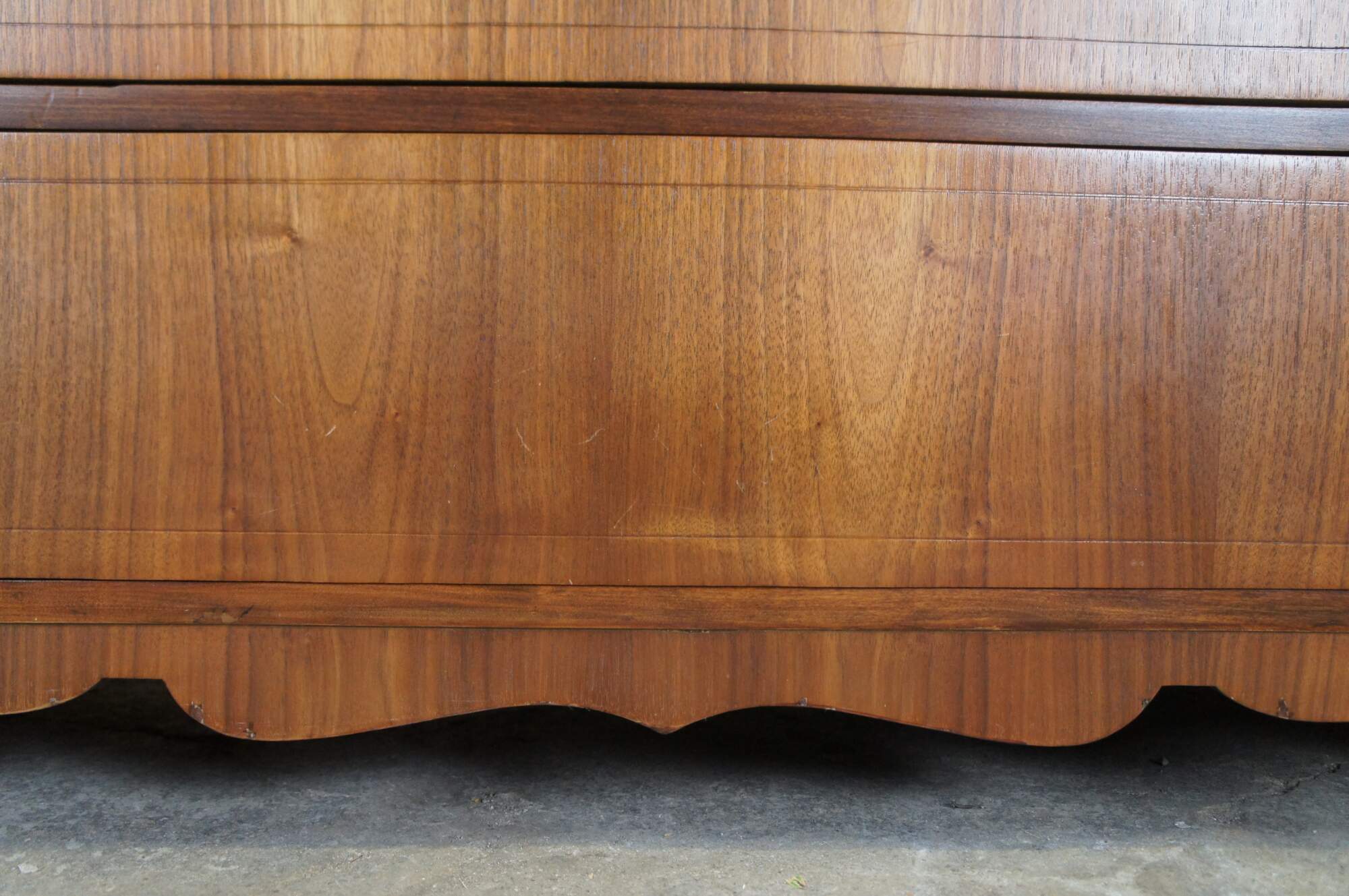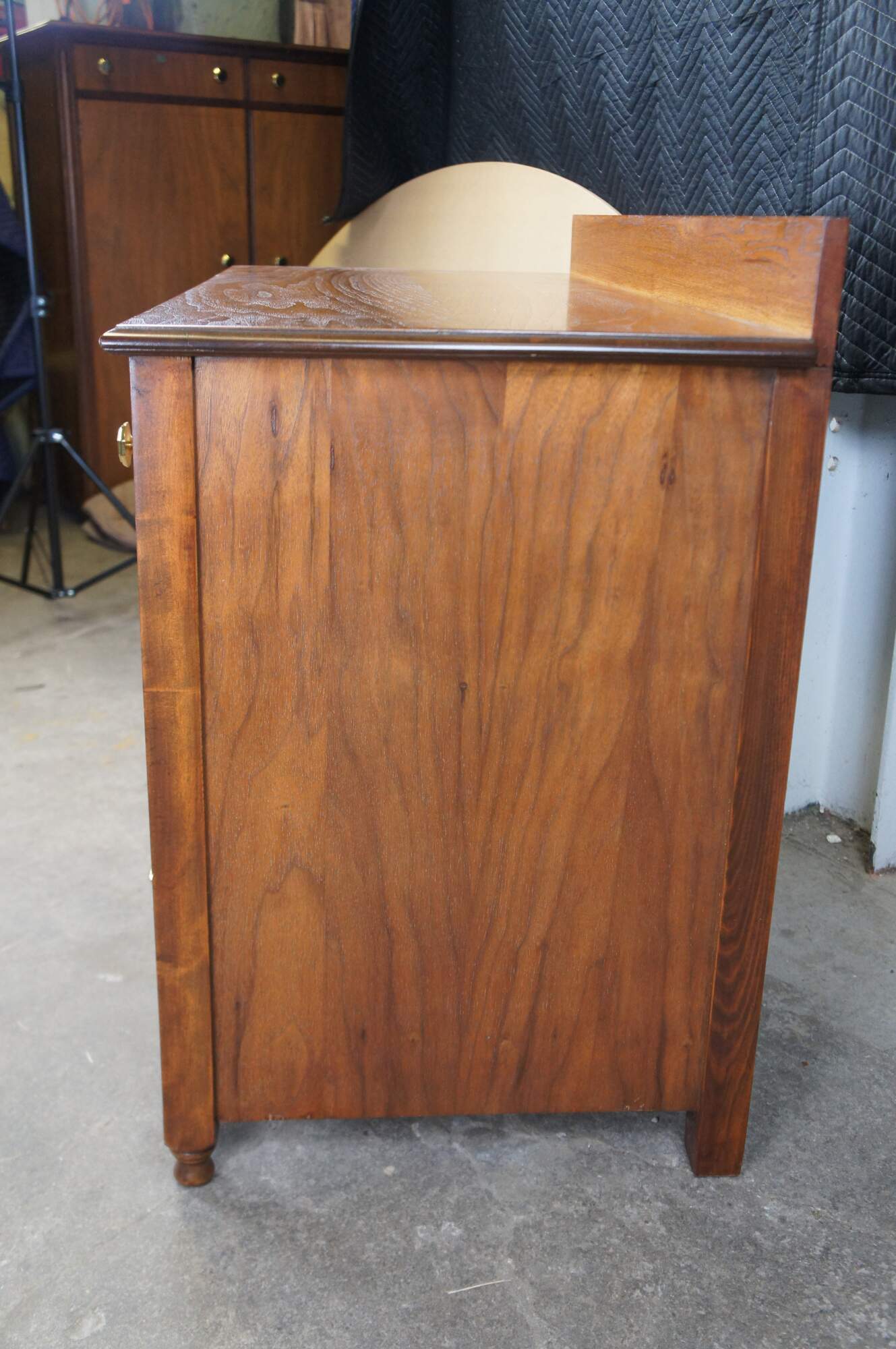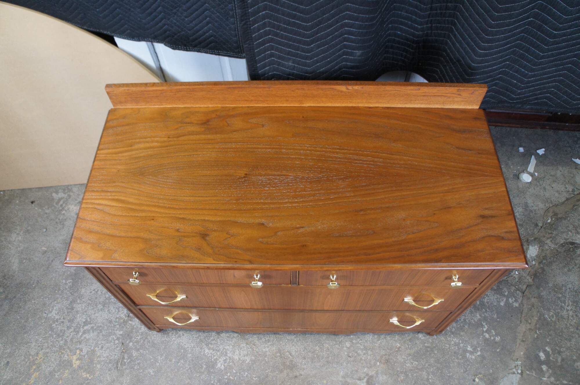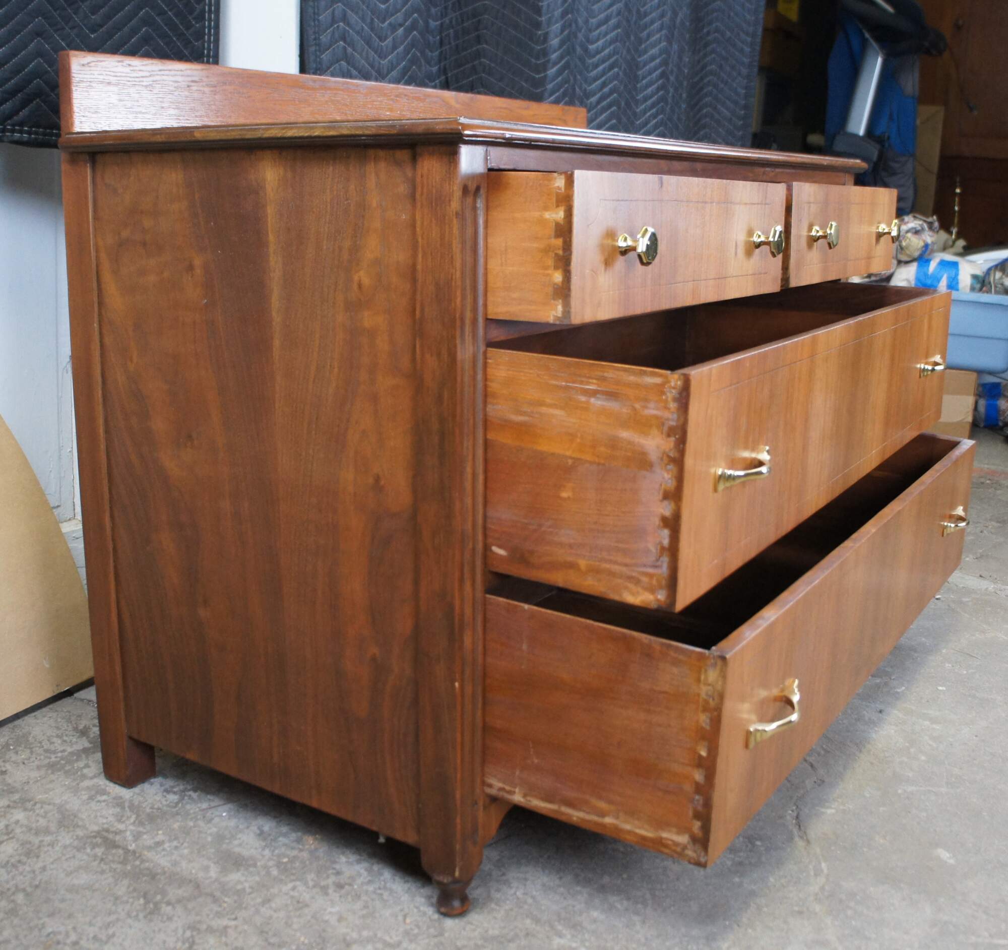 Late Victorian style chest of drawers, circa 1910. Features a rectangular frame made from American Walnut. Two over two dovetailed drawer setup with brass pulls. The dresser features fluted stiles, serpentine lower apron and peg feet.