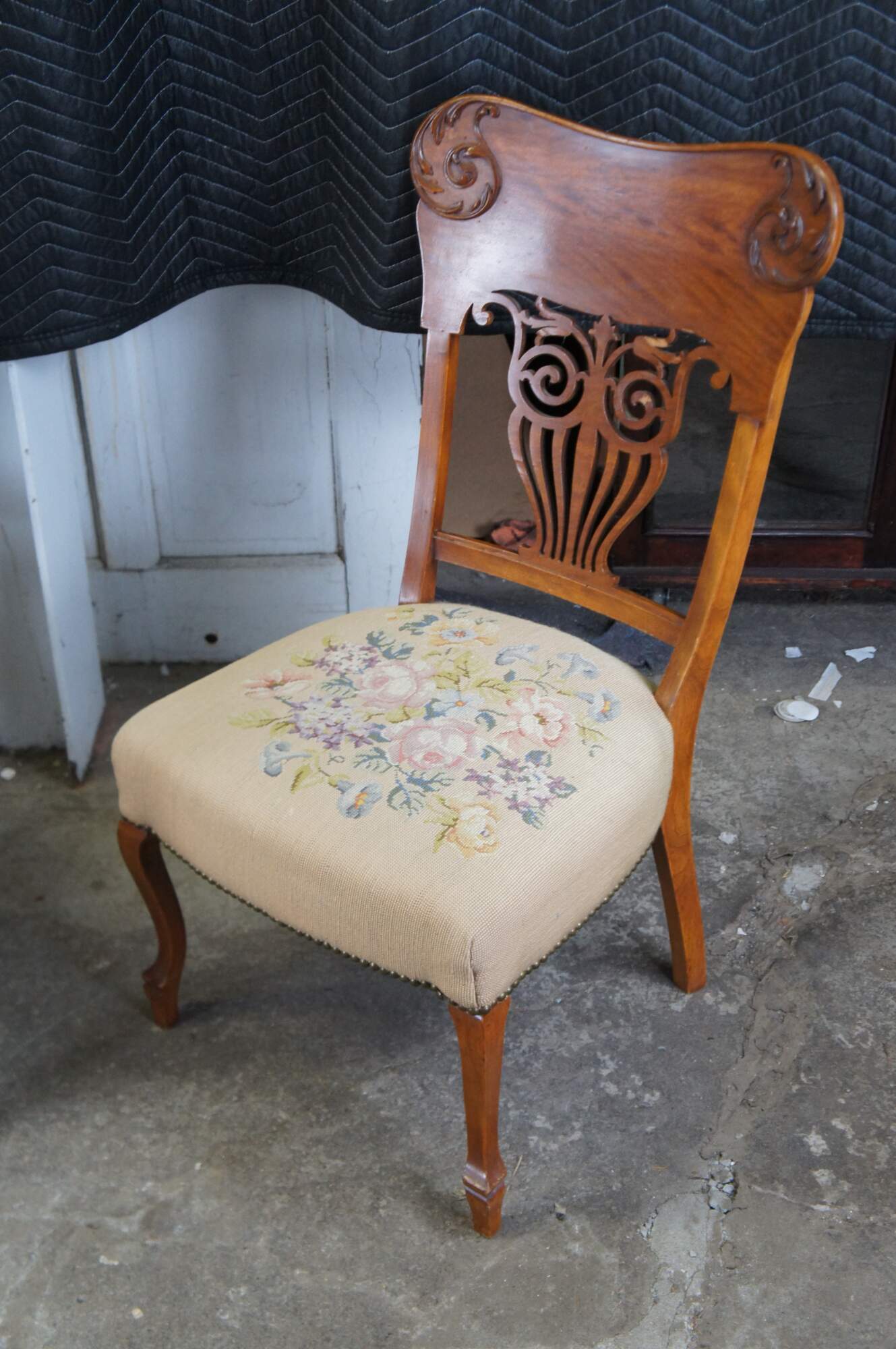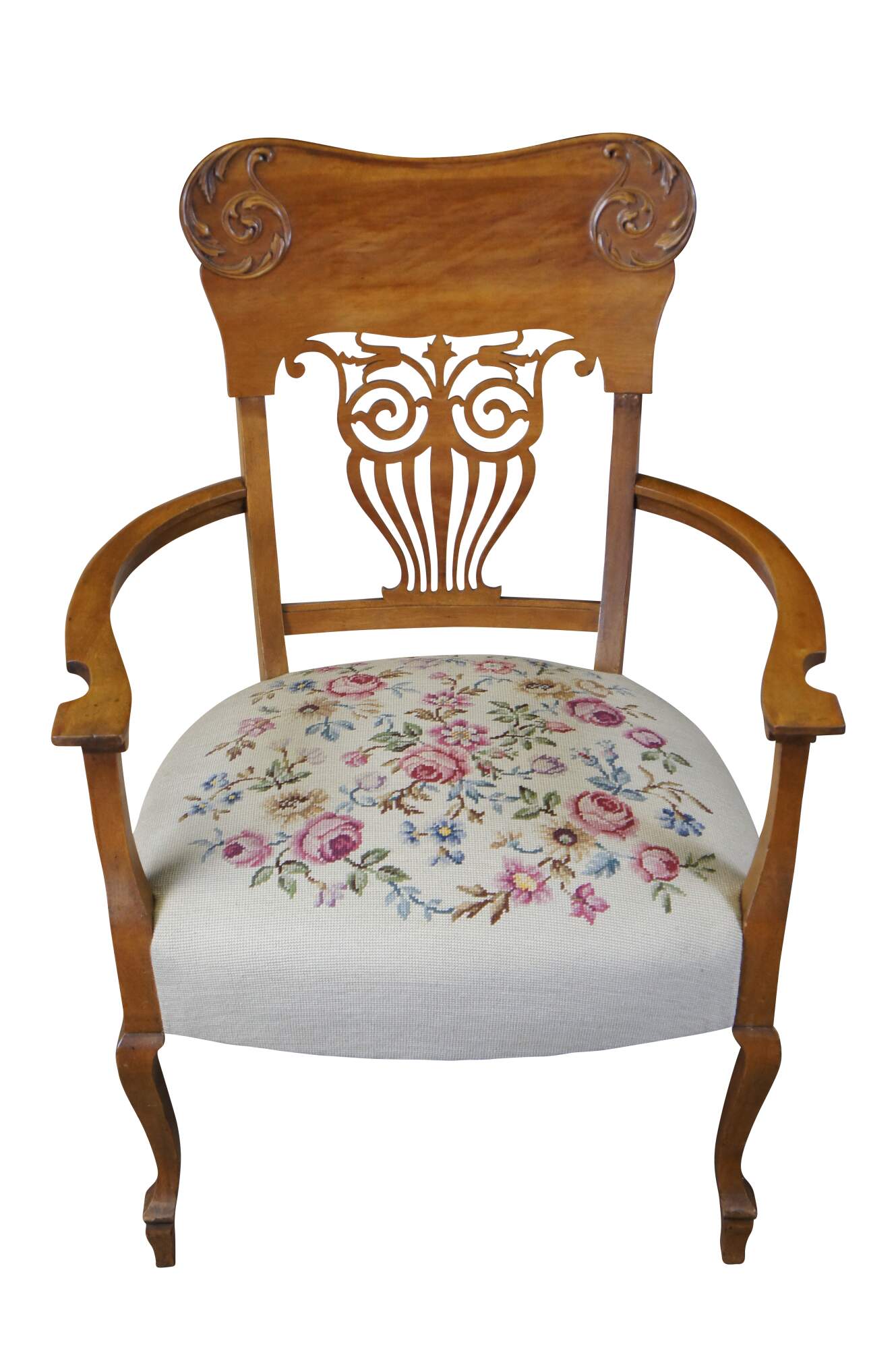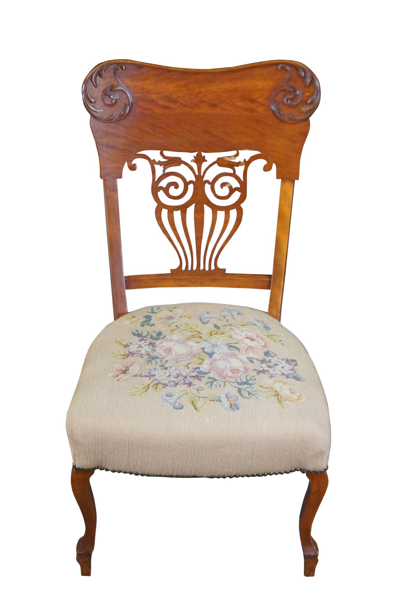2 ornate late Victorian chairs. Made from quartersawn oak with a contoured back featuring applied and scrolled foliate over a pierced splat back. The seats are embroidered with rose pattern. The chairs are supported by cabriole legs over peg foot.