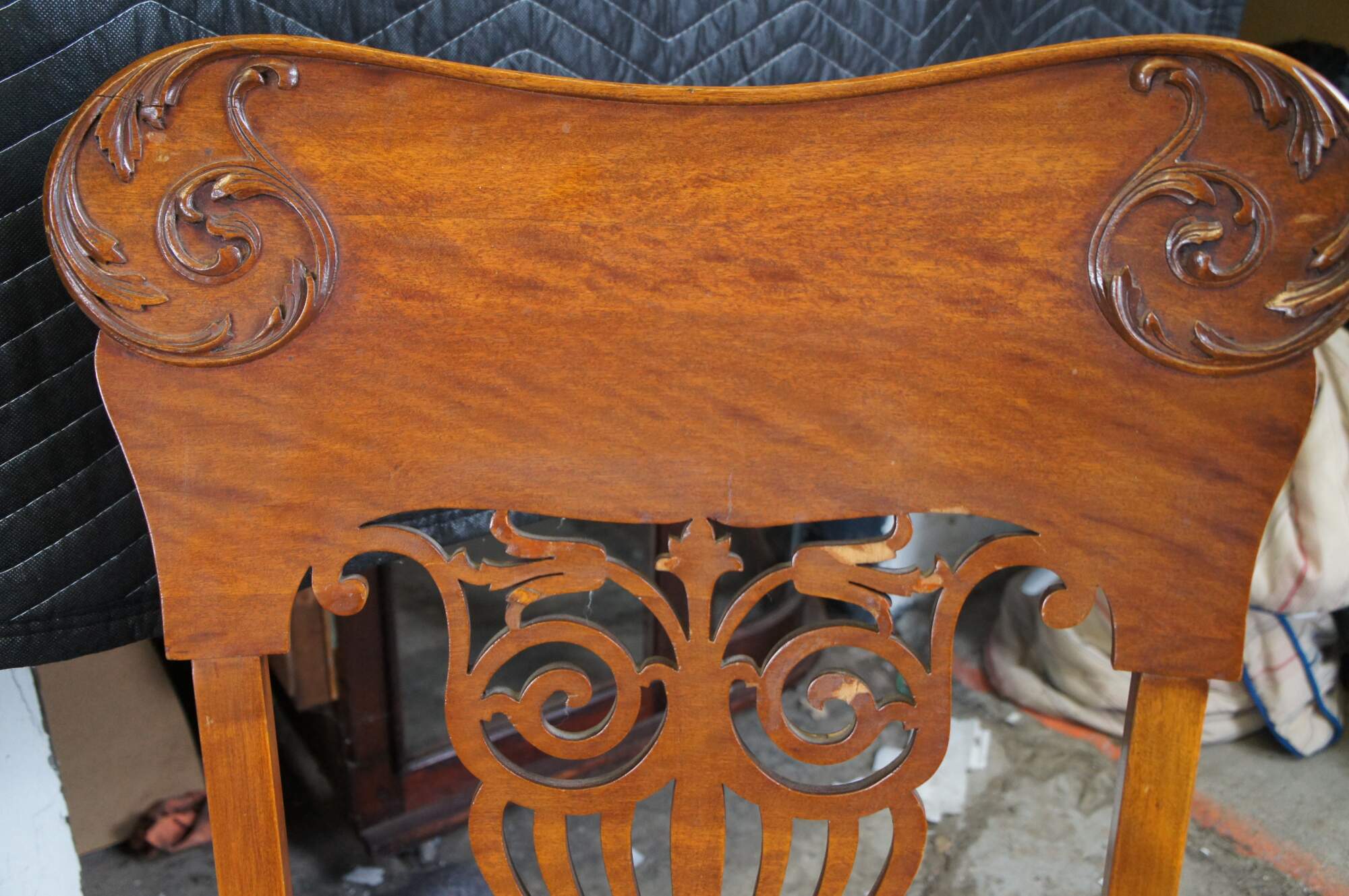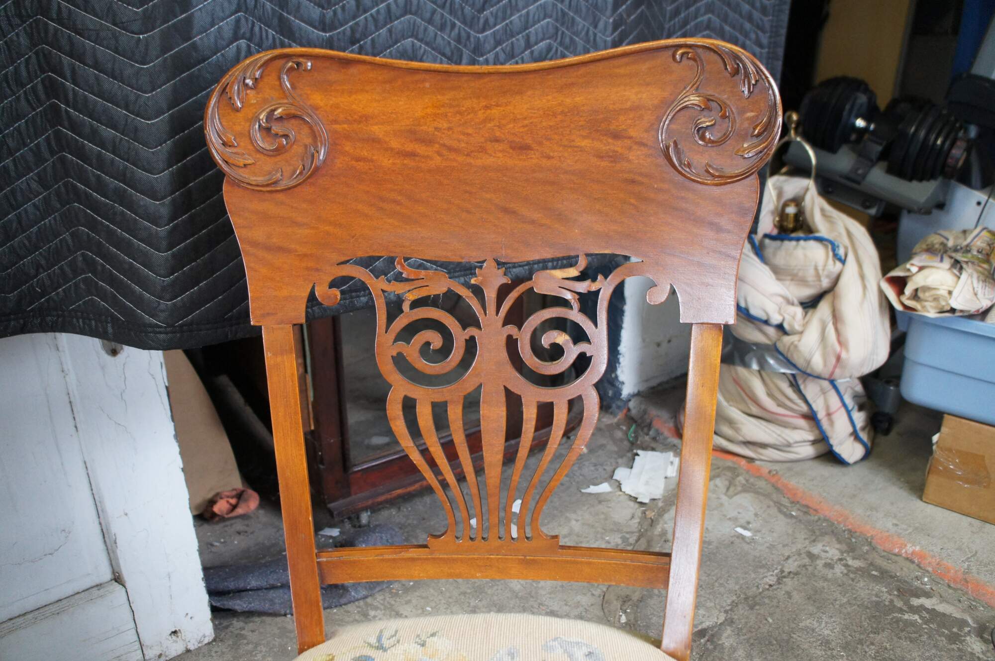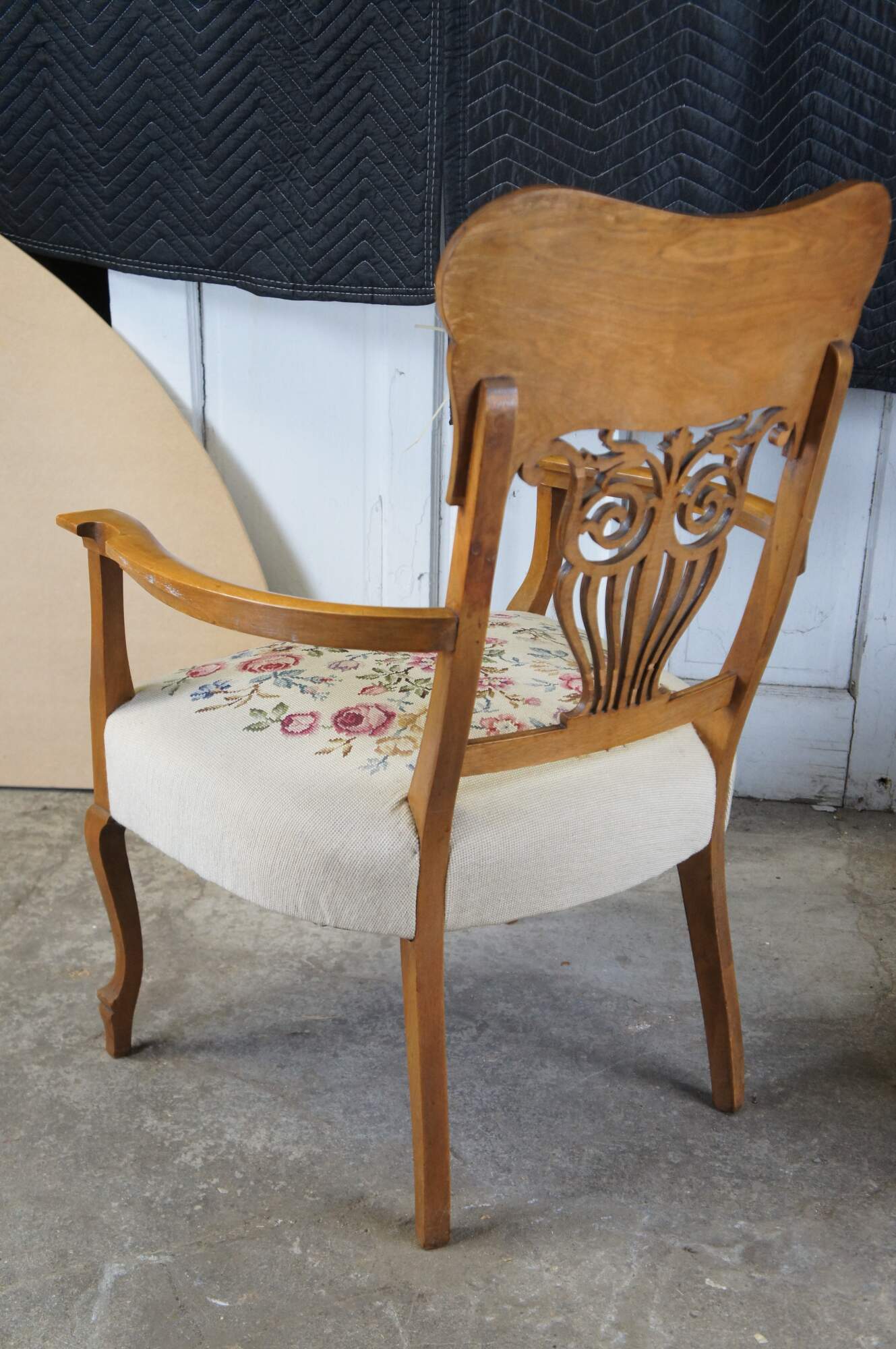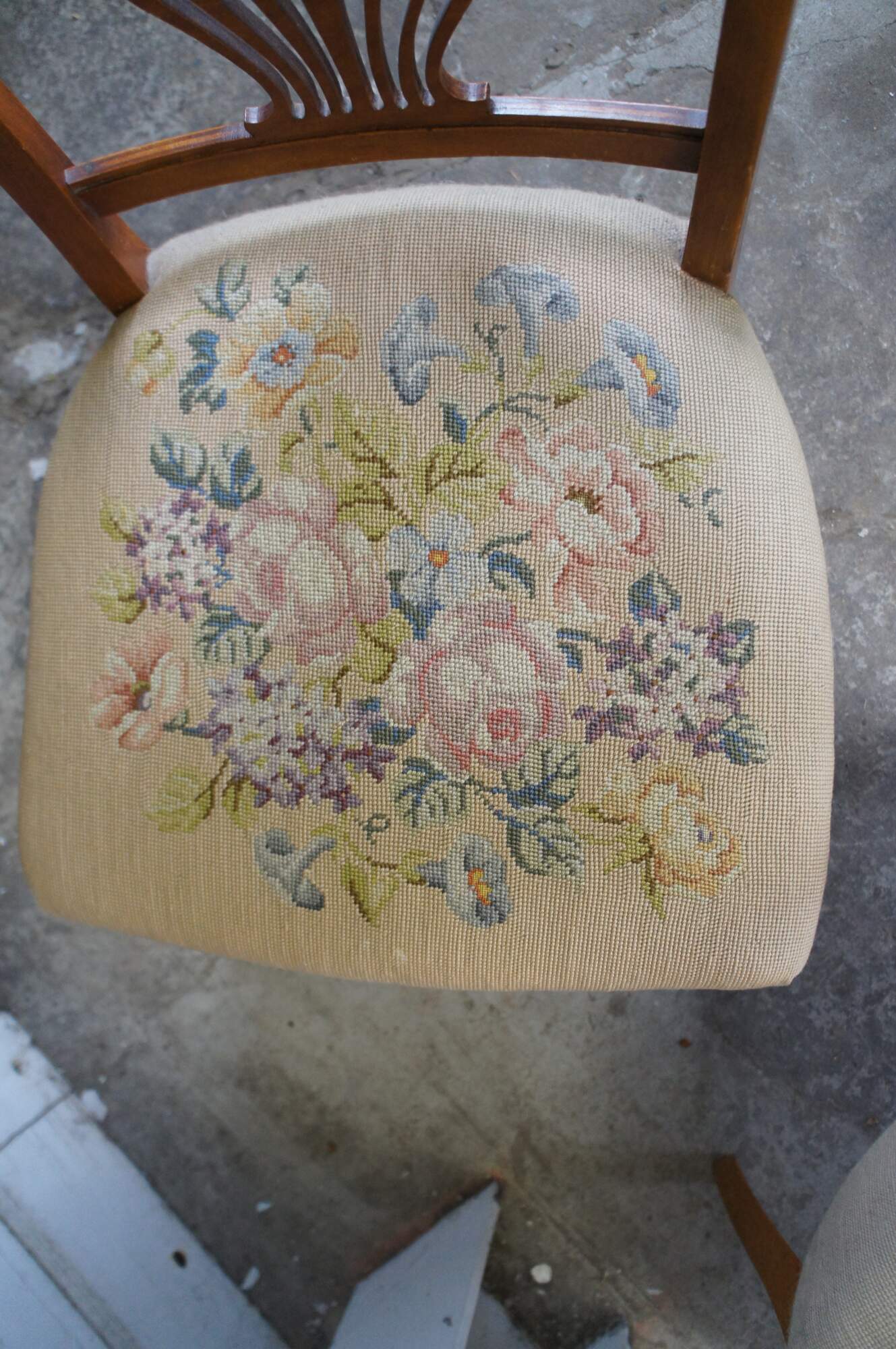 2 ornate late Victorian chairs. Made from quartersawn oak with a contoured back featuring applied and scrolled foliate over a pierced splat back. The seats are embroidered with rose pattern. The chairs are supported by cabriole legs over peg foot.