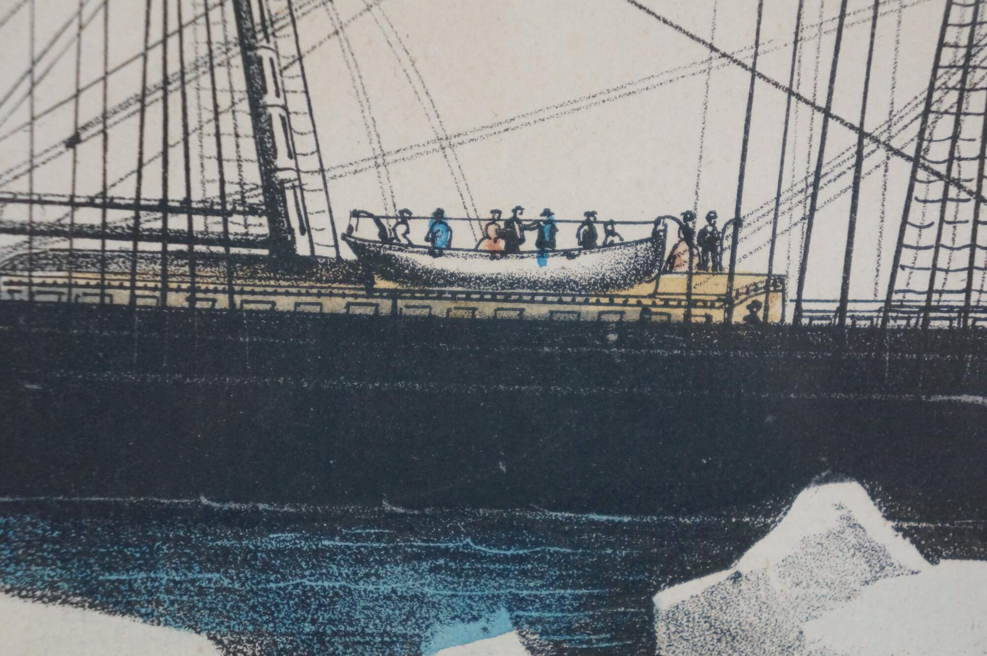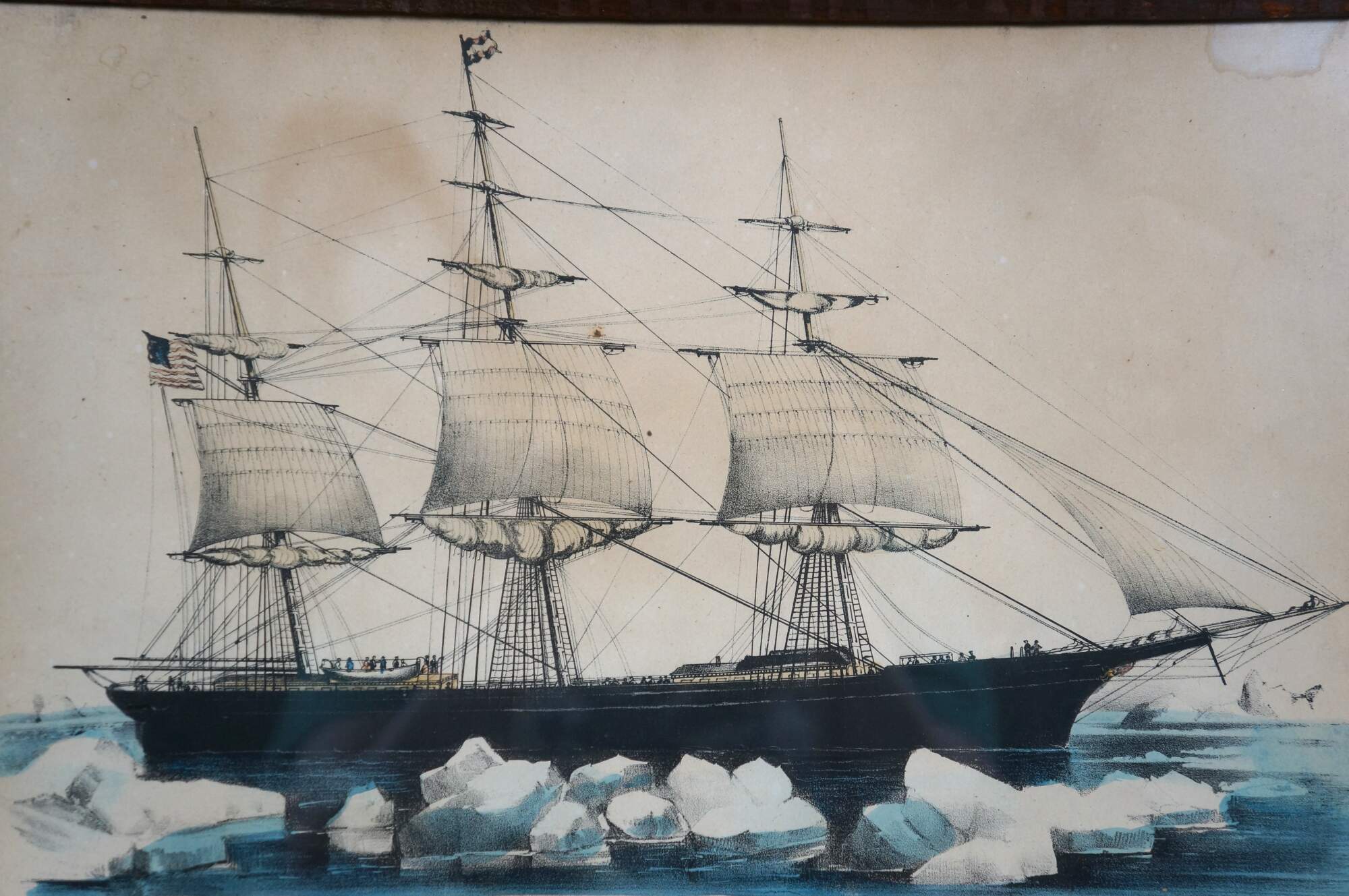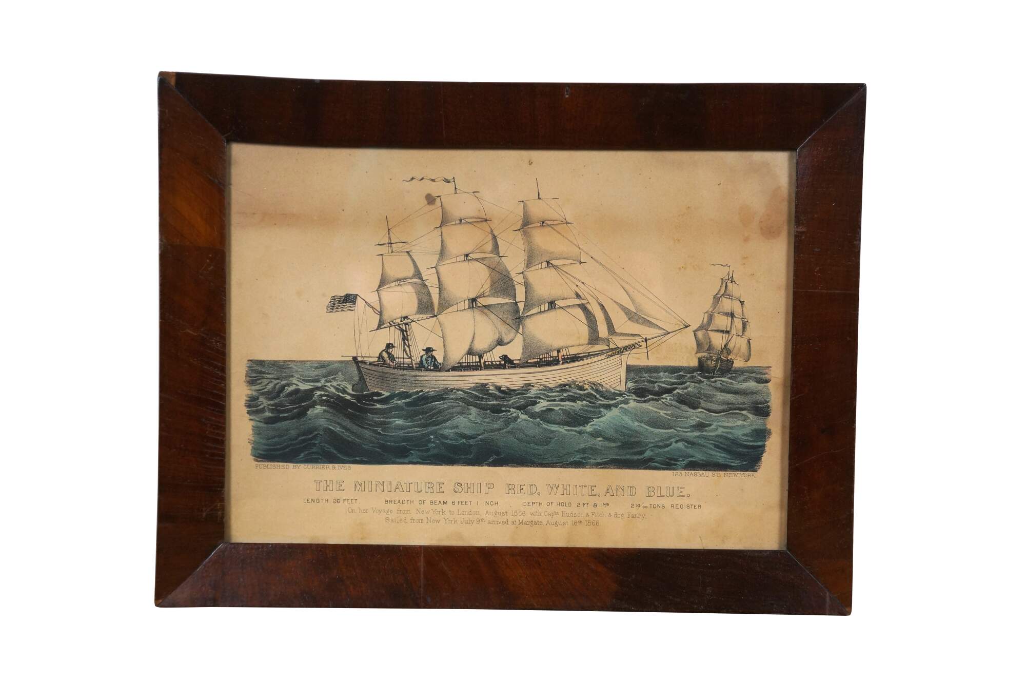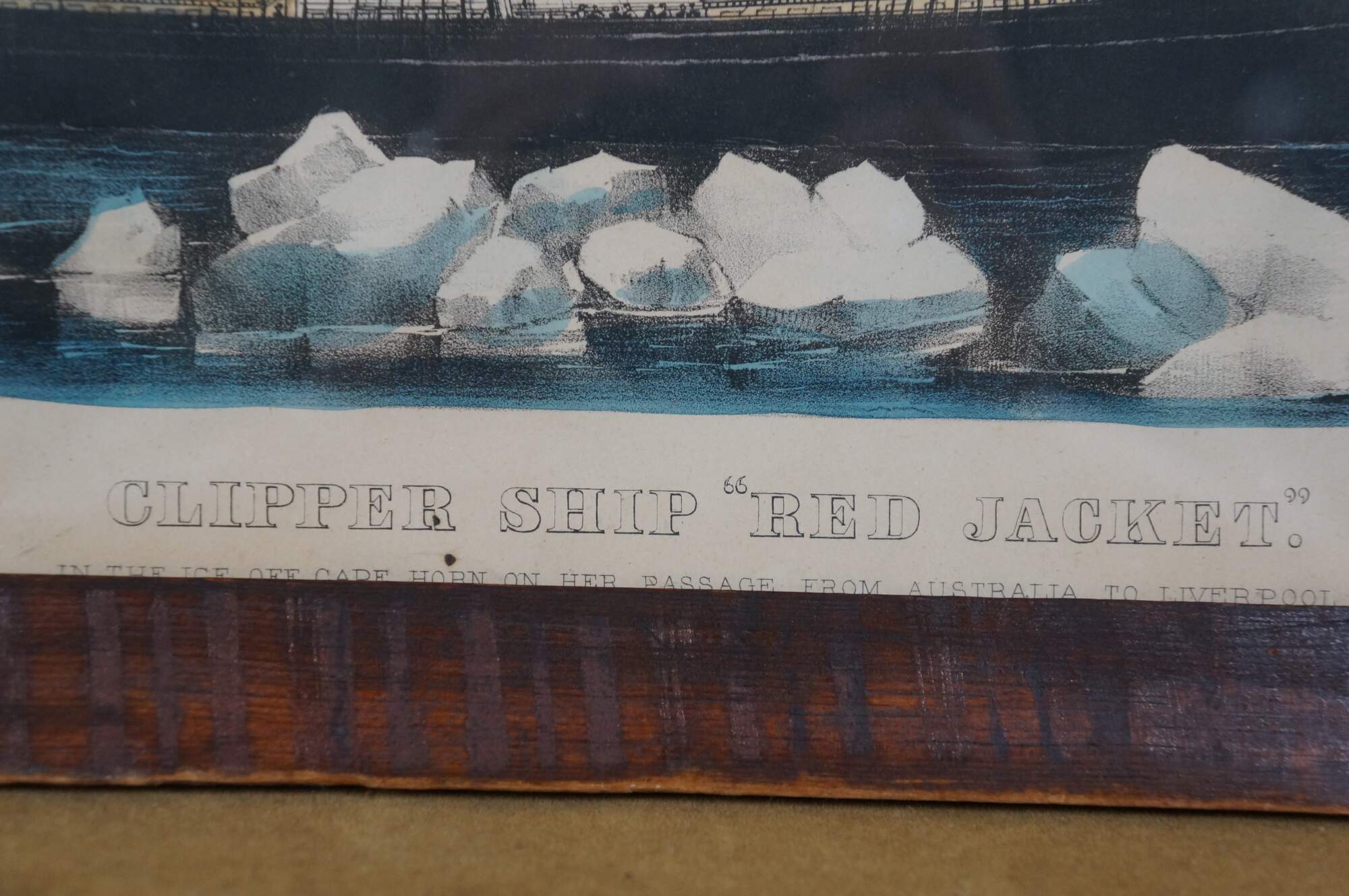 Pair of antique late 19th century Currier & Ives hand colored lithograph prints: "The Miniature Ship Red, White, and Blue - On her Voyage from New York to London, August 1866, with Capts Hudson & Fitch & Dog Fanny" and "Clipper Ship "Red Jacket" - In the Ice Off Cape Horn on Her Passage from Australia to Liverpool." Beveled wood frame, no mat.