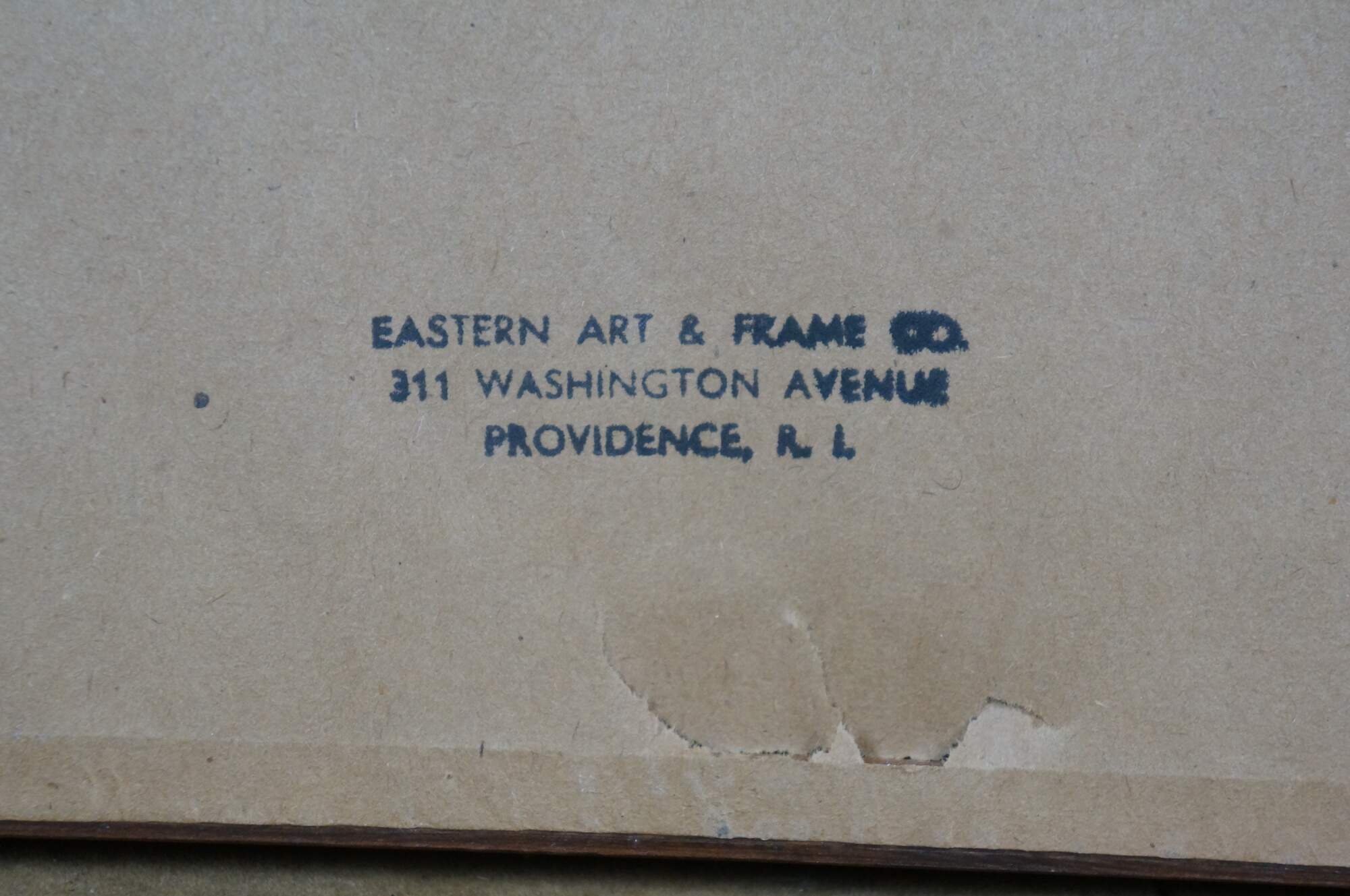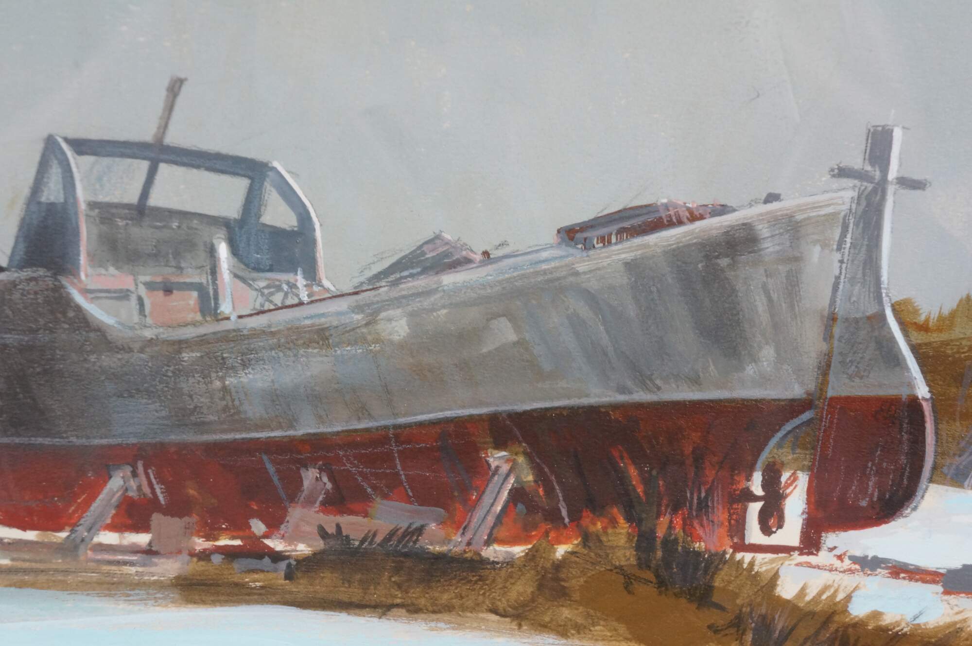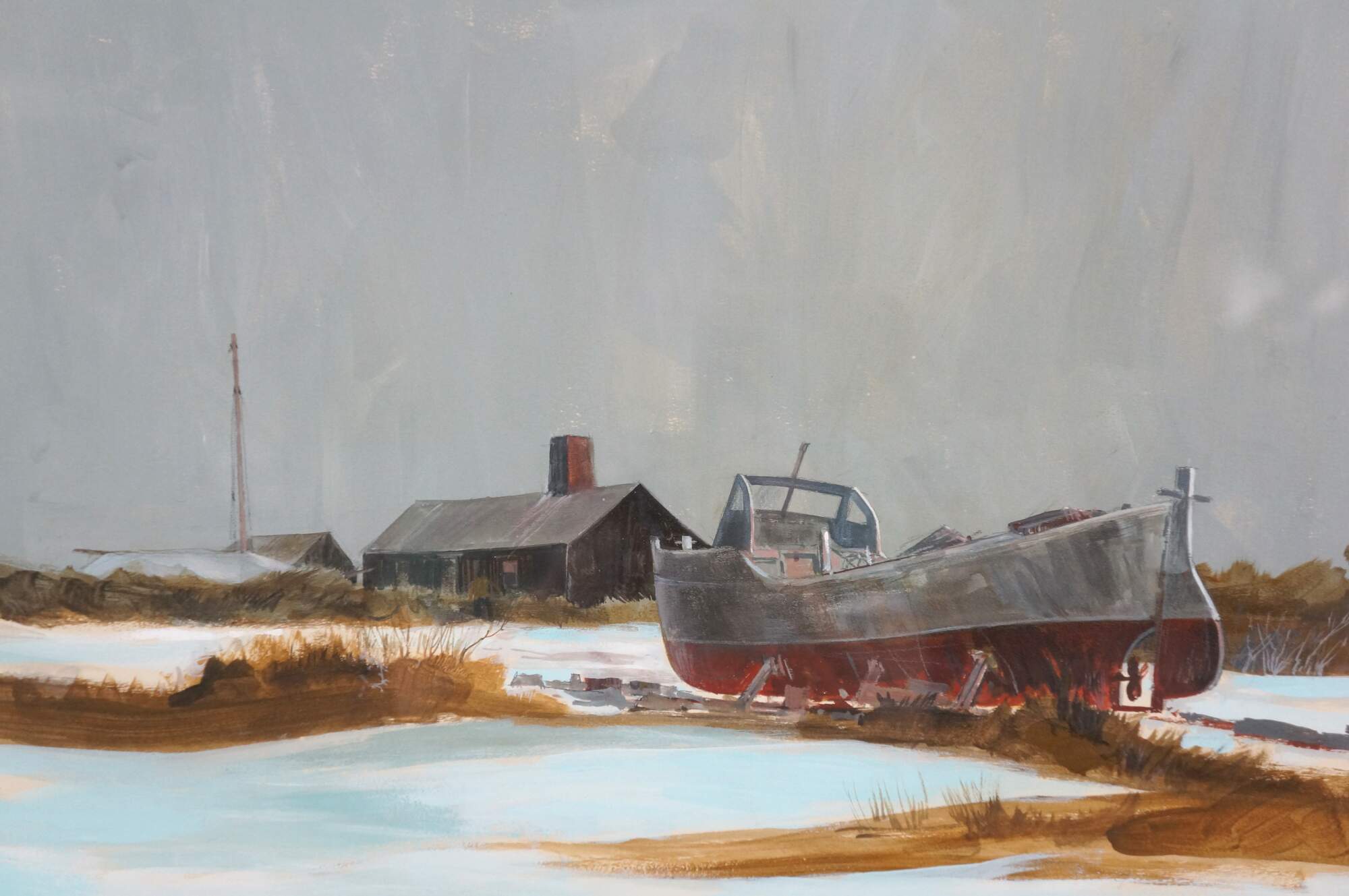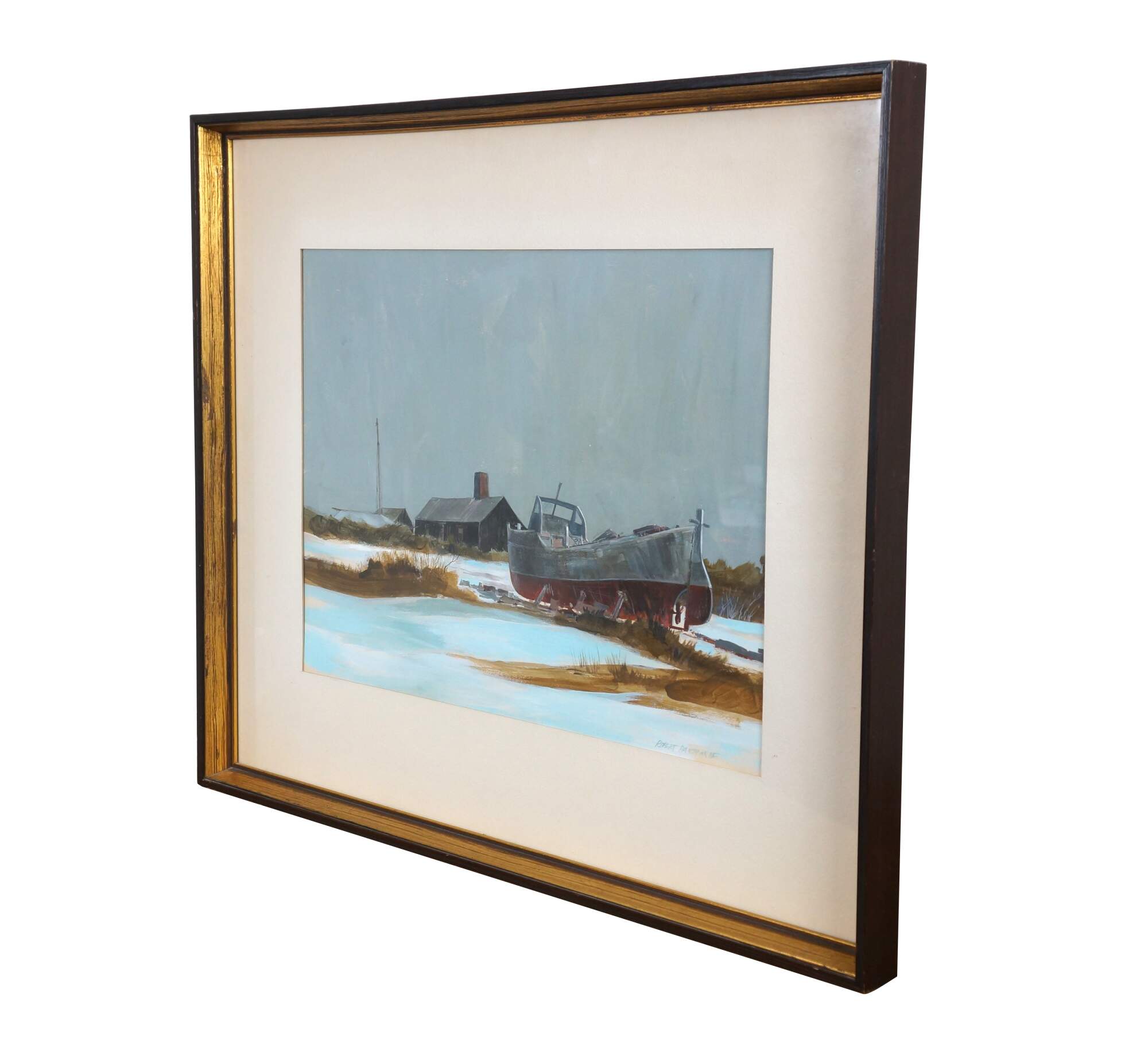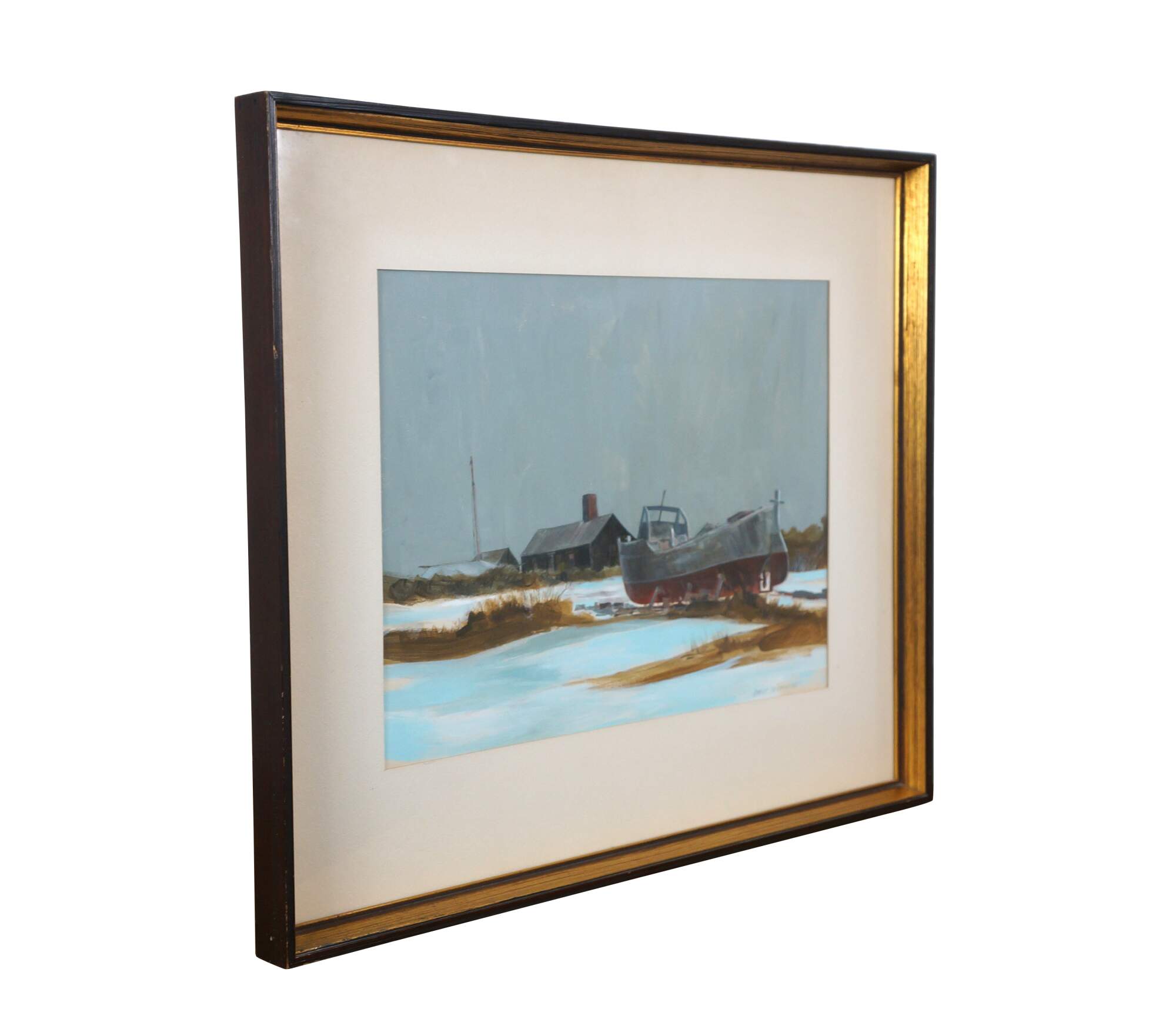 Vintage 20th century Robert Pailthorpe Red Jacket nautical maritime seascape / landscape watercolor painting on paper a of an old fishing wharf in Rhode Island. It features a red and white boat beached on dunes with a cottage in the background. Signed lower right. Beveled black and gold wood frame, white mat.