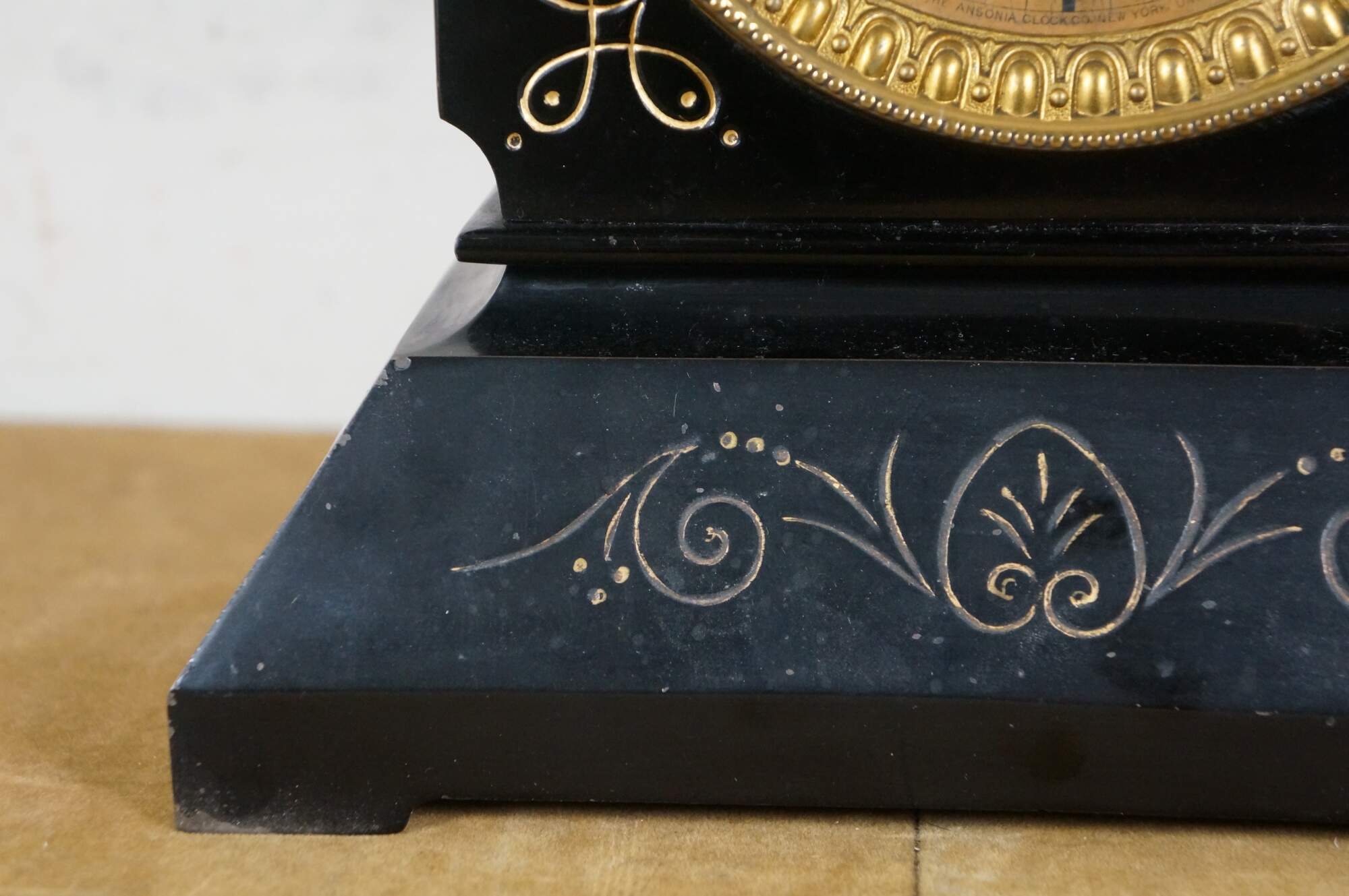 Late 19th century black cast iron Ansonia mantel clock. Black lacquered iron case with gold painted art nouveau foliate details. Key wound, chiming. Off white face with black Roman numerals and hands; gilt floral filigree medallion and egg and dart frame. Manufactured by the Ansonia Clock Company, New York, United States of America.