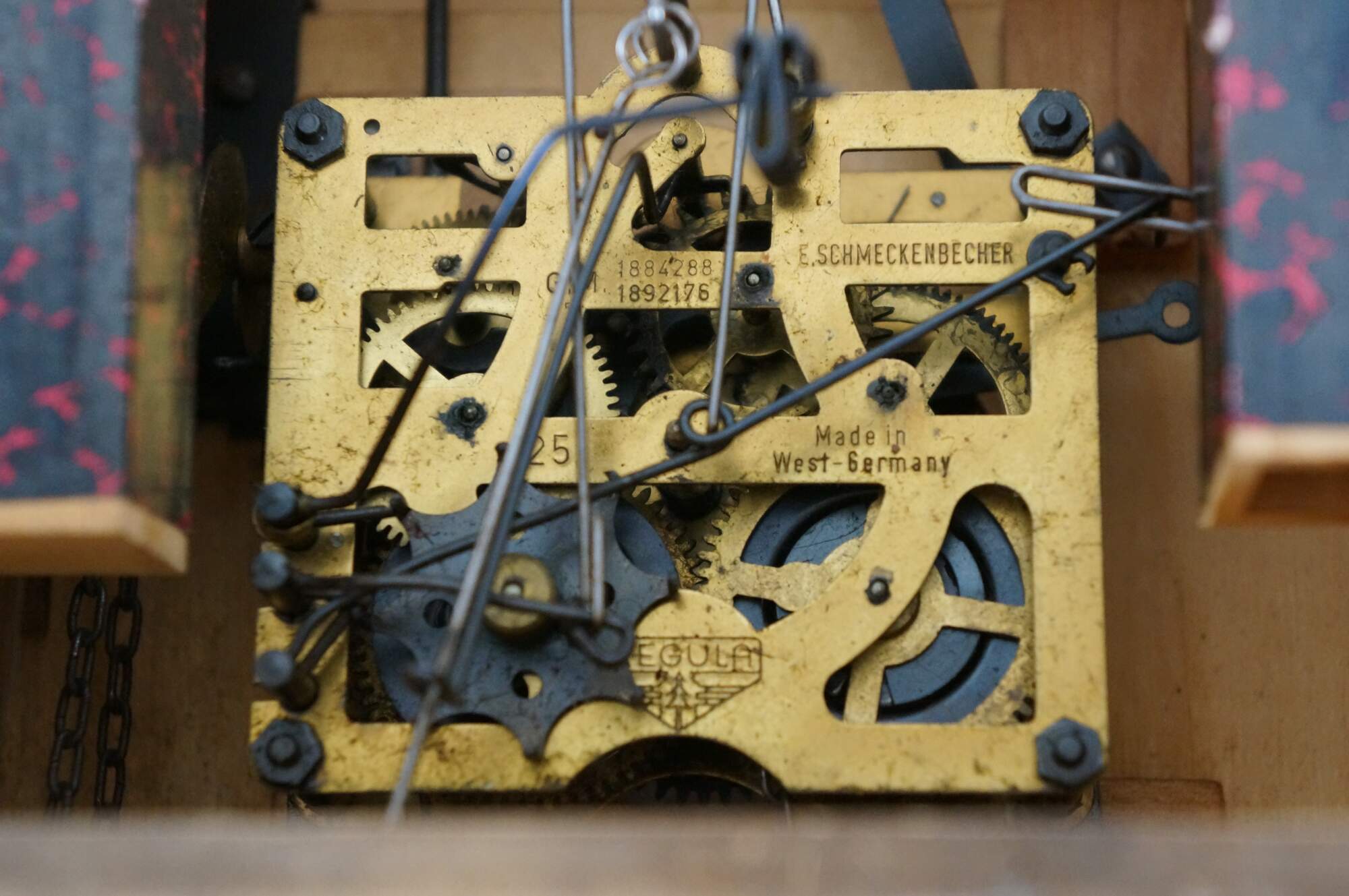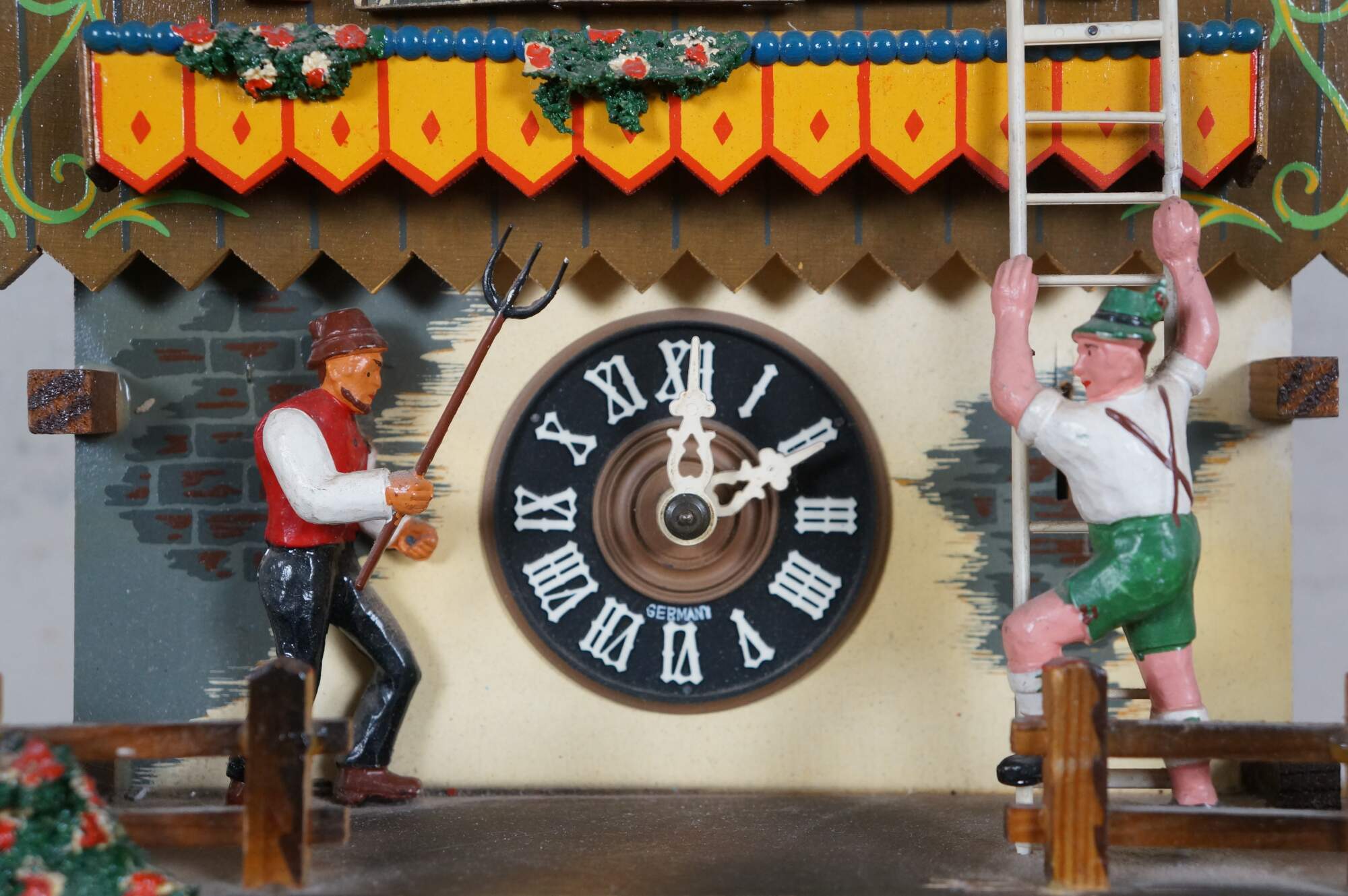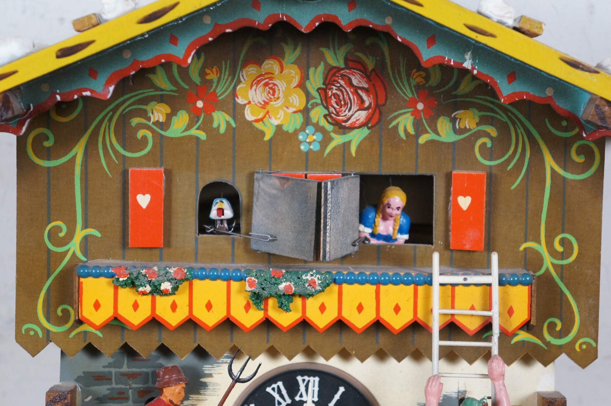 Vintage mid to late 20th century wall hanging 8 day, chiming / musical cuckoo clock by Emil Schmeckenbecher. Wooden house / chalet shaped case hand painted with Black Forest / Bavarian folk art decoration. Hand painted plastic figures depict a young man in lederhosen ascending a ladder to the window of his lover, getting caught by the farmer with his pitchfork. The farmer's daughter peers out of the right-hand window, while the traditional blue and white cuckoo bird pops out of the left. Black clock face with white hands and Roman numerals. Shield / sign shaped pendulum; includes three pine cone shaped weights. Chimes, bellows and music box. Case marked 8-66. Regula movement - GM 1884288 / 25 / Made in West Germany.