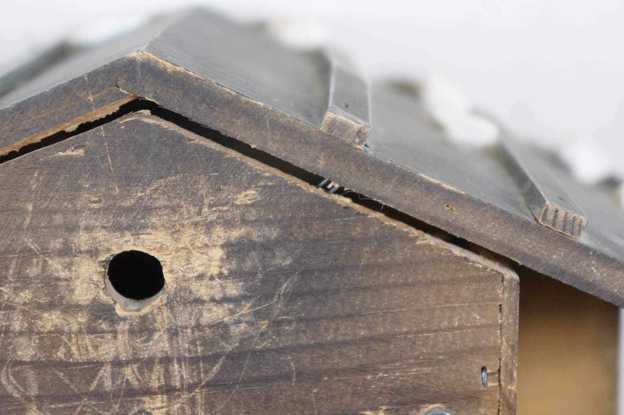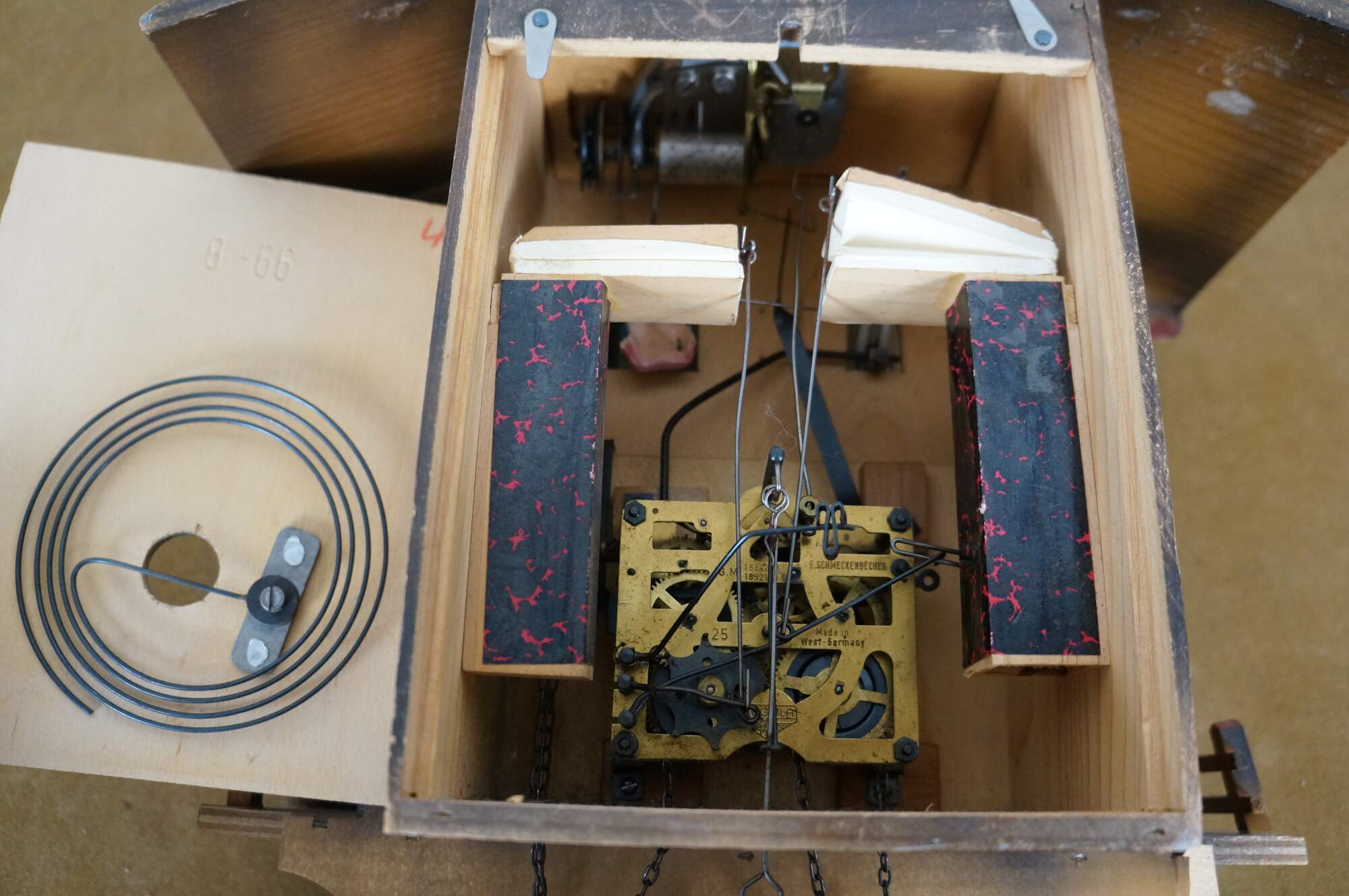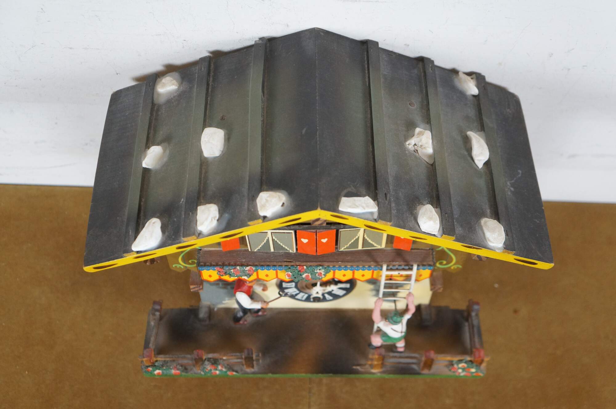 Vintage mid to late 20th century wall hanging 8 day, chiming / musical cuckoo clock by Emil Schmeckenbecher. Wooden house / chalet shaped case hand painted with Black Forest / Bavarian folk art decoration. Hand painted plastic figures depict a young man in lederhosen ascending a ladder to the window of his lover, getting caught by the farmer with his pitchfork. The farmer's daughter peers out of the right-hand window, while the traditional blue and white cuckoo bird pops out of the left. Black clock face with white hands and Roman numerals. Shield / sign shaped pendulum; includes three pine cone shaped weights. Chimes, bellows and music box. Case marked 8-66. Regula movement - GM 1884288 / 25 / Made in West Germany.