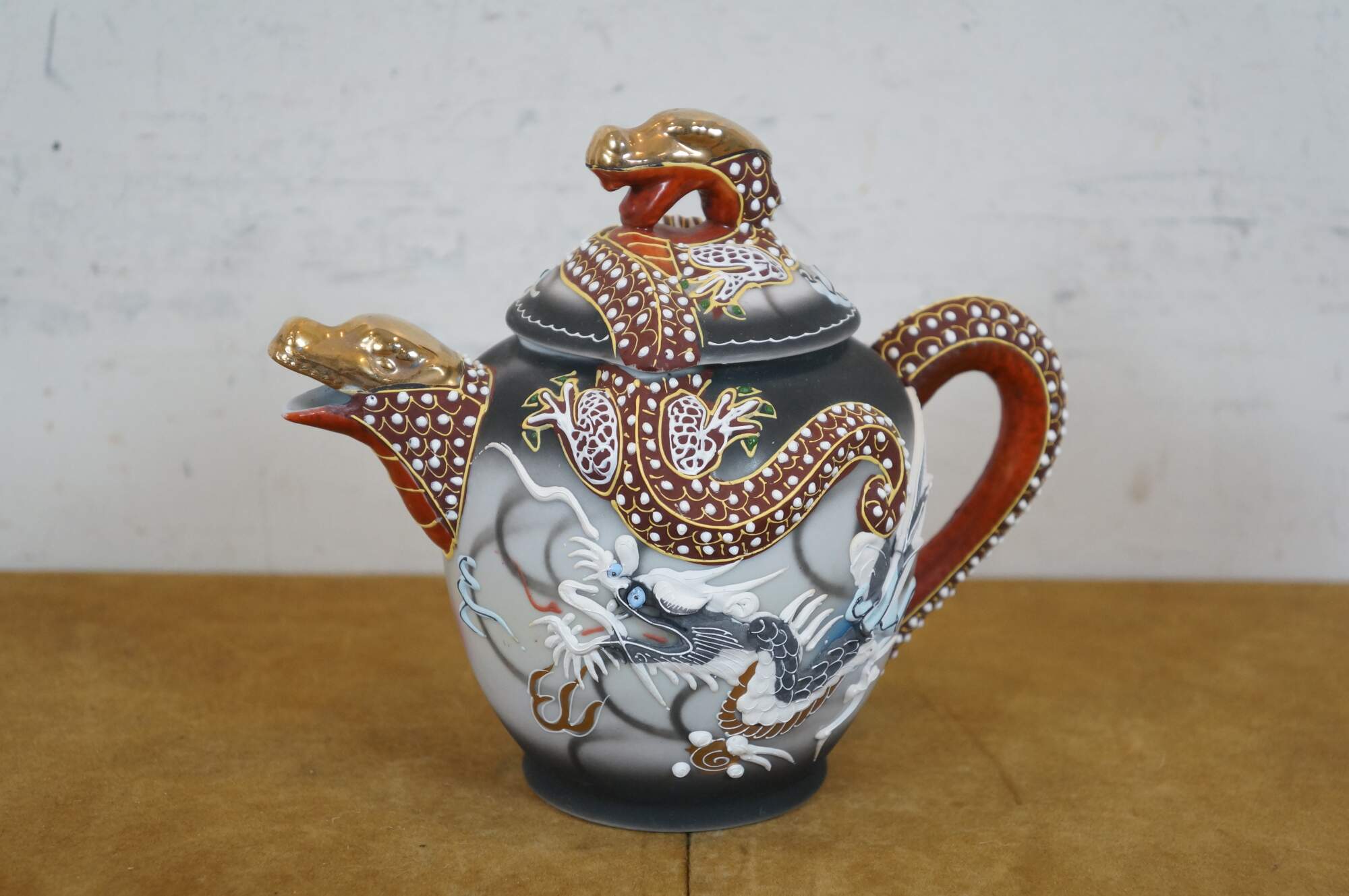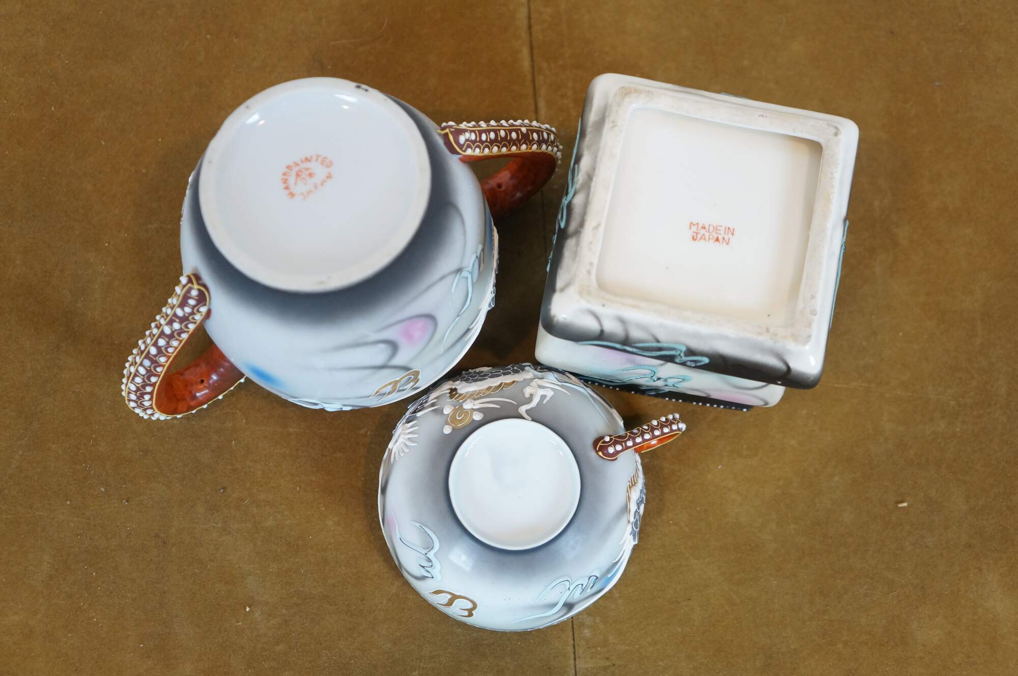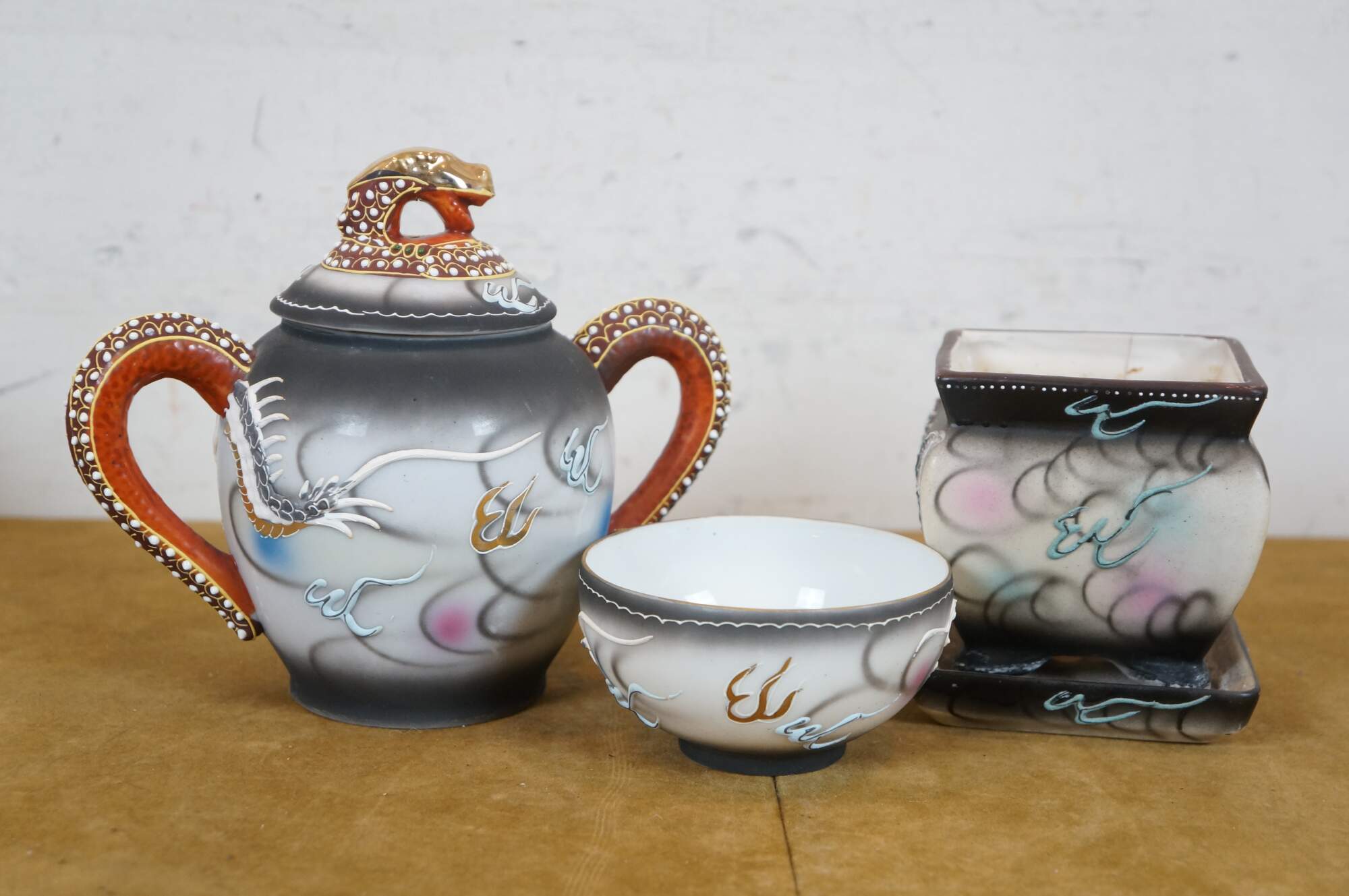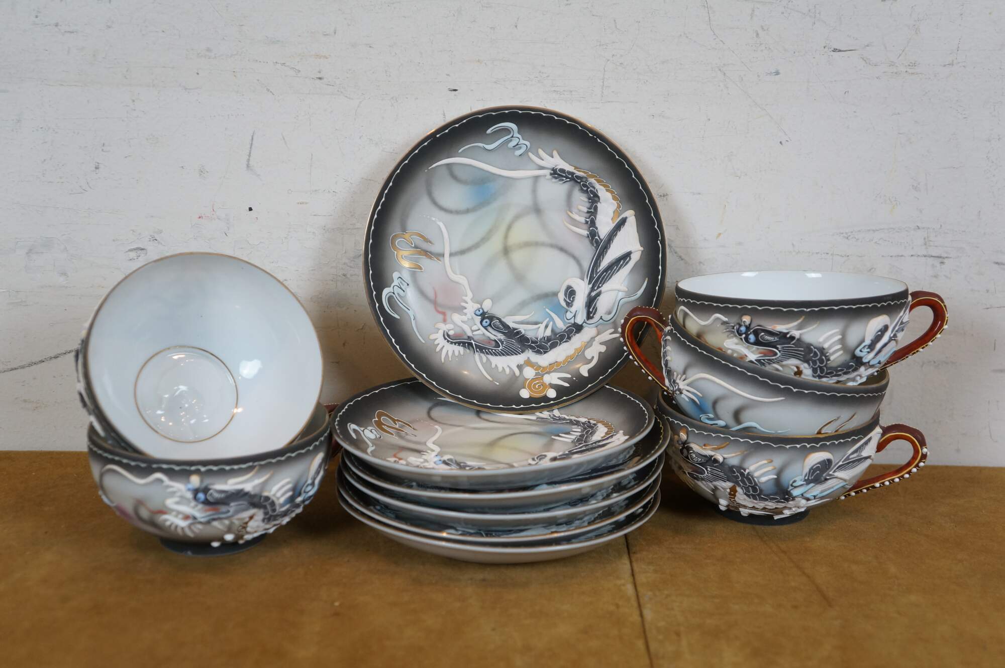 Circa early to mid-20th century Japanese porcelain tea set - a mixed lot of various makes in the same style. Three-dimensional blue and white moriage dragons on storm cloud gray backgrounds, with red-spotted tail-shaped handles and heads on the teacups and pots, accented with gilt. The base of the teacups holds a lithopane image of a geisha. Set includes: Serving Plate, 6 Dessert Plates, 6 Saucers, 5 Teacups, Teapot with Lid, Waste Pot with Lid, Planter.