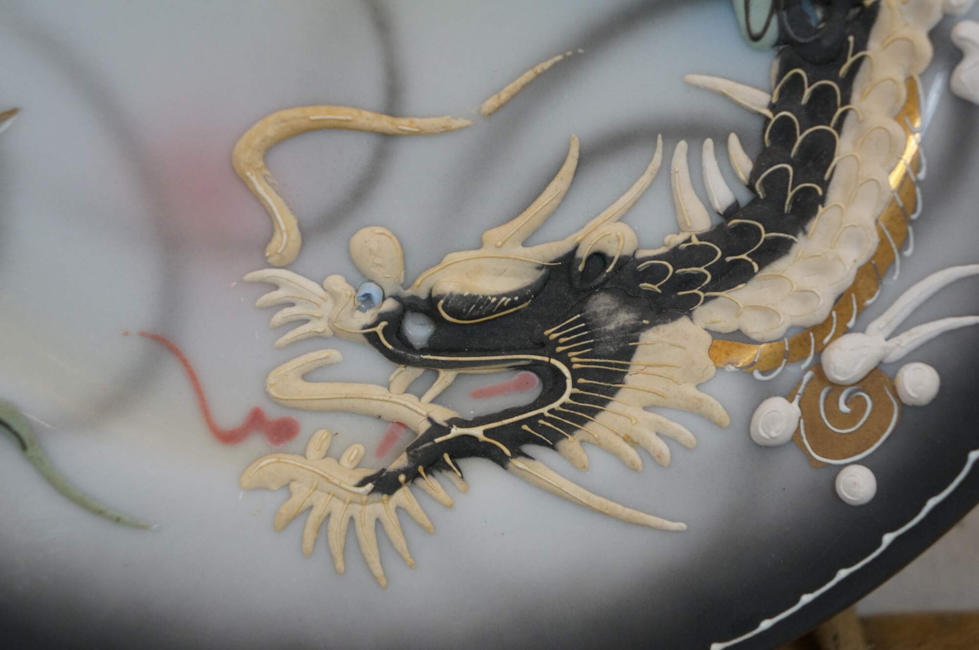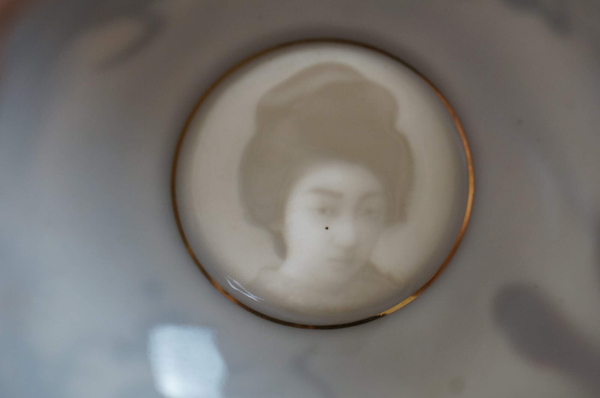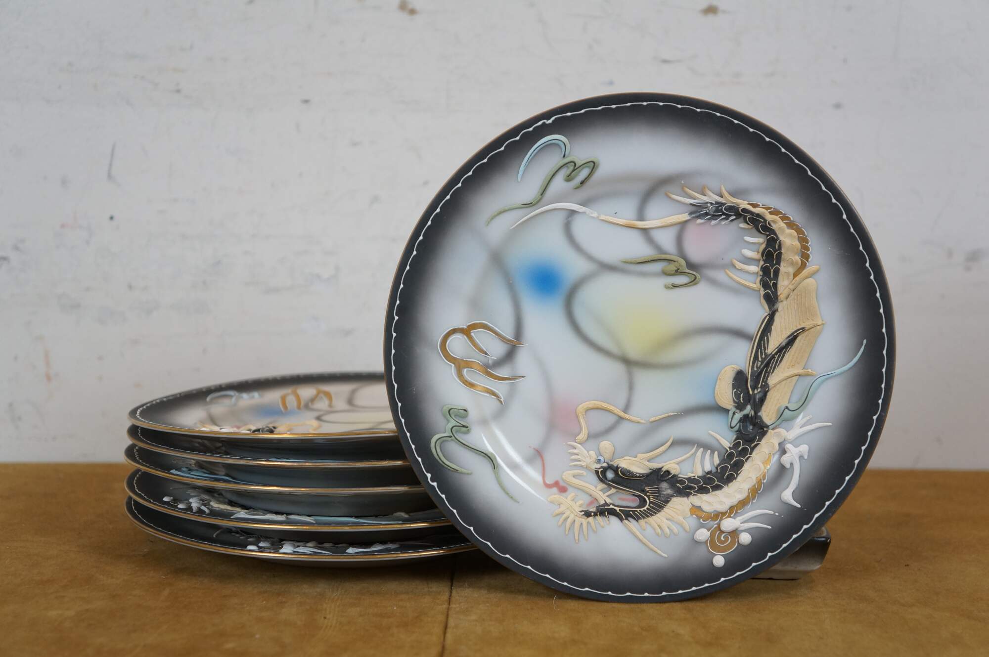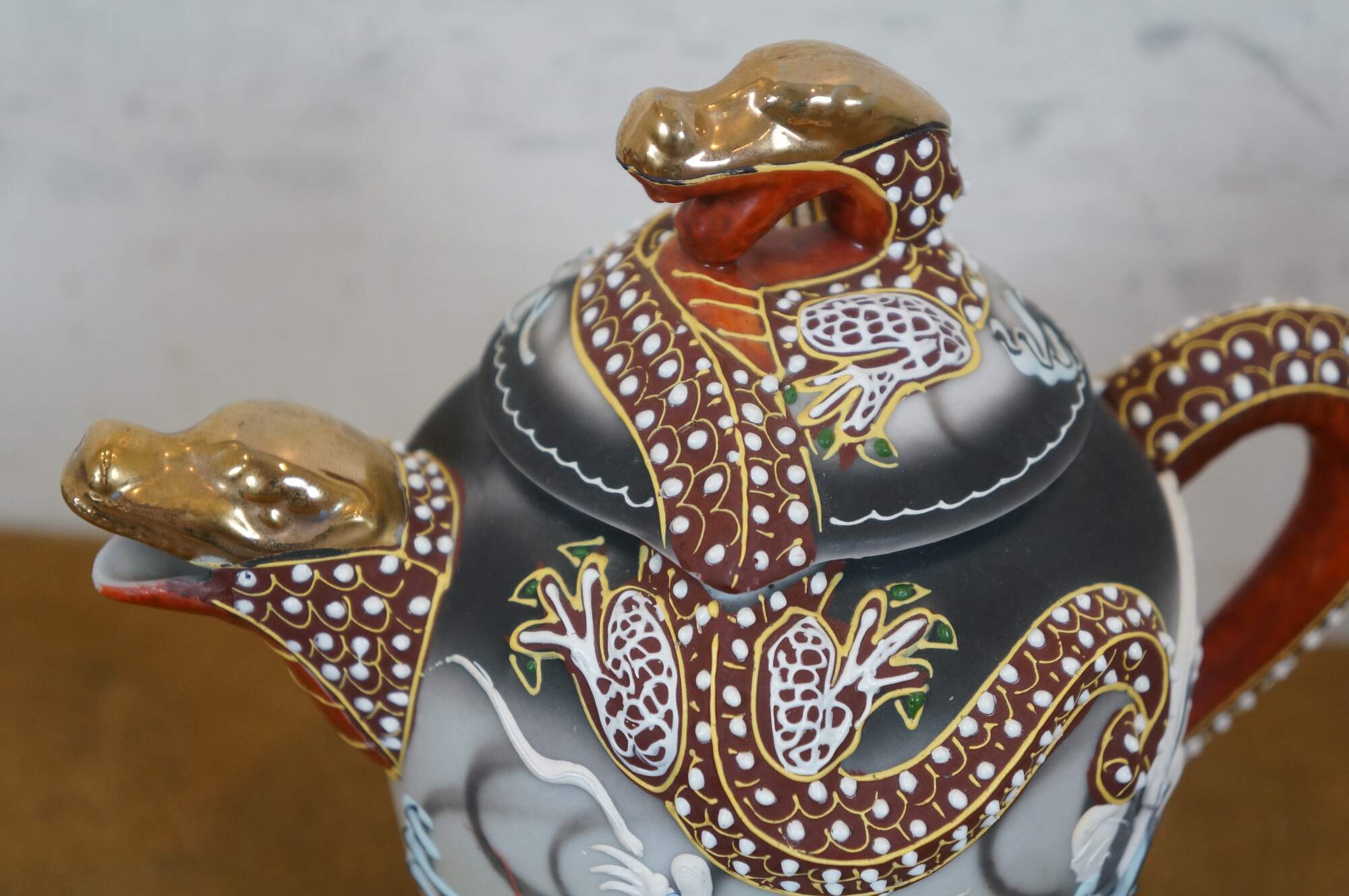 Circa early to mid-20th century Japanese porcelain tea set - a mixed lot of various makes in the same style. Three-dimensional blue and white moriage dragons on storm cloud gray backgrounds, with red-spotted tail-shaped handles and heads on the teacups and pots, accented with gilt. The base of the teacups holds a lithopane image of a geisha. Set includes: Serving Plate, 6 Dessert Plates, 6 Saucers, 5 Teacups, Teapot with Lid, Waste Pot with Lid, Planter.