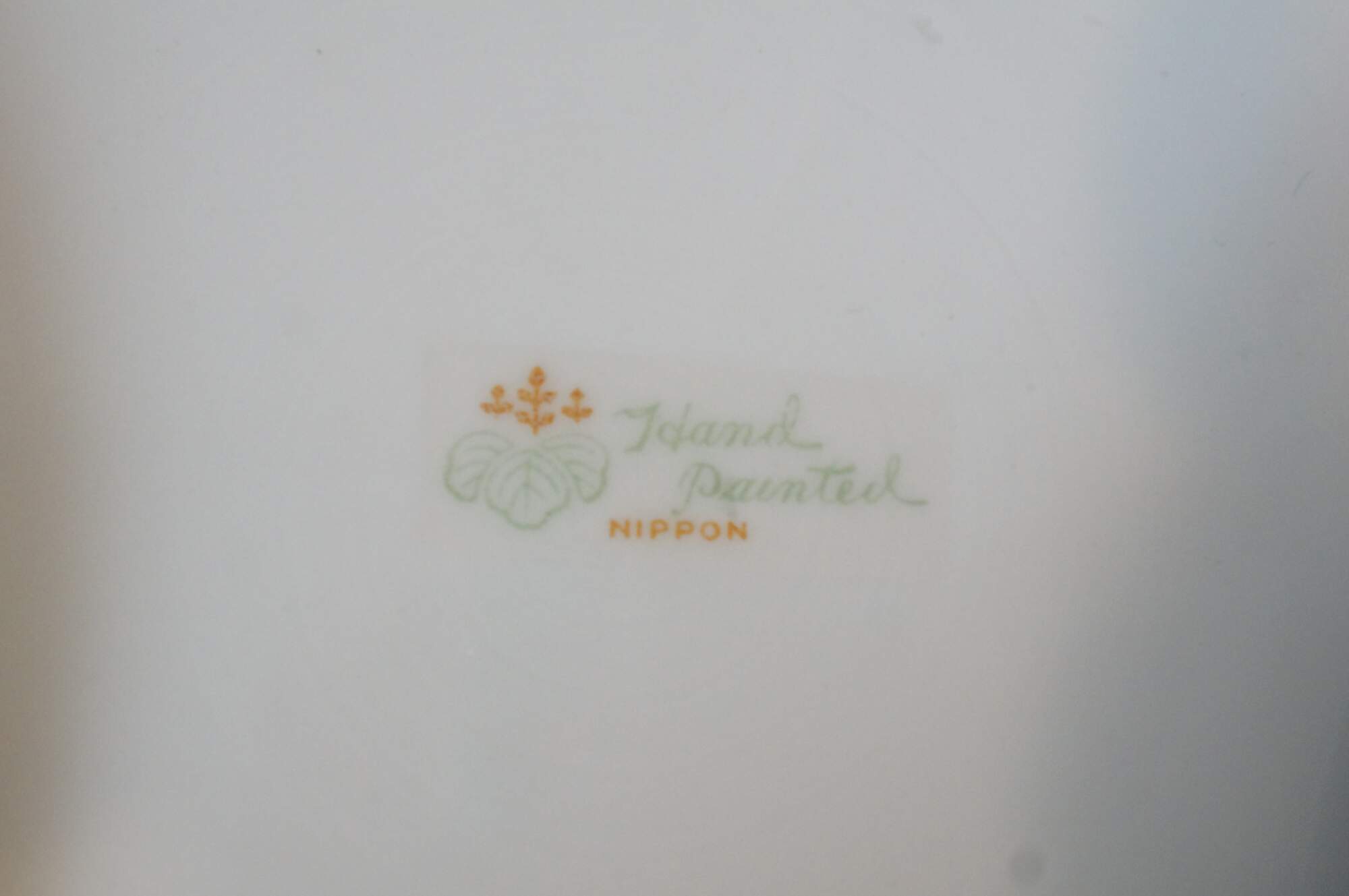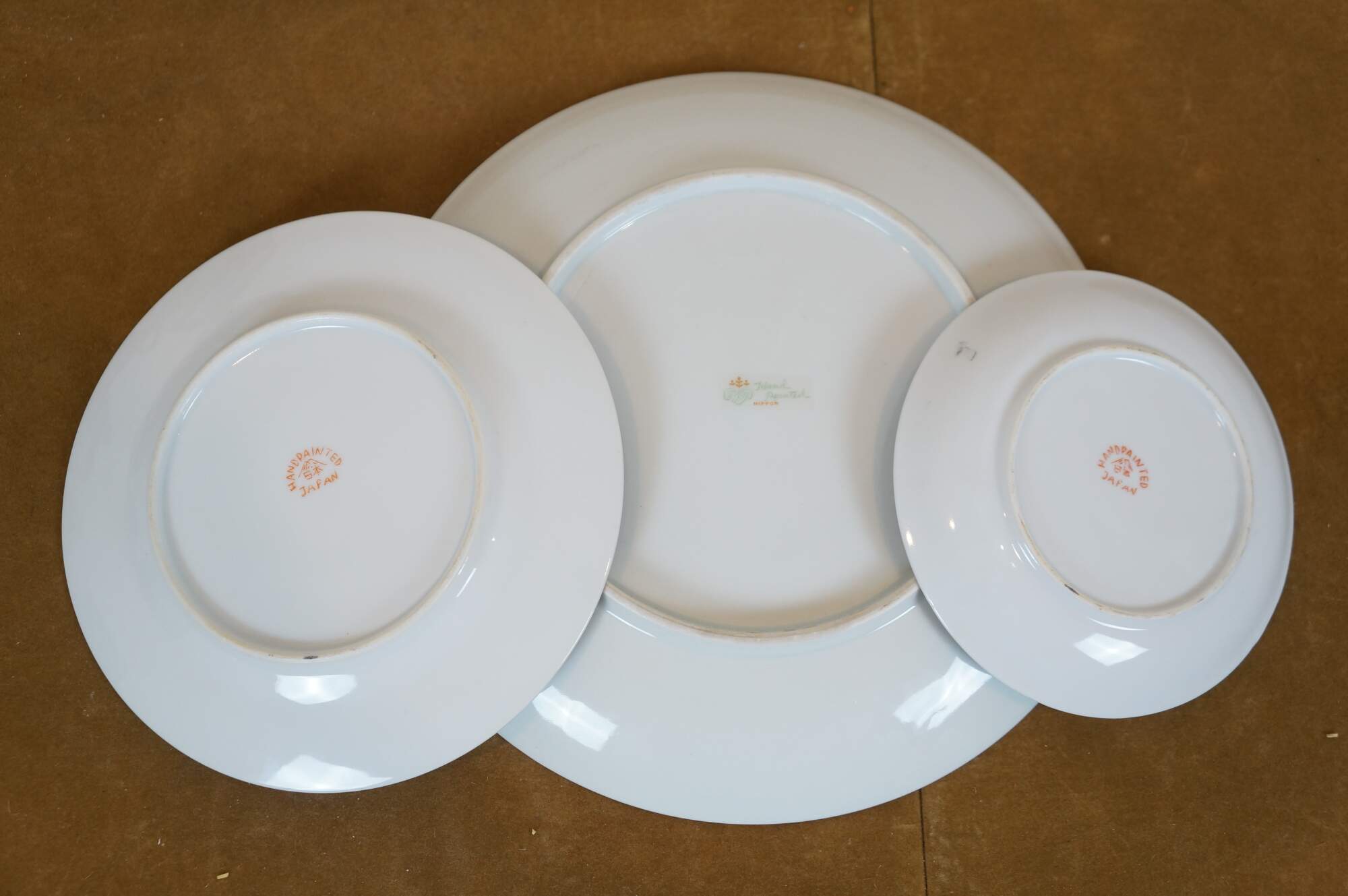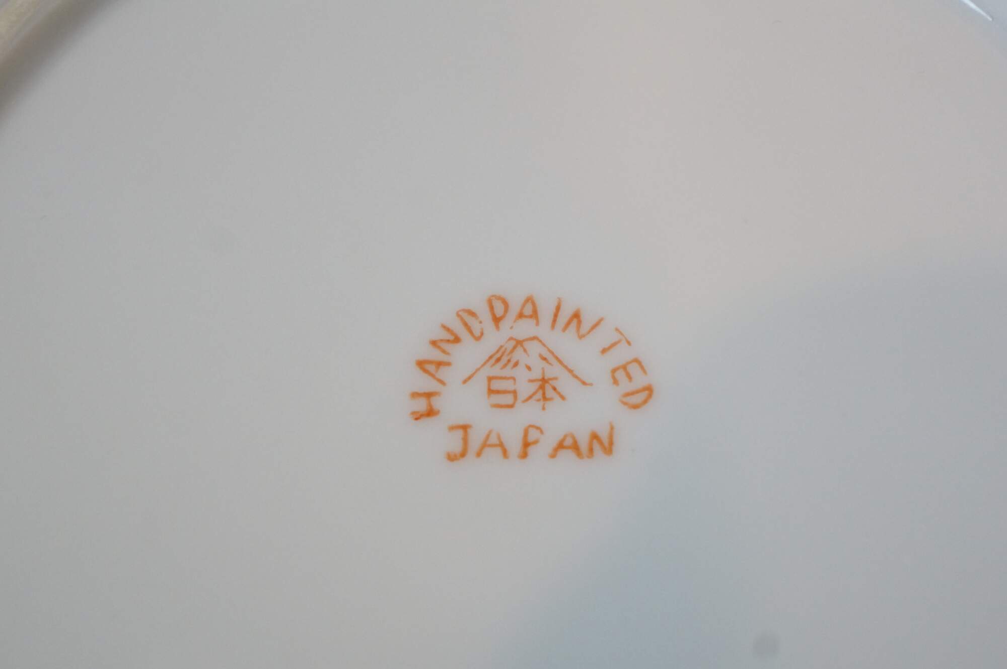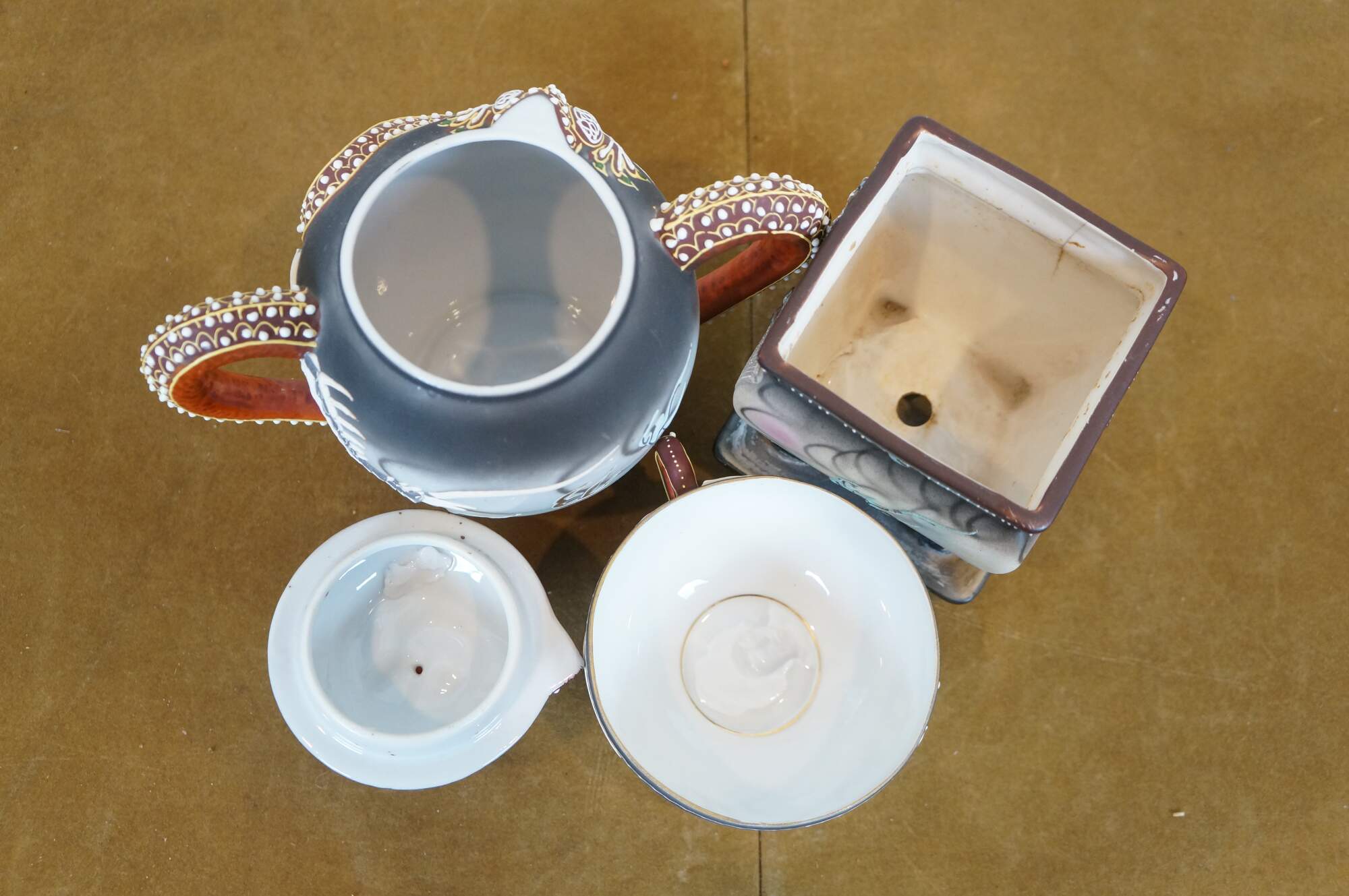 Circa early to mid-20th century Japanese porcelain tea set - a mixed lot of various makes in the same style. Three-dimensional blue and white moriage dragons on storm cloud gray backgrounds, with red-spotted tail-shaped handles and heads on the teacups and pots, accented with gilt. The base of the teacups holds a lithopane image of a geisha. Set includes: Serving Plate, 6 Dessert Plates, 6 Saucers, 5 Teacups, Teapot with Lid, Waste Pot with Lid, Planter.