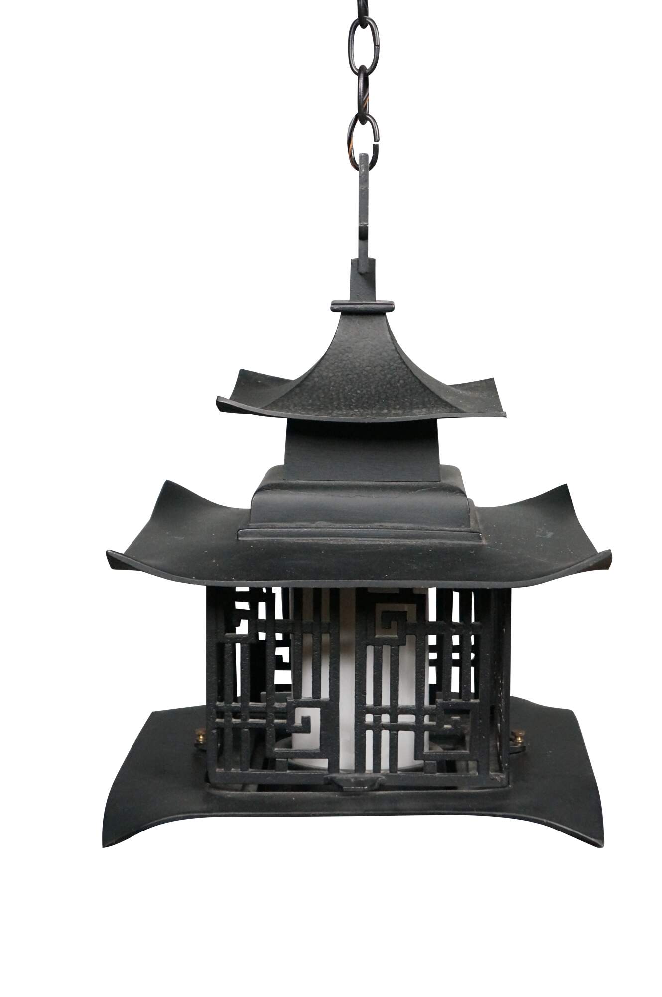 Circa 1960s black metal single light, hanging lantern/ pendant light. Pagoda-style lantern with a pierced chinoiserie cage around a white glass hurricane shade.