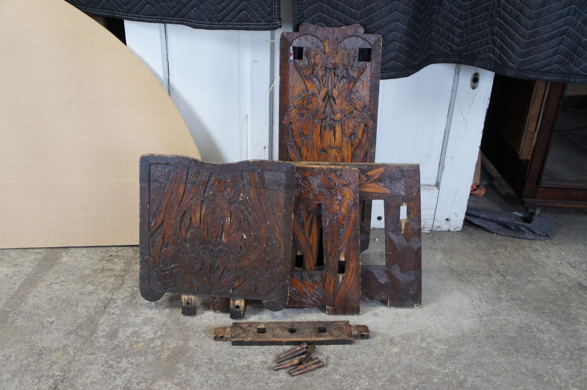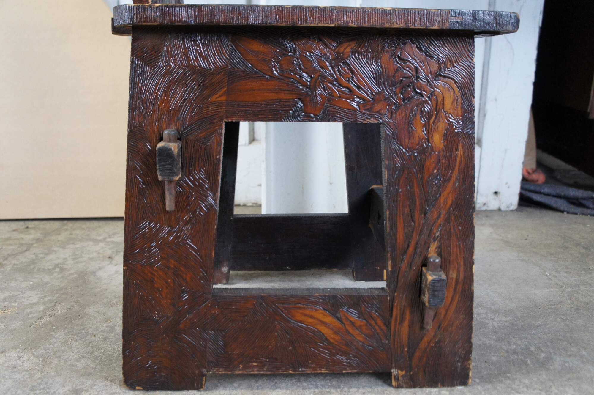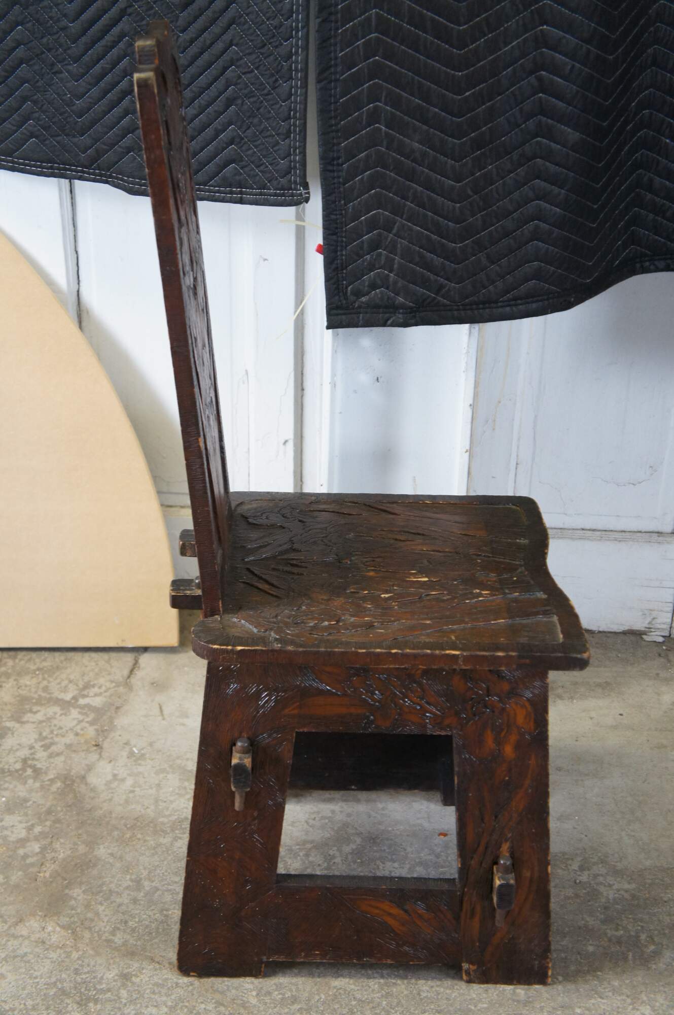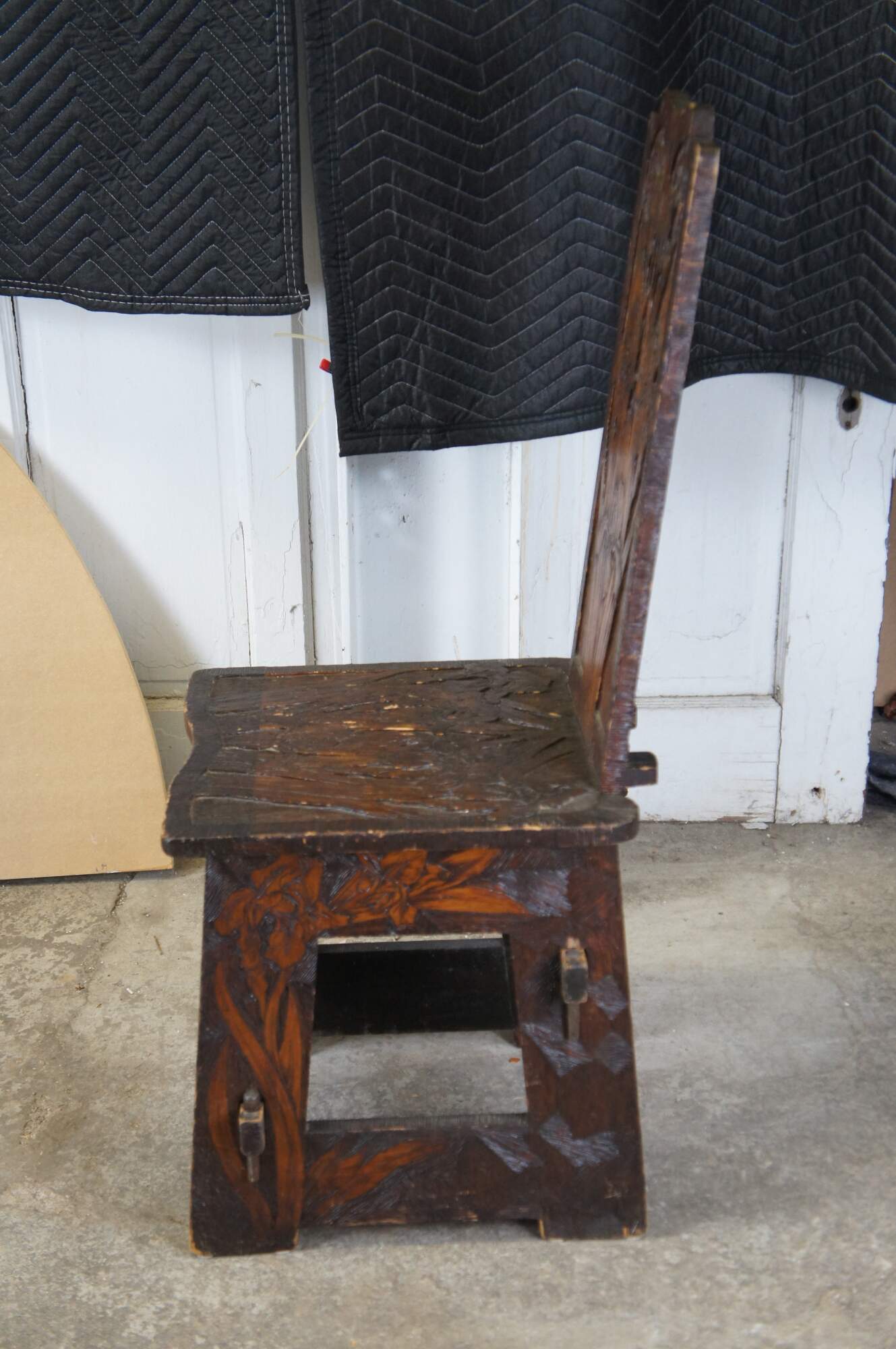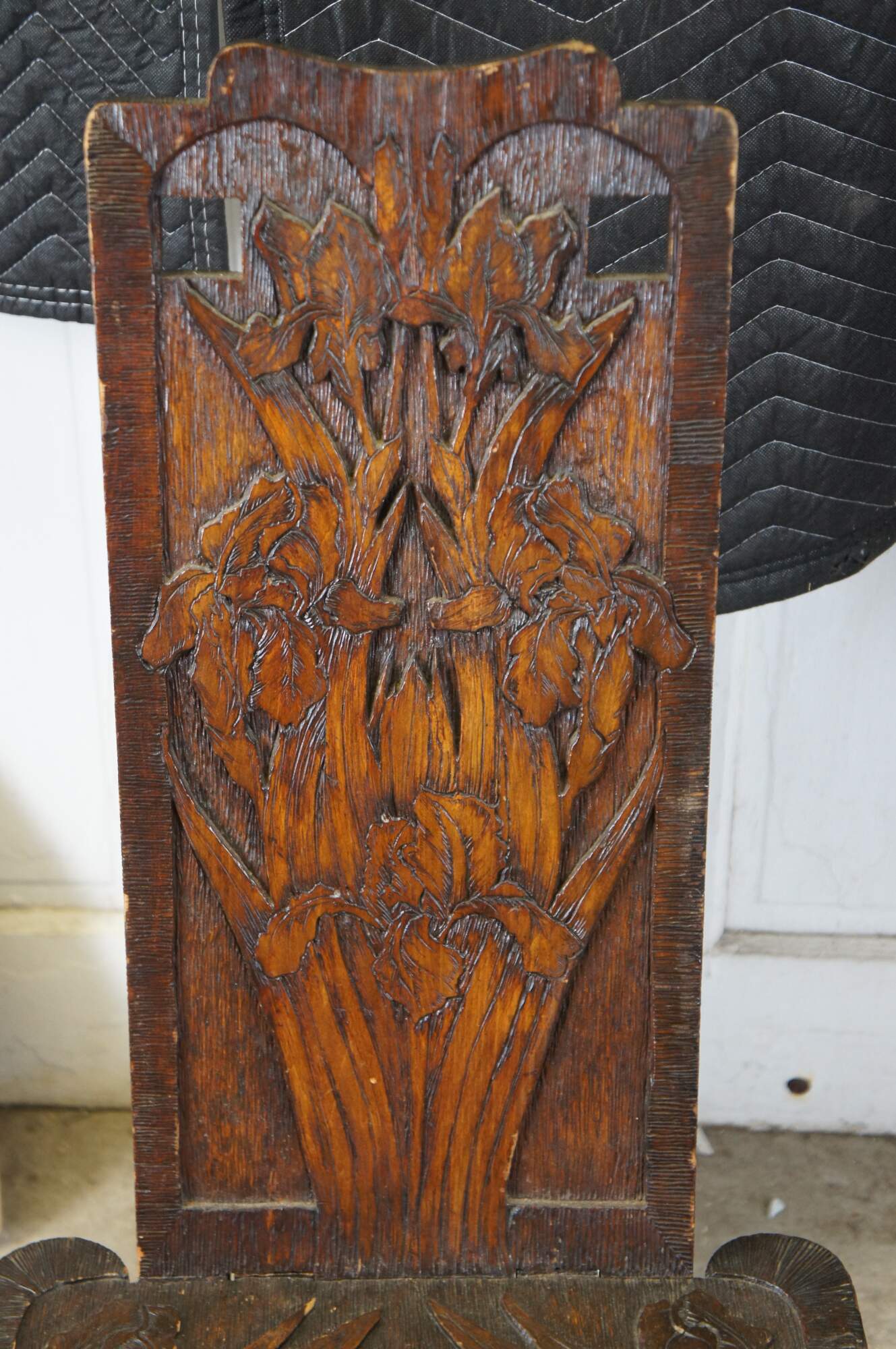 An antique early 20th century Arts & Crafts Pyrography Chair. The chair is made from oak and has a Chrysanthemum carved into the back. The chair is a knockdown chair and is held together via tenons.