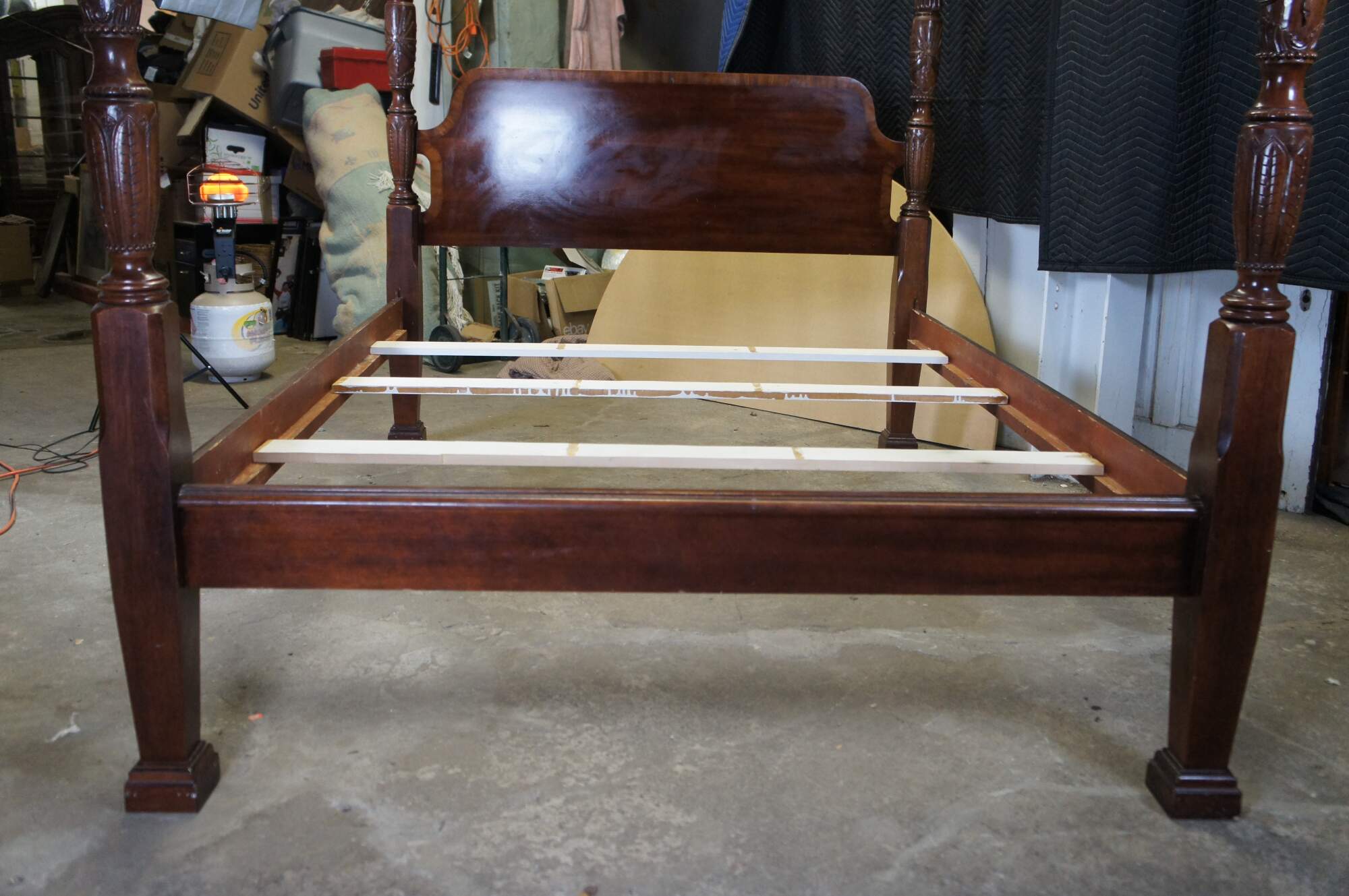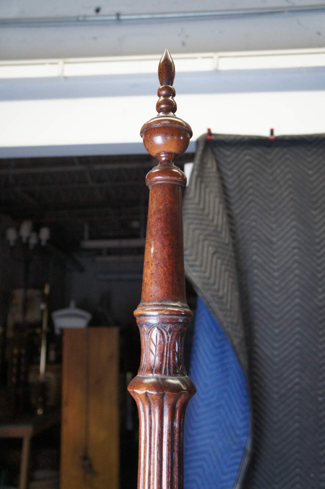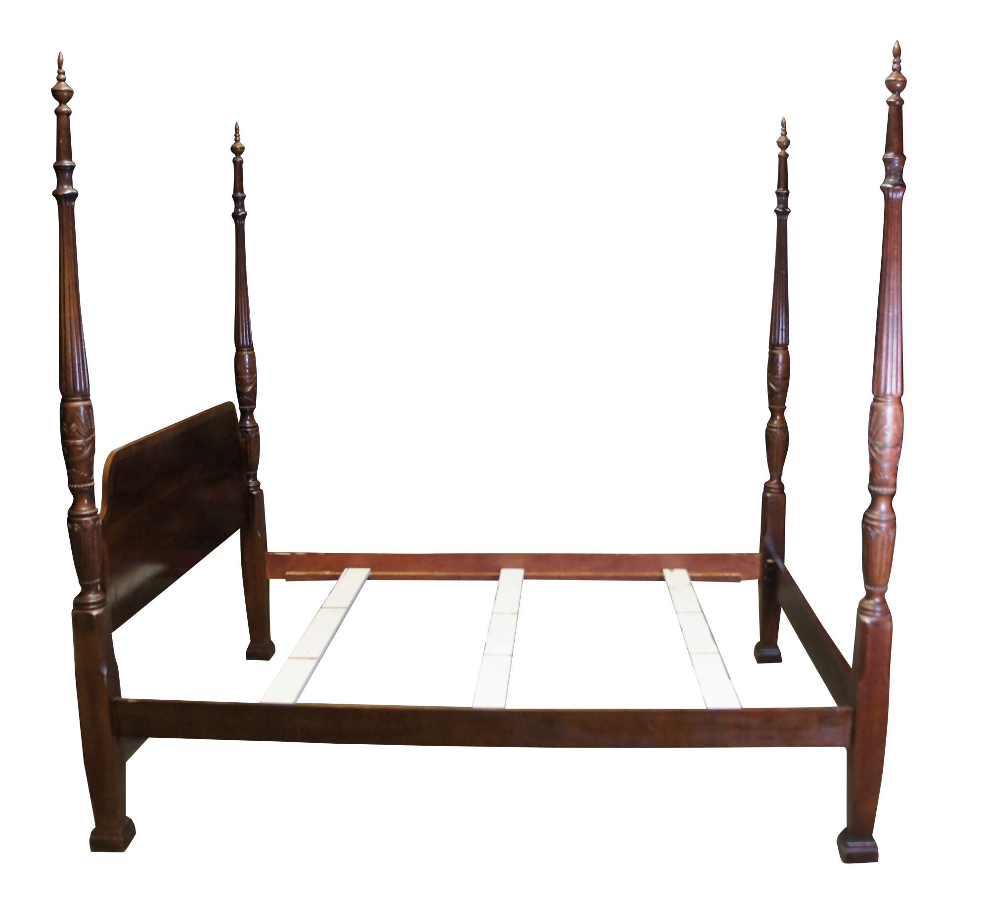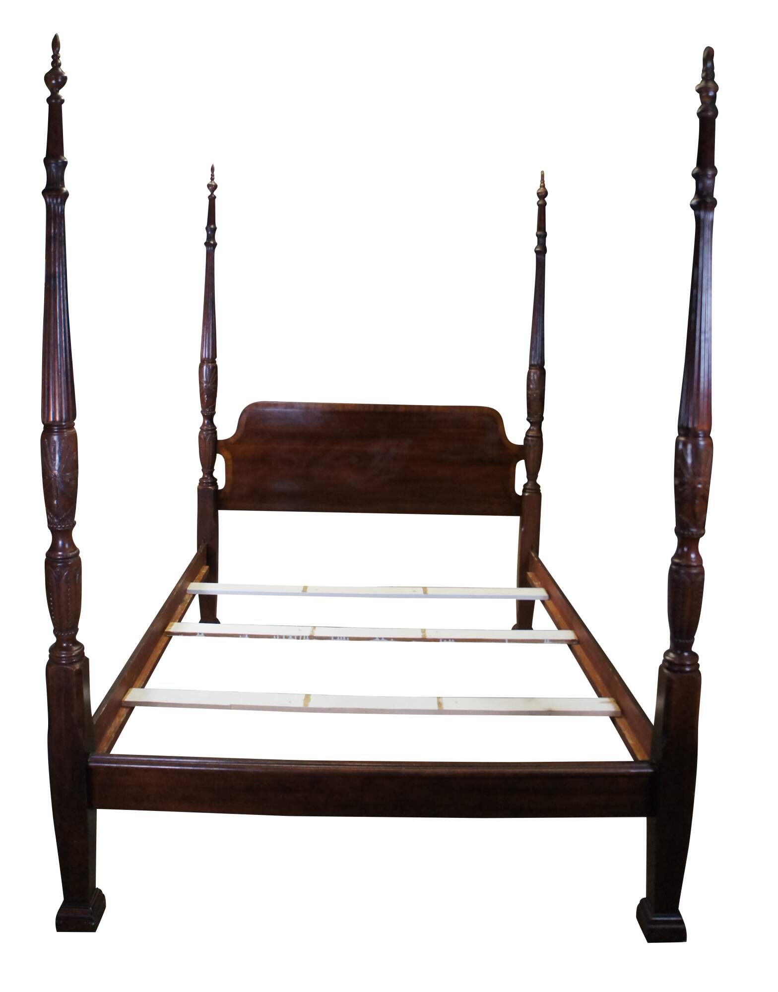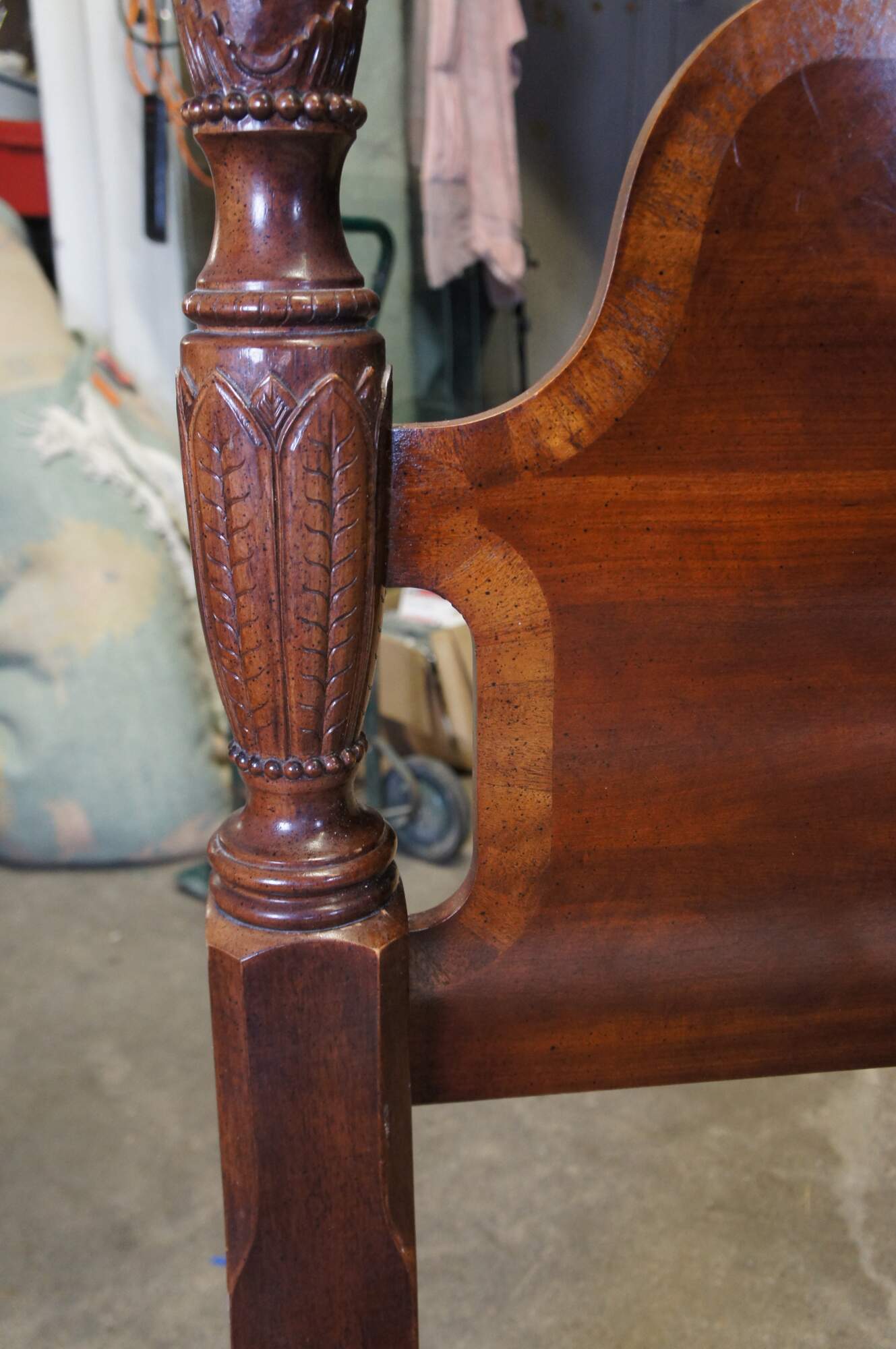 Late 20th Century Georgian style rice carved Queen size poster bed. Mafr from maogany with banding along the headword, reeded and carved posts, trophy finials and marlborough block feet. Circa 1986
