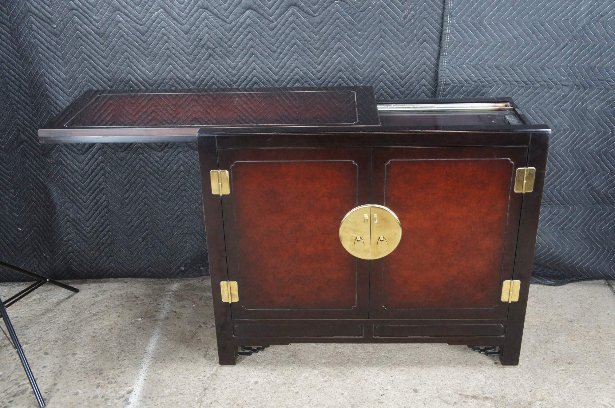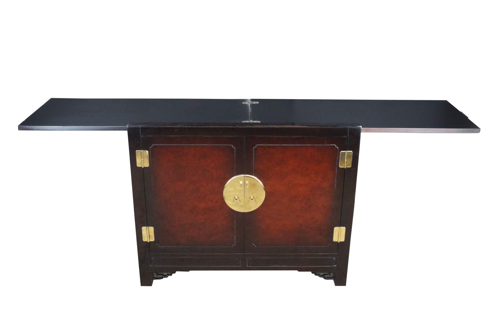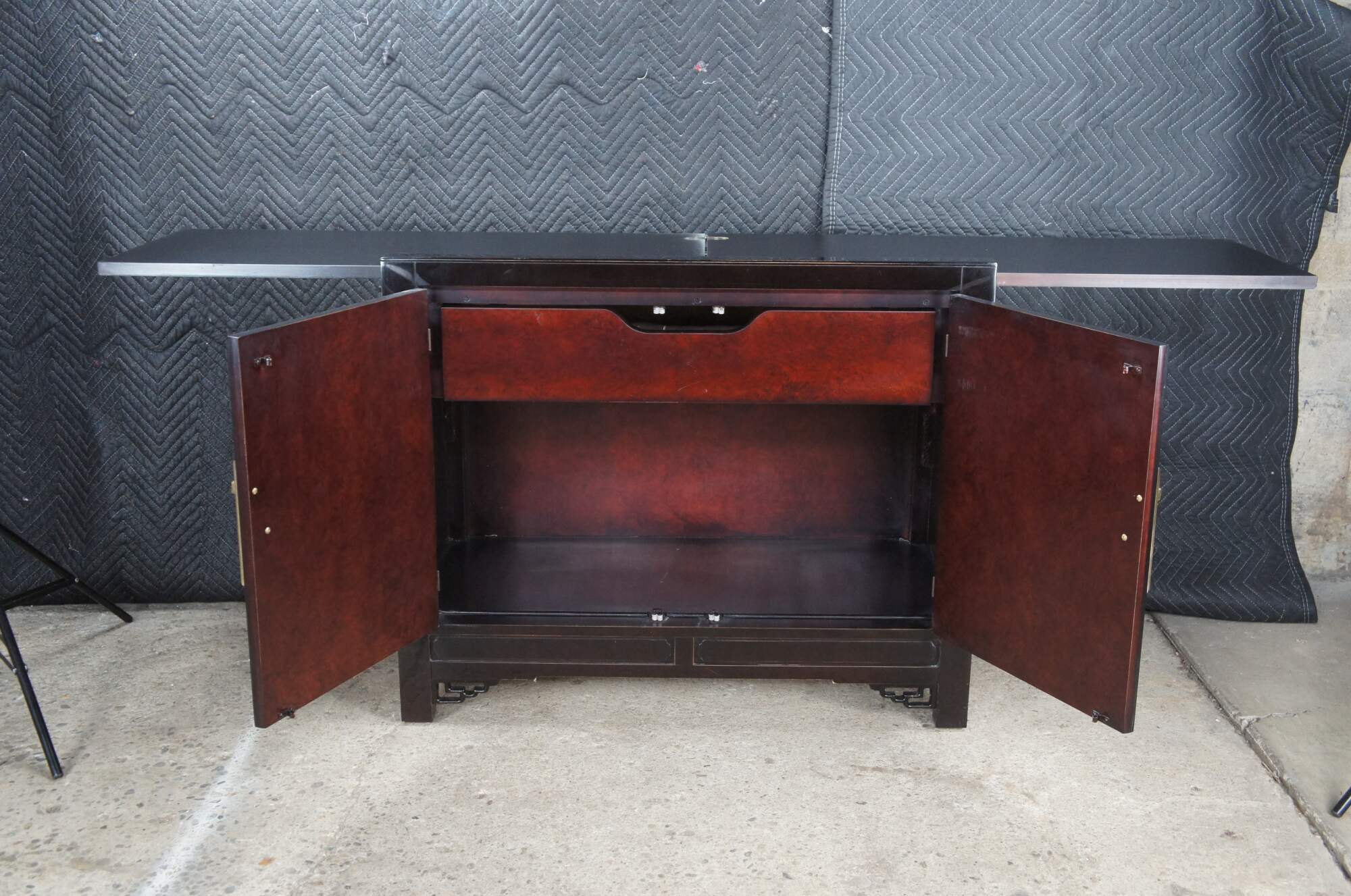 1980s White Furniture Company Mandarin dining flip top server ory bar. Features a rectangular form with lacquer, mahogany and burlwood. The top has a unique sliding mechanism and flips open to double the length of the serving area. A laminant top protects the top from stains once open. The cabinet opens to a dovetailed drawer with felt-lined silverware insert over a lower area for additional storage. Doors are accented with polished brass hardware. Let's have unique fretwork spadrels.