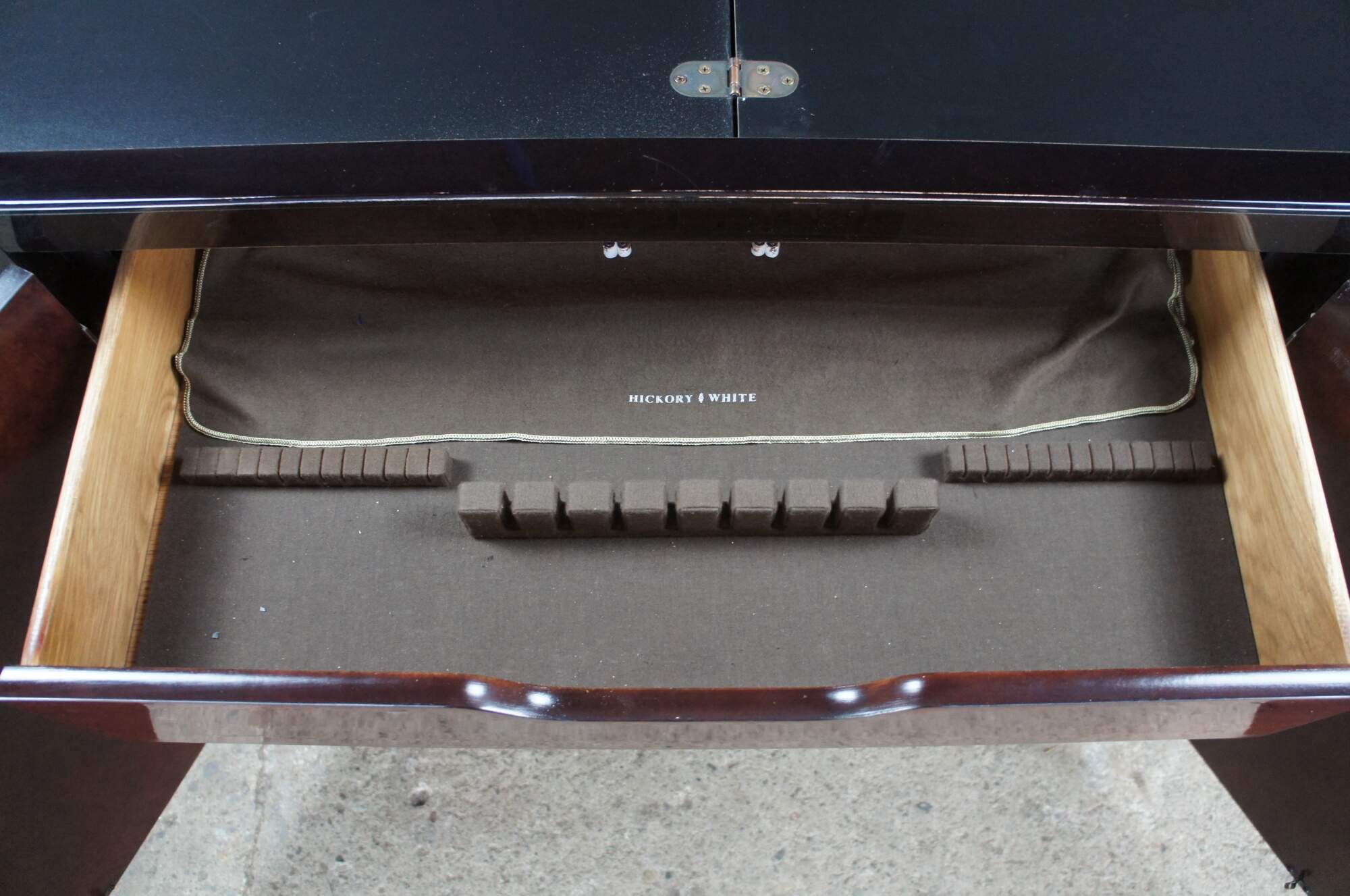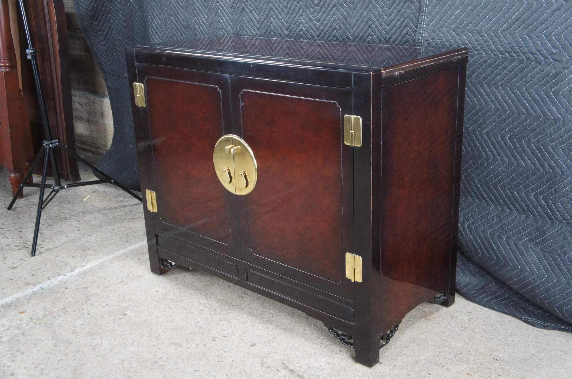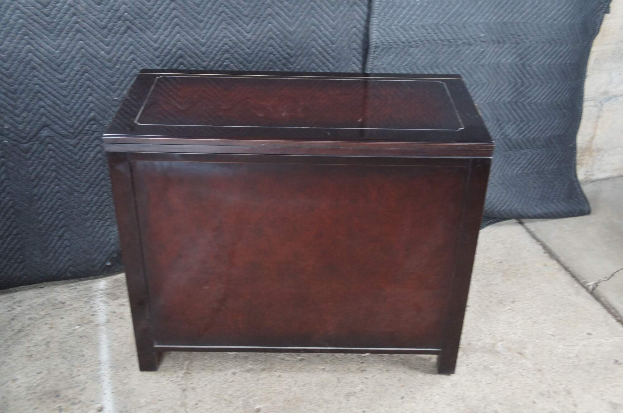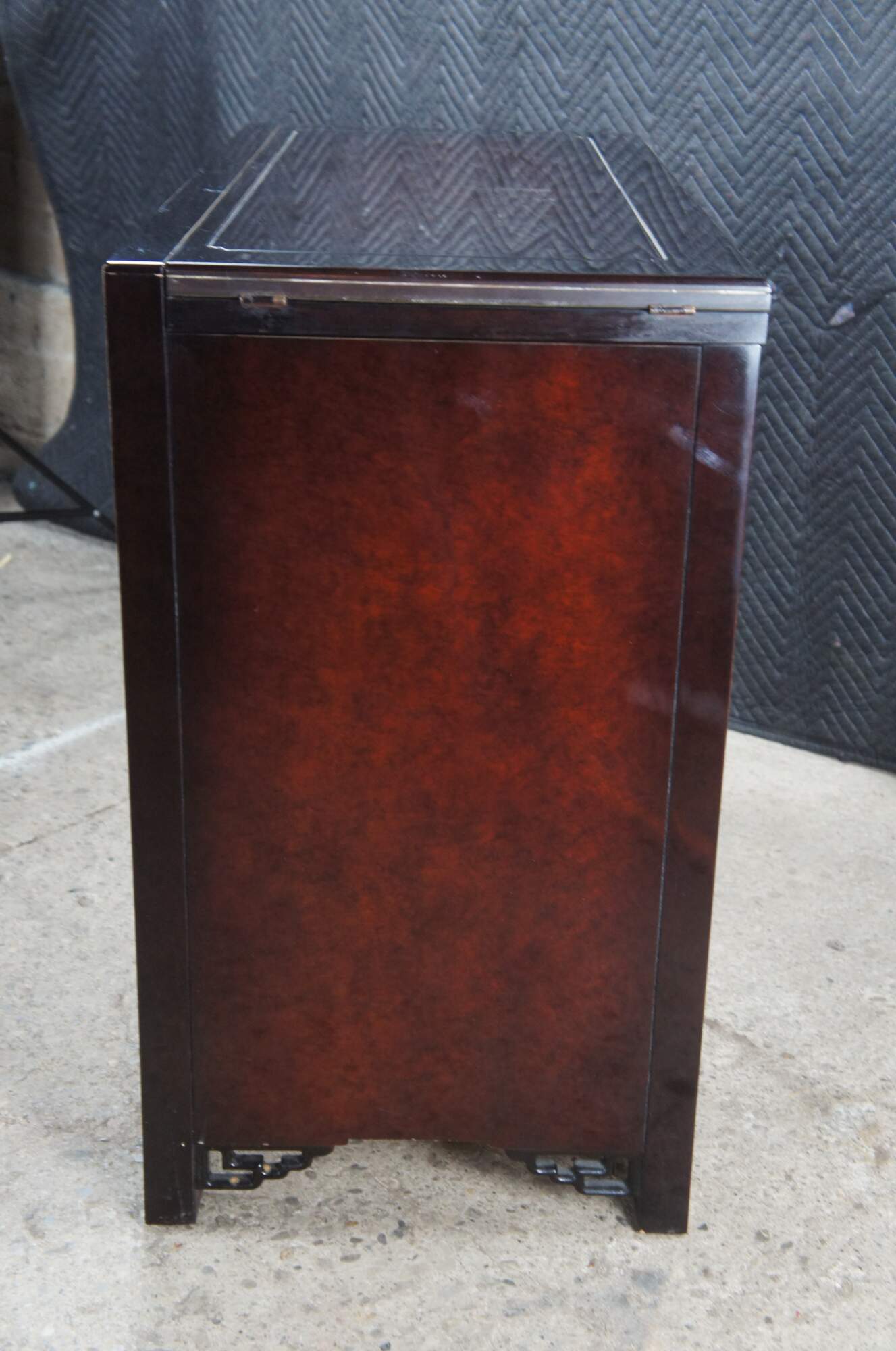 1980s White Furniture Company Mandarin dining flip top server ory bar. Features a rectangular form with lacquer, mahogany and burlwood. The top has a unique sliding mechanism and flips open to double the length of the serving area. A laminant top protects the top from stains once open. The cabinet opens to a dovetailed drawer with felt-lined silverware insert over a lower area for additional storage. Doors are accented with polished brass hardware. Let's have unique fretwork spadrels.
