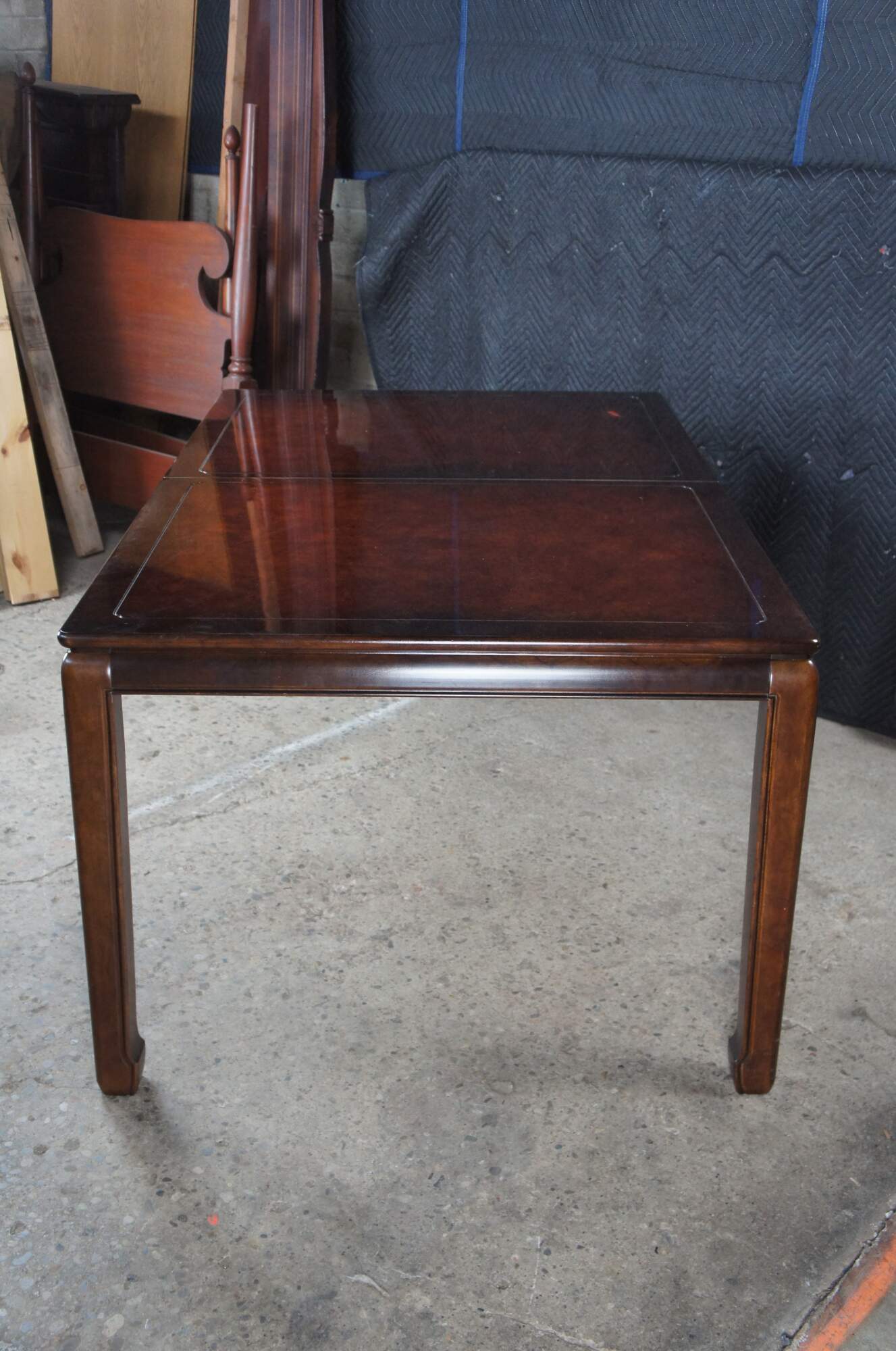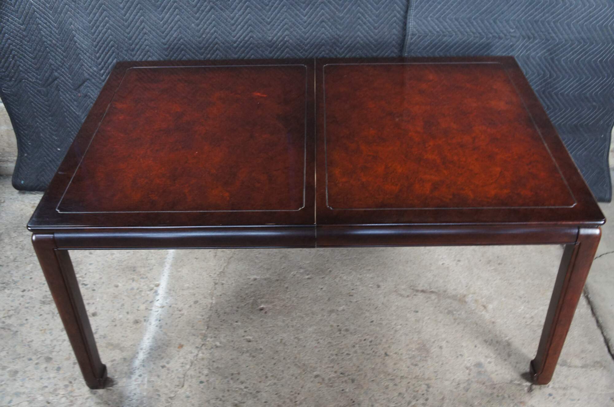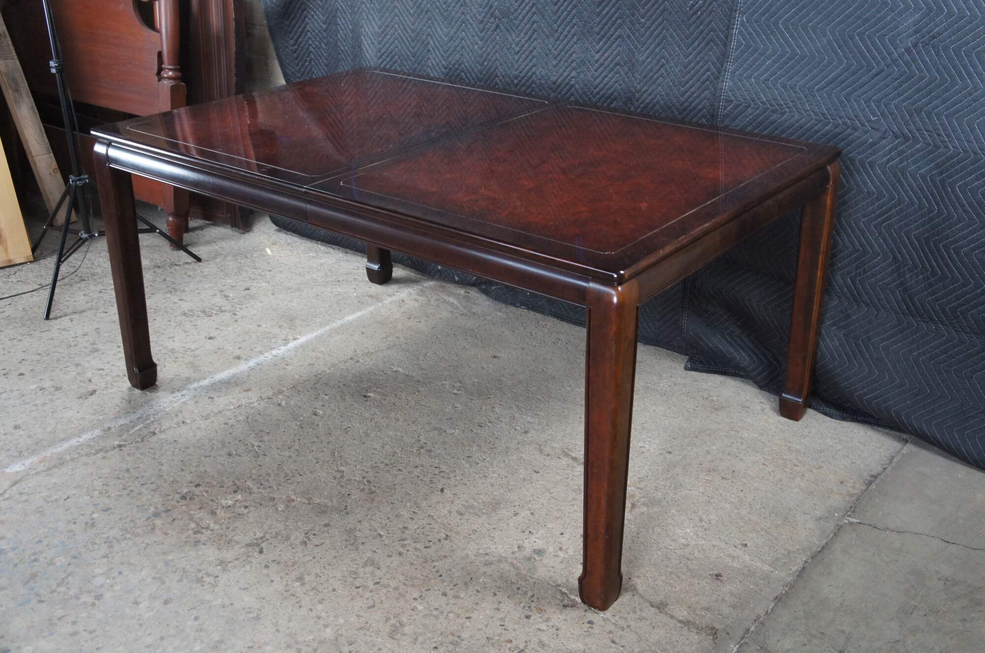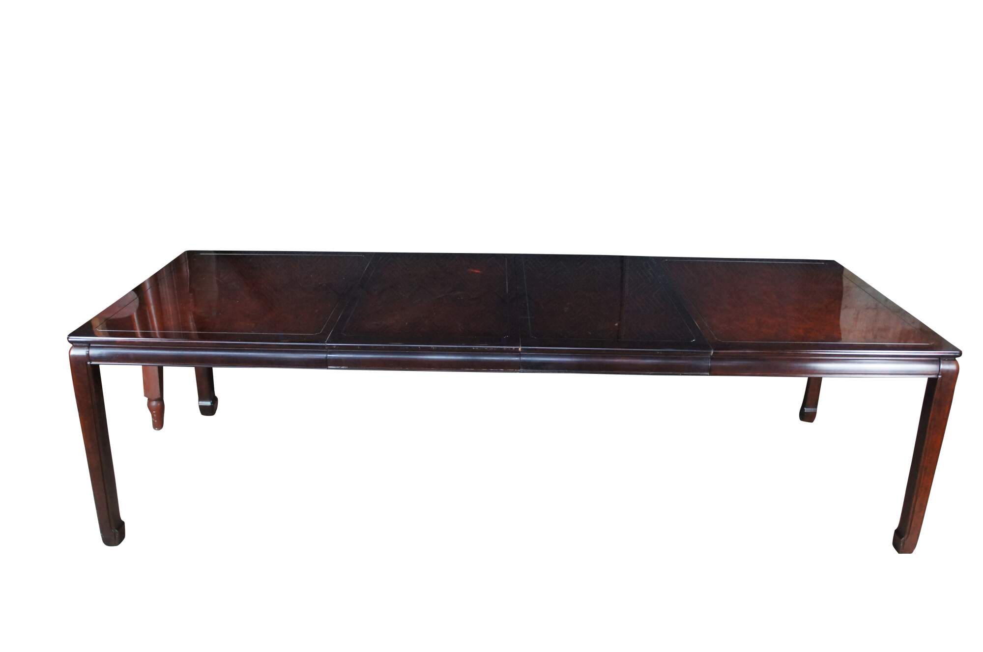 1980s White Furniture Company Mandarin dining table, 330-12. Rectangular form with mahogany and burlwood top. Includes 2 leafs for extensions and table pads.
