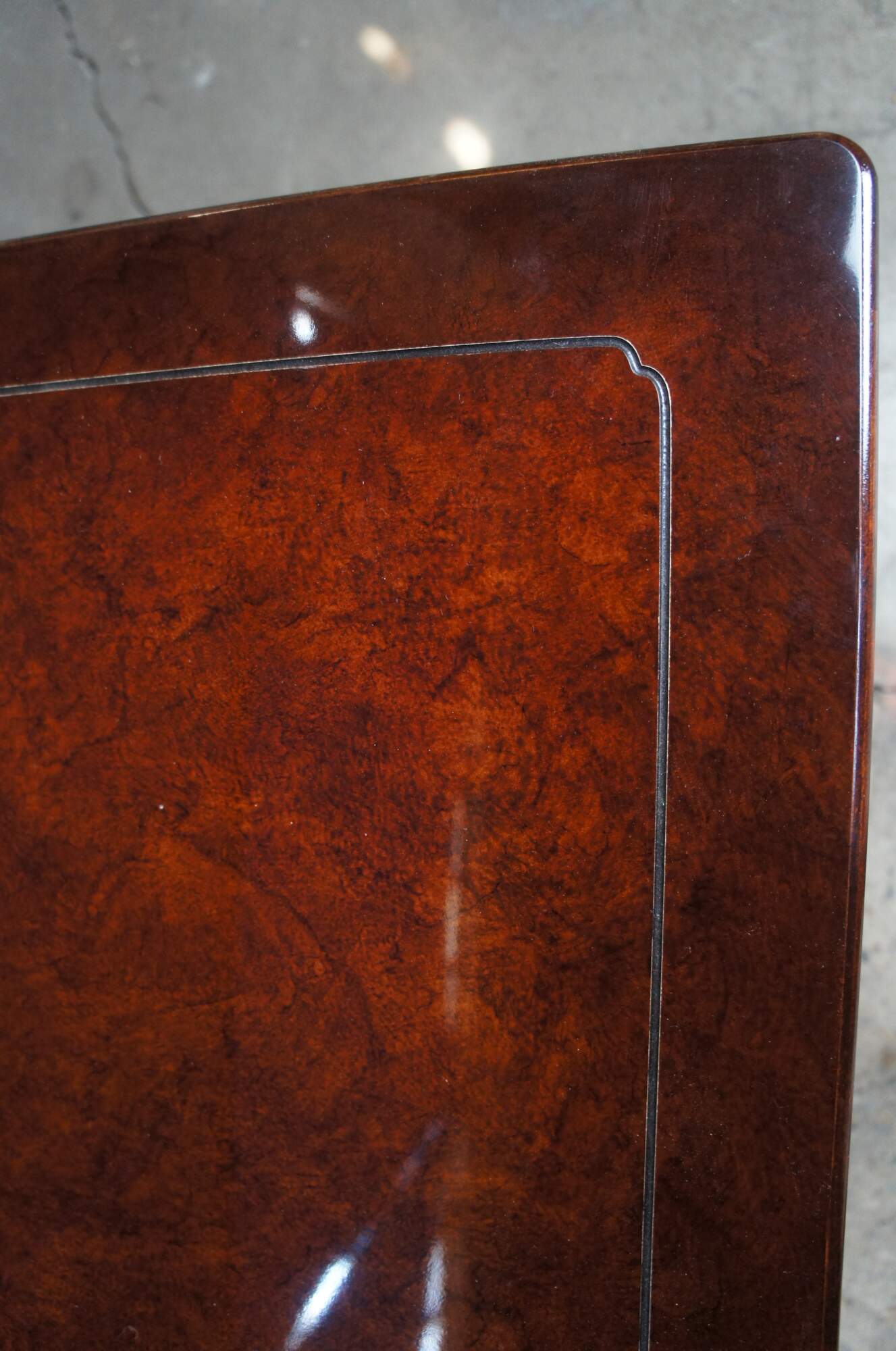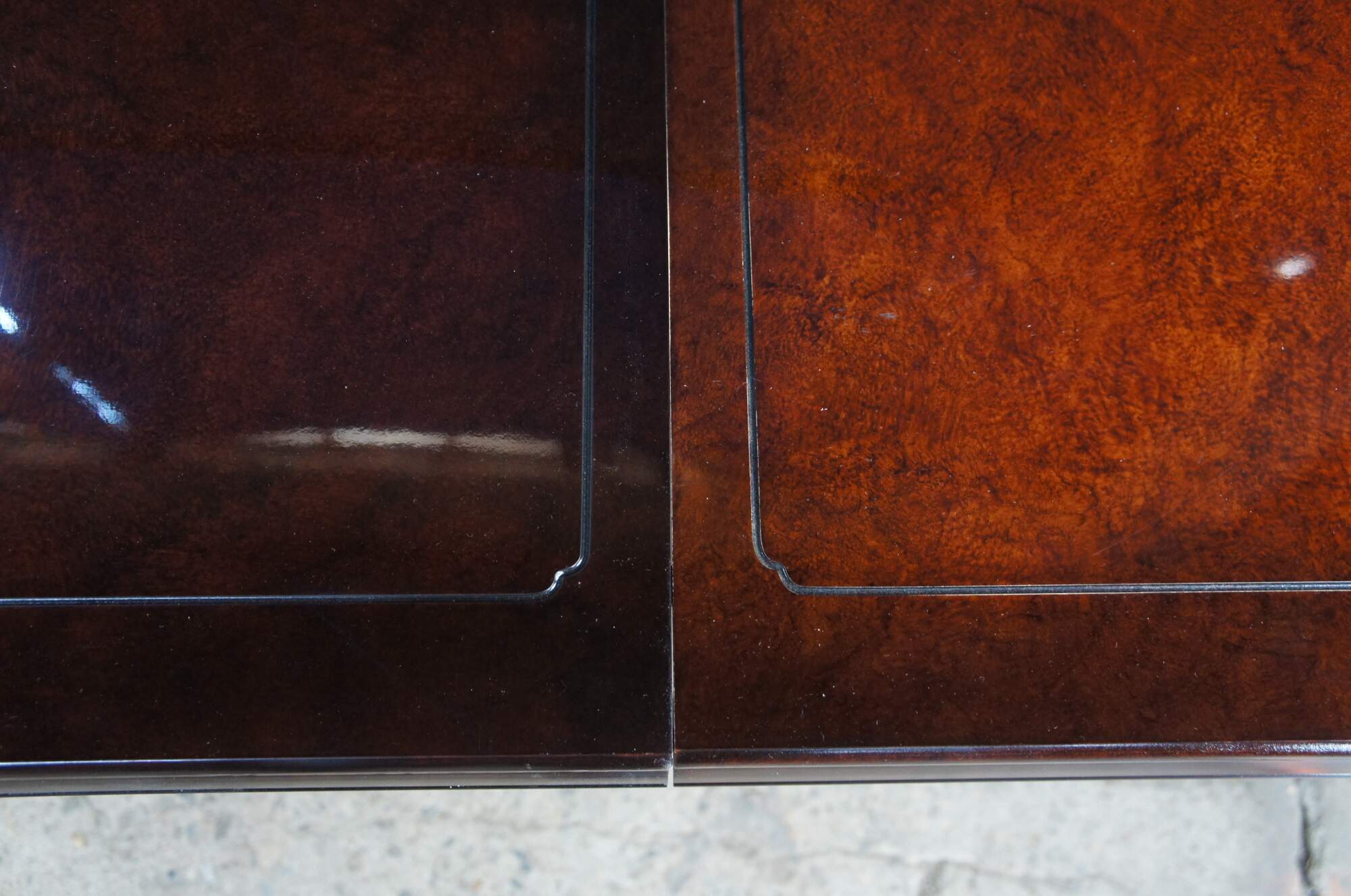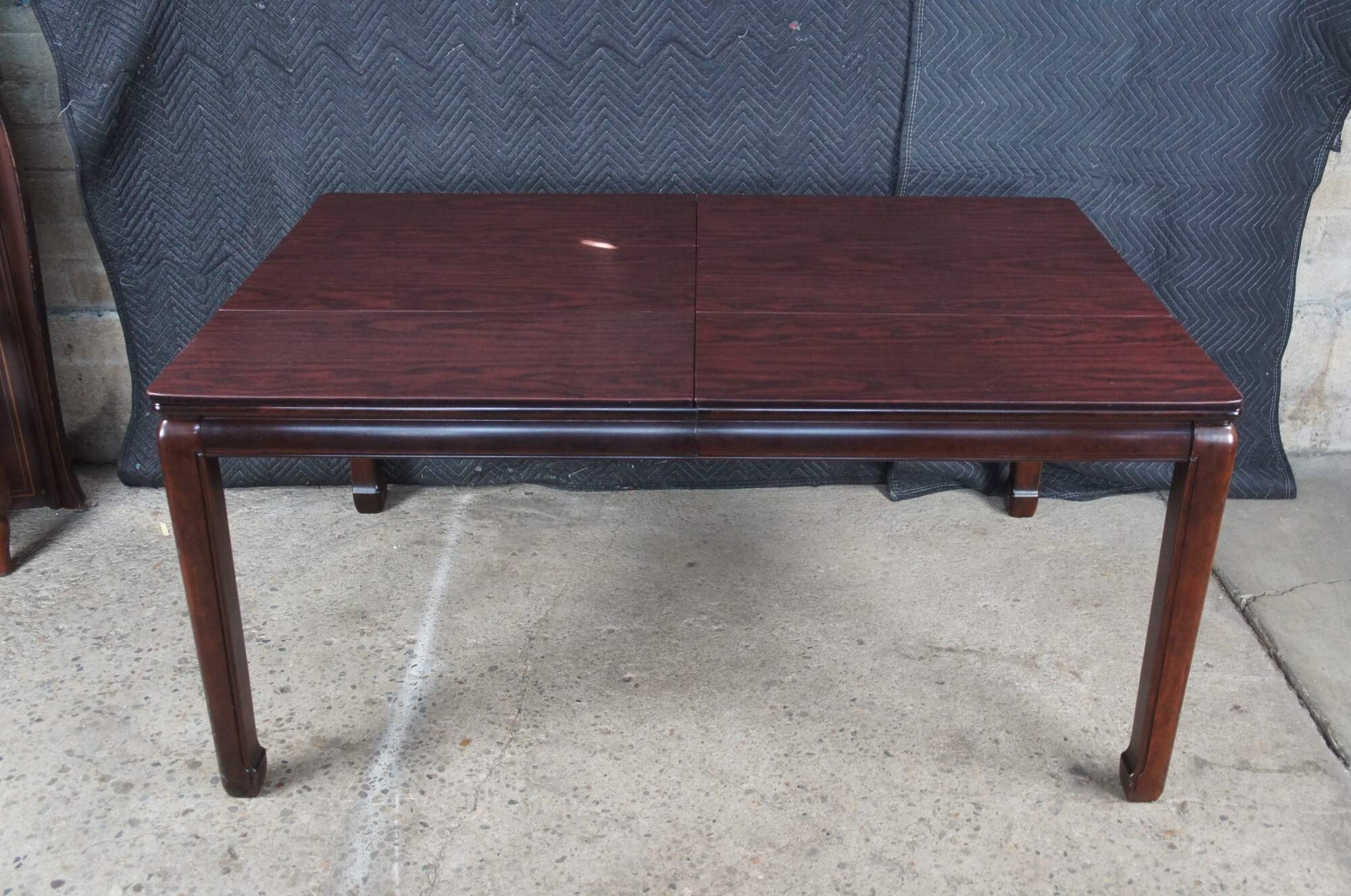 1980s White Furniture Company Mandarin dining table, 330-12. Rectangular form with mahogany and burlwood top. Includes 2 leafs for extensions and table pads.