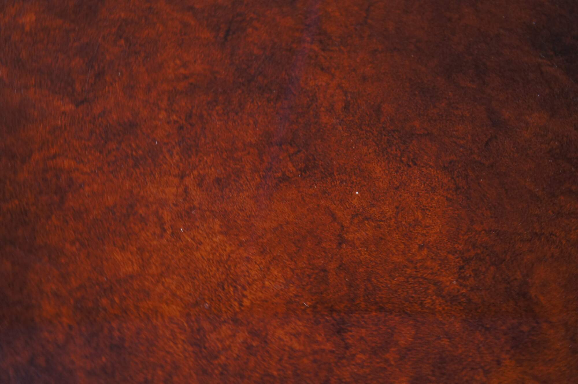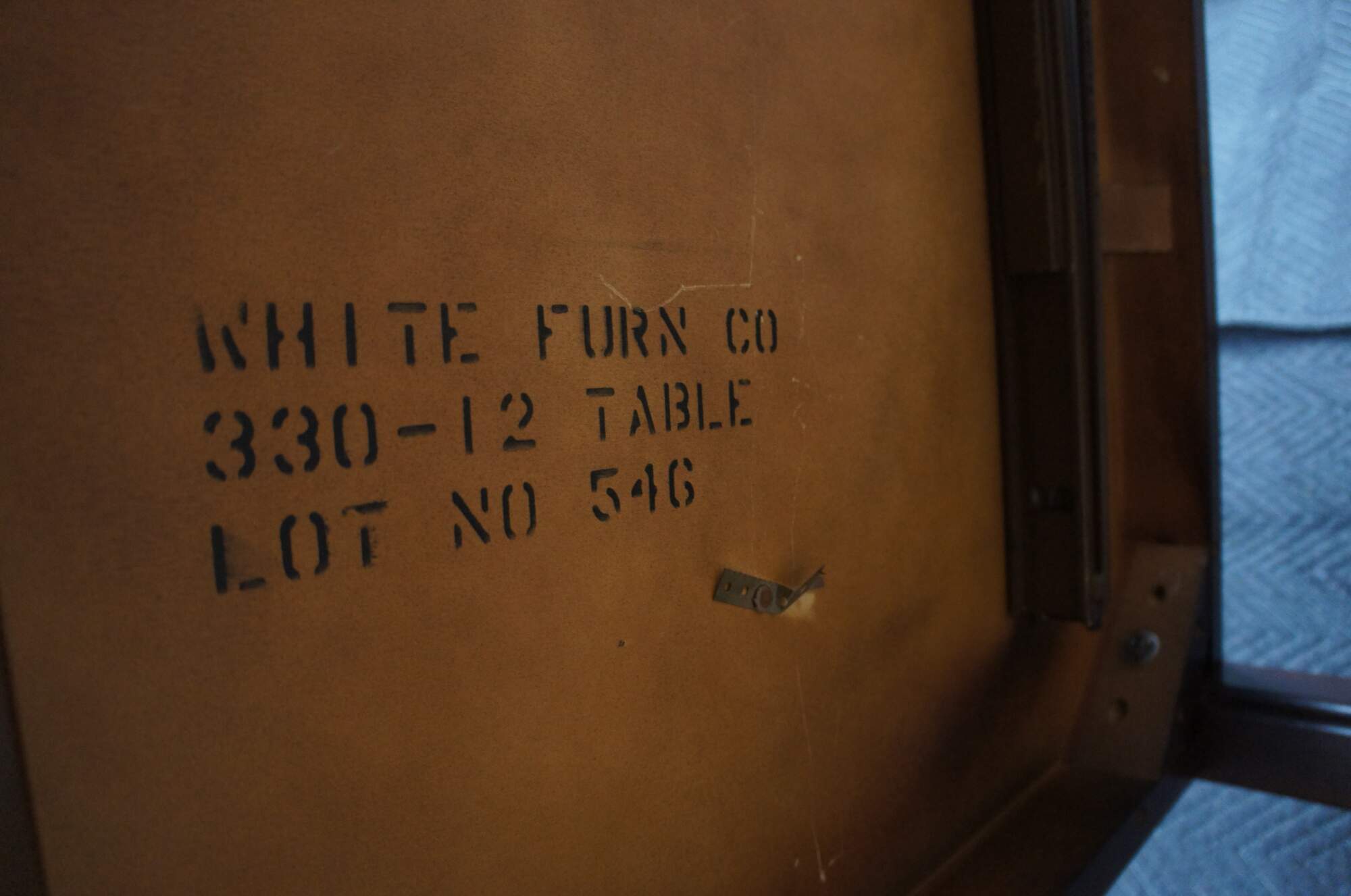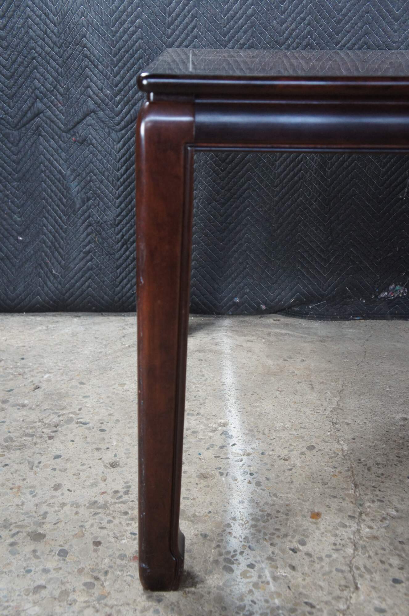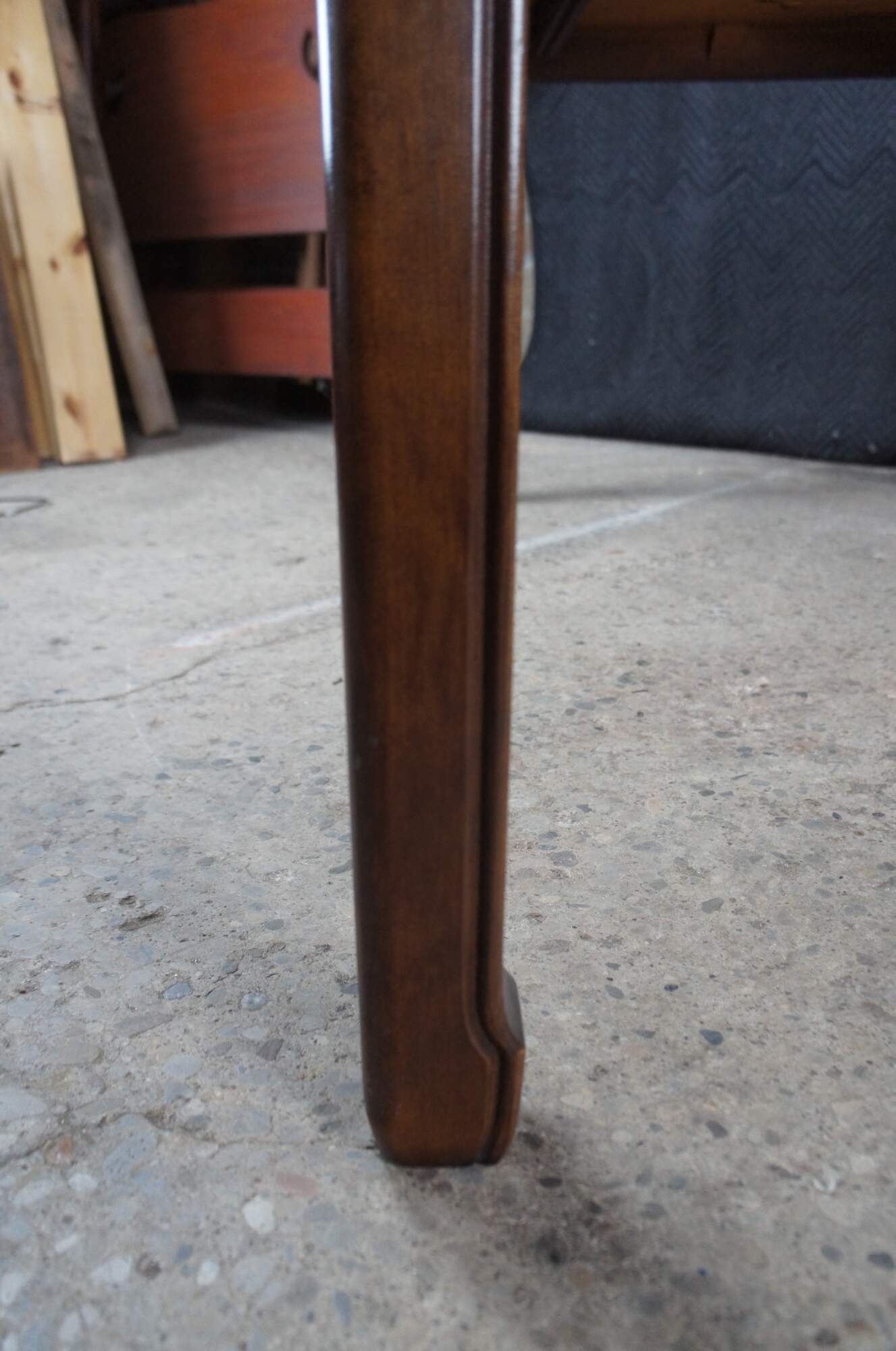 1980s White Furniture Company Mandarin dining table, 330-12. Rectangular form with mahogany and burlwood top. Includes 2 leafs for extensions and table pads.