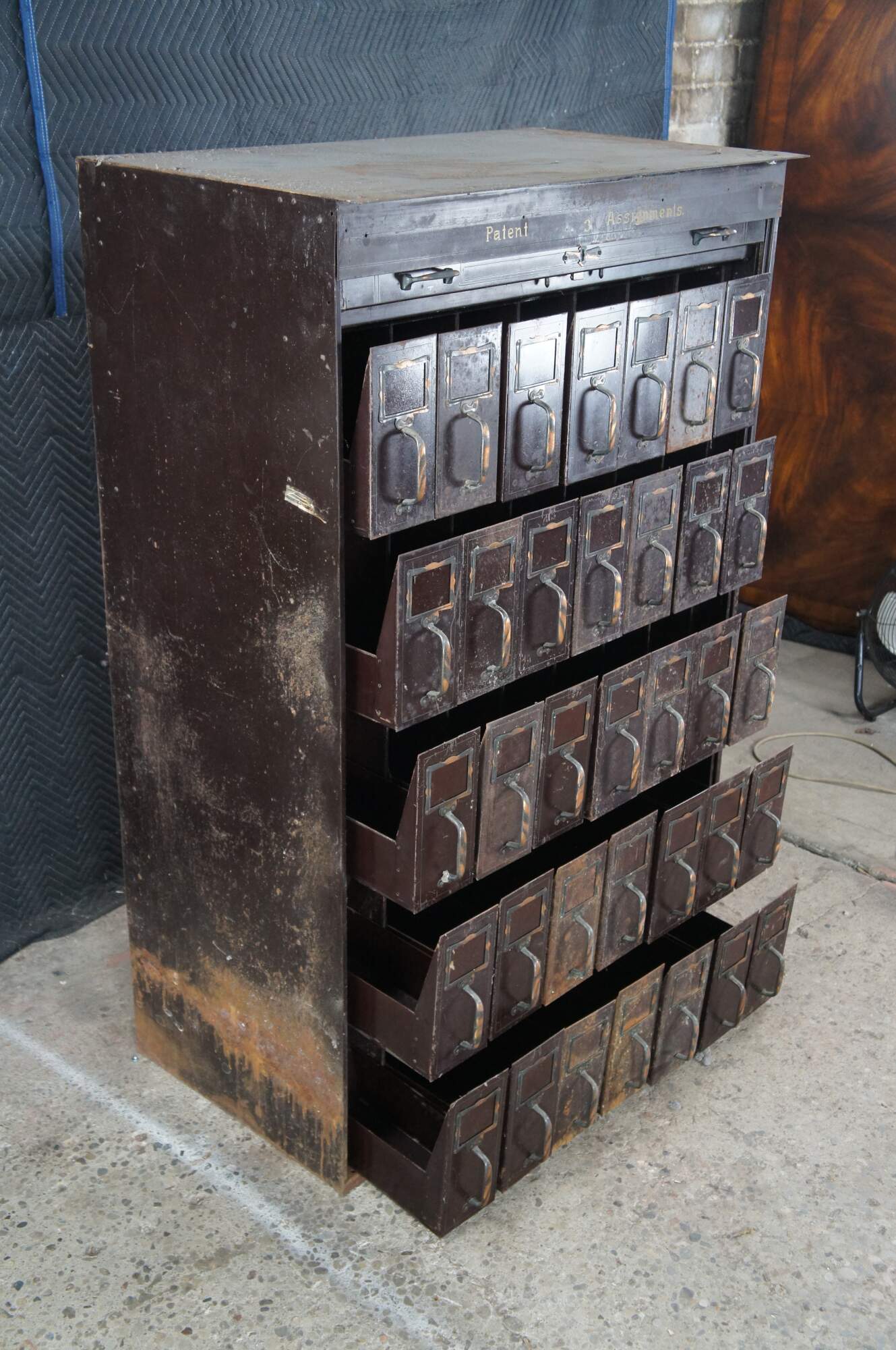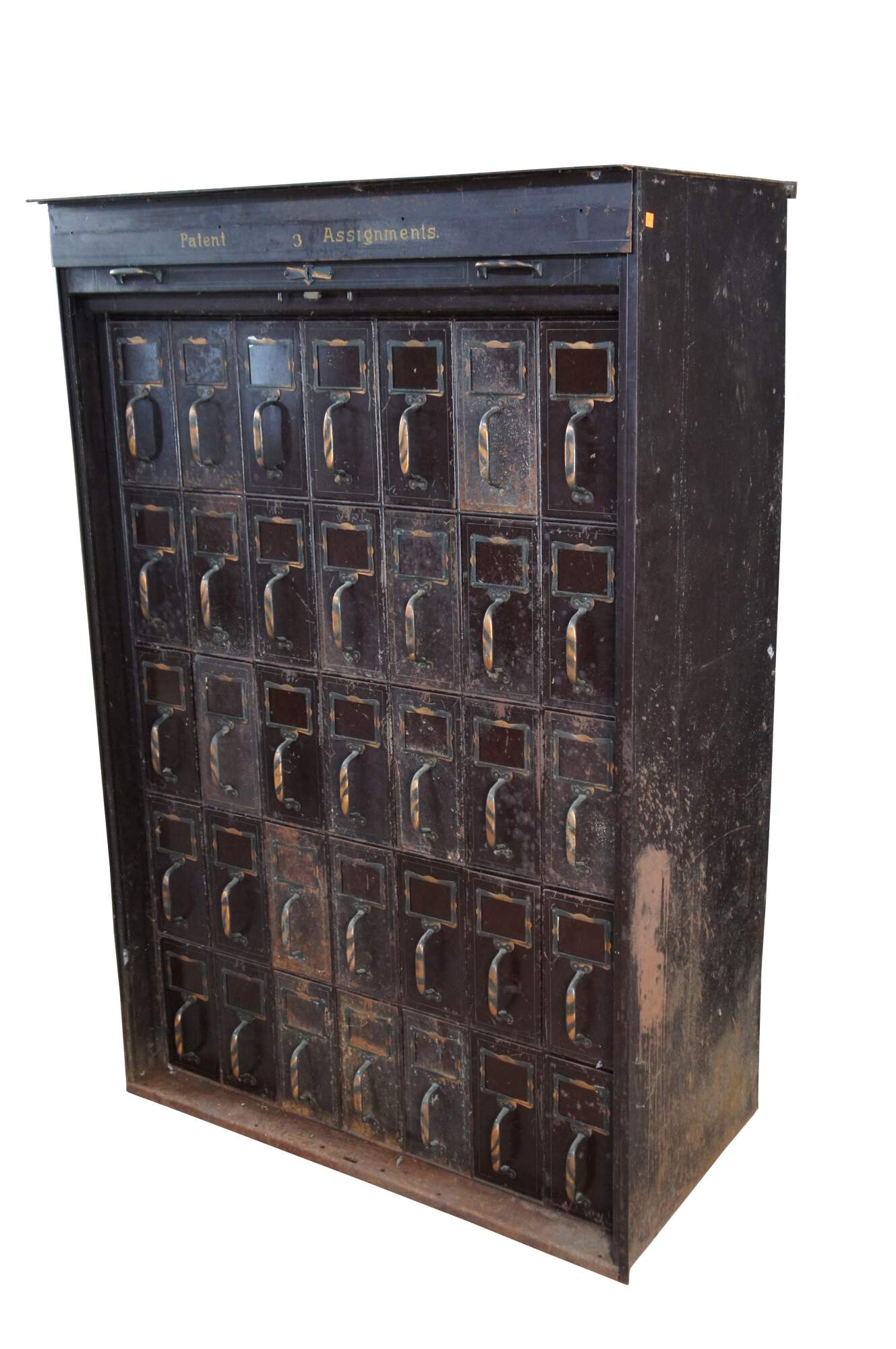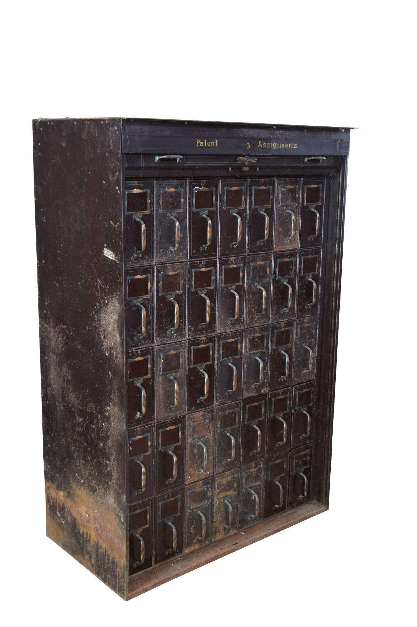 Rare antique fireproof patent / assignment / card / index / courthouse catalogue file cabinet from NCR headquarters in Dayton Ohio. This cabinet was part of the original corporate offices and were salvaged from the top floor before demolition. It features 35 apothecary style pull out drawers and a roll down tambor door (not currently functional).