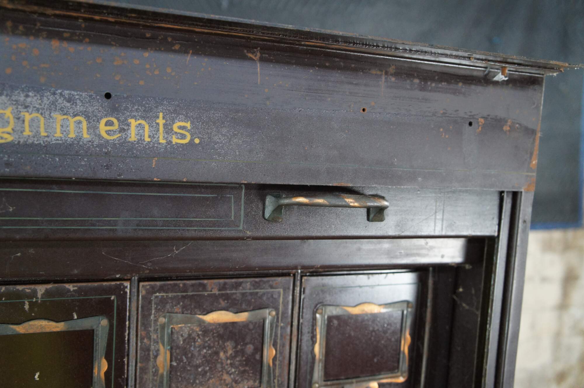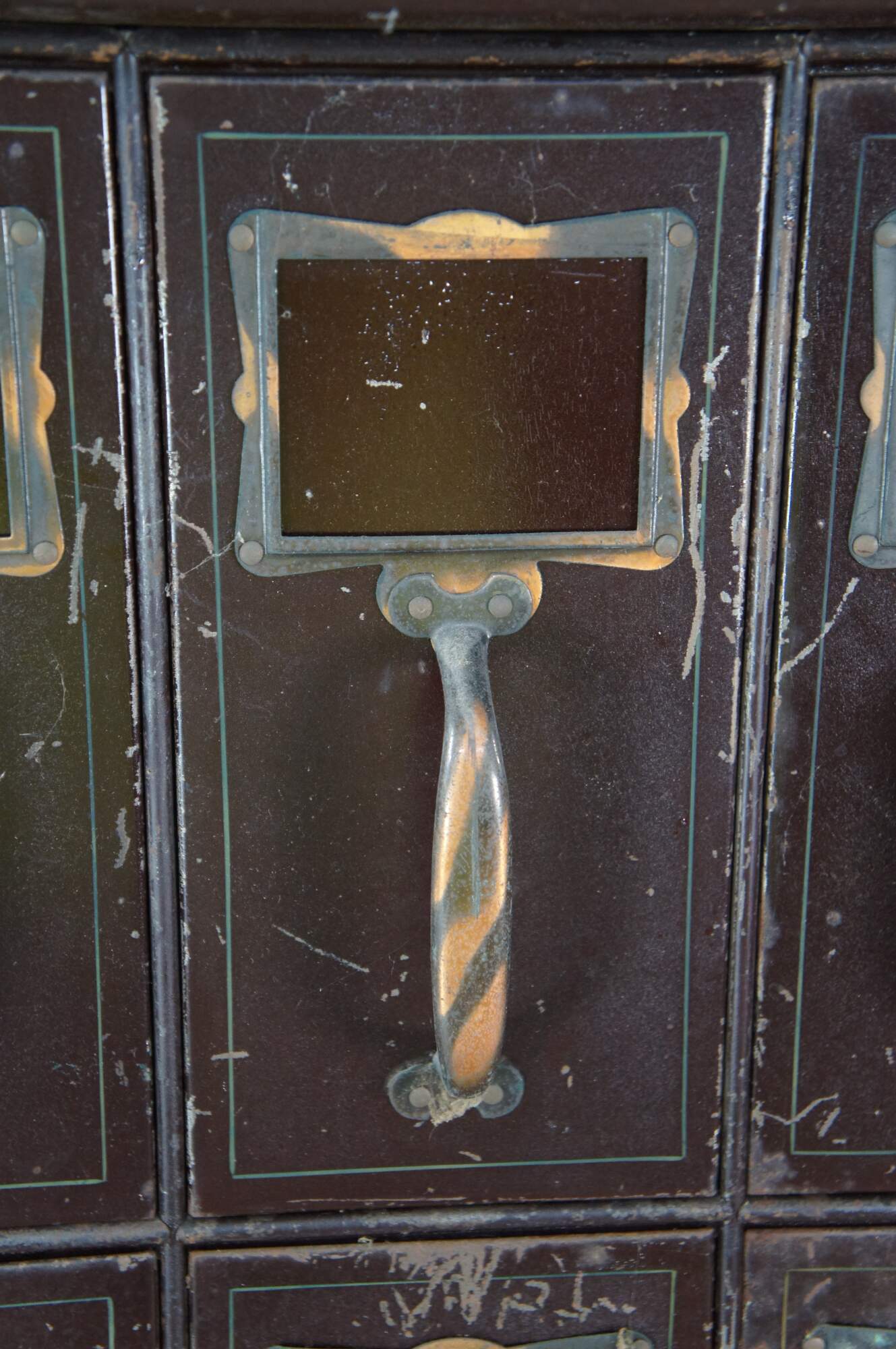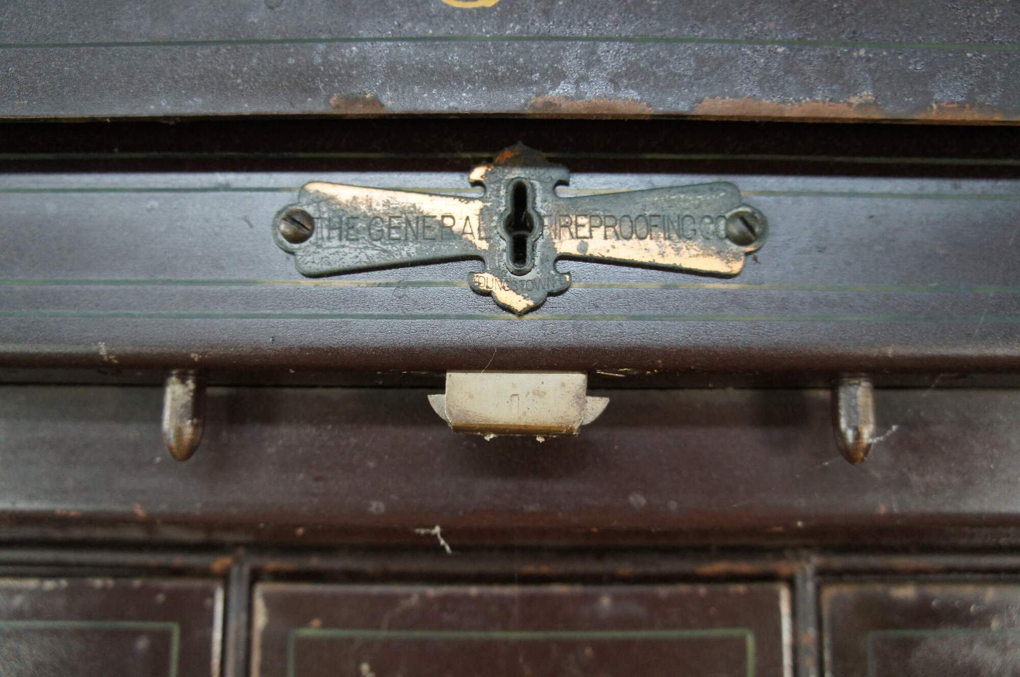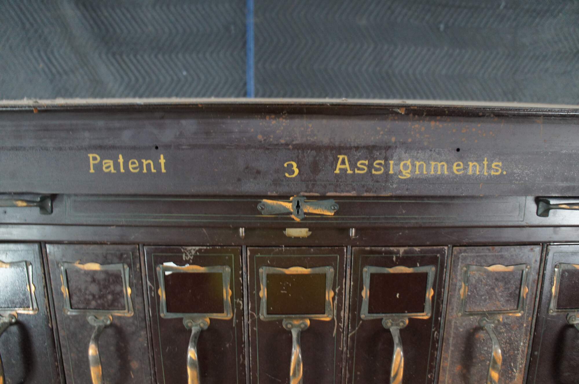 Rare antique fireproof patent / assignment / card / index / courthouse catalogue file cabinet from NCR headquarters in Dayton Ohio. This cabinet was part of the original corporate offices and were salvaged from the top floor before demolition. It features 35 apothecary style pull out drawers and a roll down tambor door (not currently functional).