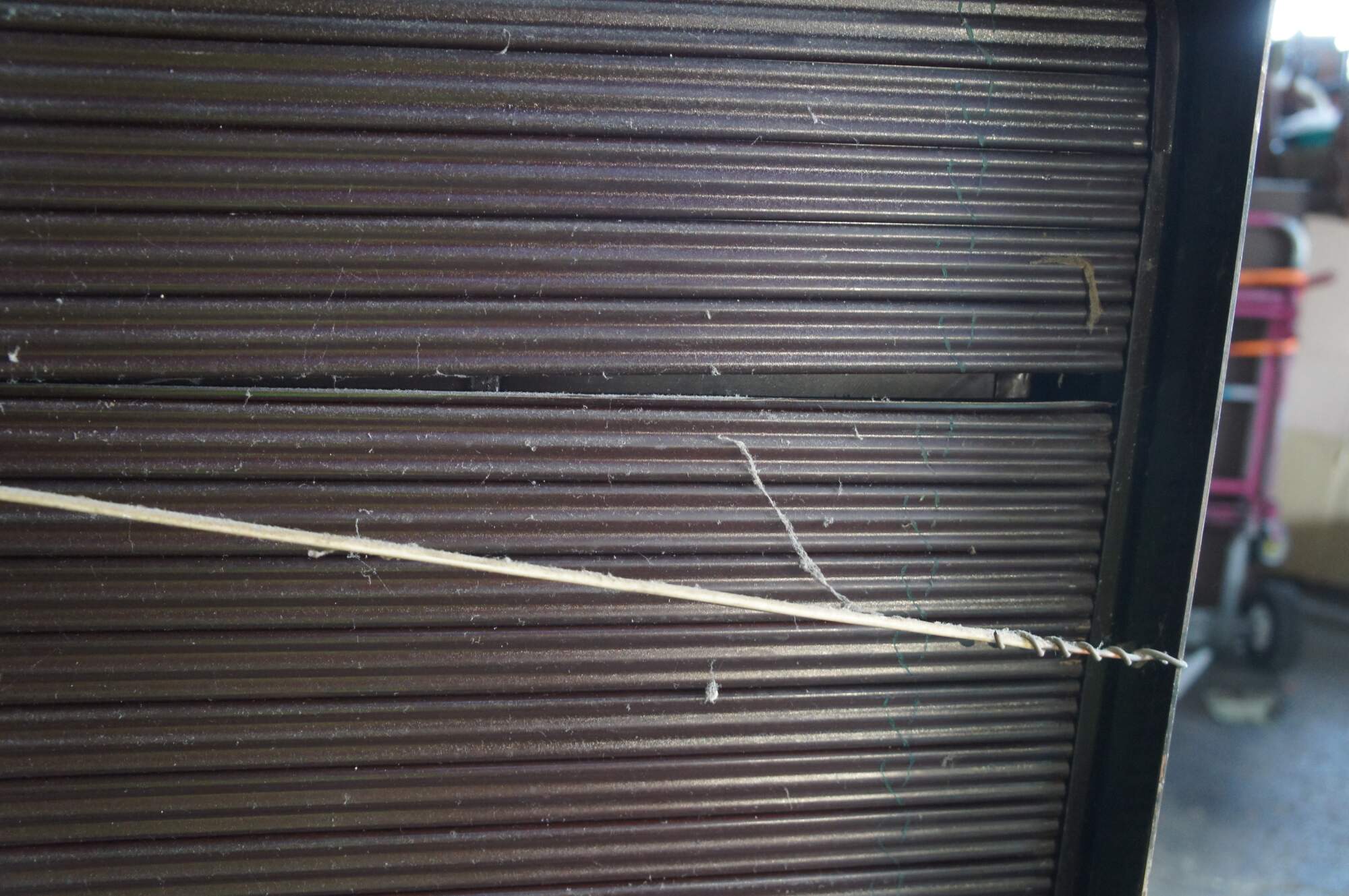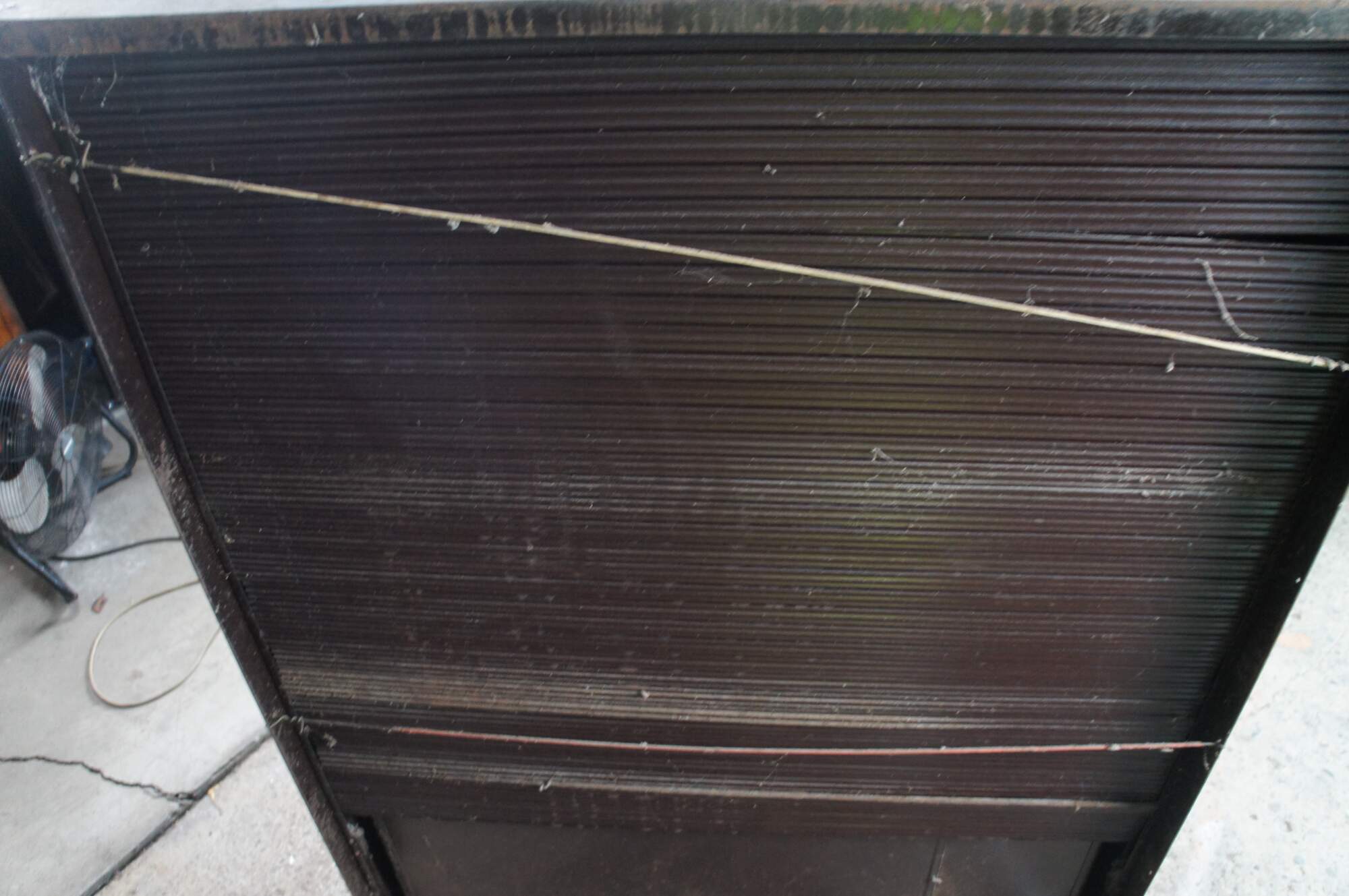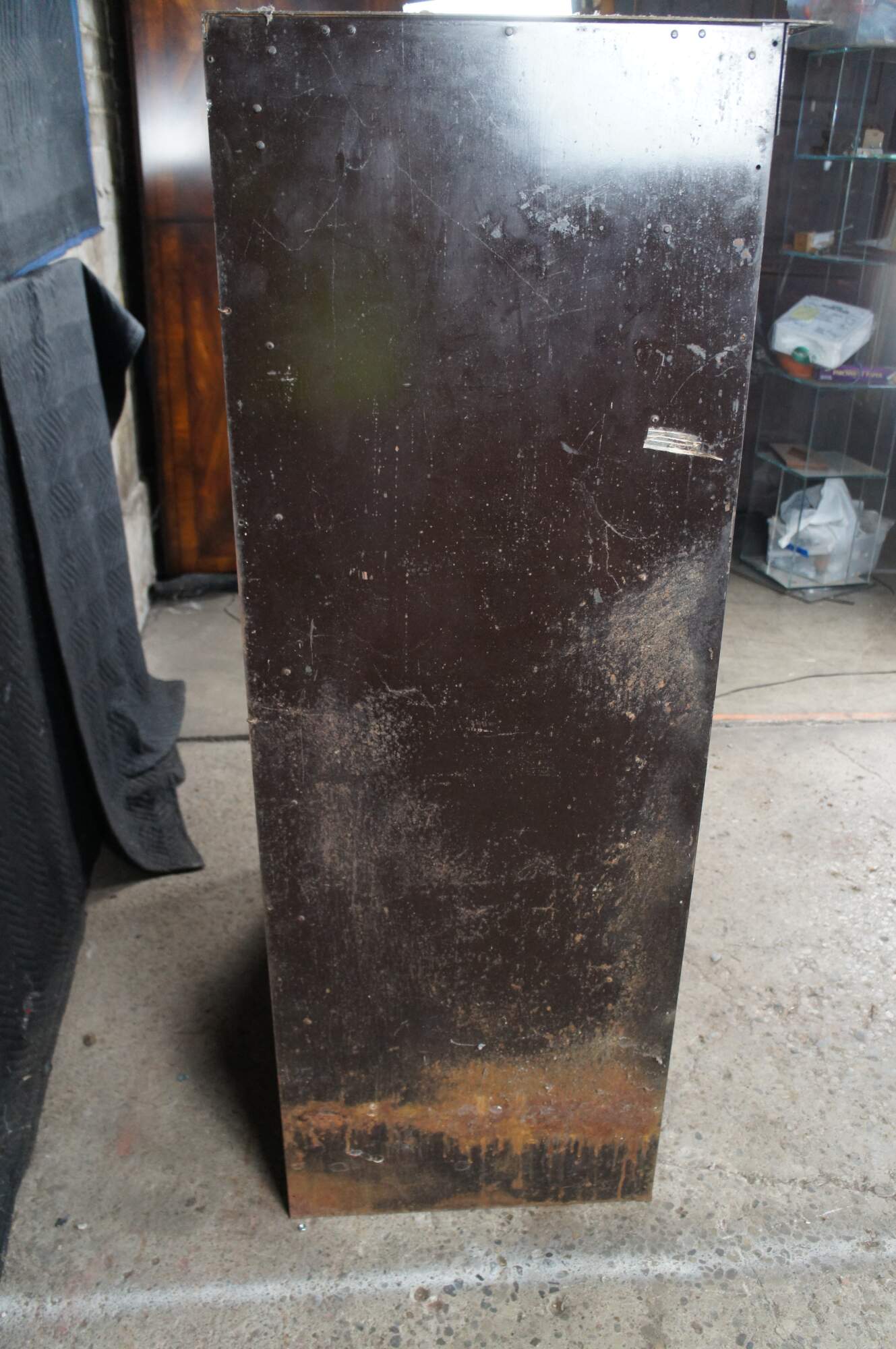 Very heavy, distressing, scuffing, marking, finish loss, rust / pitting, door needs repair / adjustment / off track, no key.