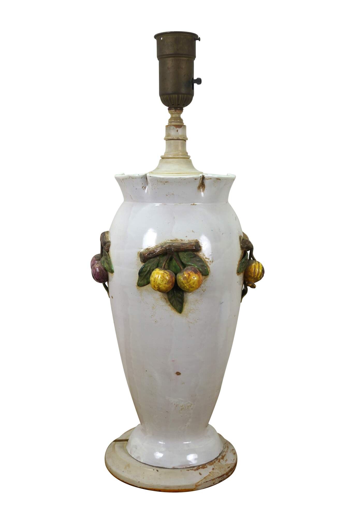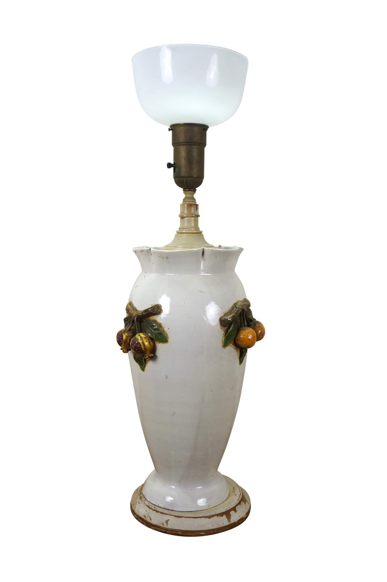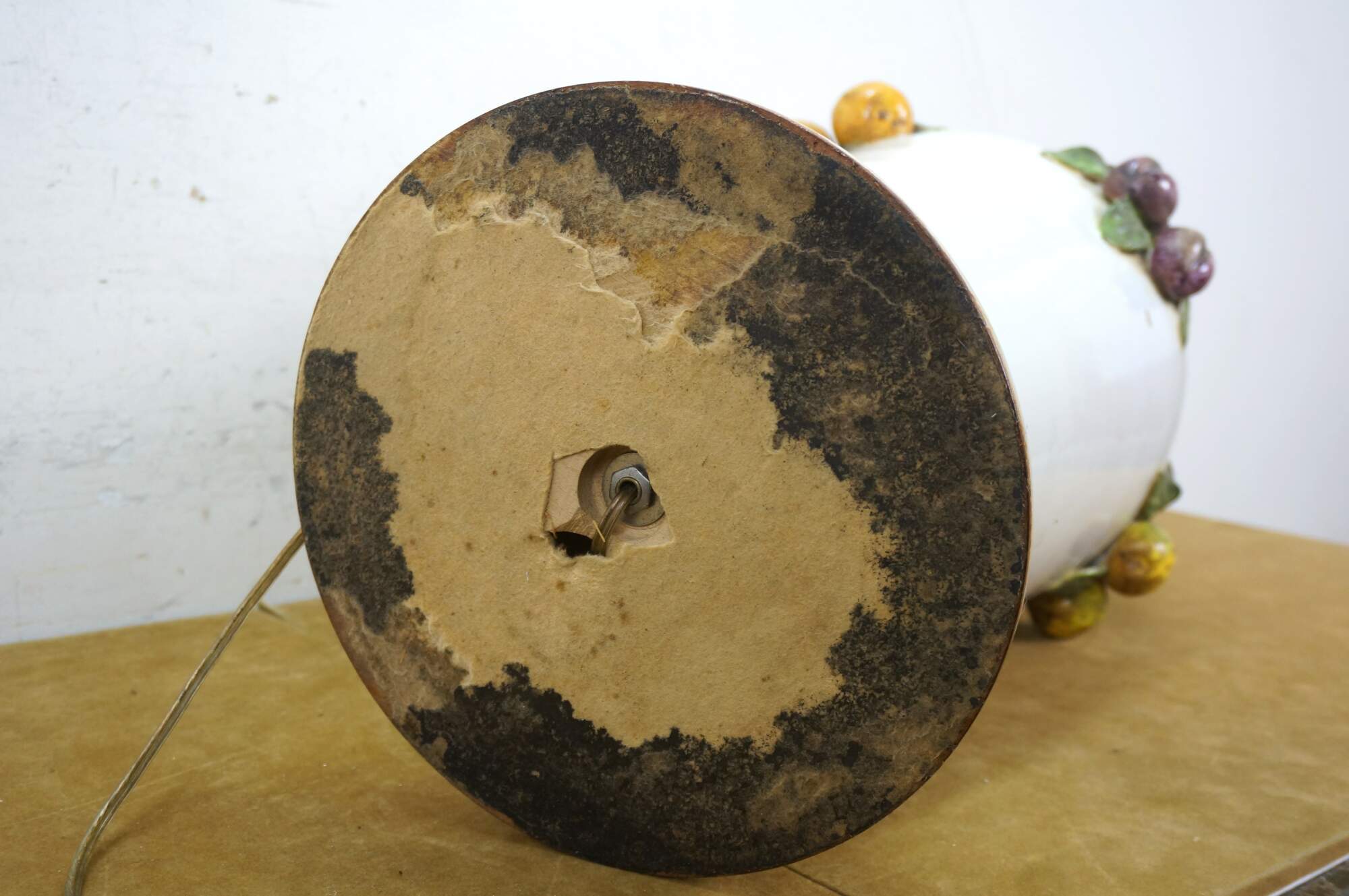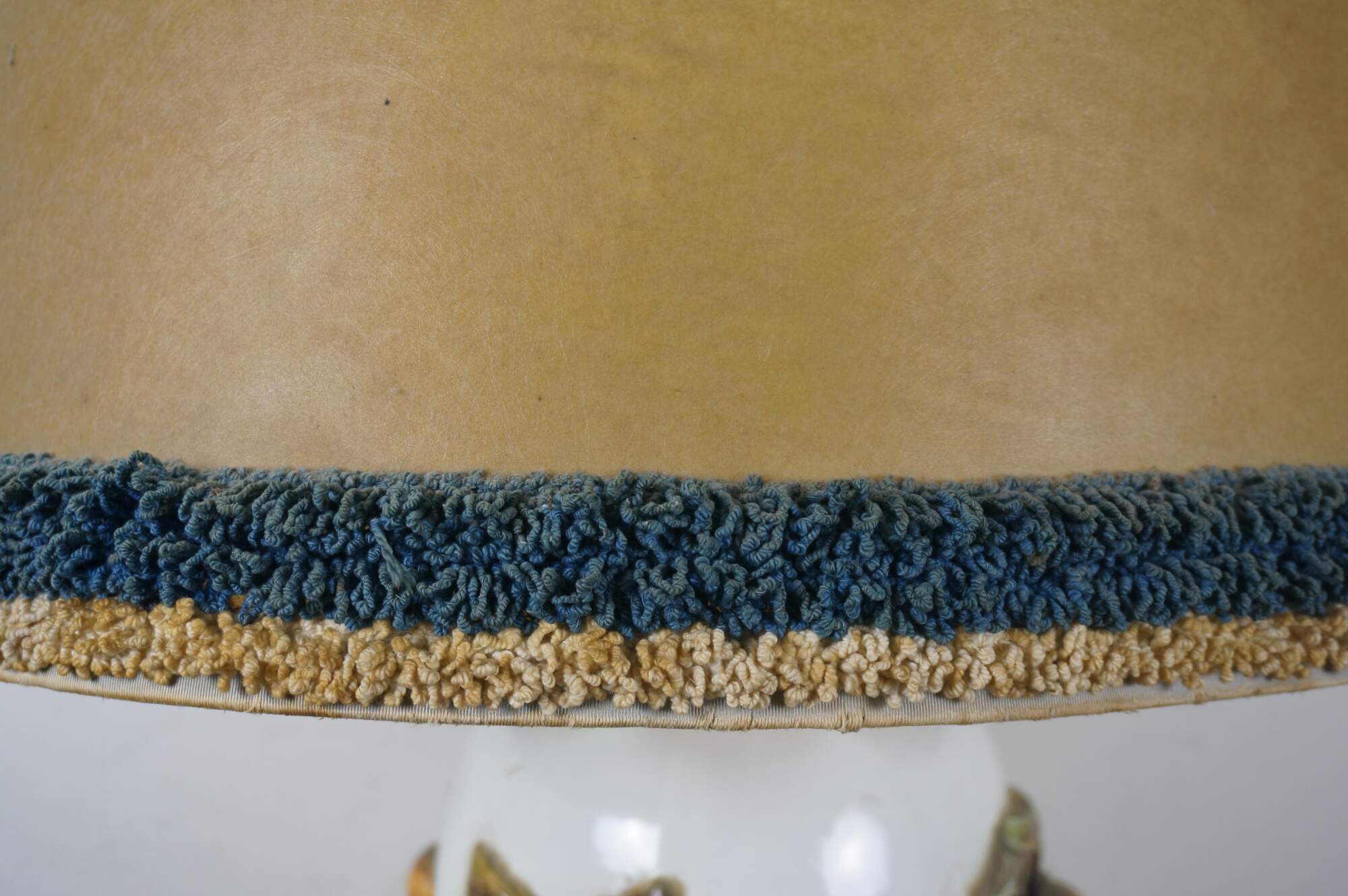 A very large and impressive mid to early 20th century Italian porcelain table lamp featuring a ruffled-topped urn / vase with branches of different fruit applied to each side, turned wood neck and base, and brass socket for an oversized torchiere bulb. Milk glass uplight shade on top of which rests an immense 26" diameter brown paper shade trimmed with blue and beige shag. Marked Italy on base.