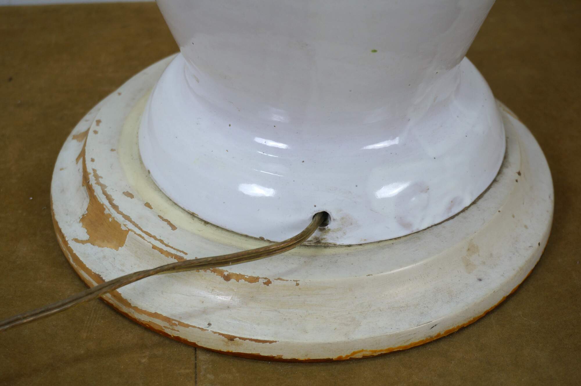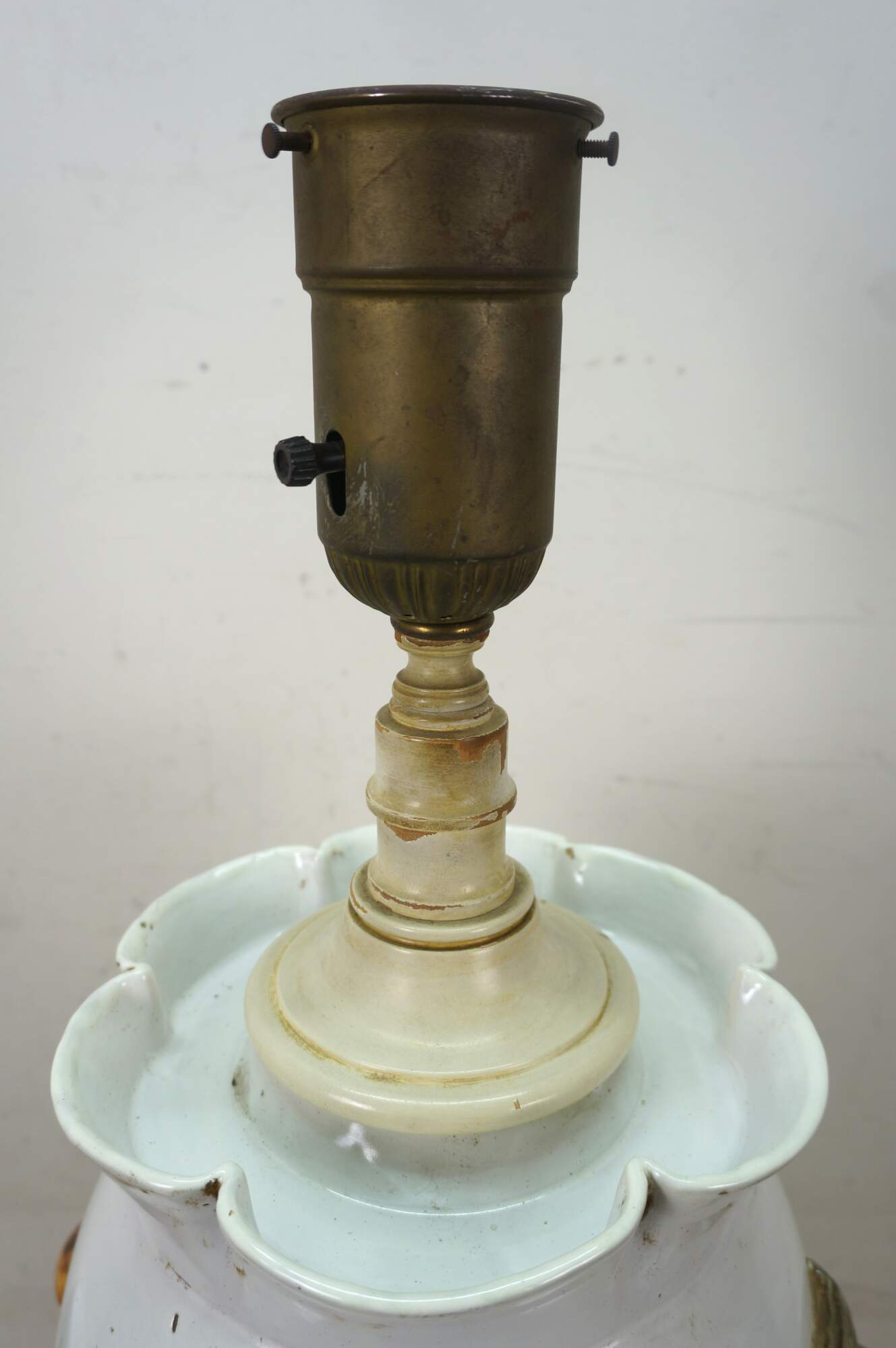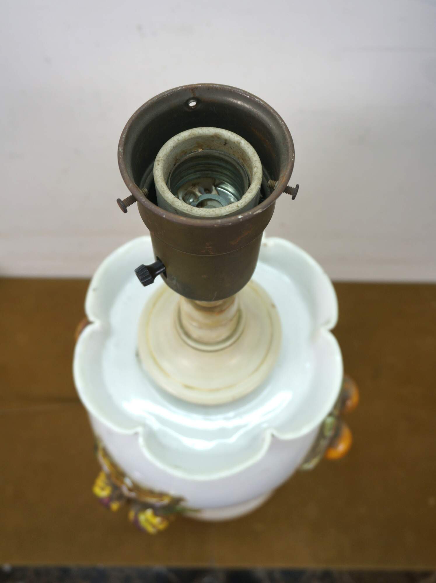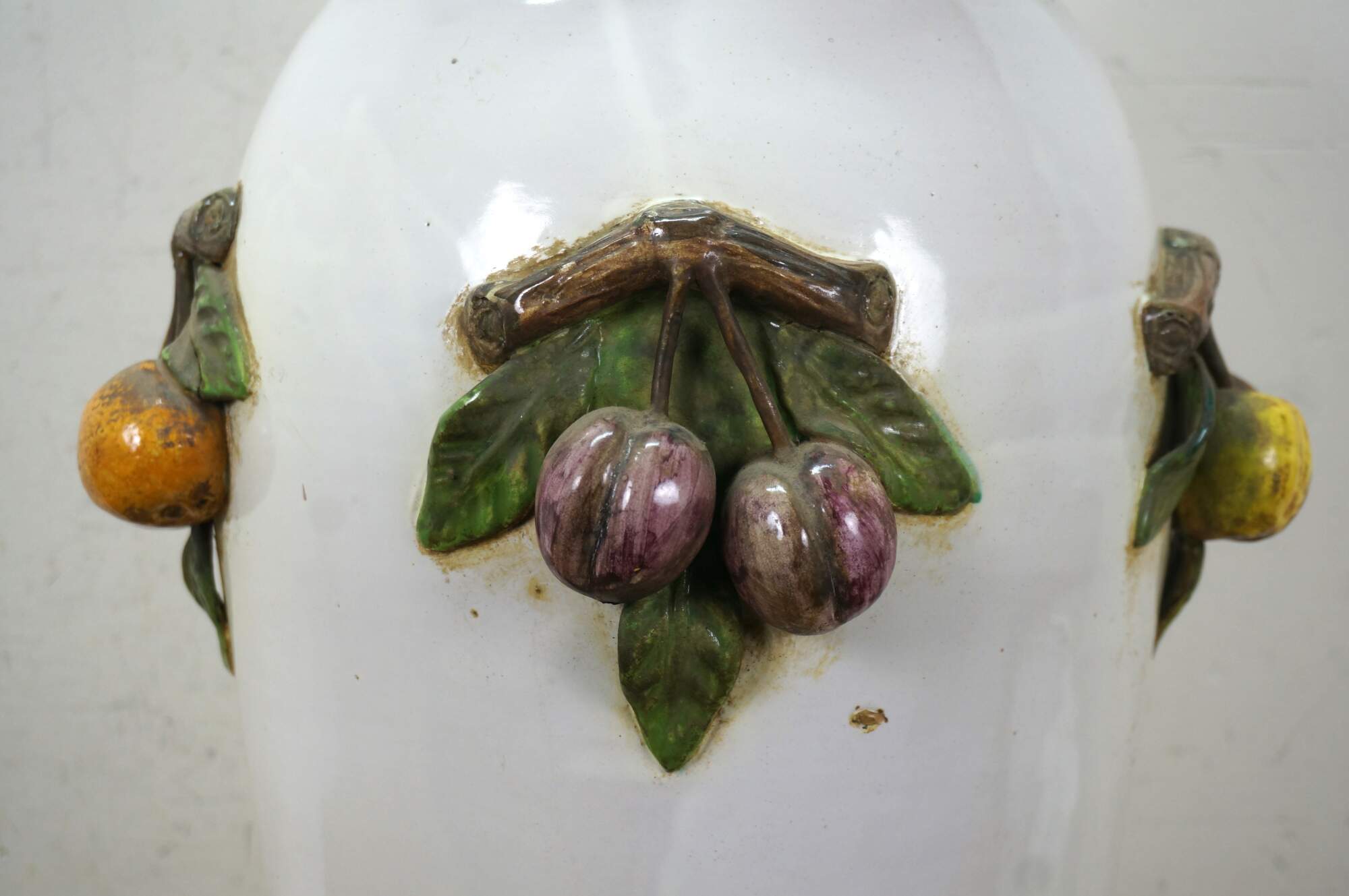 A very large and impressive mid to early 20th century Italian porcelain table lamp featuring a ruffled-topped urn / vase with branches of different fruit applied to each side, turned wood neck and base, and brass socket for an oversized torchiere bulb. Milk glass uplight shade on top of which rests an immense 26" diameter brown paper shade trimmed with blue and beige shag. Marked Italy on base.